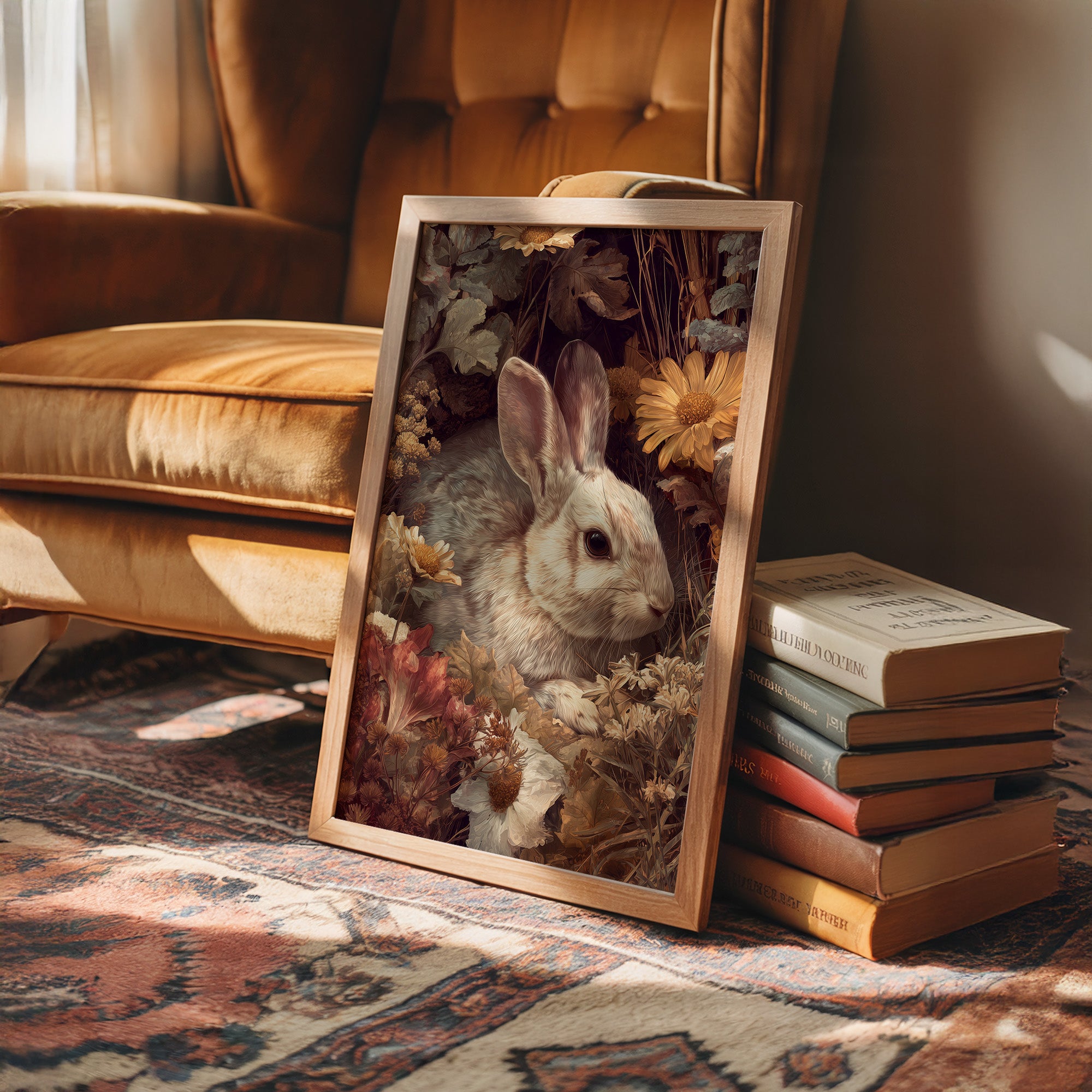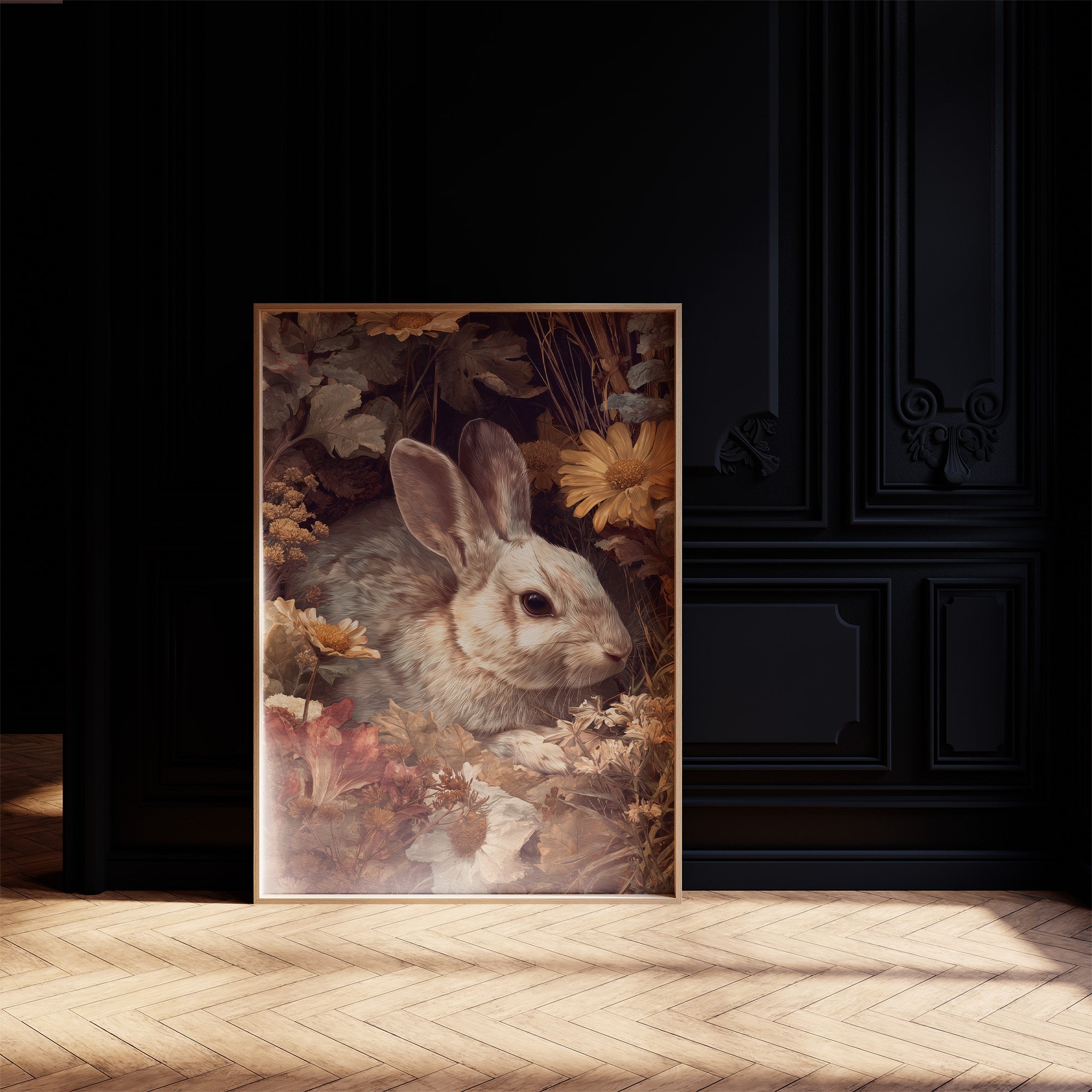 Nestled among faded blooms and dried foliage, a soft-eyed rabbit pauses in quiet observation. The gentle creature blends harmoniously with the warm autumn palette of golden daisies and muted earth tones, creating a scene of natural tranquility. Delicate details capture the rabbit's alert expression and velvety fur against the textured backdrop of fallen petals and weathered leaves. This sophisticated portrayal of woodland life brings refined natural elegance to contemporary interiors. Perfect for studies, reading nooks, or dining areas where its subtle depth can be appreciated in moments of reflection.