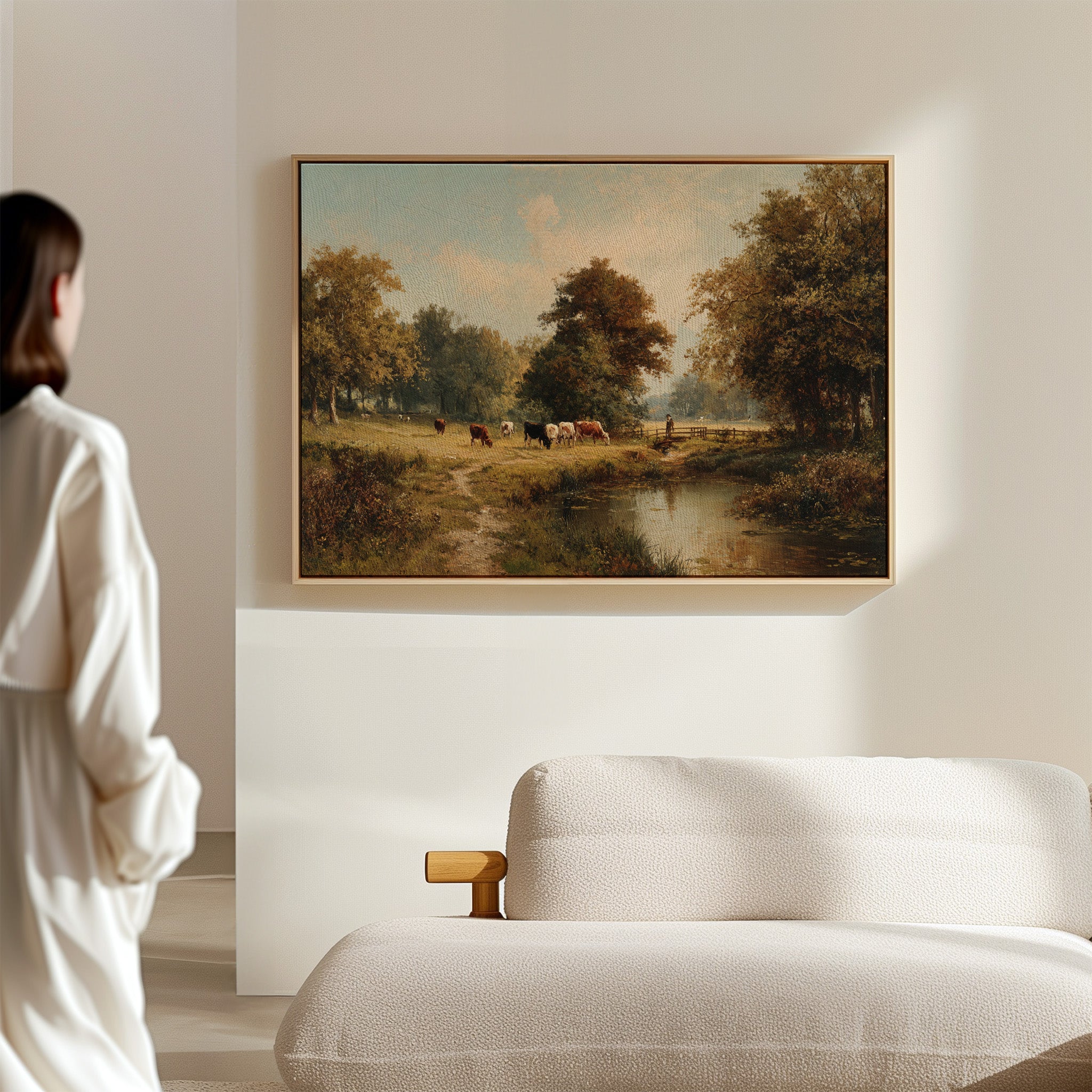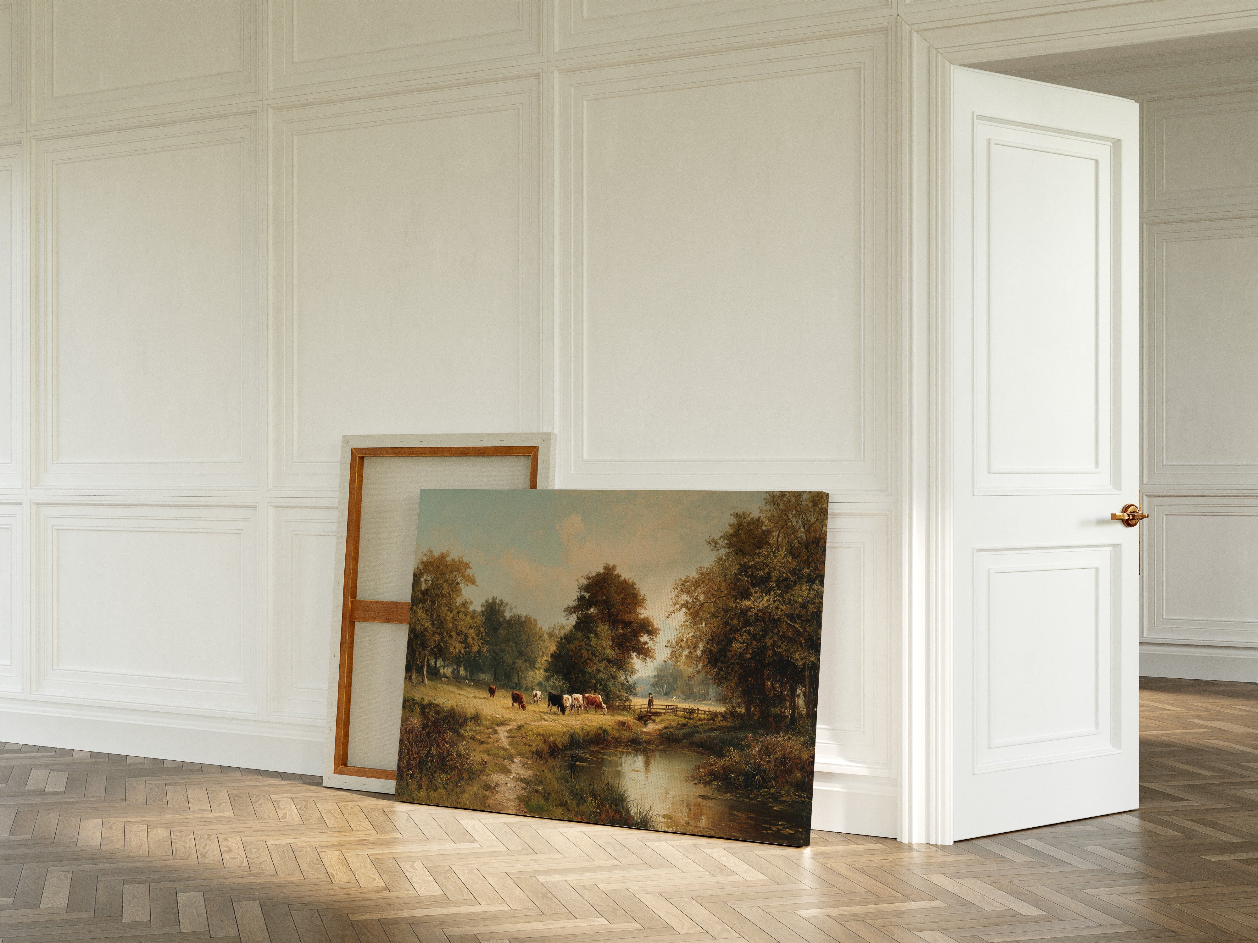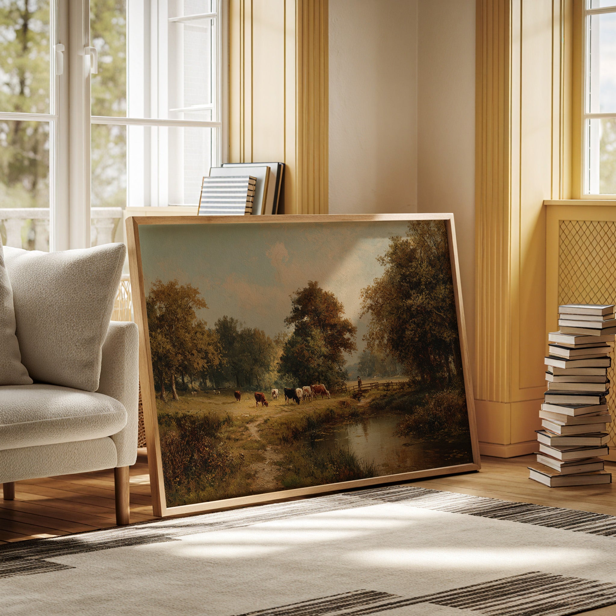 Golden light filters through ancient oaks, casting long shadows across a pastoral scene where contentment flows as naturally as the quiet stream. Cattle graze peacefully along the meandering riverbank, their varied coats of russet and cream creating a harmony with the autumn-touched landscape. The careful brushwork captures every detail - from the weathered wooden fence to the lone figure watching over their herd, while the still water mirrors the serene sky above. This timeless scene brings the tranquility of rural life into focus, where nature and agriculture exist in perfect balance. Perfect for a formal dining room or study where its classical beauty and calming presence can be fully appreciated.