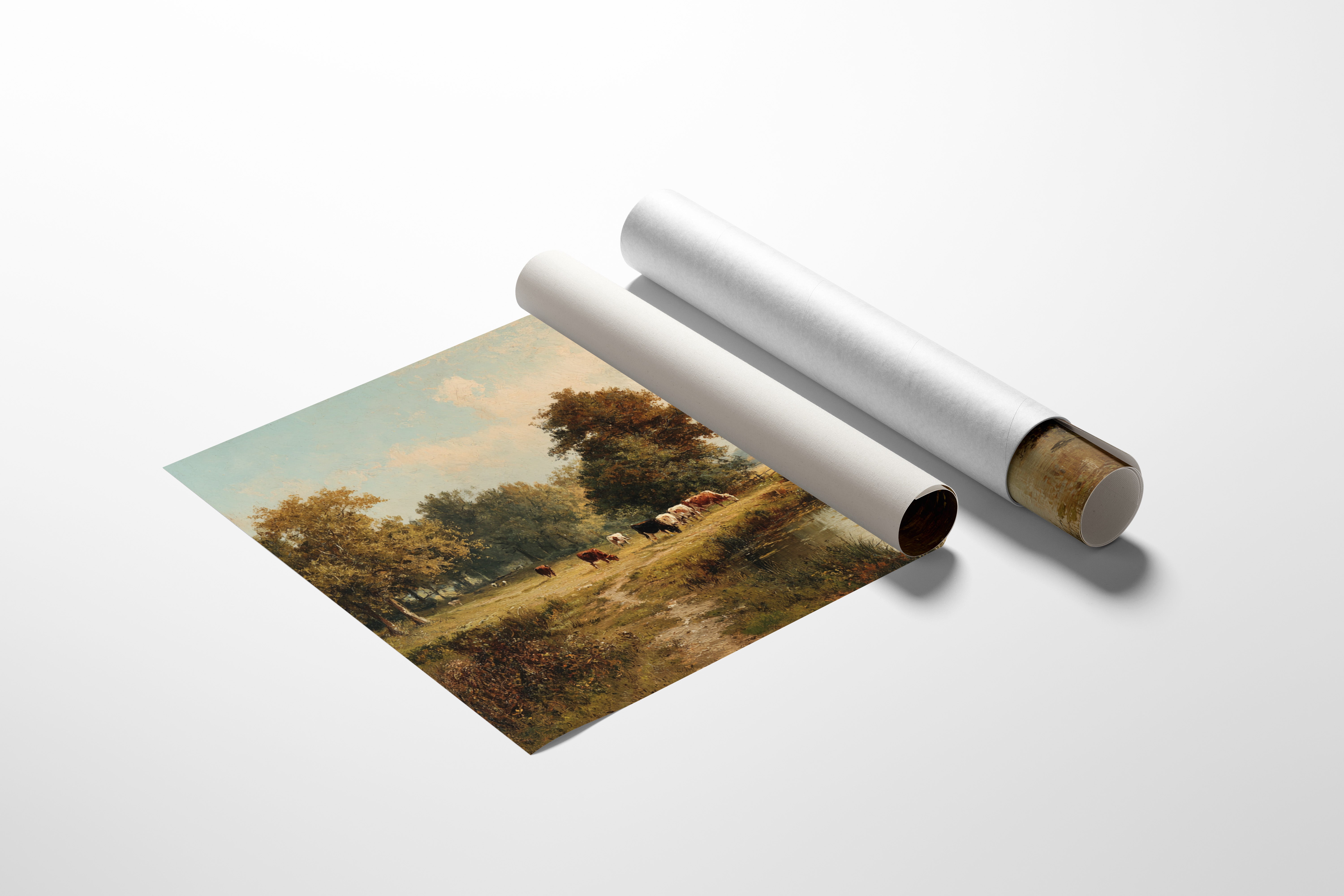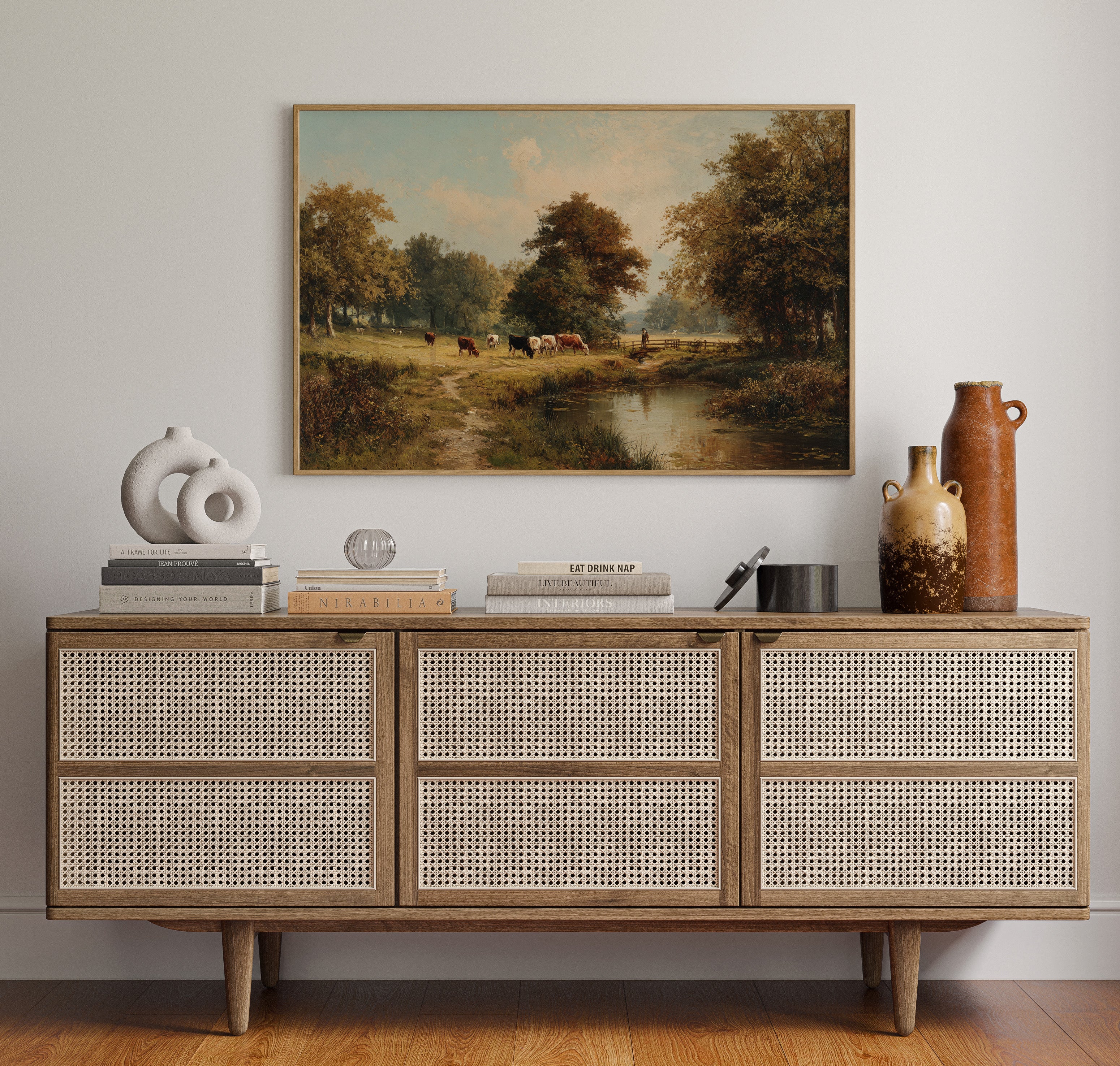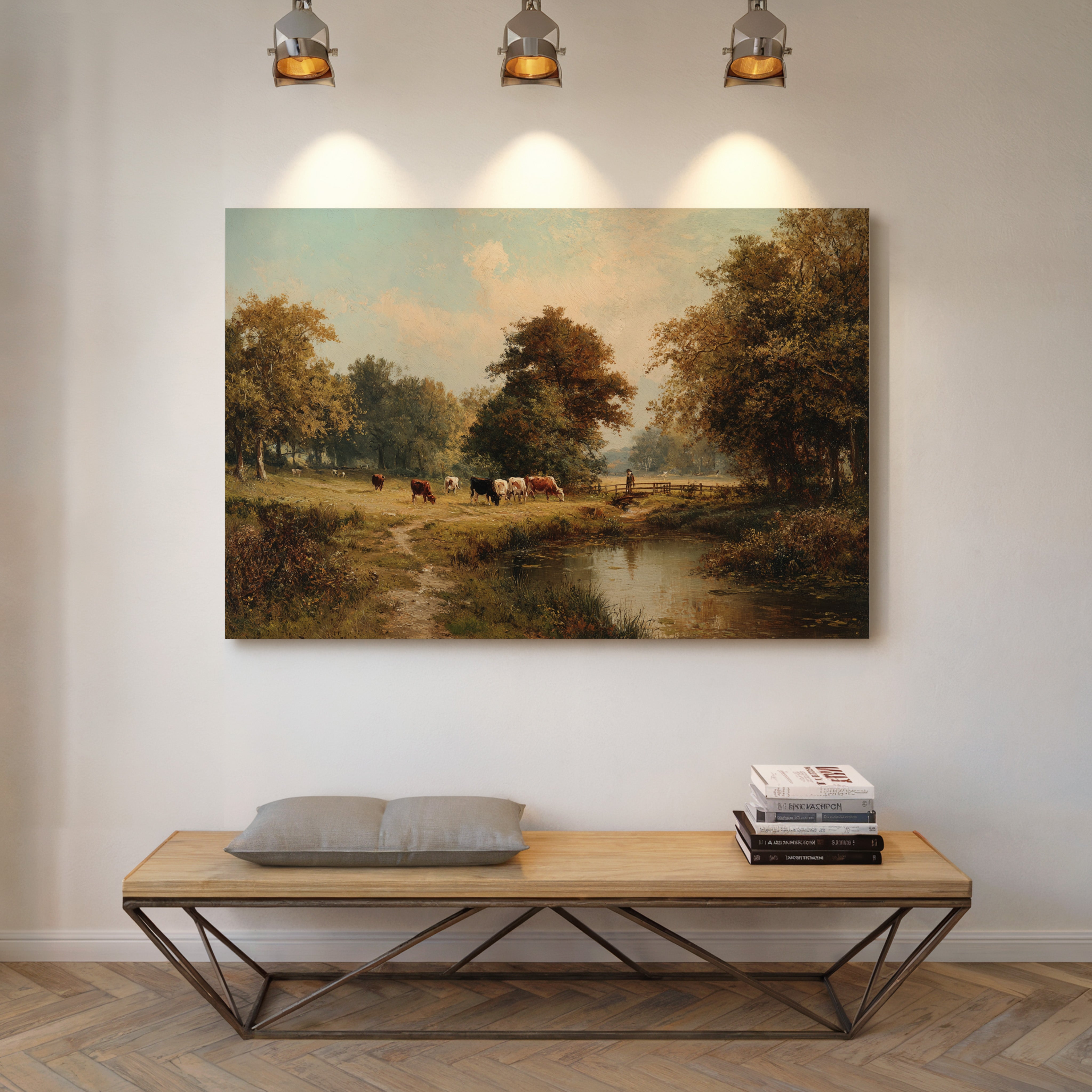 Golden light filters through ancient oaks, casting long shadows across a pastoral scene where contentment flows as naturally as the quiet stream. Cattle graze peacefully along the meandering riverbank, their varied coats of russet and cream creating a harmony with the autumn-touched landscape. The careful brushwork captures every detail - from the weathered wooden fence to the lone figure watching over their herd, while the still water mirrors the serene sky above. This timeless scene brings the tranquility of rural life into focus, where nature and agriculture exist in perfect balance. Perfect for a formal dining room or study where its classical beauty and calming presence can be fully appreciated.