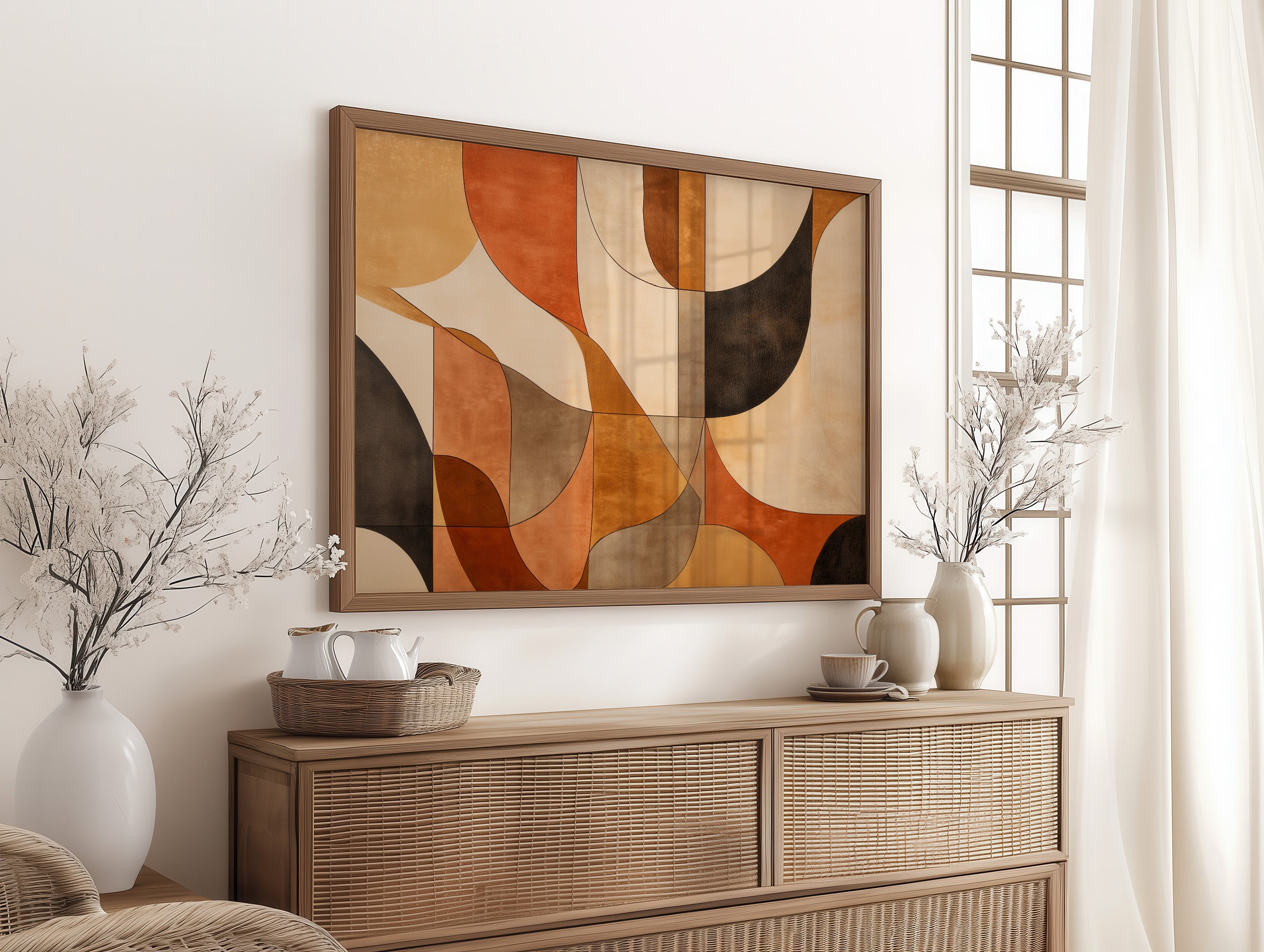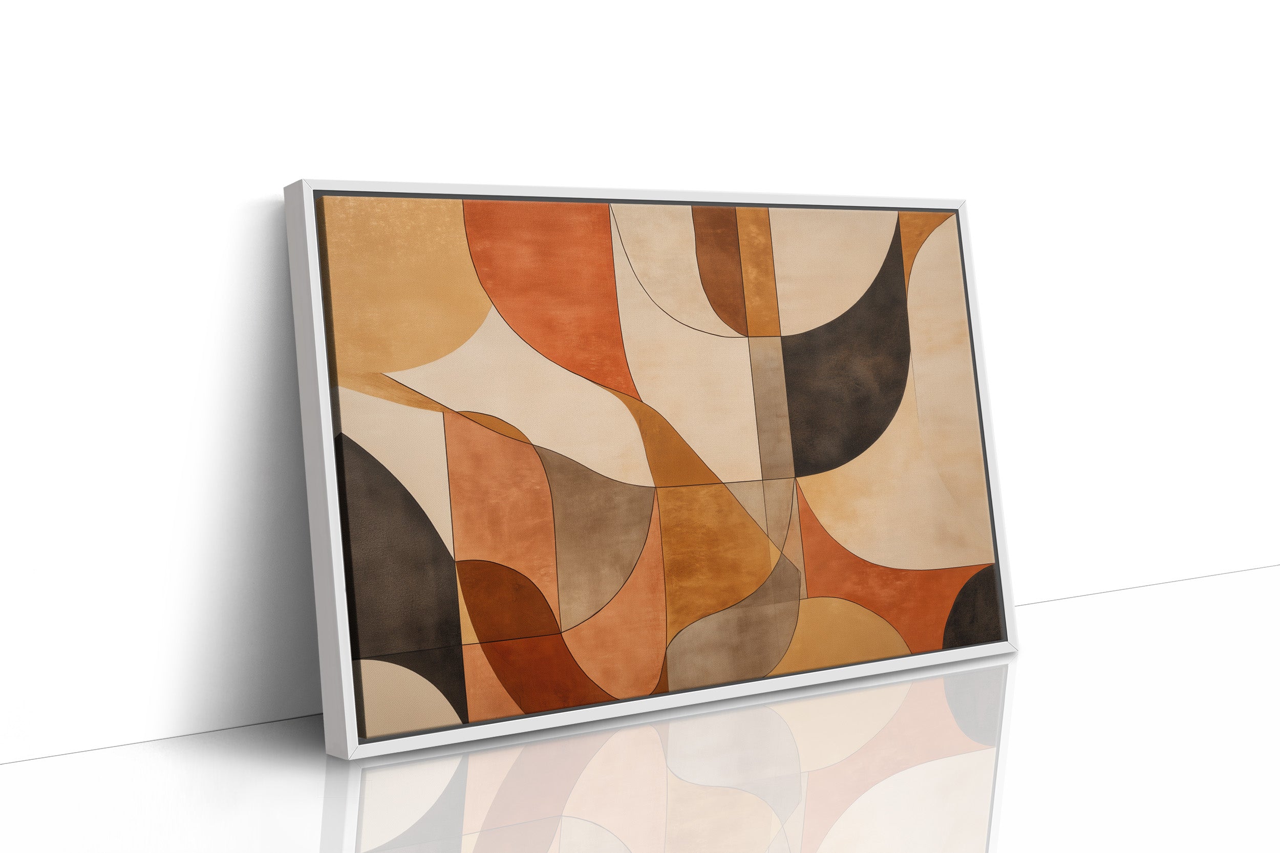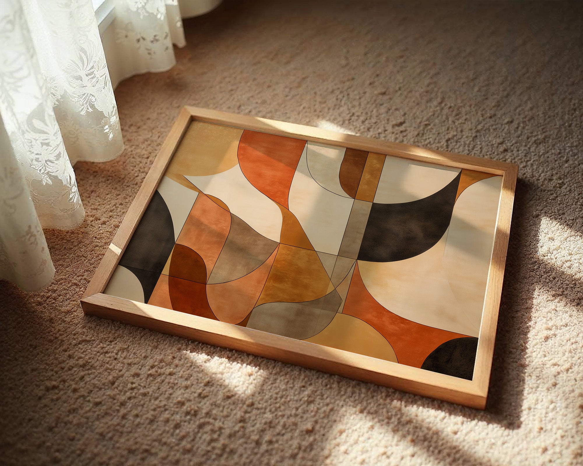 Warm terracotta and rich earth tones dance together in graceful arcs, creating a mesmerizing rhythm of shape and shadow. The composition flows like a melodic autumn afternoon, where curved forms overlap and intersect in a sophisticated choreography of color. Deep browns and soft creams provide anchoring contrast to the vibrant orange hues, while the geometric precision maintains a sense of modern elegance. This piece would bring sophisticated warmth to a minimalist dining room or create an inviting focal point in a contemporary living space.