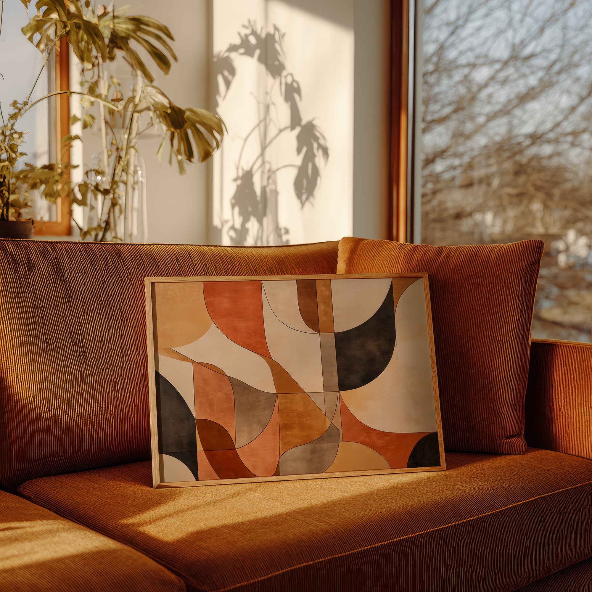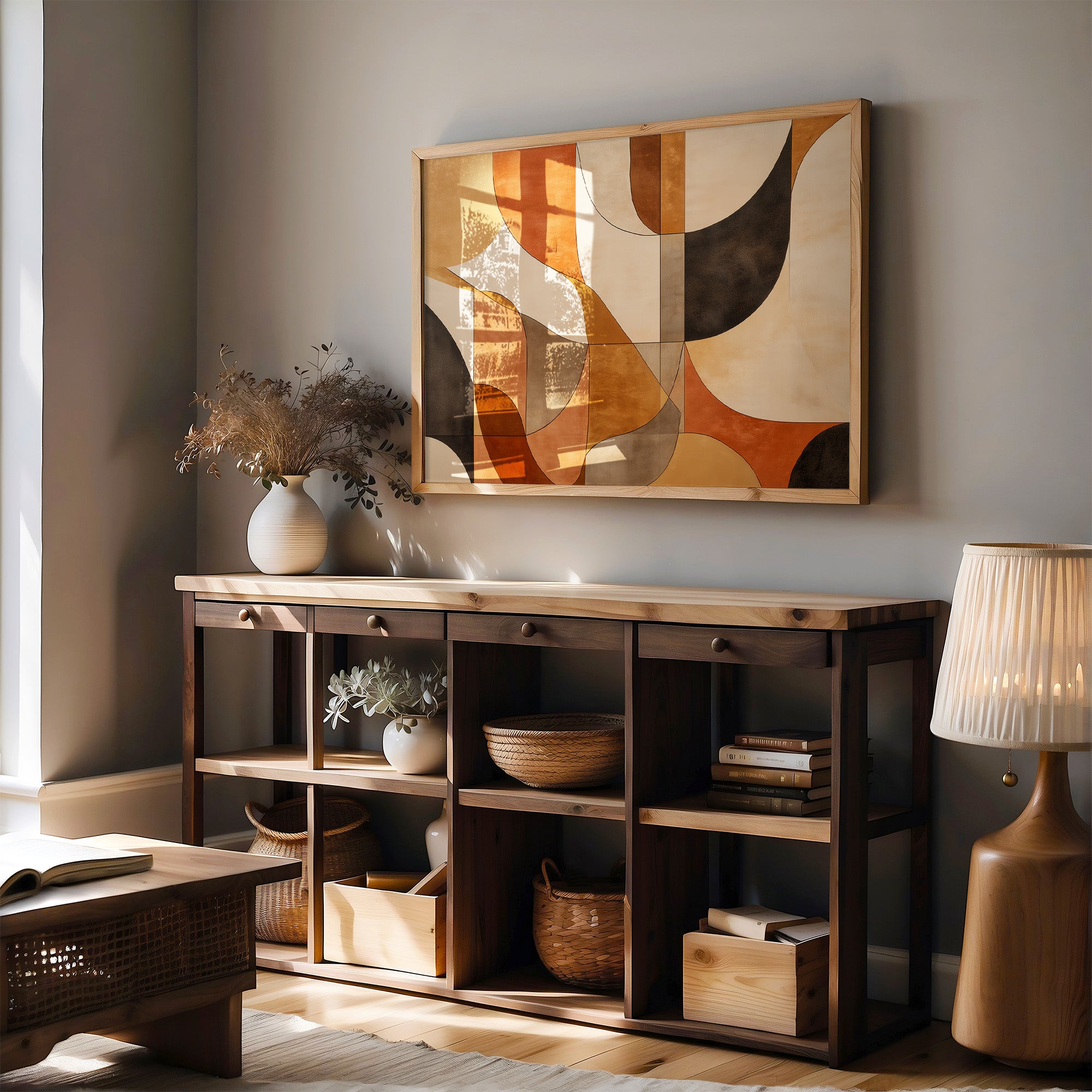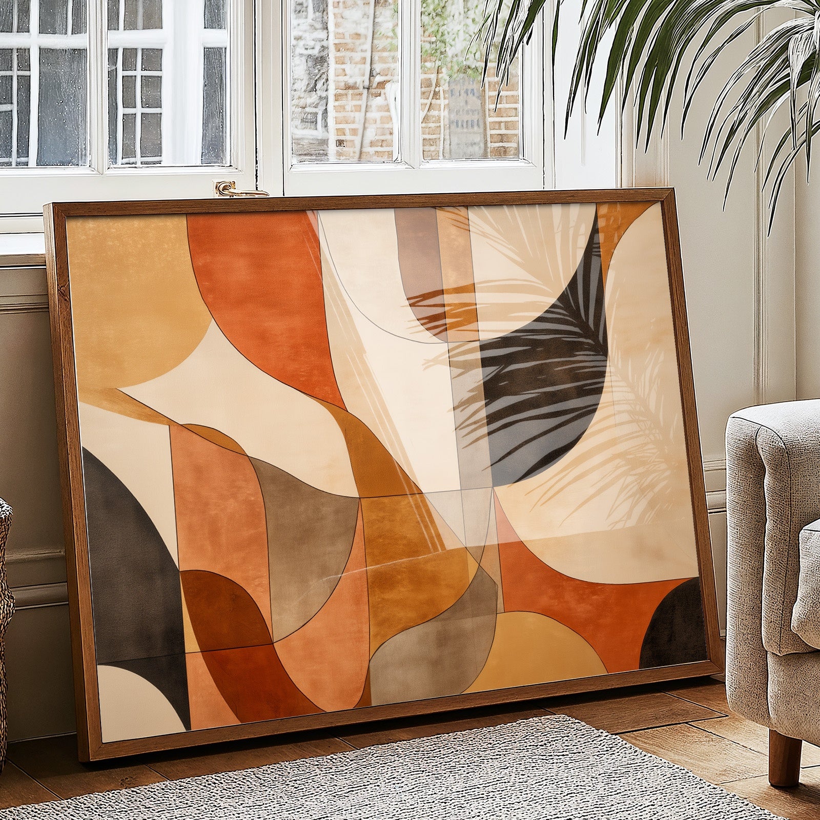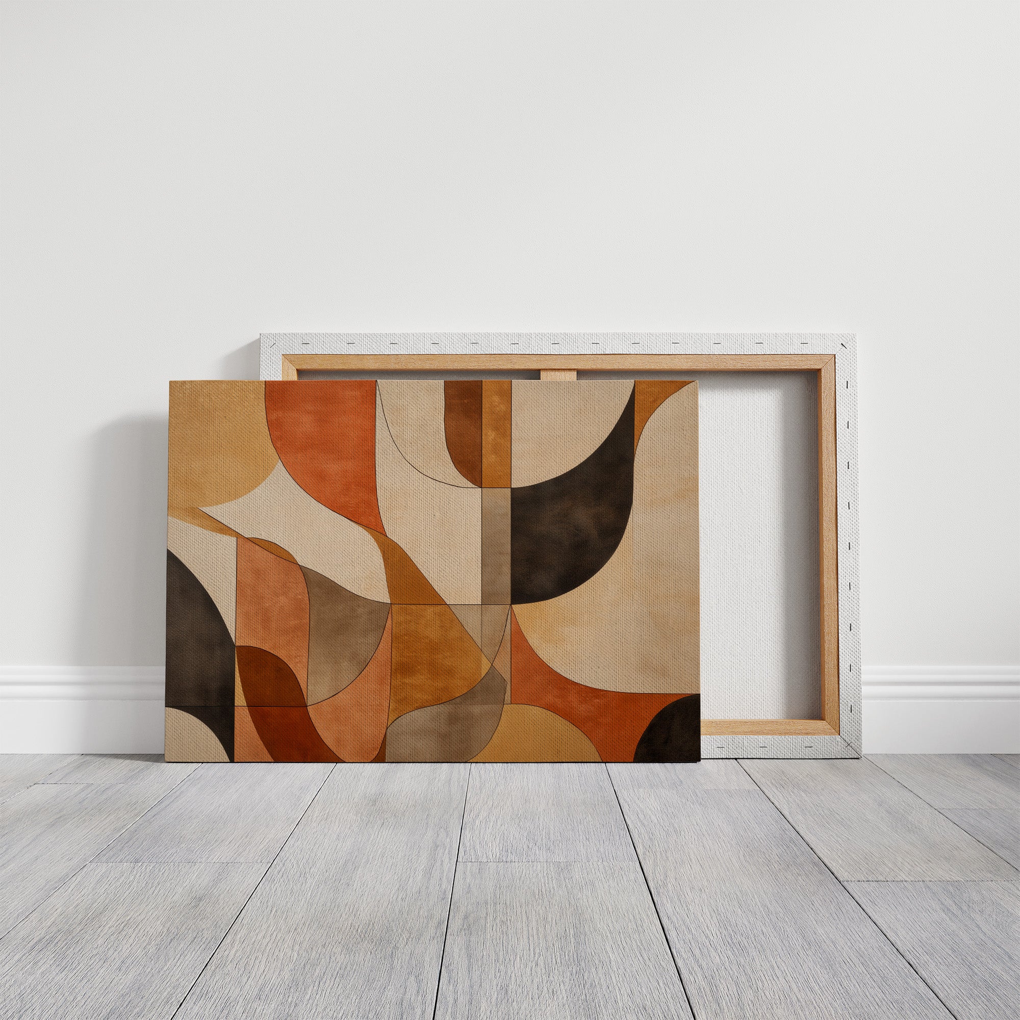 Warm terracotta and rich earth tones dance together in graceful arcs, creating a mesmerizing rhythm of shape and shadow. The composition flows like a melodic autumn afternoon, where curved forms overlap and intersect in a sophisticated choreography of color. Deep browns and soft creams provide anchoring contrast to the vibrant orange hues, while the geometric precision maintains a sense of modern elegance. This piece would bring sophisticated warmth to a minimalist dining room or create an inviting focal point in a contemporary living space.