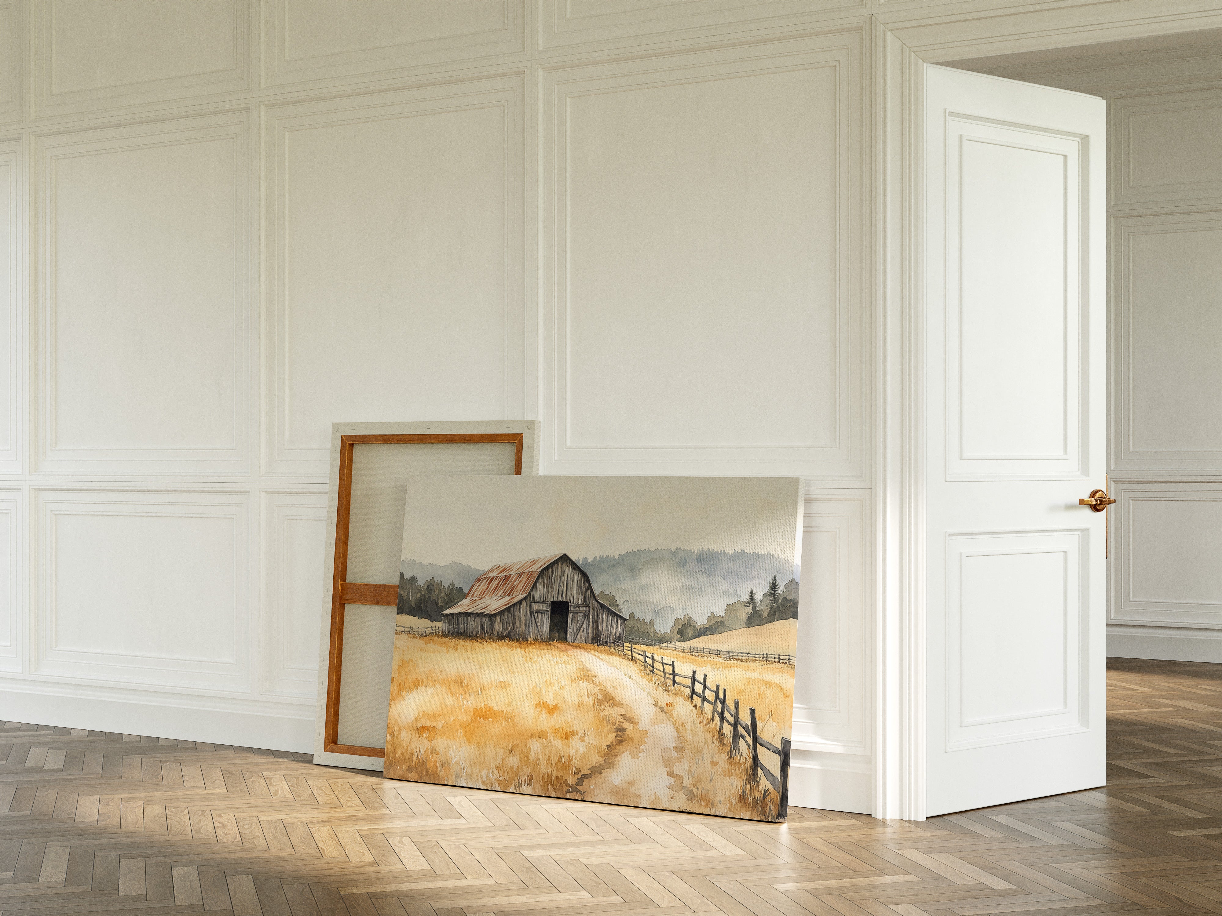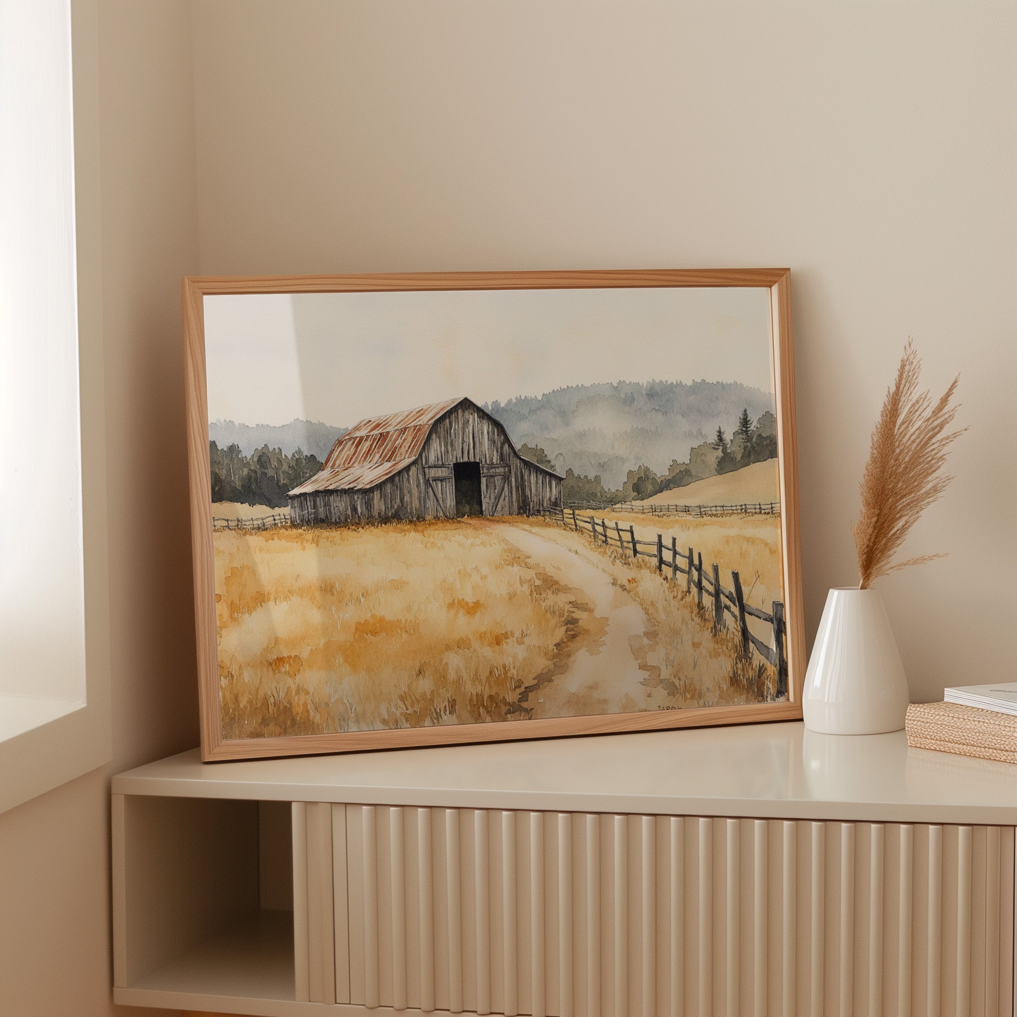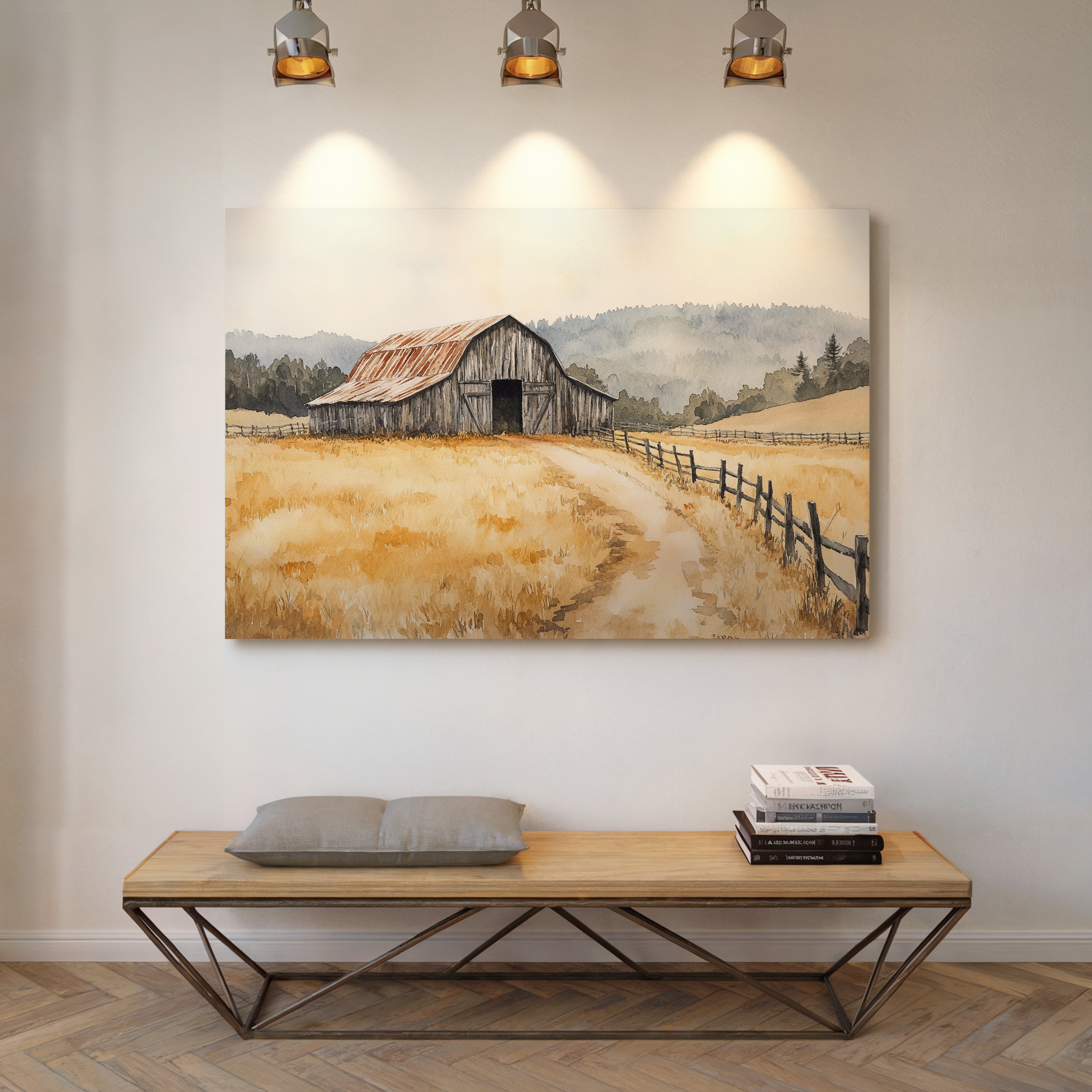 Morning mist clings to distant pines as golden wheat sways in gentle waves around a weathered barn. The rustic structure stands as a steadfast sentinel, its silver-gray boards and rust-touched roof telling stories of seasons past. A winding dirt path, bordered by split-rail fencing, curves through sun-bleached grasses like a ribbon of memories leading to the barn's welcoming darkness. This watercolor captures the essence of rural serenity, where time moves as slowly as clouds across mountain skies. Perfect for bringing pastoral charm to a dining room or adding countryside warmth to a living space seeking connection with simpler times.