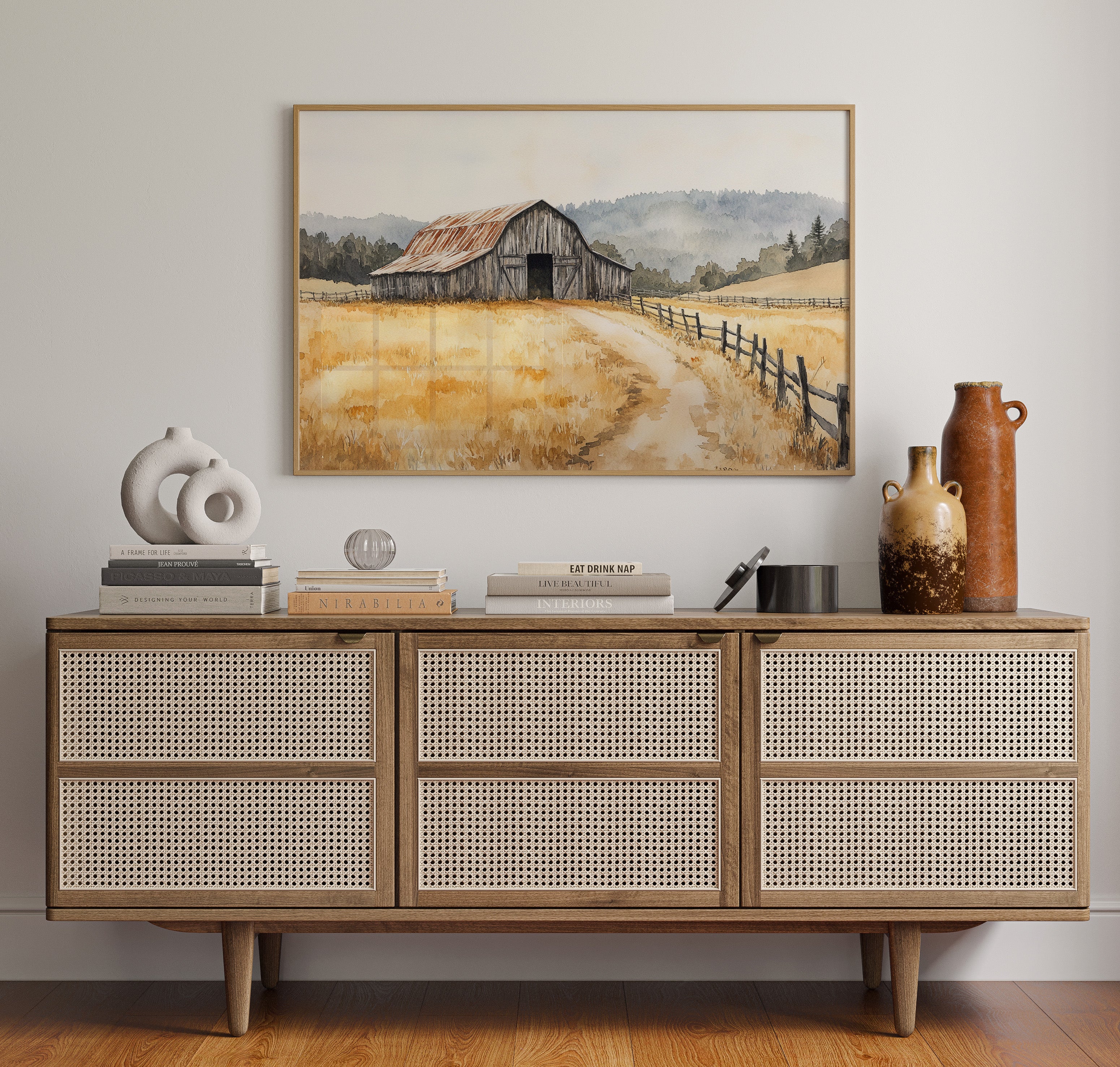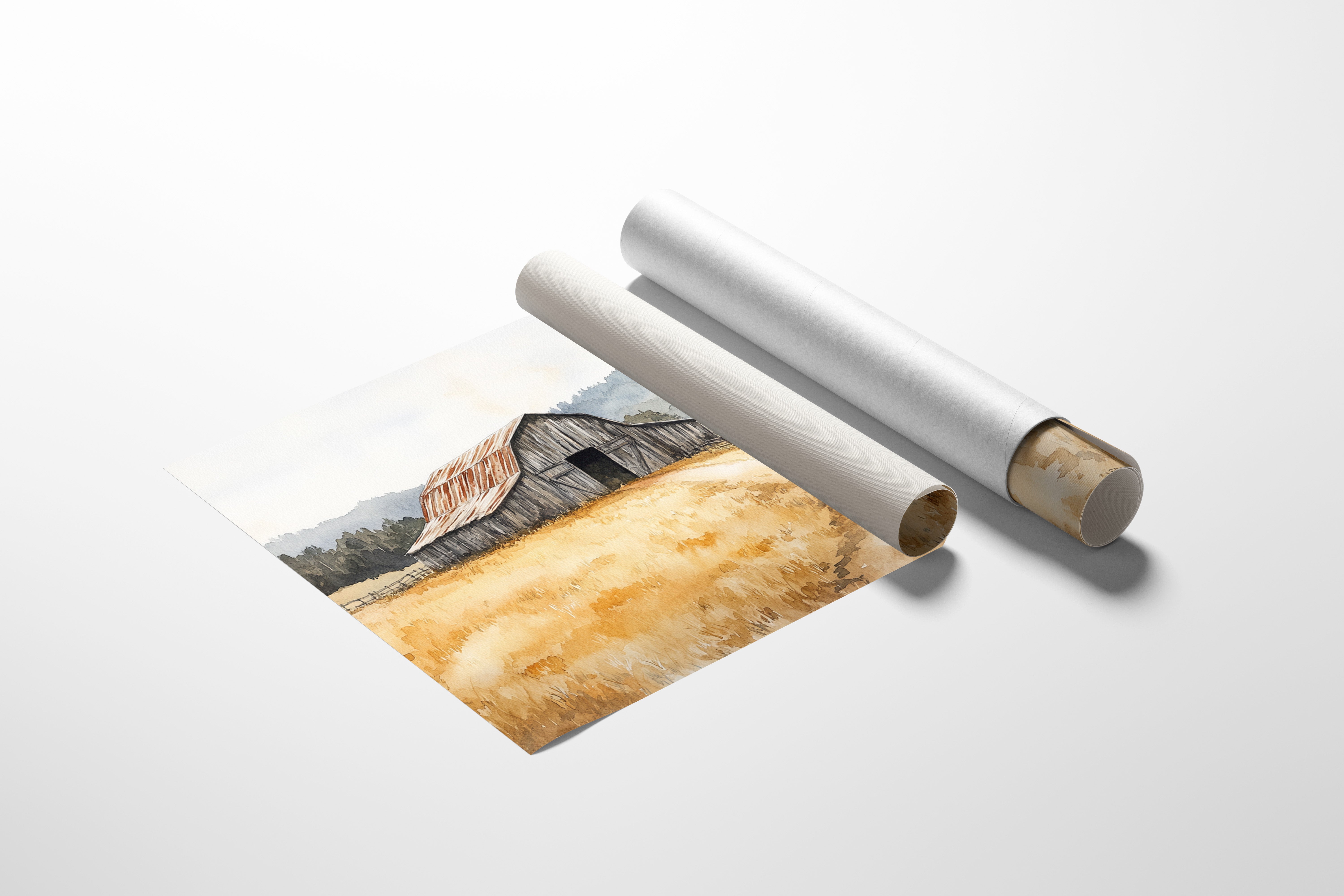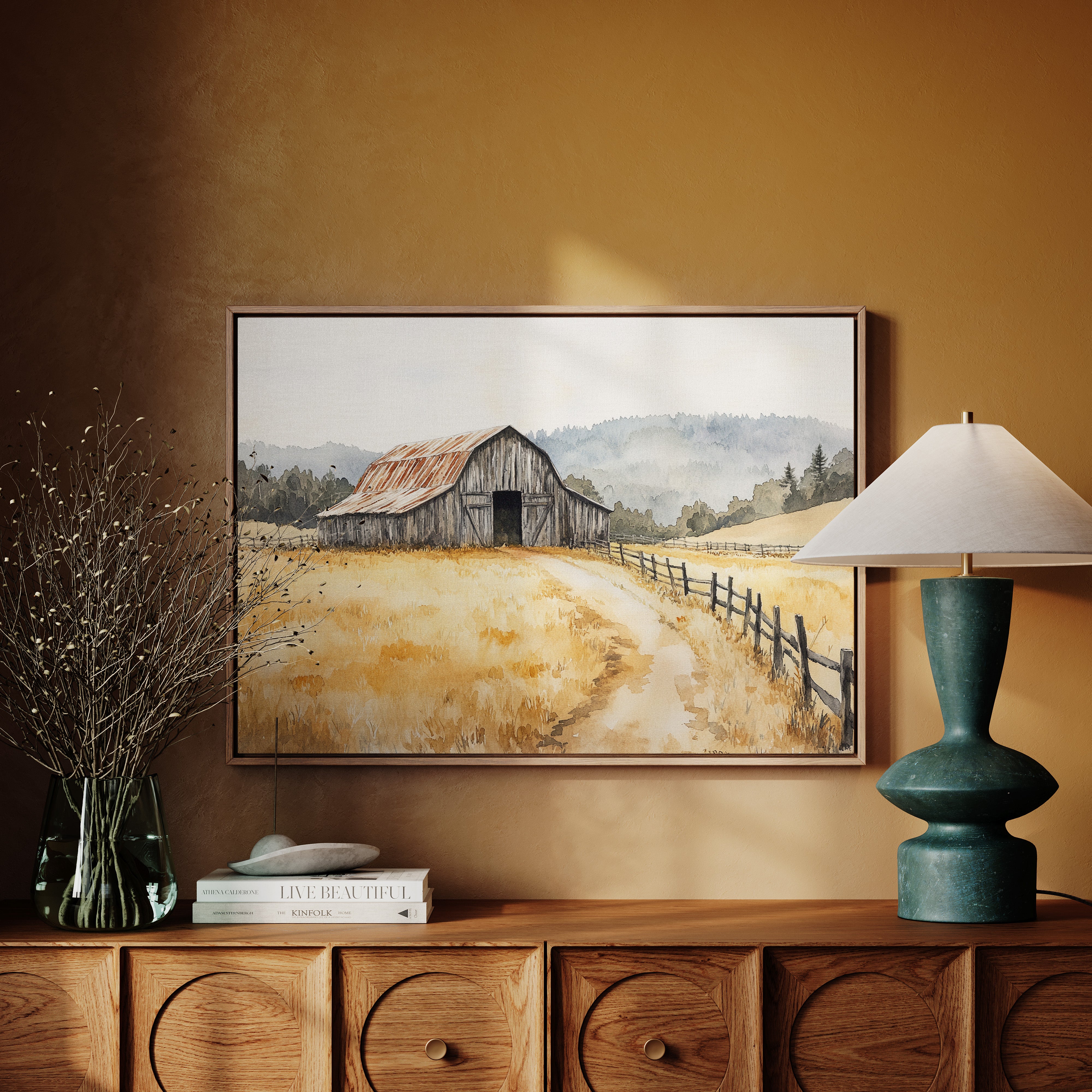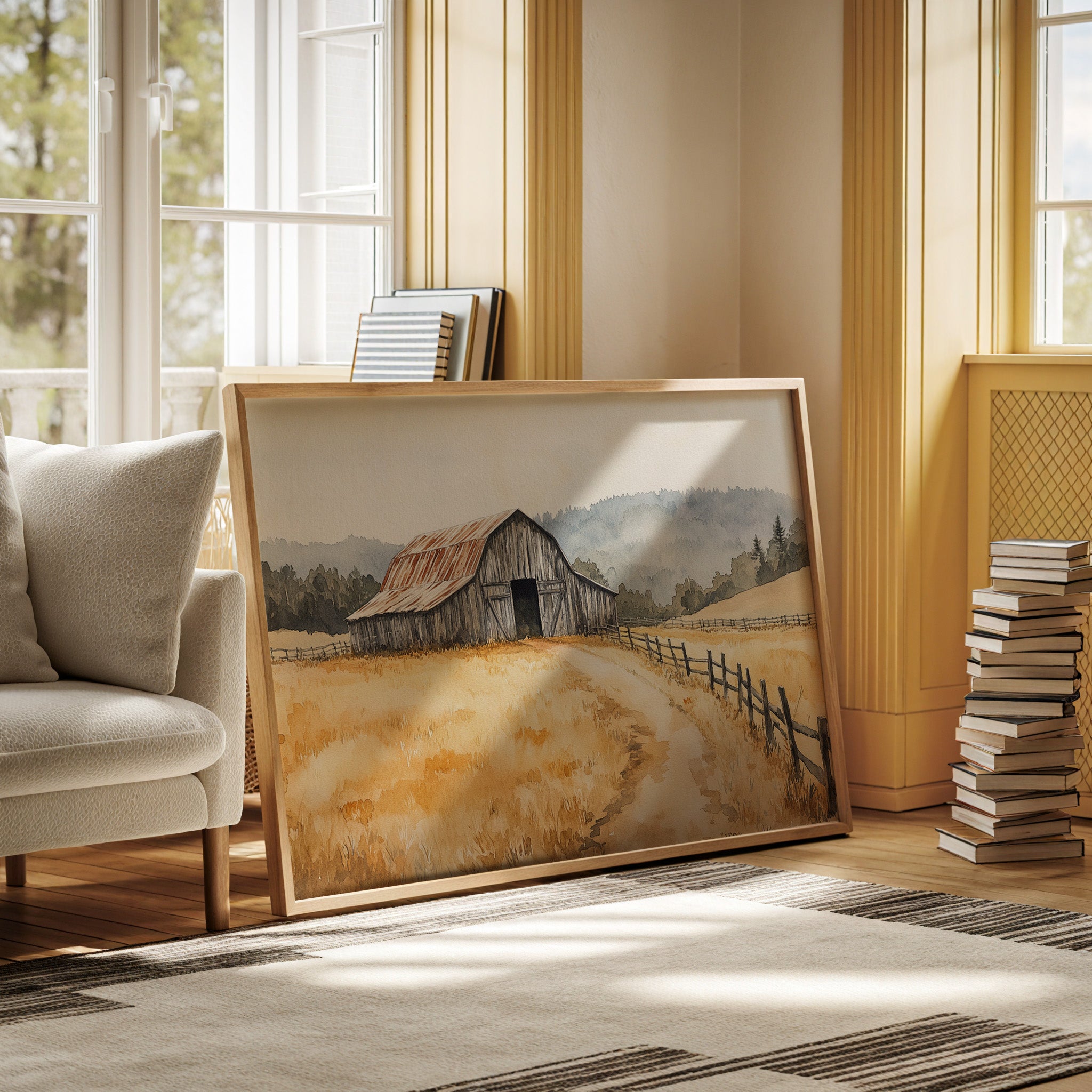 Morning mist clings to distant pines as golden wheat sways in gentle waves around a weathered barn. The rustic structure stands as a steadfast sentinel, its silver-gray boards and rust-touched roof telling stories of seasons past. A winding dirt path, bordered by split-rail fencing, curves through sun-bleached grasses like a ribbon of memories leading to the barn's welcoming darkness. This watercolor captures the essence of rural serenity, where time moves as slowly as clouds across mountain skies. Perfect for bringing pastoral charm to a dining room or adding countryside warmth to a living space seeking connection with simpler times.