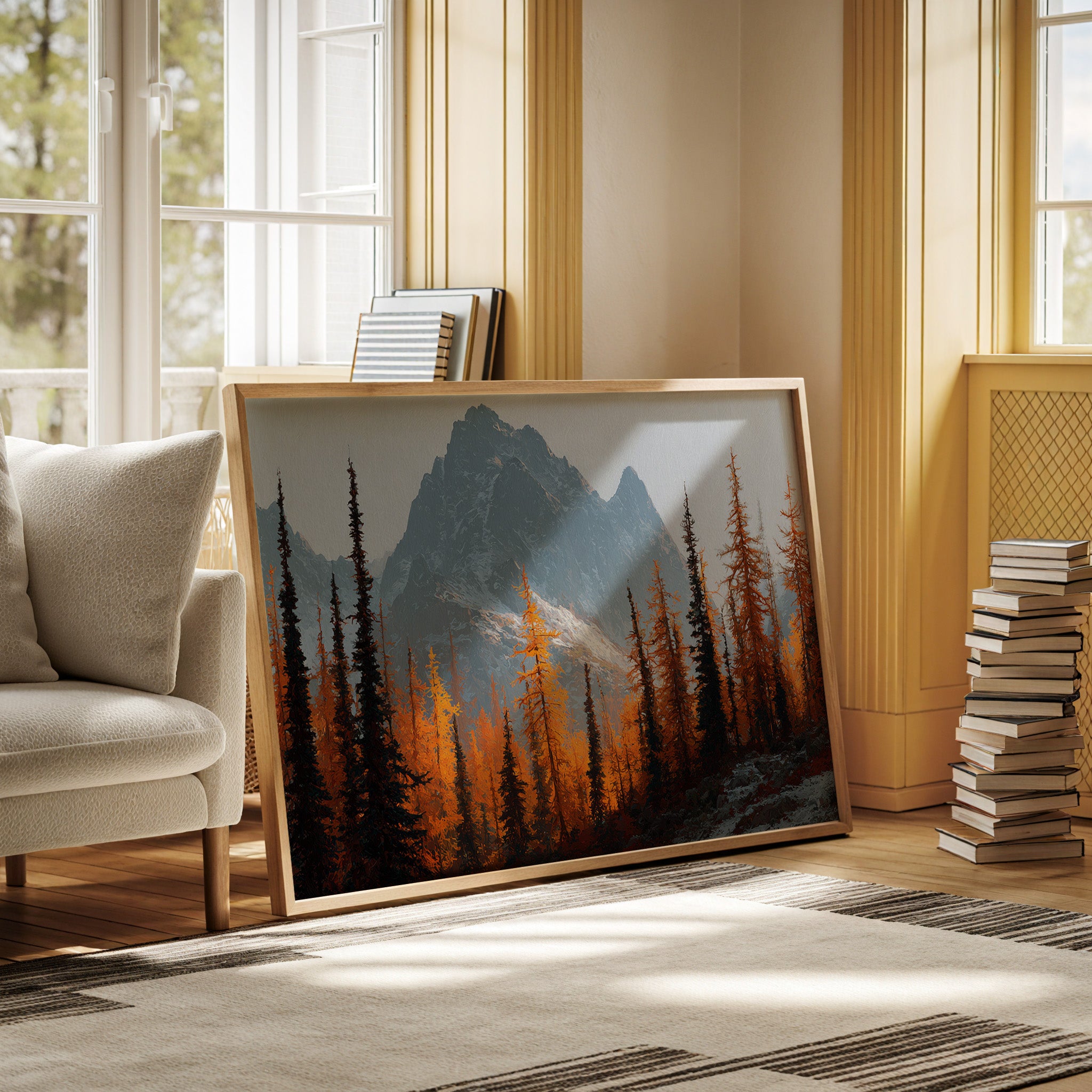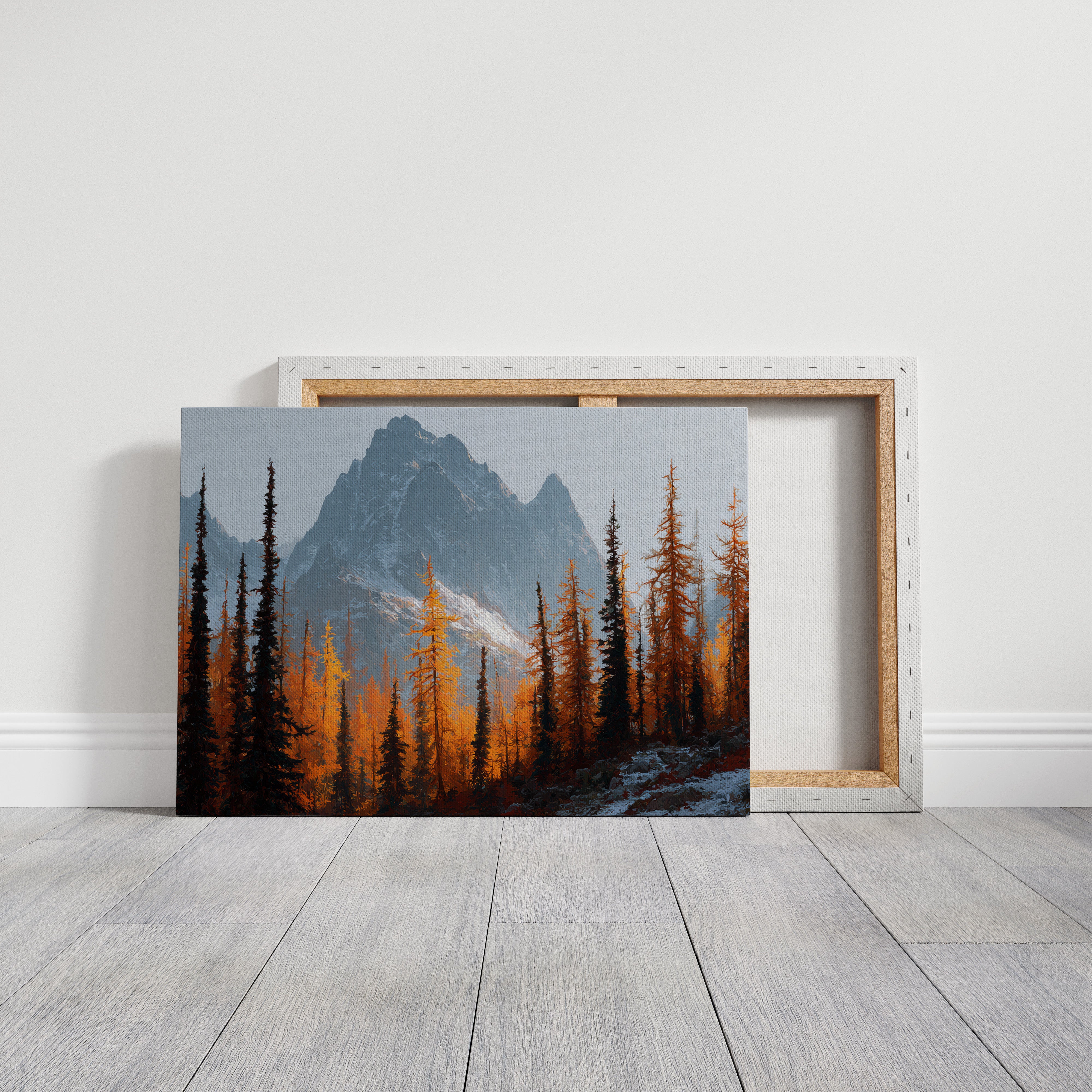 Golden larches stand like flames against the crisp mountain air, their needles catching the low autumn light. The stark contrast between warm amber forests and cool slate-blue peaks creates a mesmerizing dance of seasons. Rugged mountain faces wear the first dusting of snow, while below, the forest glows with supernatural warmth, each tree a torch in nature's grand display. This scene captures the fleeting moment when fall's last breath meets winter's first advance.