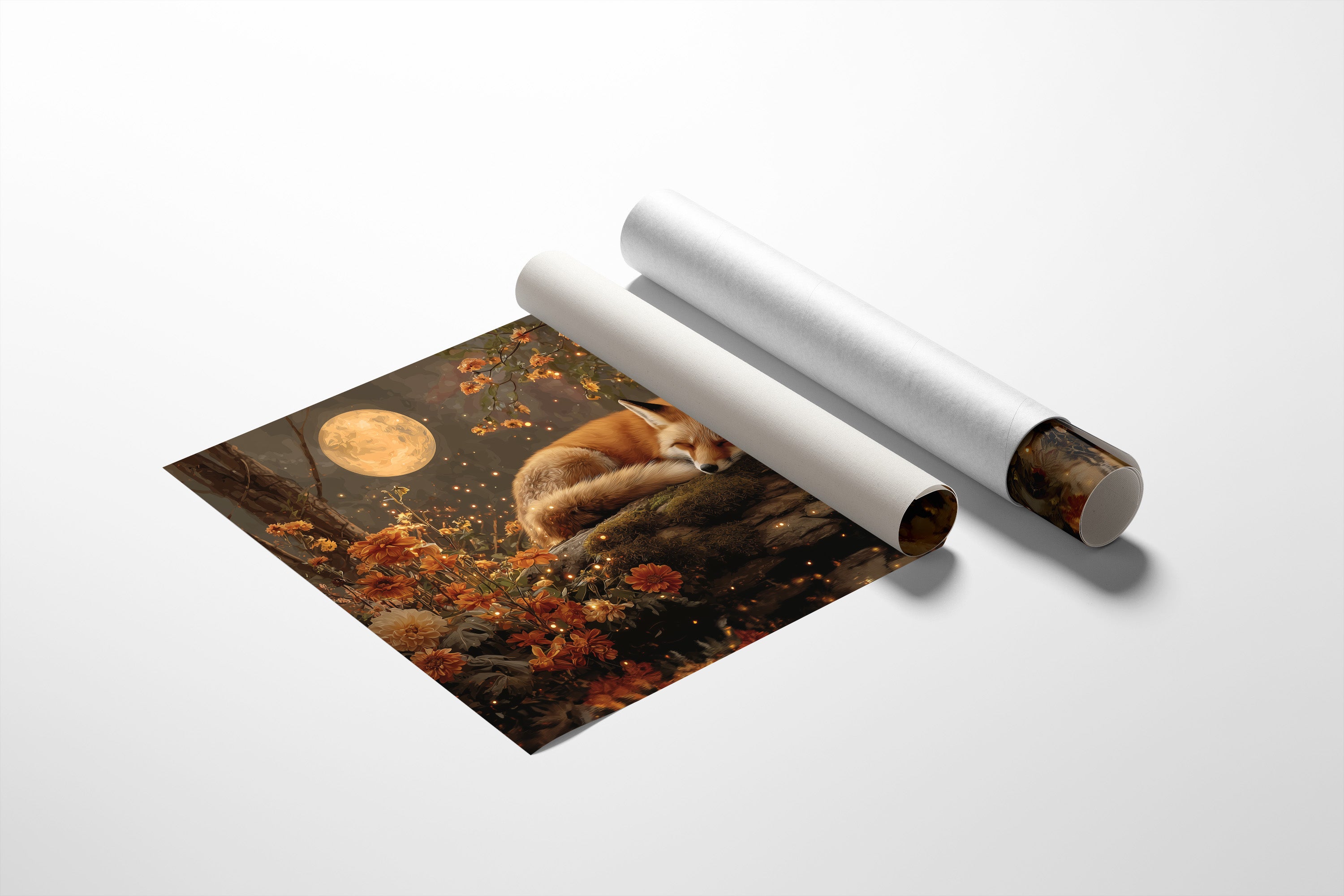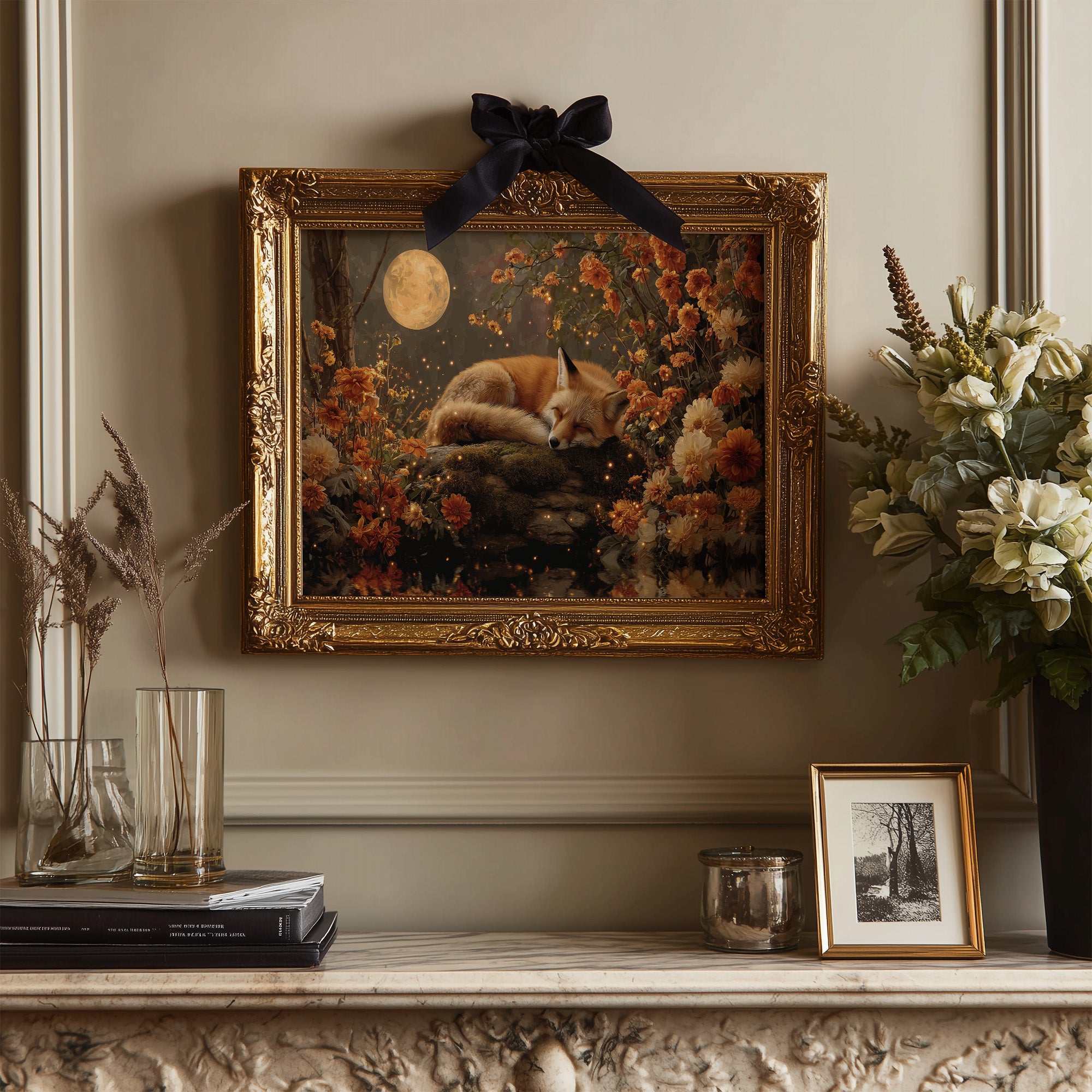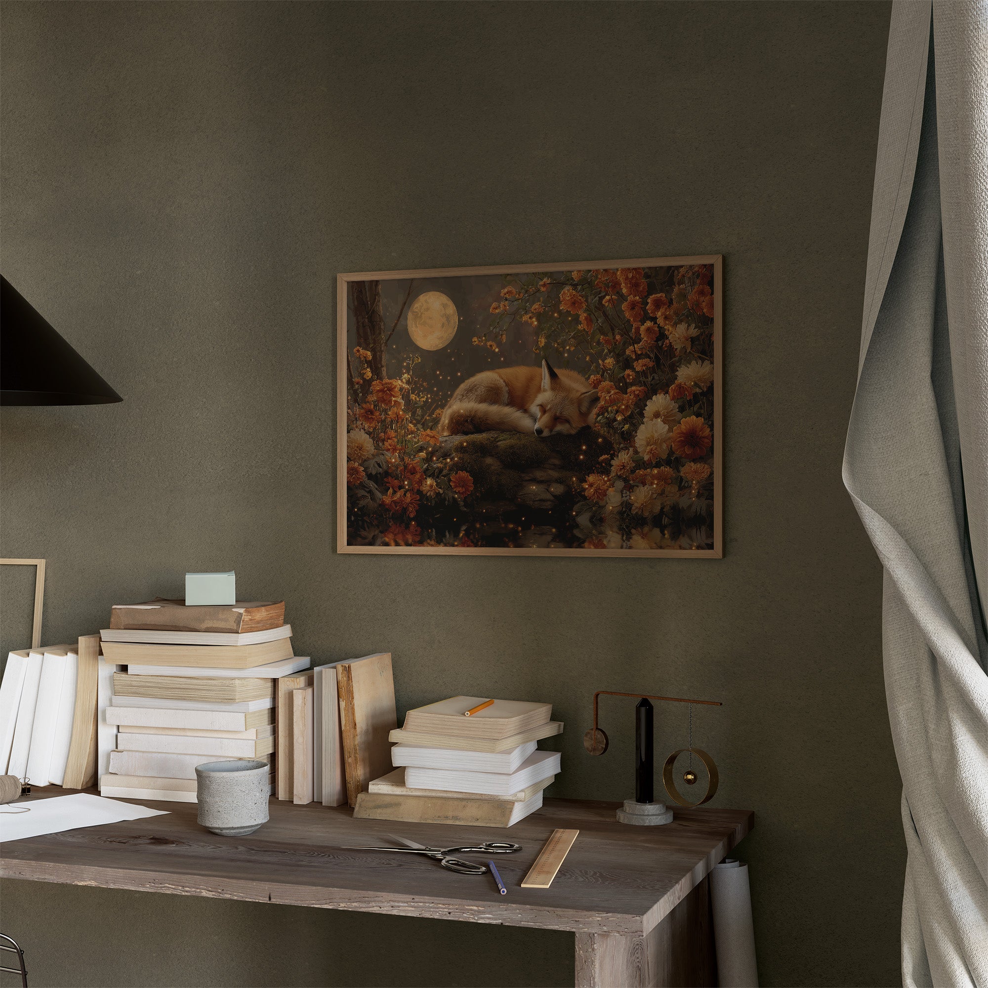 The gentle curve of a sleeping fox nestles among a cascade of autumn blooms, bathed in the soft glow of a harvest moon. Amber and cream flowers create a natural sanctuary, their petals catching the sparkle of mysterious lights that dance like fireflies in the night. This tranquil scene rests against a backdrop of well-loved books, bringing wilderness magic into the intellectual heart of a home. Perfect for creating a focal point in a reading nook, home office, or any space where you seek both comfort and inspiration.