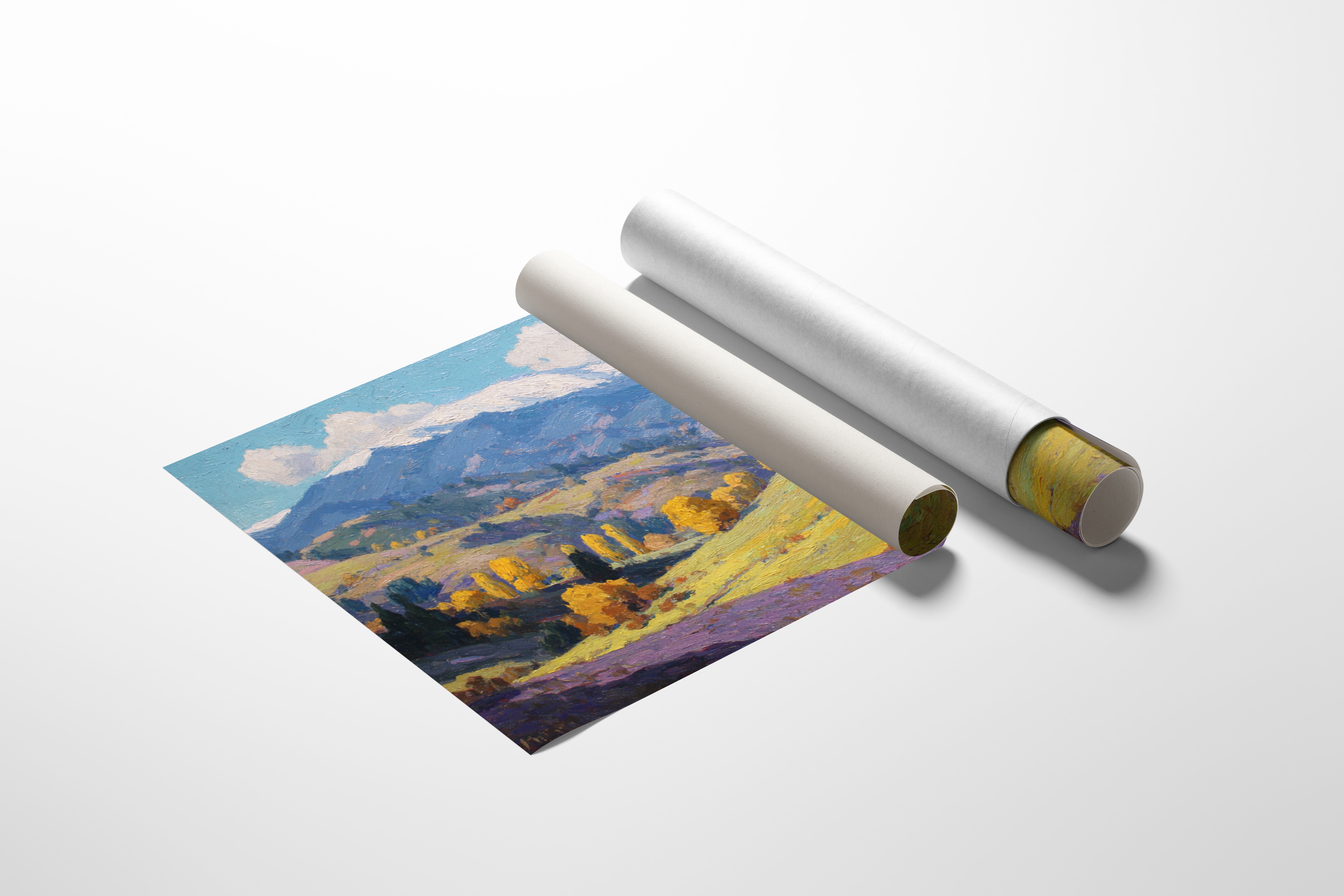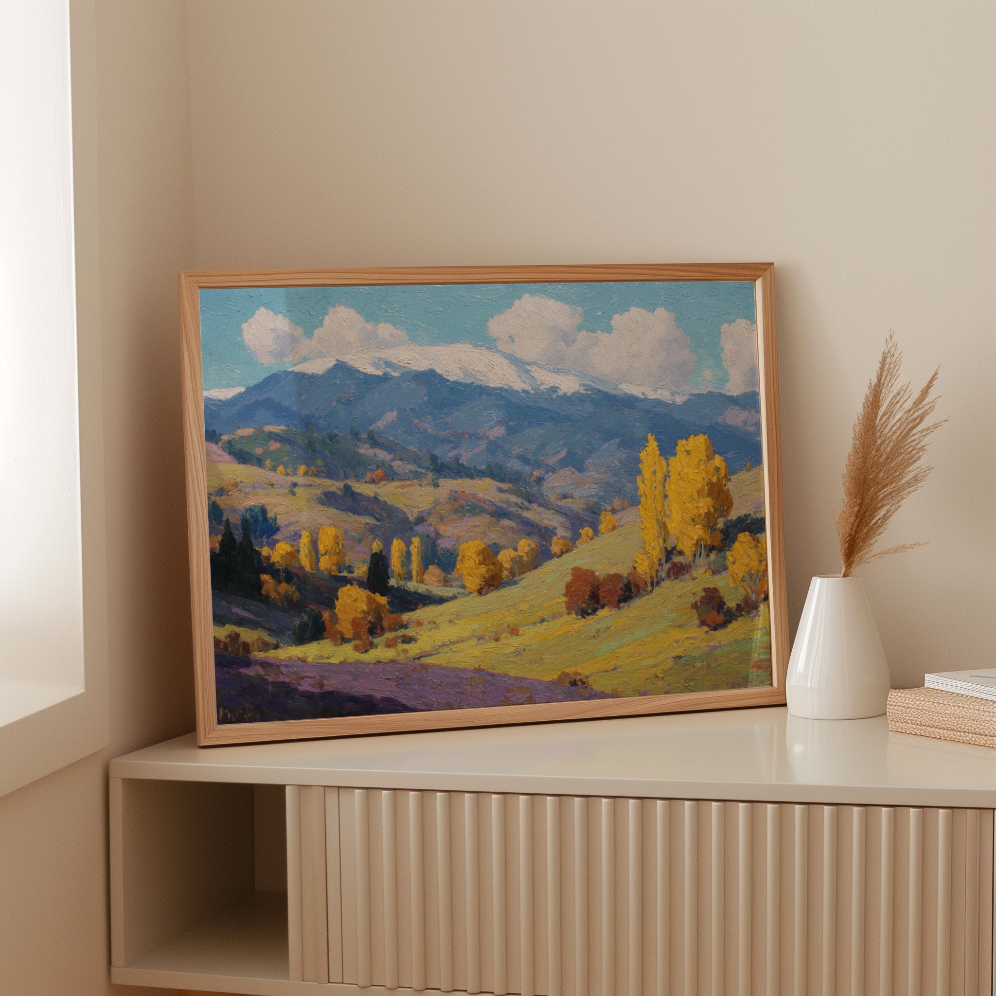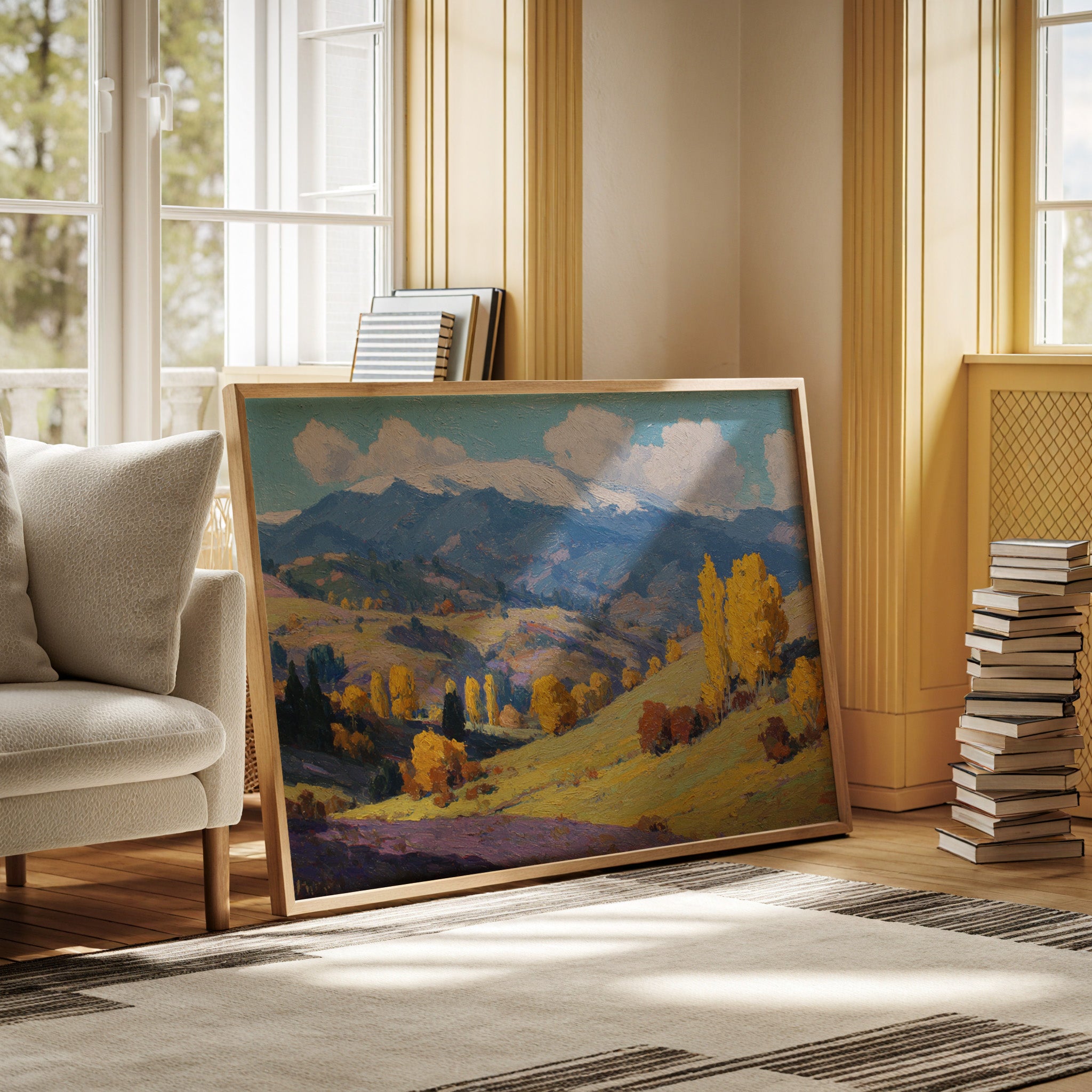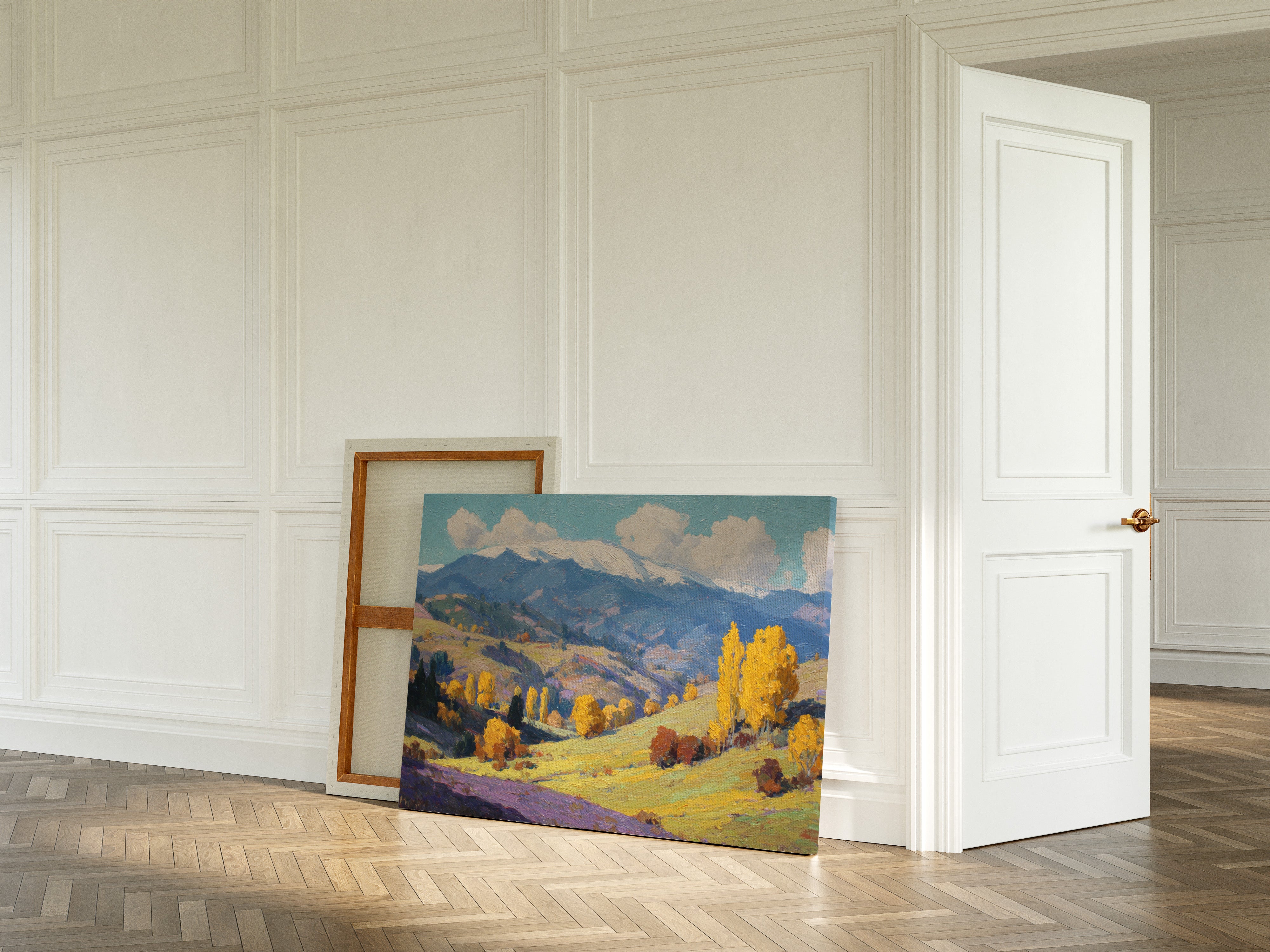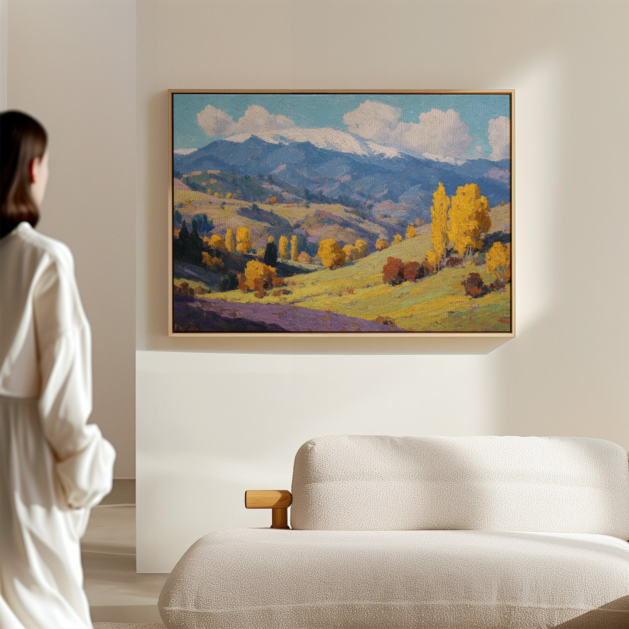 Sunlight spills across rolling hills, setting golden aspens ablaze against azure mountains. The landscape unfolds in a masterful dance of color and texture, where impressionistic brushstrokes capture the essence of a perfect autumn day. Deep purples and blues of distant peaks create a dramatic backdrop for the warmth of autumn foliage, while scattered clouds drift lazily across a turquoise sky. This scene would bring natural majesty to a living room or dining area, creating a window to the changing seasons.