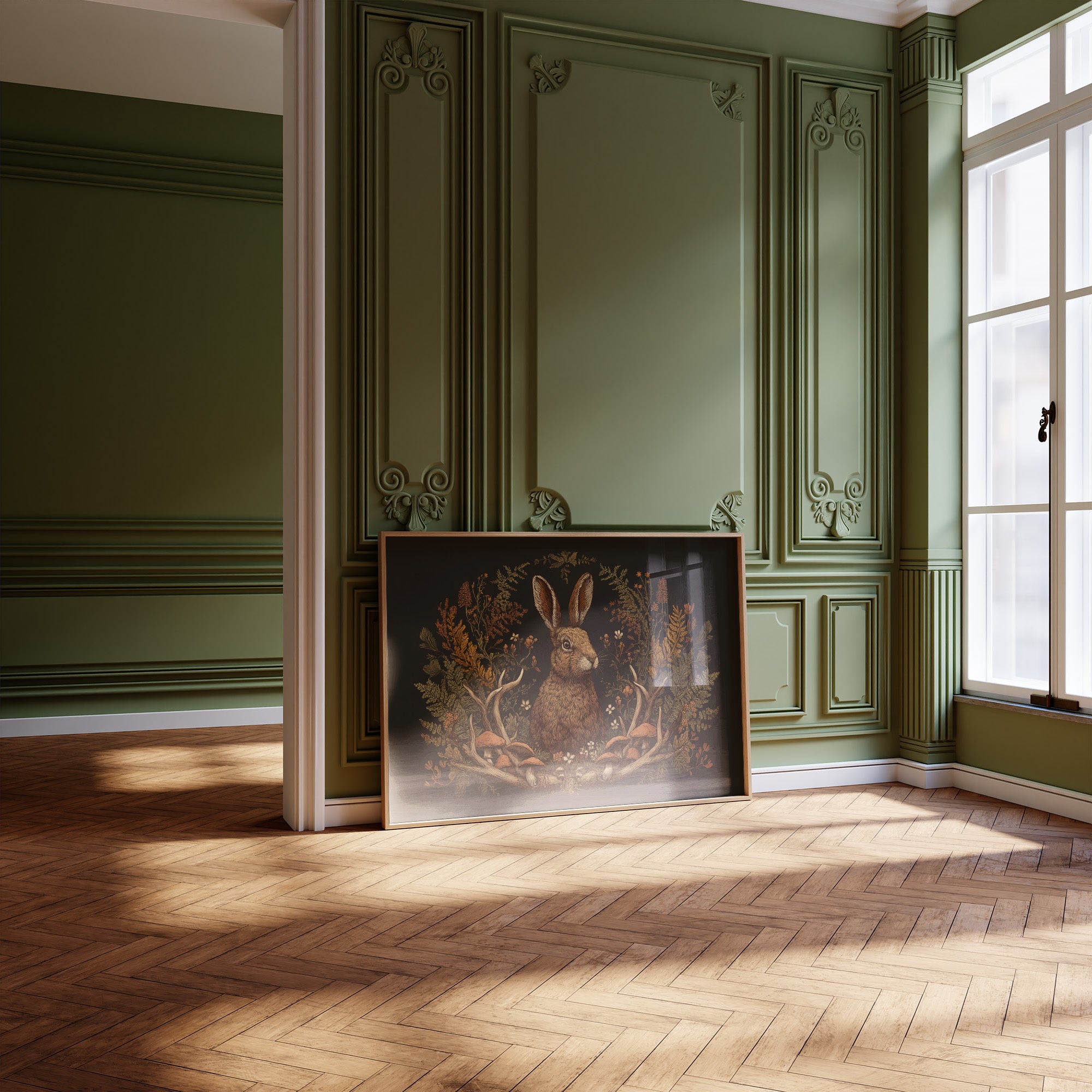 Nestled within a tapestry of forest flora, a watchful hare sits surrounded by the rich bounty of fall. The deep emerald background creates a dramatic canvas for the warm copper tones of ferns, mushrooms, and delicate wildflowers that frame the creature with natural elegance. Antlers curve protectively around this woodland scene, connecting the rabbit to the deeper rhythms of forest life and seasonal change. This sophisticated piece brings a touch of naturalist charm to a home library, study, or any space where thoughtful conversation and literary pursuits flourish.