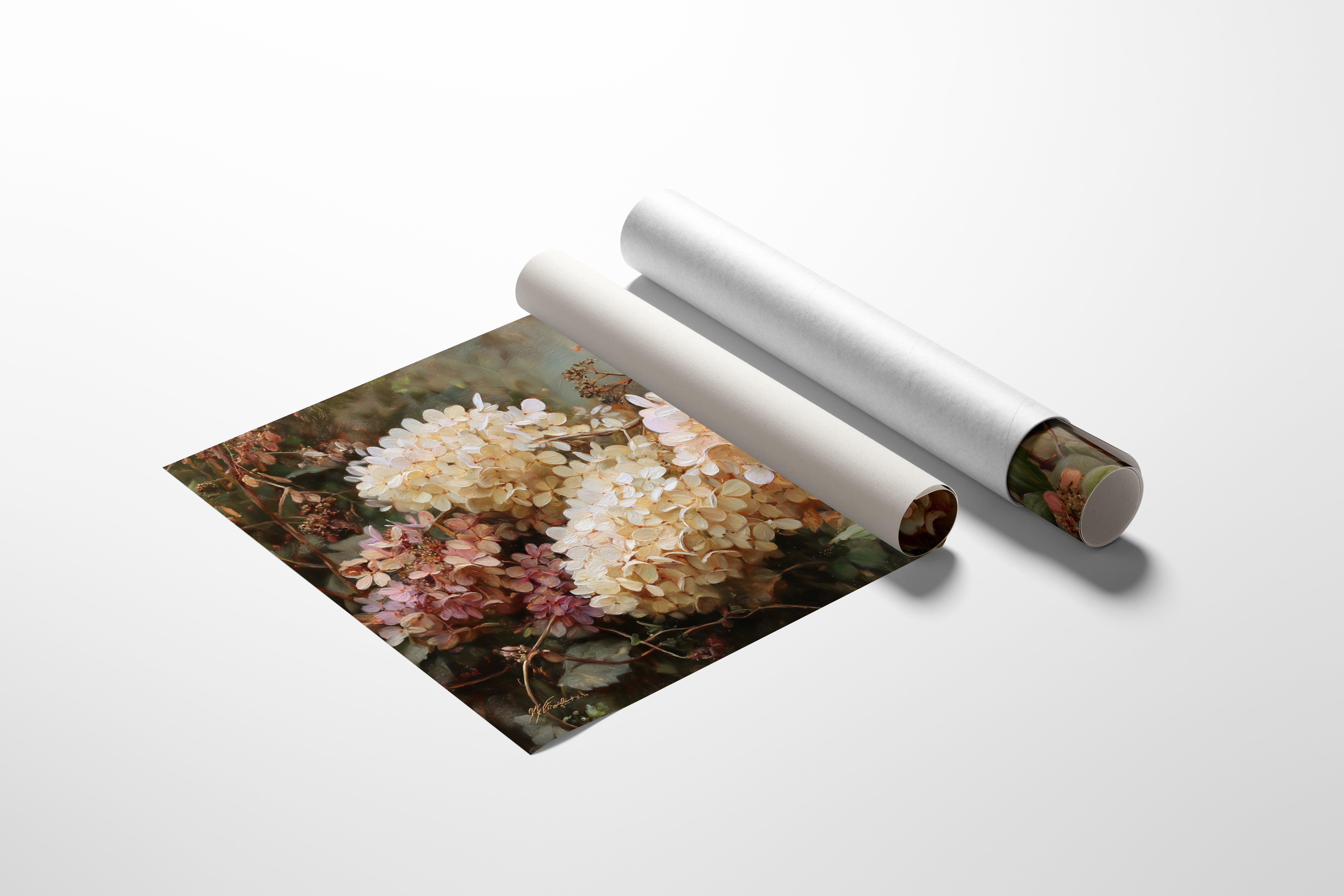 Delicate petals catch the warm autumn light, their cream and blush tones creating a symphony of subtle color variations. The painting captures hydrangeas in their mature beauty, when summer's bright whites have mellowed into sophisticated ivories and coral-tinged edges. Rich brushstrokes build layers of translucent petals, while touches of sage green foliage provide an earthy anchor to the ethereal blooms.