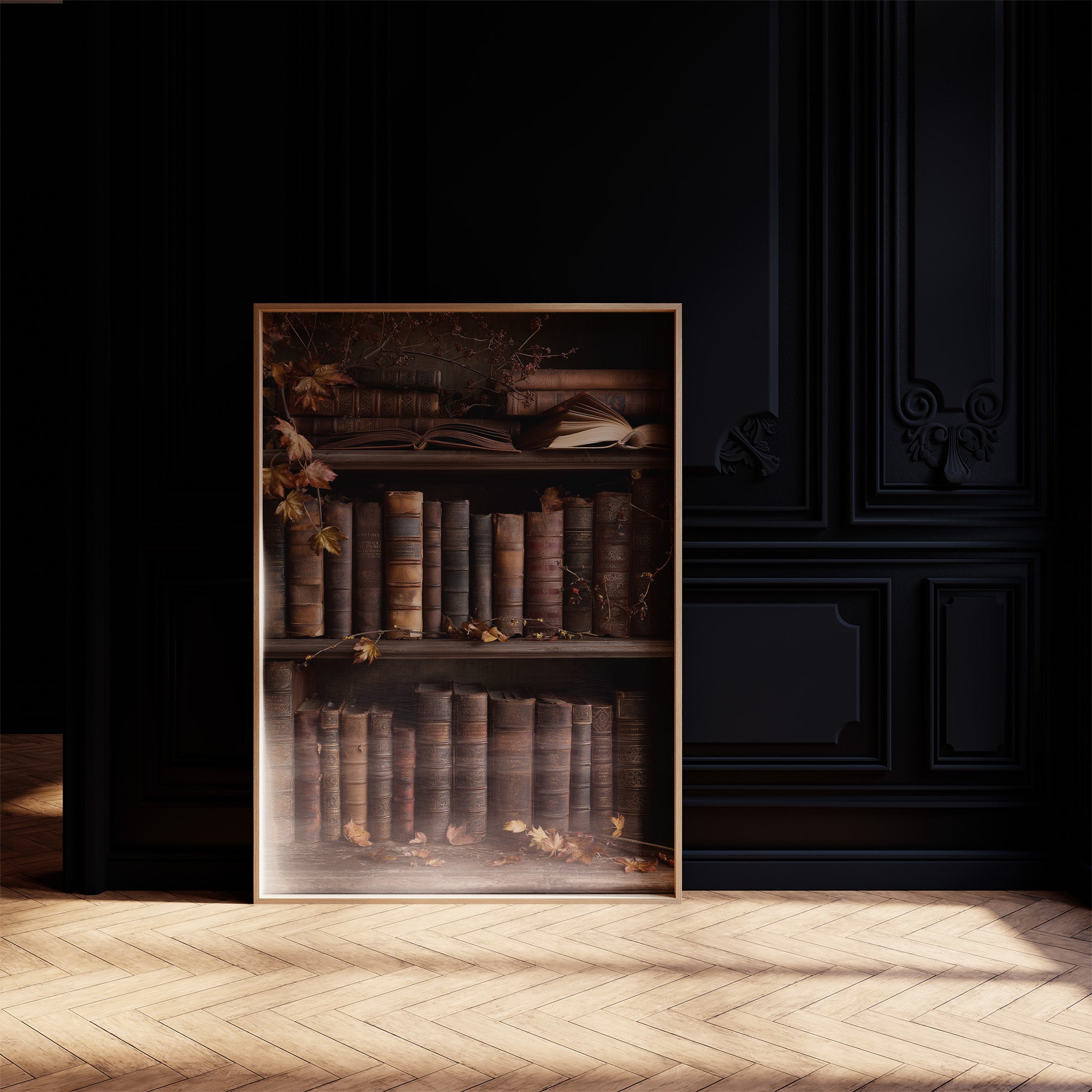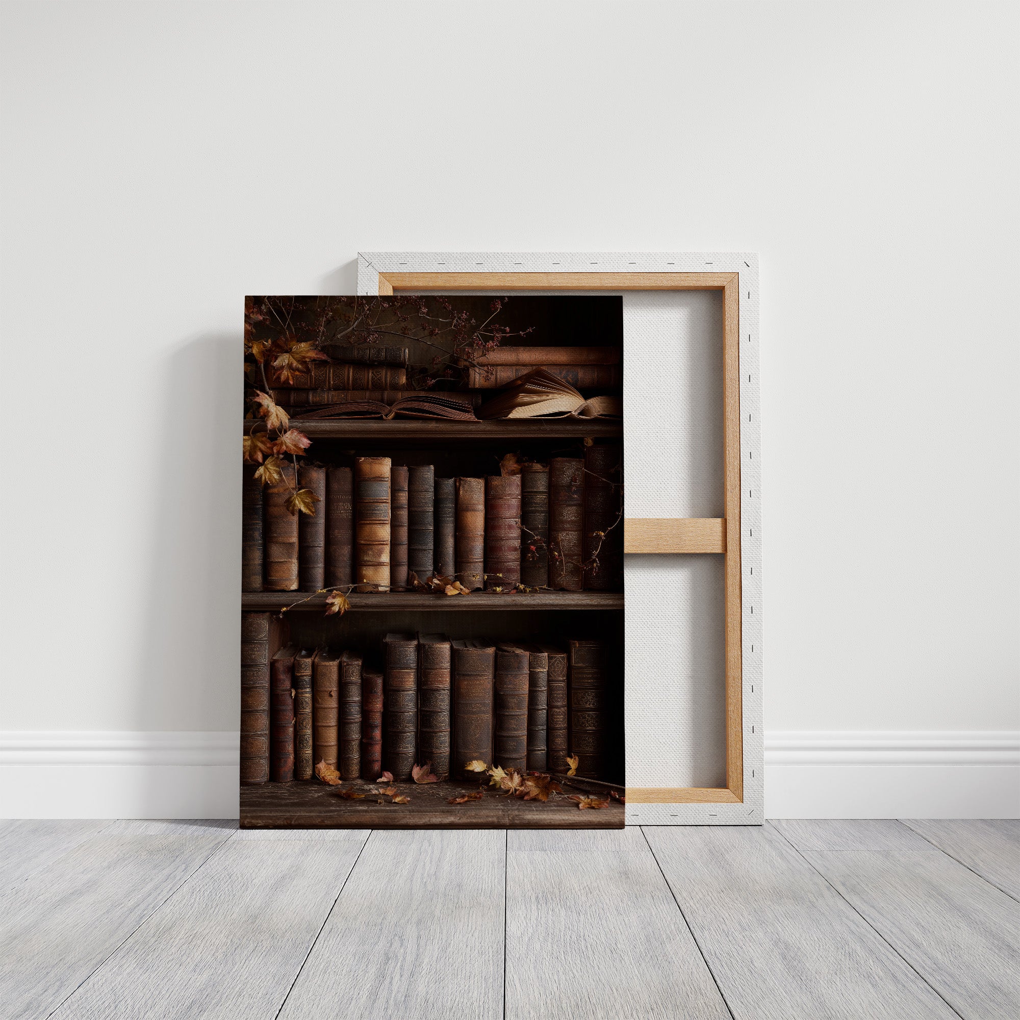 Time stands still where leather-bound volumes gather dust and fallen leaves. The warm sepia tones of aged books create a symphony of texturescracked spines, weathered covers, and delicate autumn foliage intertwined among literary treasures. An open book at the top shelf invites viewers into stories long forgotten, while golden maple leaves scatter across the shelves like bookmarks left by the season itself. This piece brings literary nostalgia to studies, reading nooks, or sophisticated living spaces where stories are treasured.