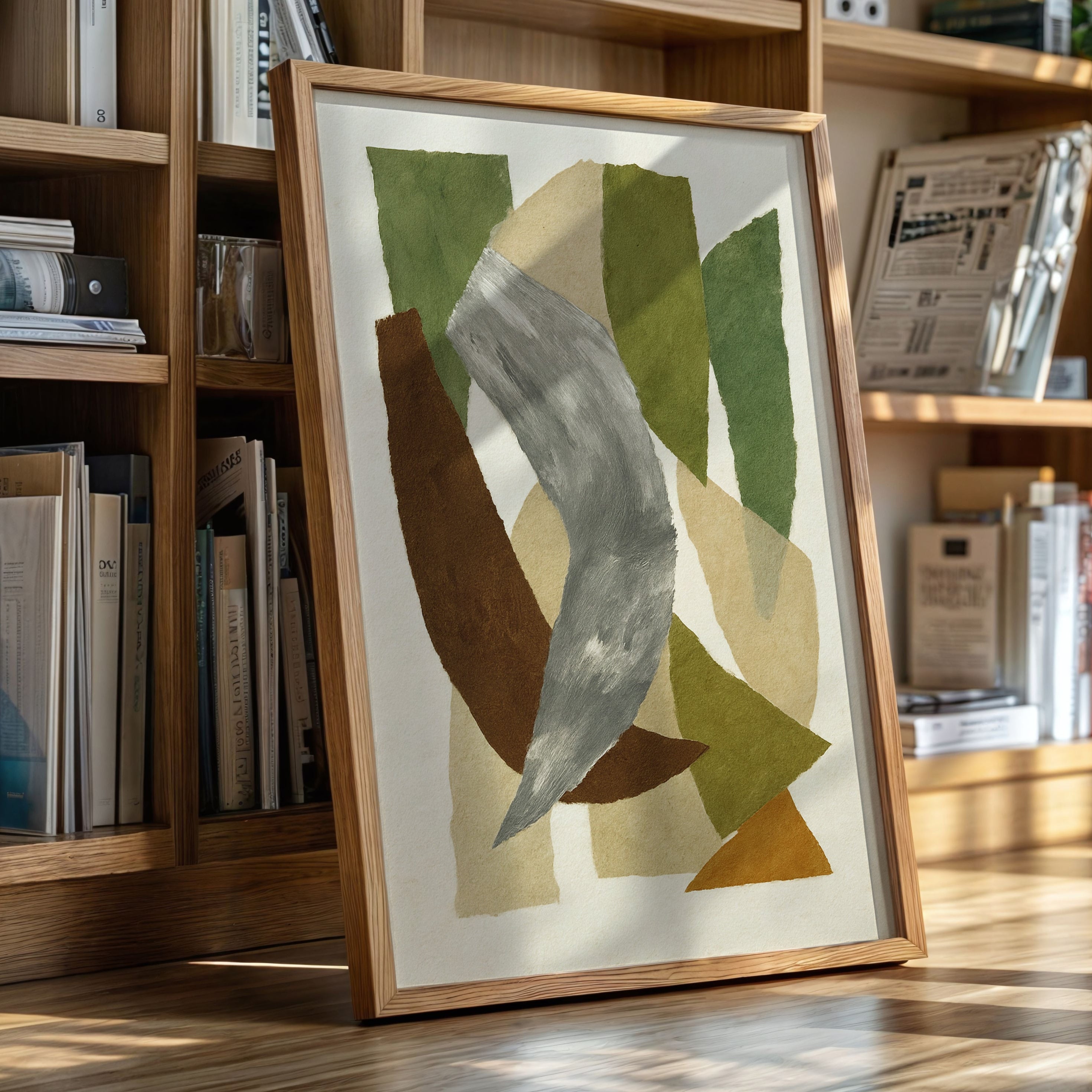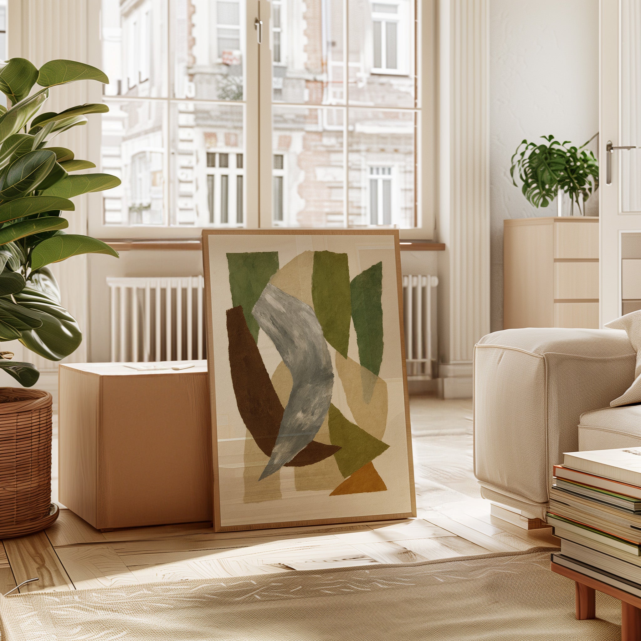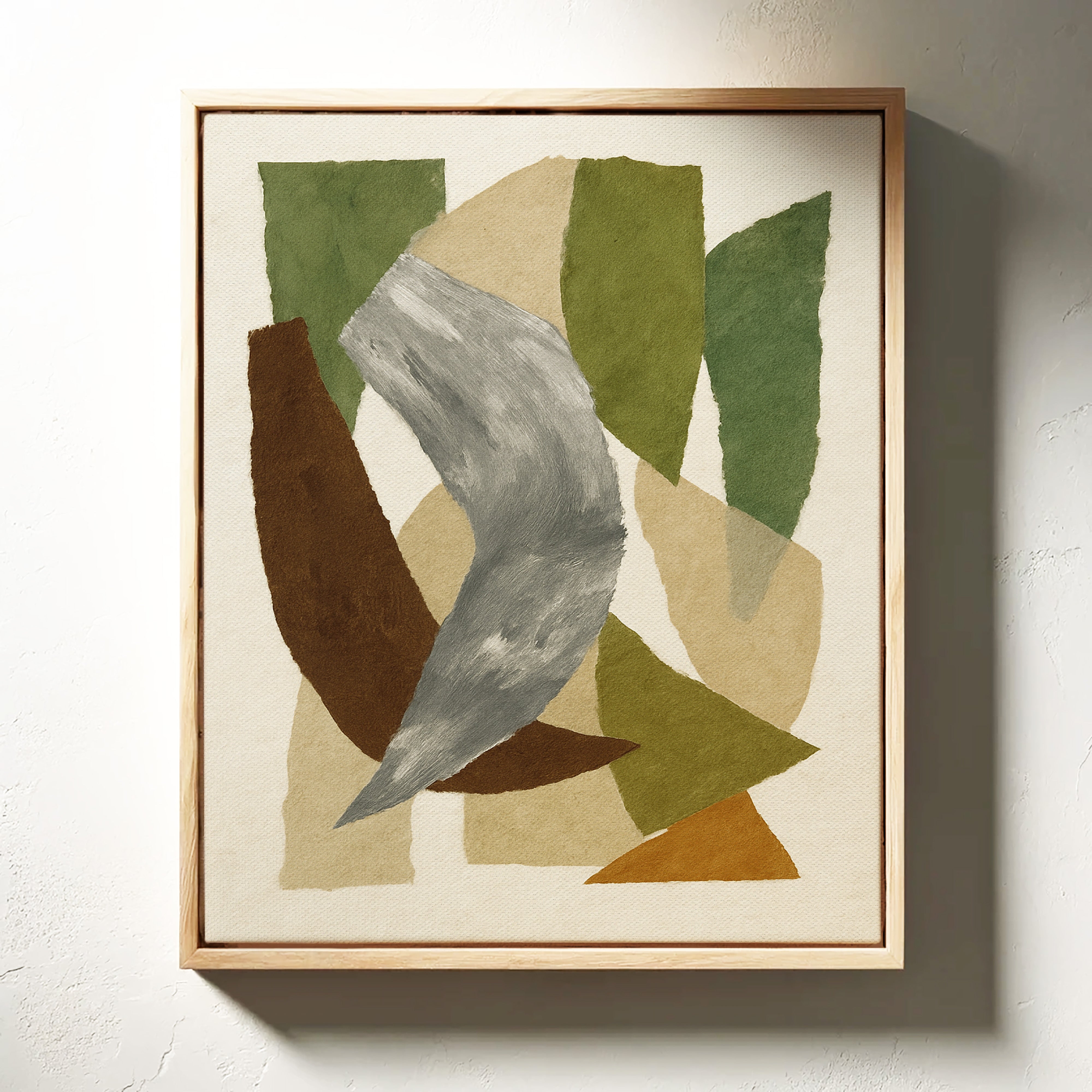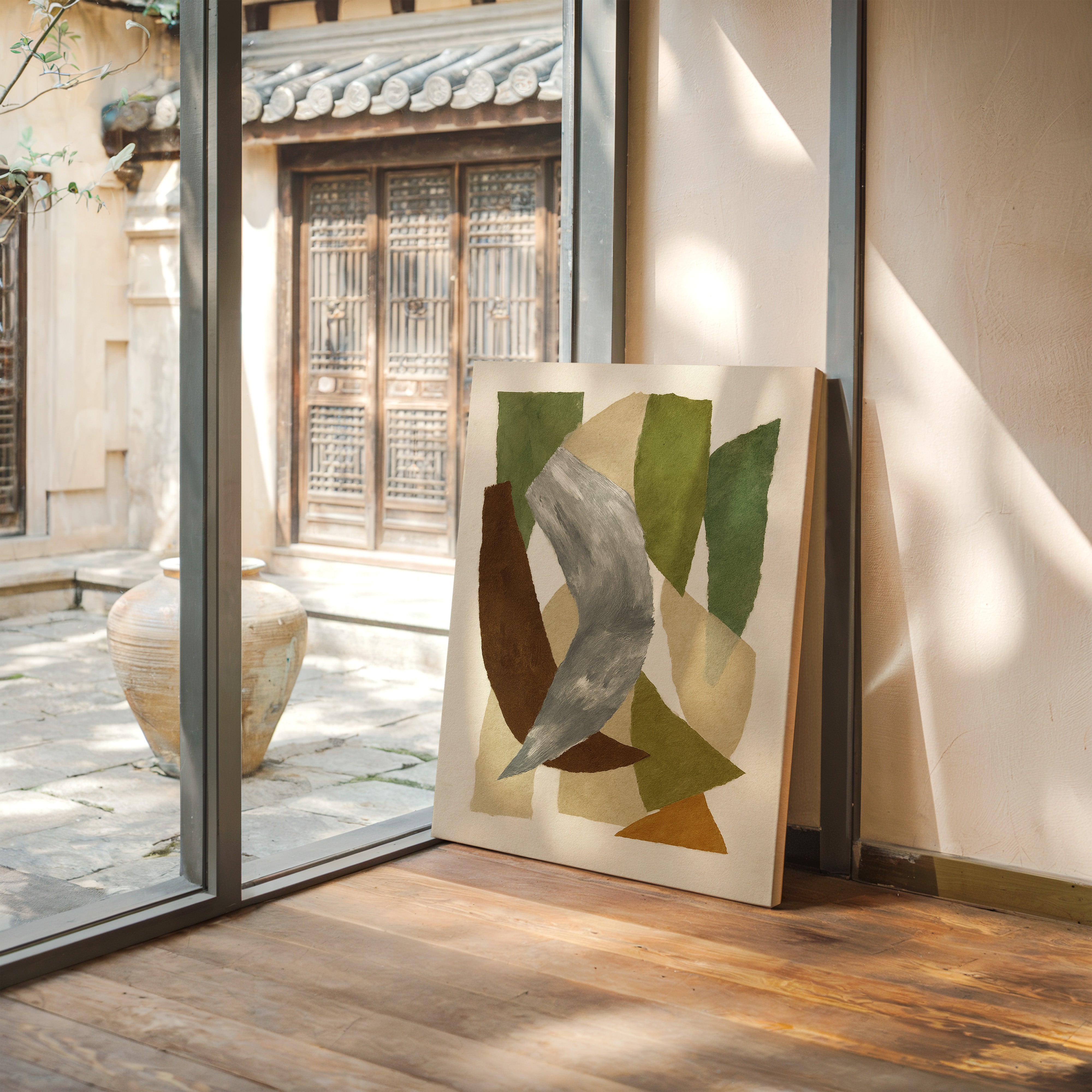 Morning light filters through sheer curtains, illuminating an abstract composition where earthen shapes dance with purpose. A curved silver form cuts through organic shapes in moss green, sand, and umber, creating a harmonious balance between movement and stillness. The piece speaks in quiet tones, its geometric fragments arranged like pressed leaves in a naturalist's journal. This contemporary artwork brings sophisticated serenity to a minimalist bedroom, where light oak furniture and crisp white linens echo its organic modernism.