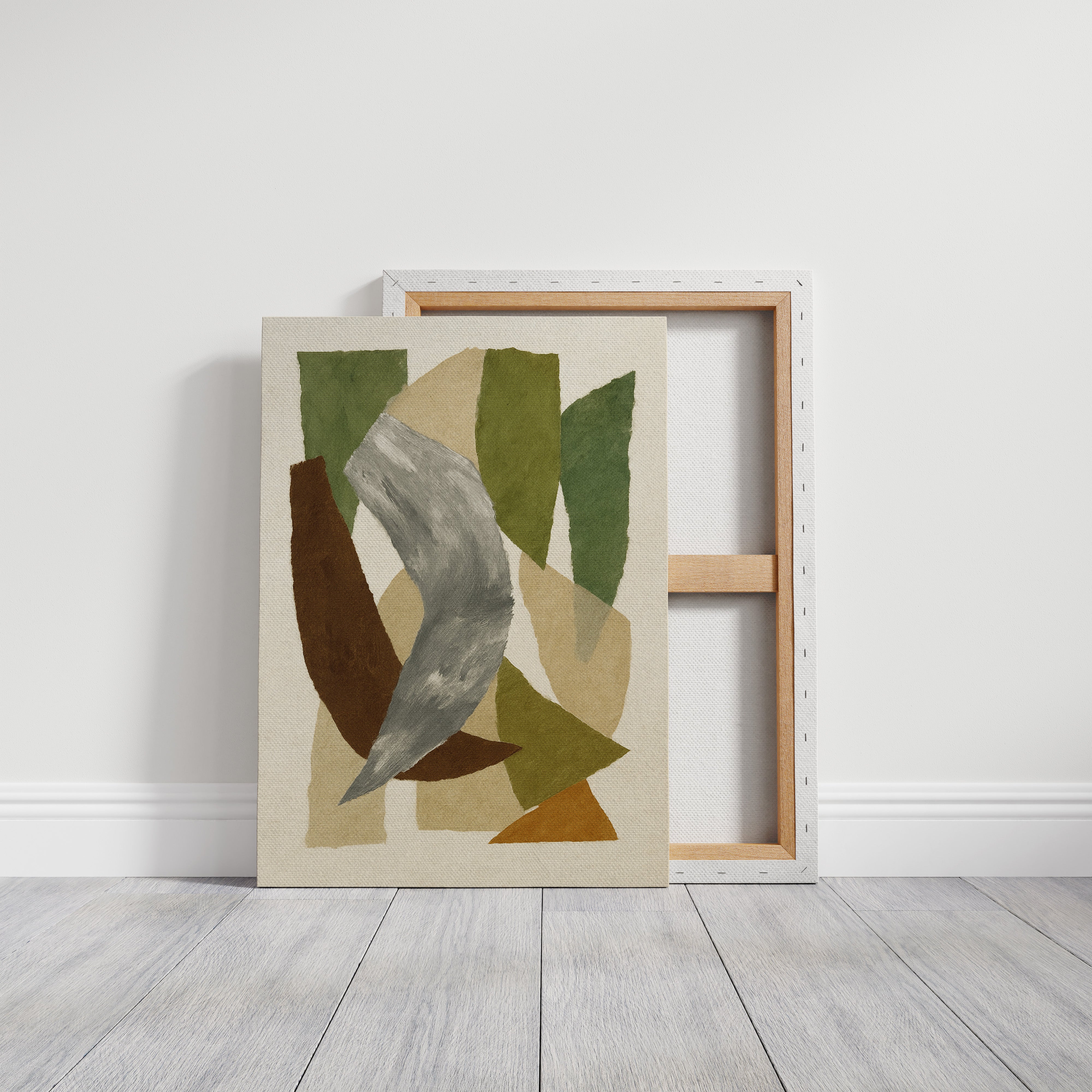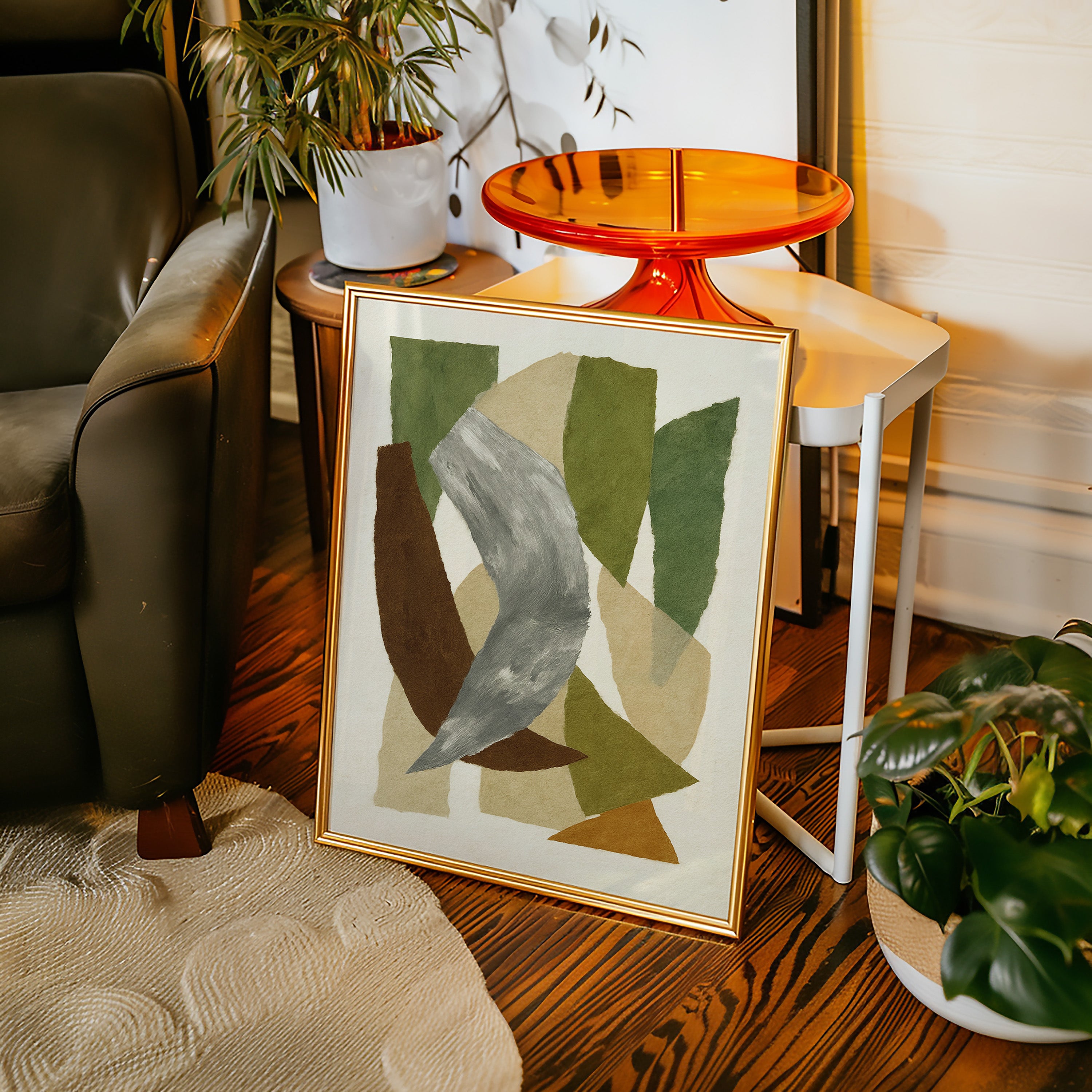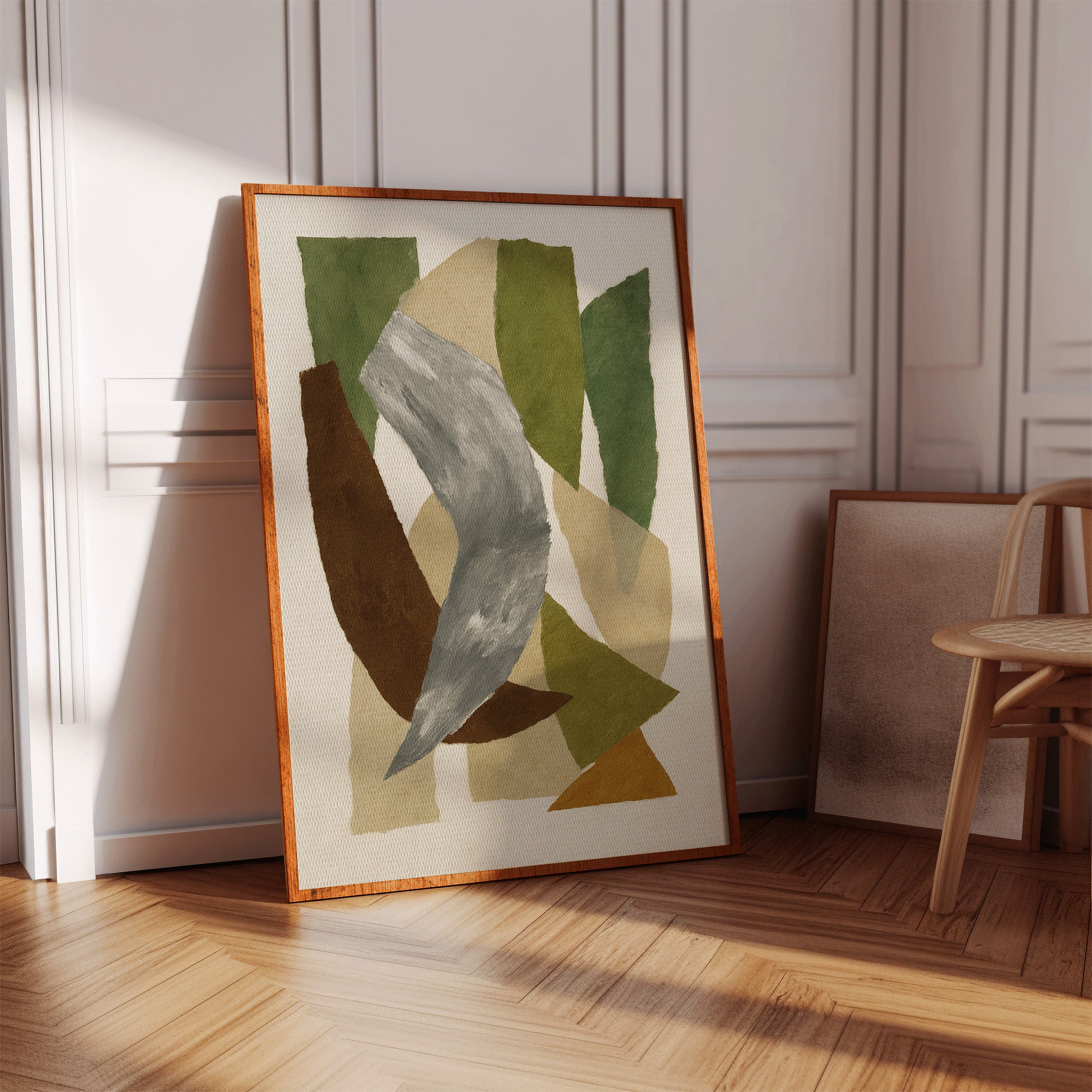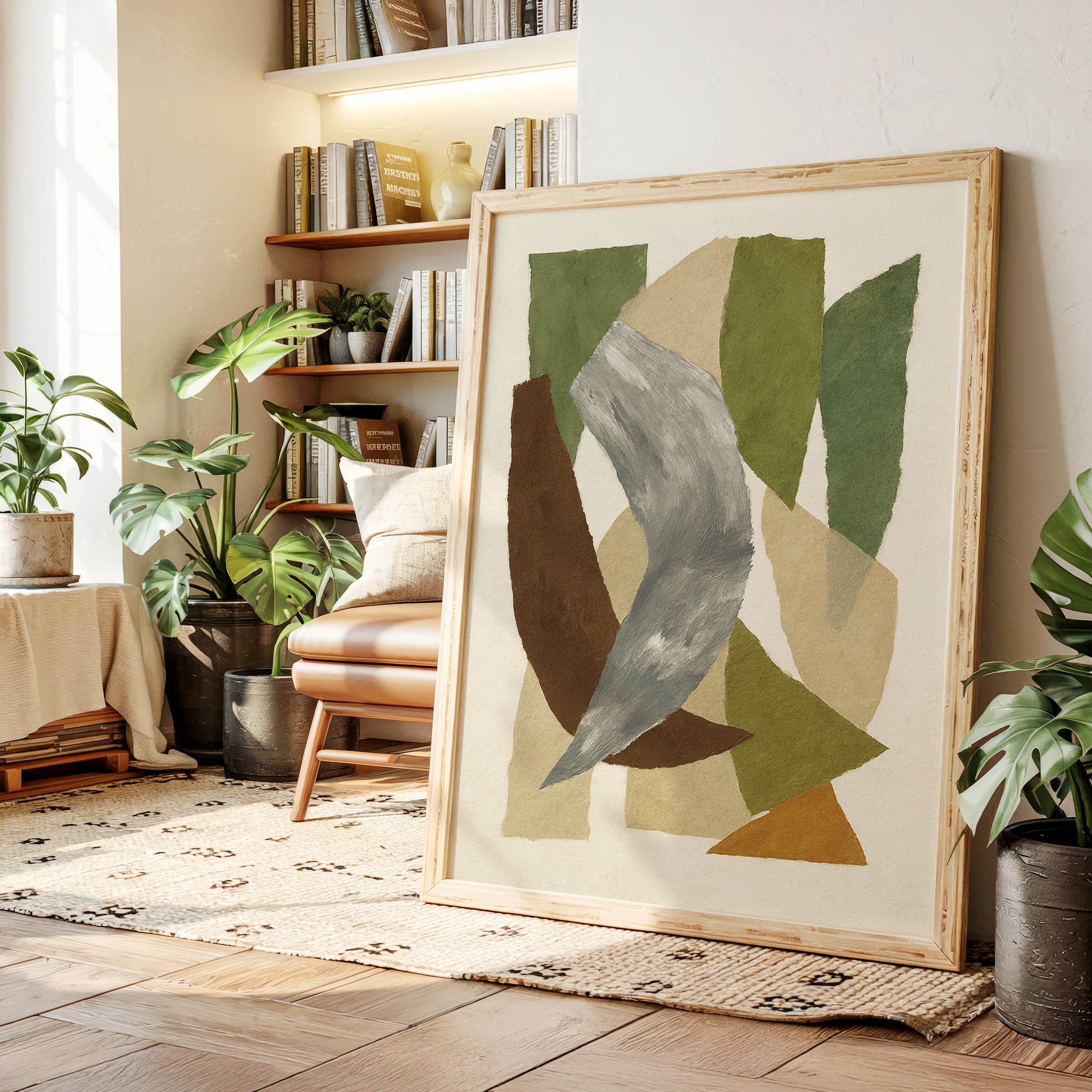 Morning light filters through sheer curtains, illuminating an abstract composition where earthen shapes dance with purpose. A curved silver form cuts through organic shapes in moss green, sand, and umber, creating a harmonious balance between movement and stillness. The piece speaks in quiet tones, its geometric fragments arranged like pressed leaves in a naturalist's journal. This contemporary artwork brings sophisticated serenity to a minimalist bedroom, where light oak furniture and crisp white linens echo its organic modernism.