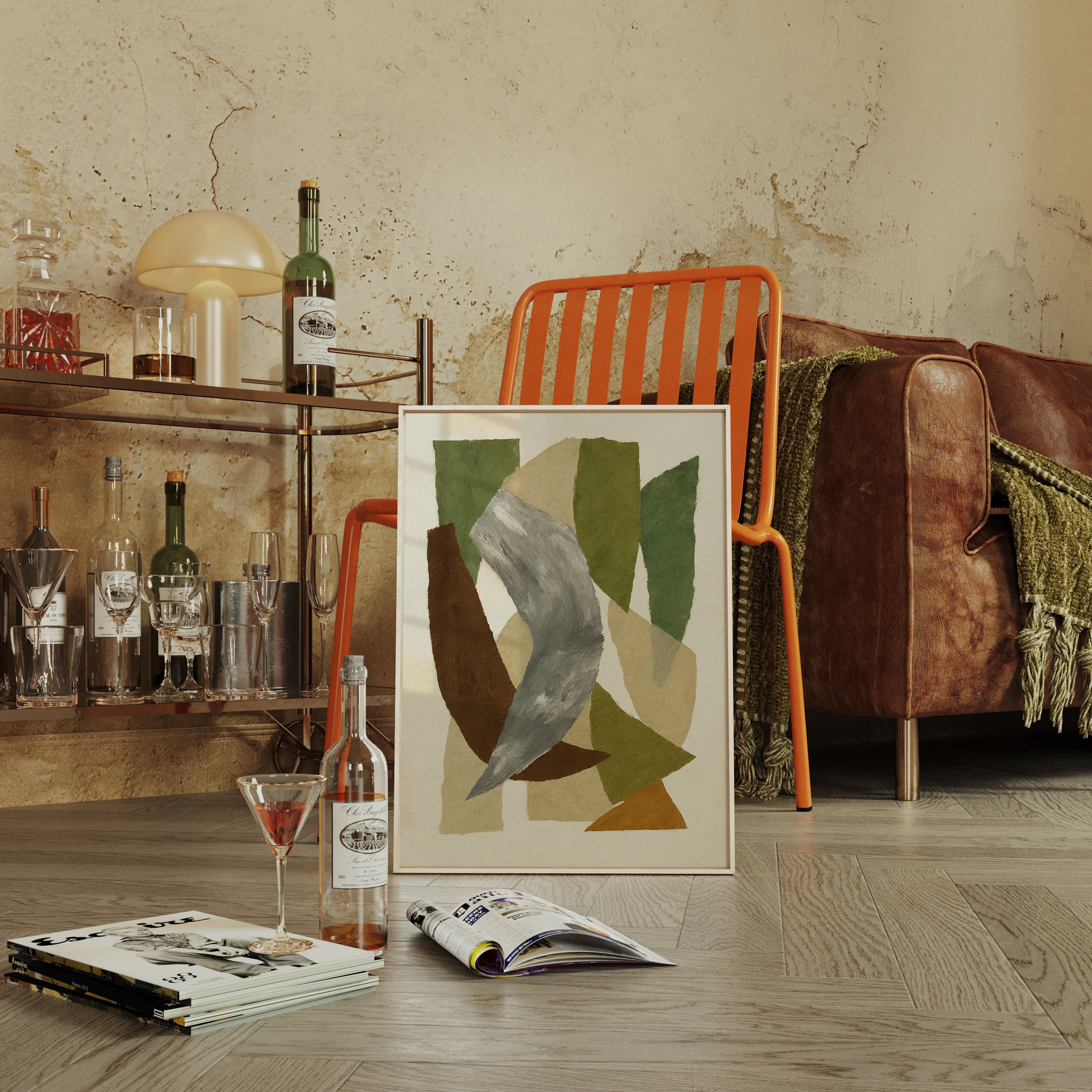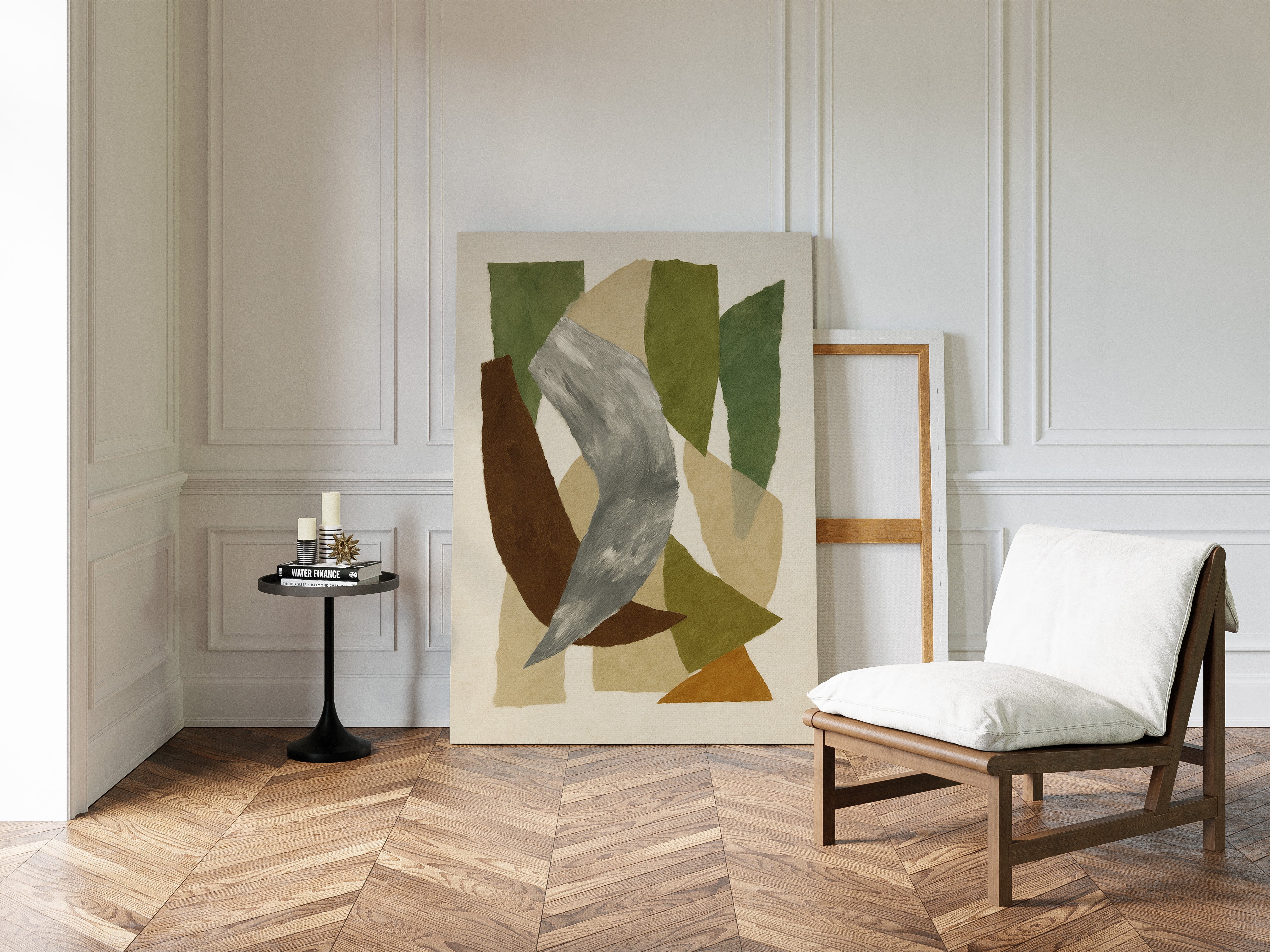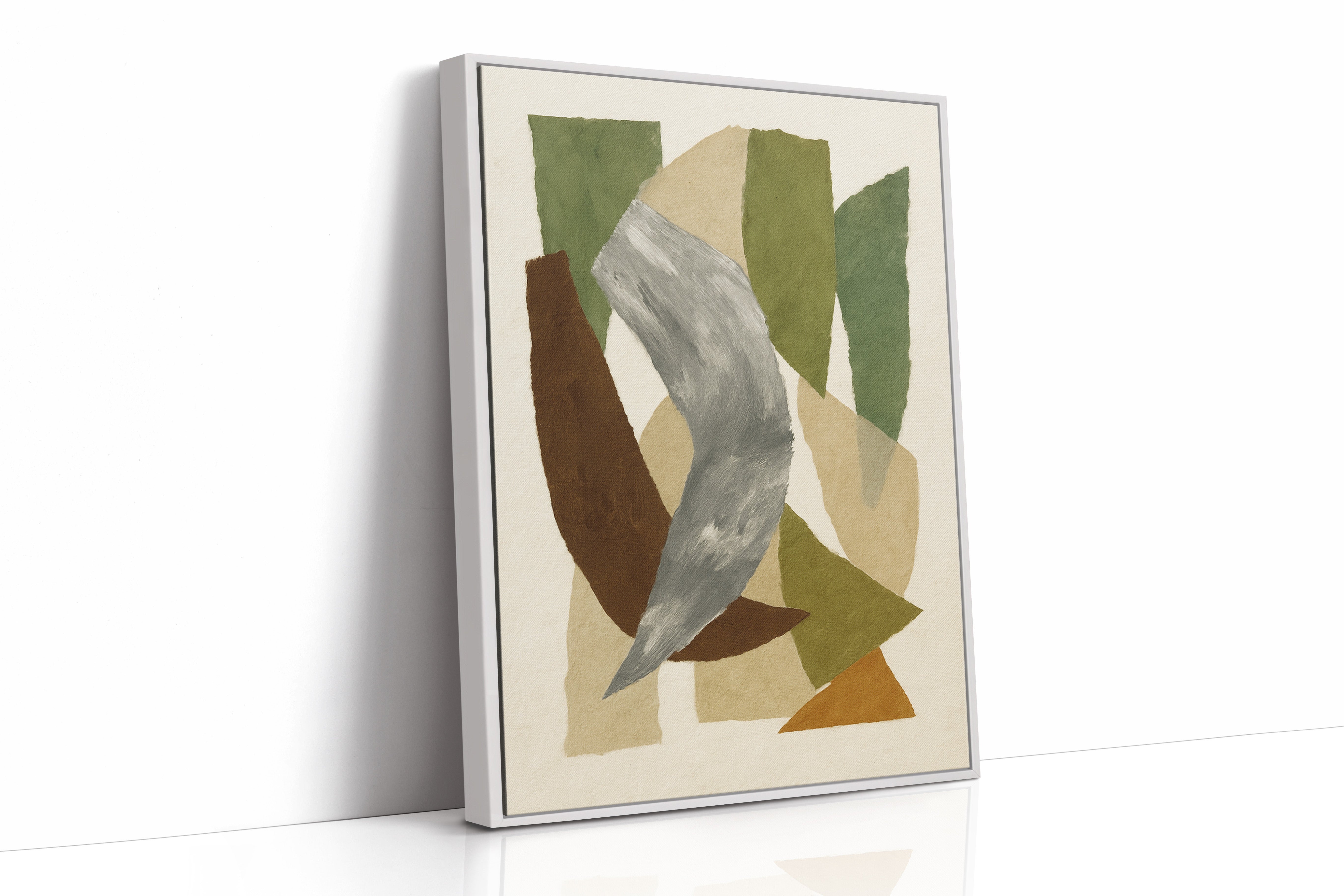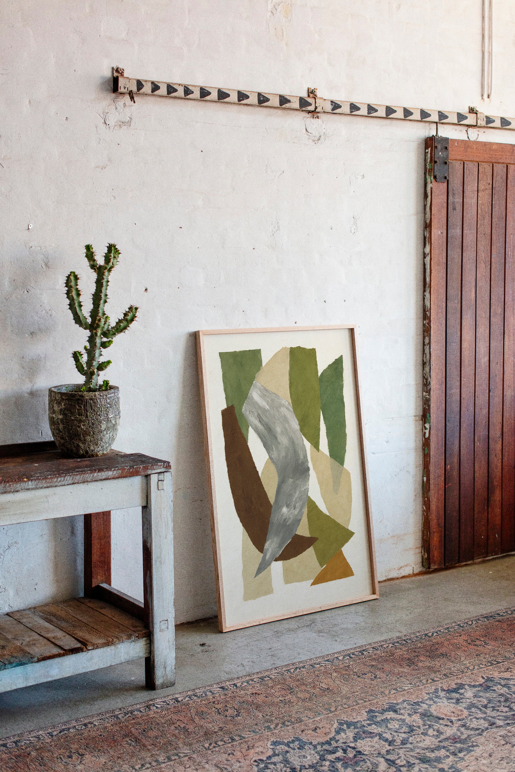 Morning light filters through sheer curtains, illuminating an abstract composition where earthen shapes dance with purpose. A curved silver form cuts through organic shapes in moss green, sand, and umber, creating a harmonious balance between movement and stillness. The piece speaks in quiet tones, its geometric fragments arranged like pressed leaves in a naturalist's journal. This contemporary artwork brings sophisticated serenity to a minimalist bedroom, where light oak furniture and crisp white linens echo its organic modernism.