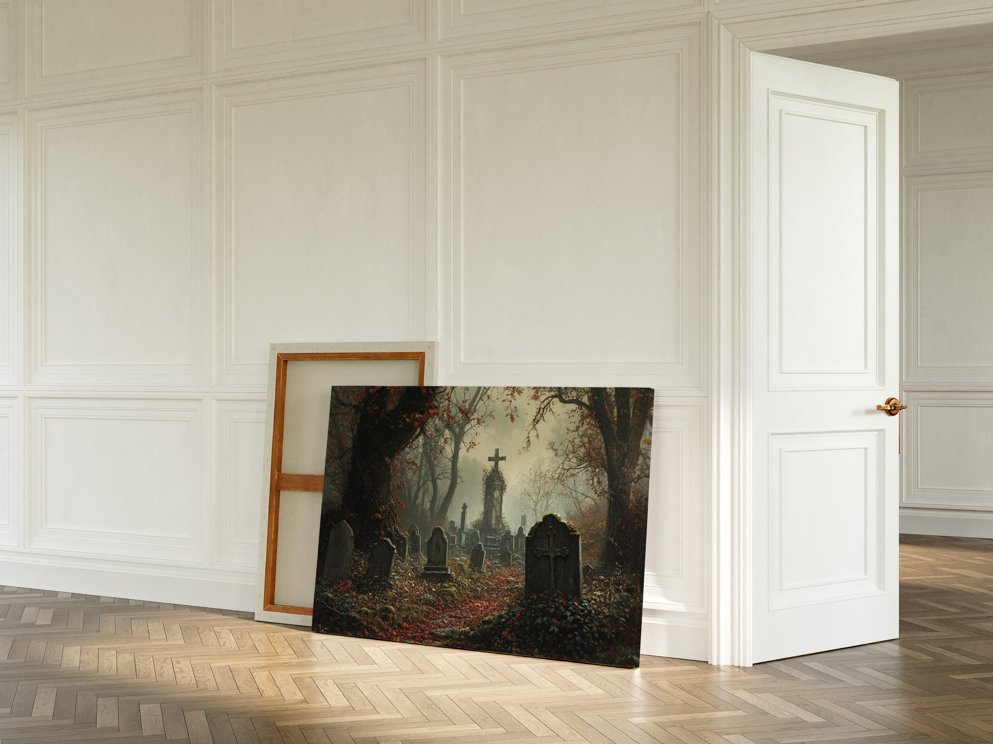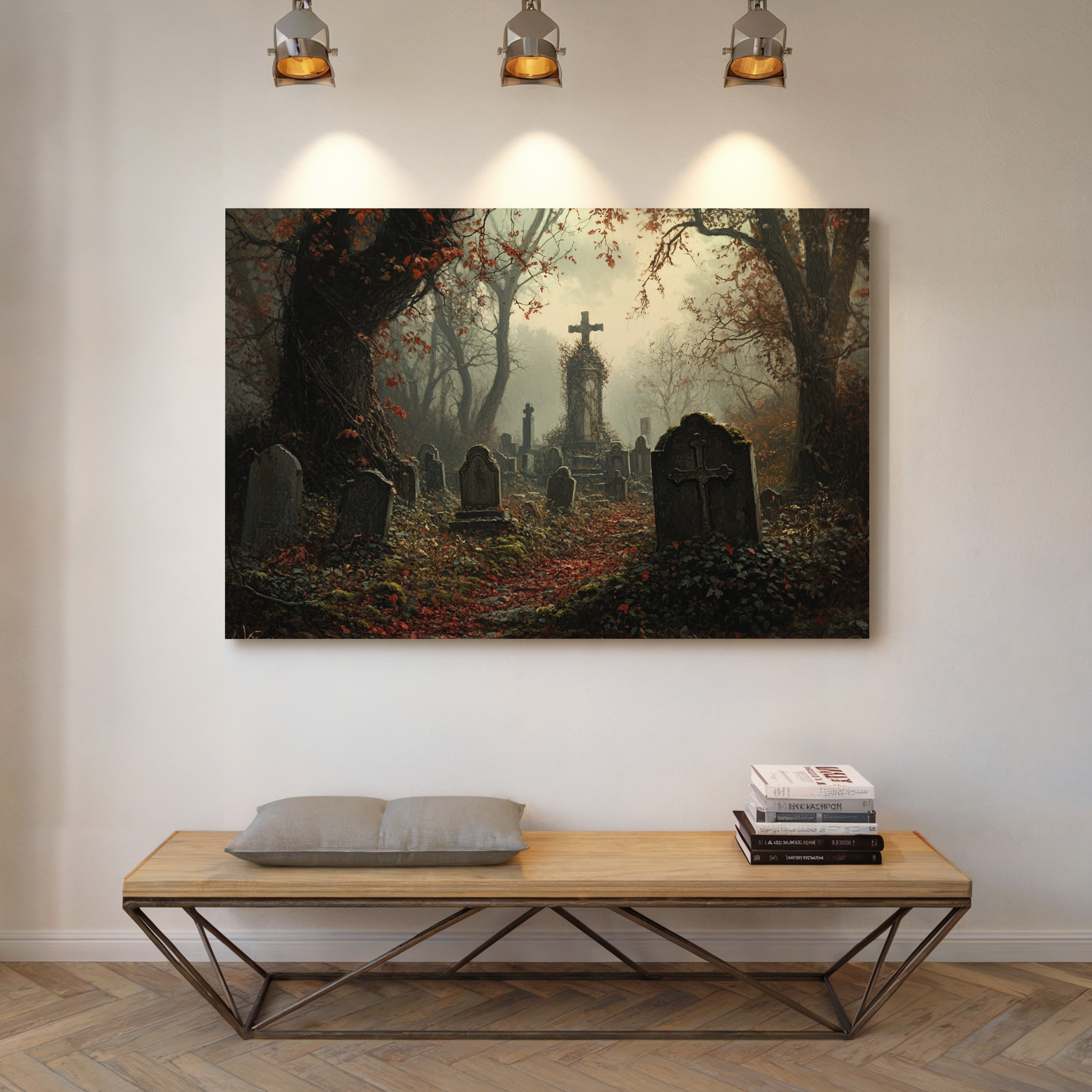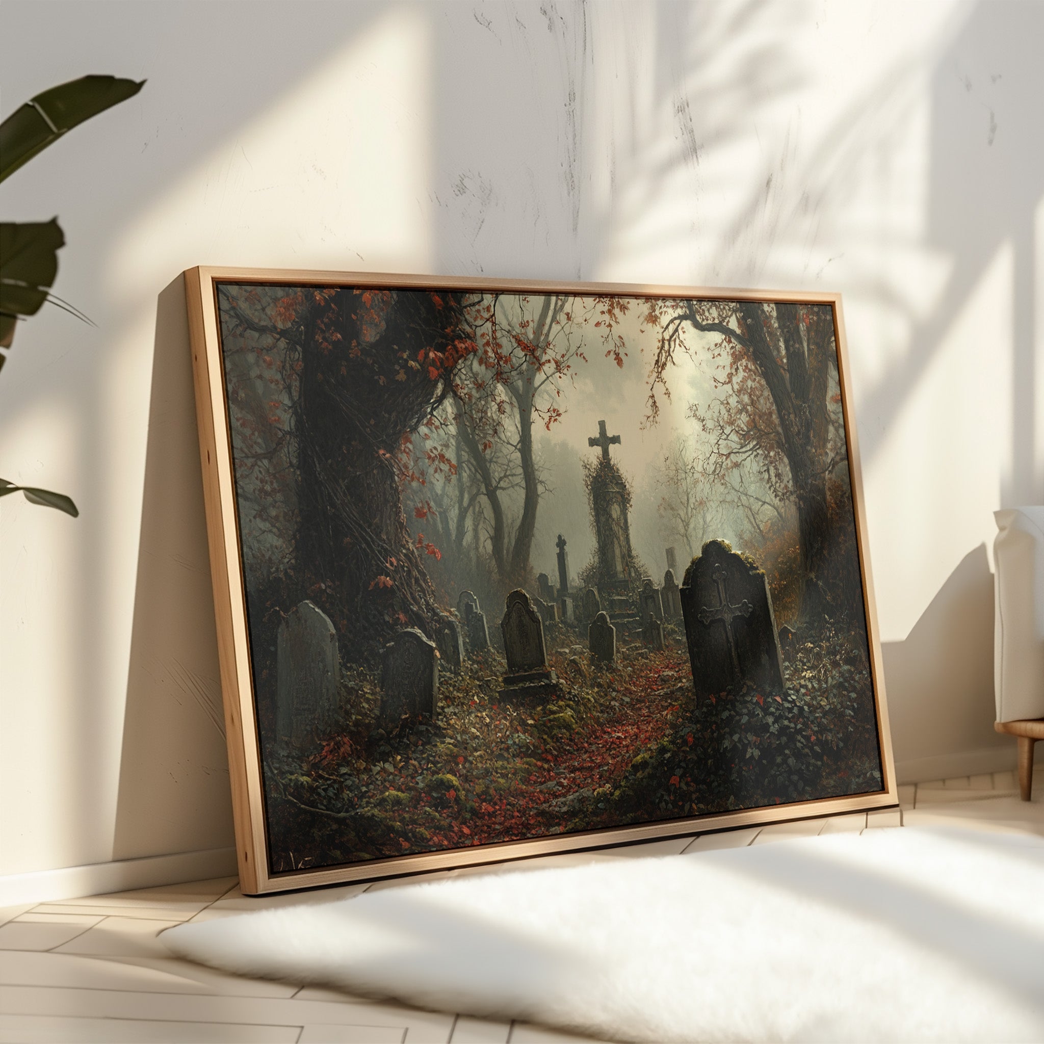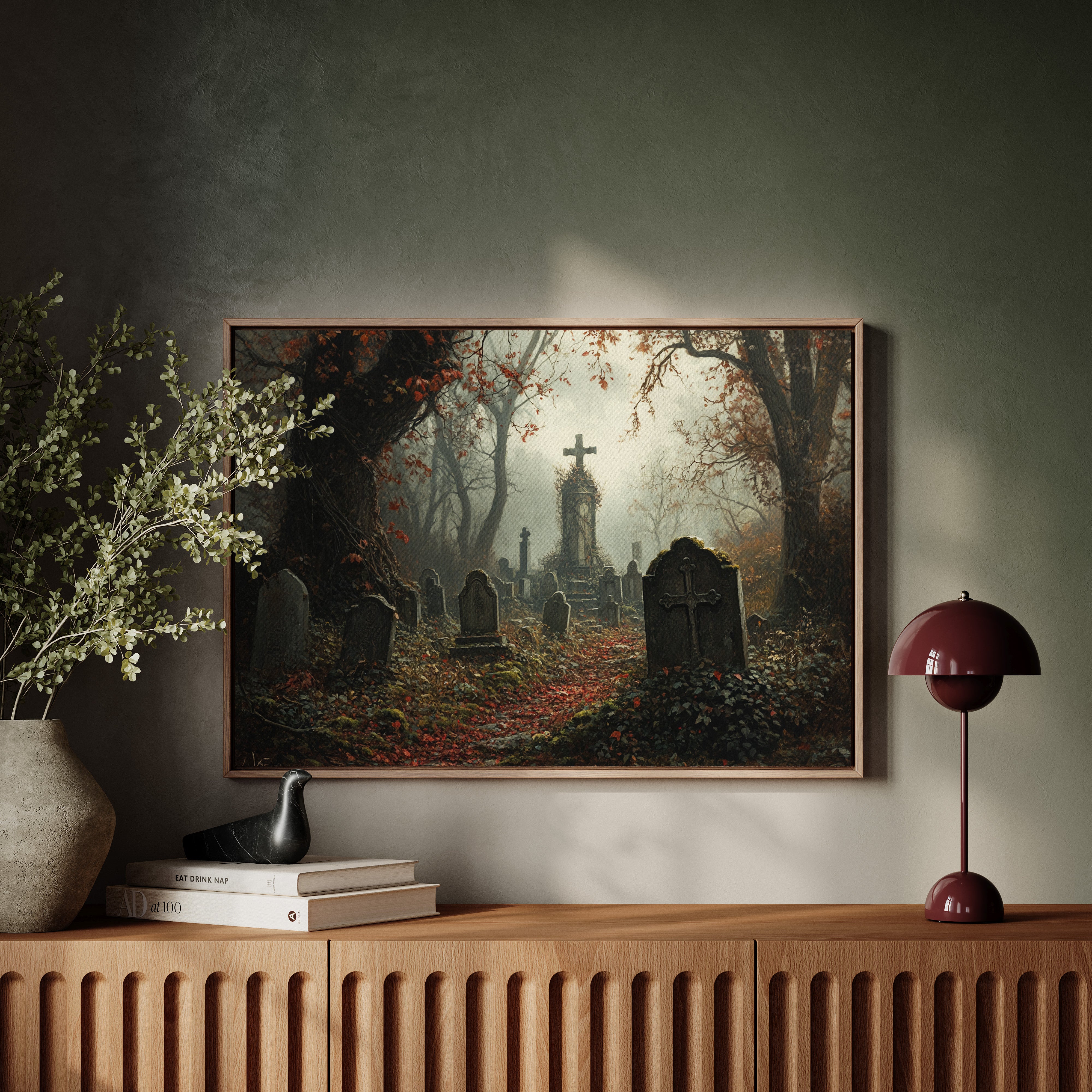 Crimson maple leaves dance through misty air, creating a poetic contrast against weathered gravestones. Time stands still in this sacred space where nature and memory intertwine, moss-covered monuments rising from carpets of fallen foliage. The towering central cross pierces through the morning fog, while ancient trees stand sentinel, their gnarled branches reaching protectively over centuries of stories etched in stone. This atmospheric scene would bring a profound sense of peace and contemplation to a study, library, or meditation space.