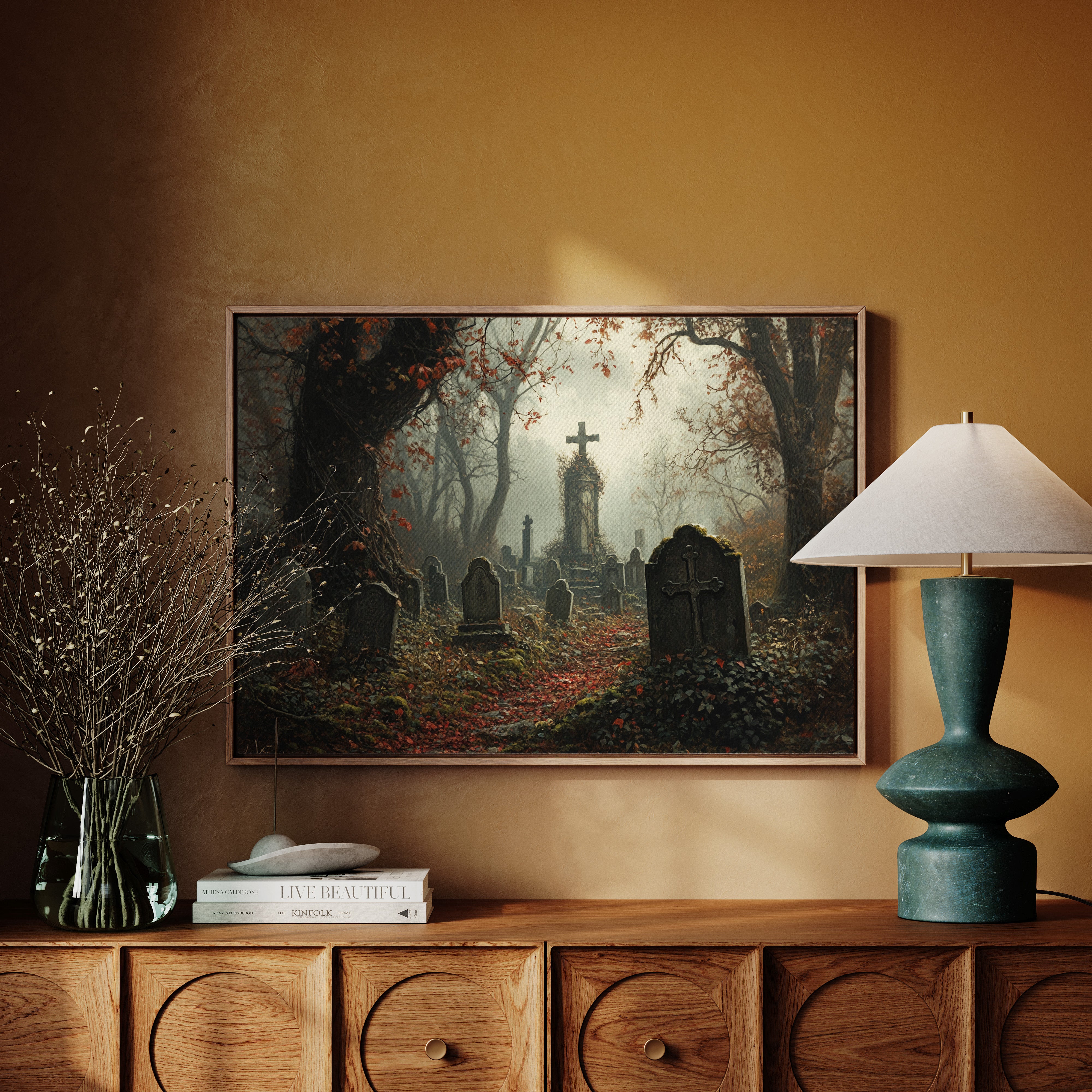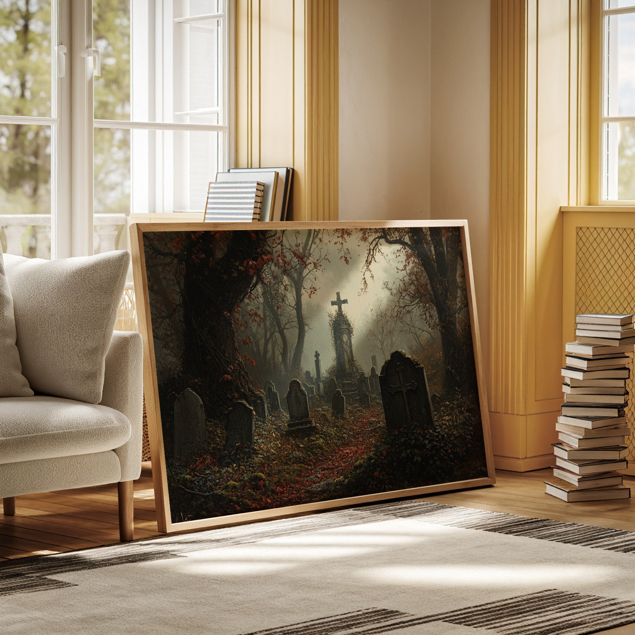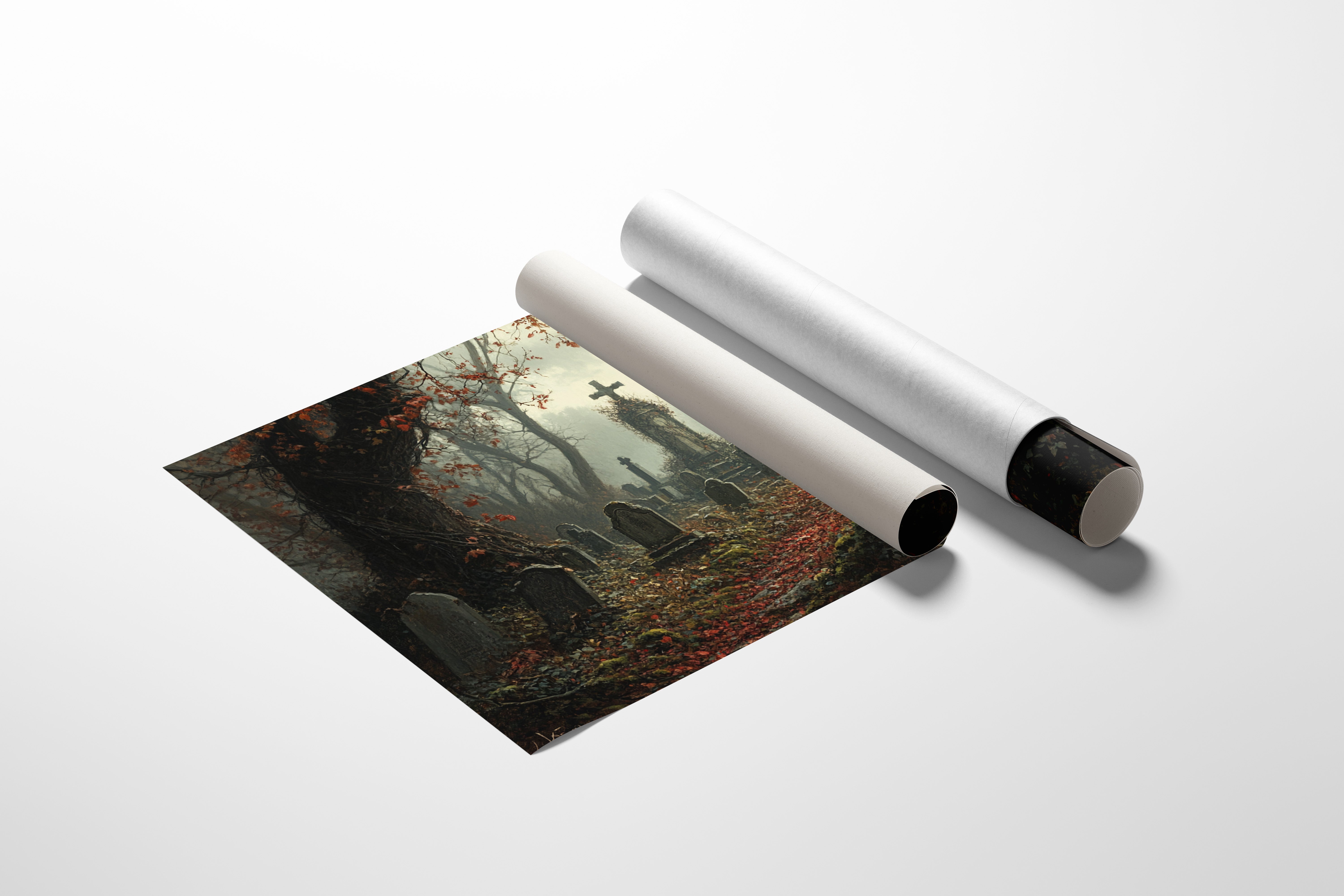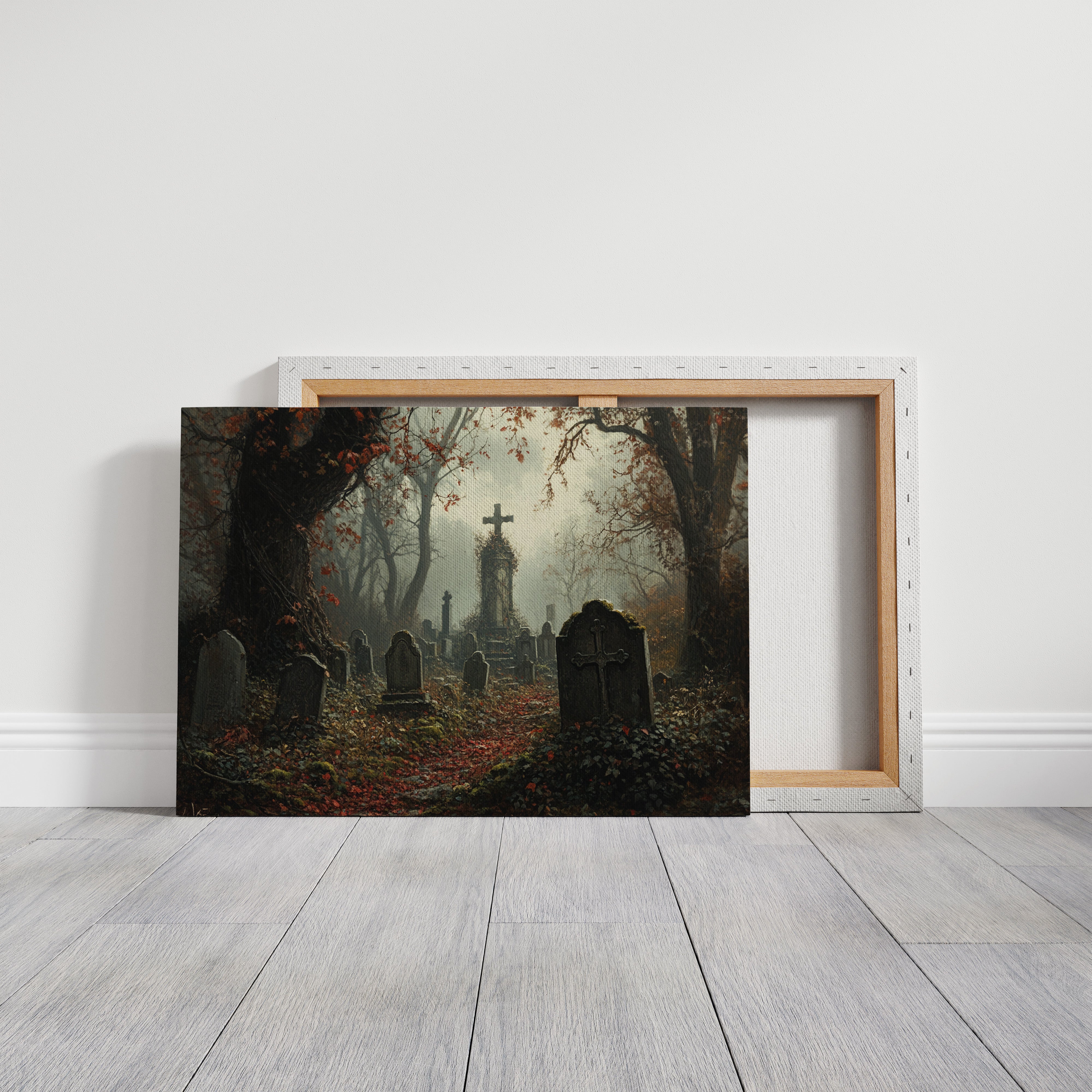 Crimson maple leaves dance through misty air, creating a poetic contrast against weathered gravestones. Time stands still in this sacred space where nature and memory intertwine, moss-covered monuments rising from carpets of fallen foliage. The towering central cross pierces through the morning fog, while ancient trees stand sentinel, their gnarled branches reaching protectively over centuries of stories etched in stone. This atmospheric scene would bring a profound sense of peace and contemplation to a study, library, or meditation space.