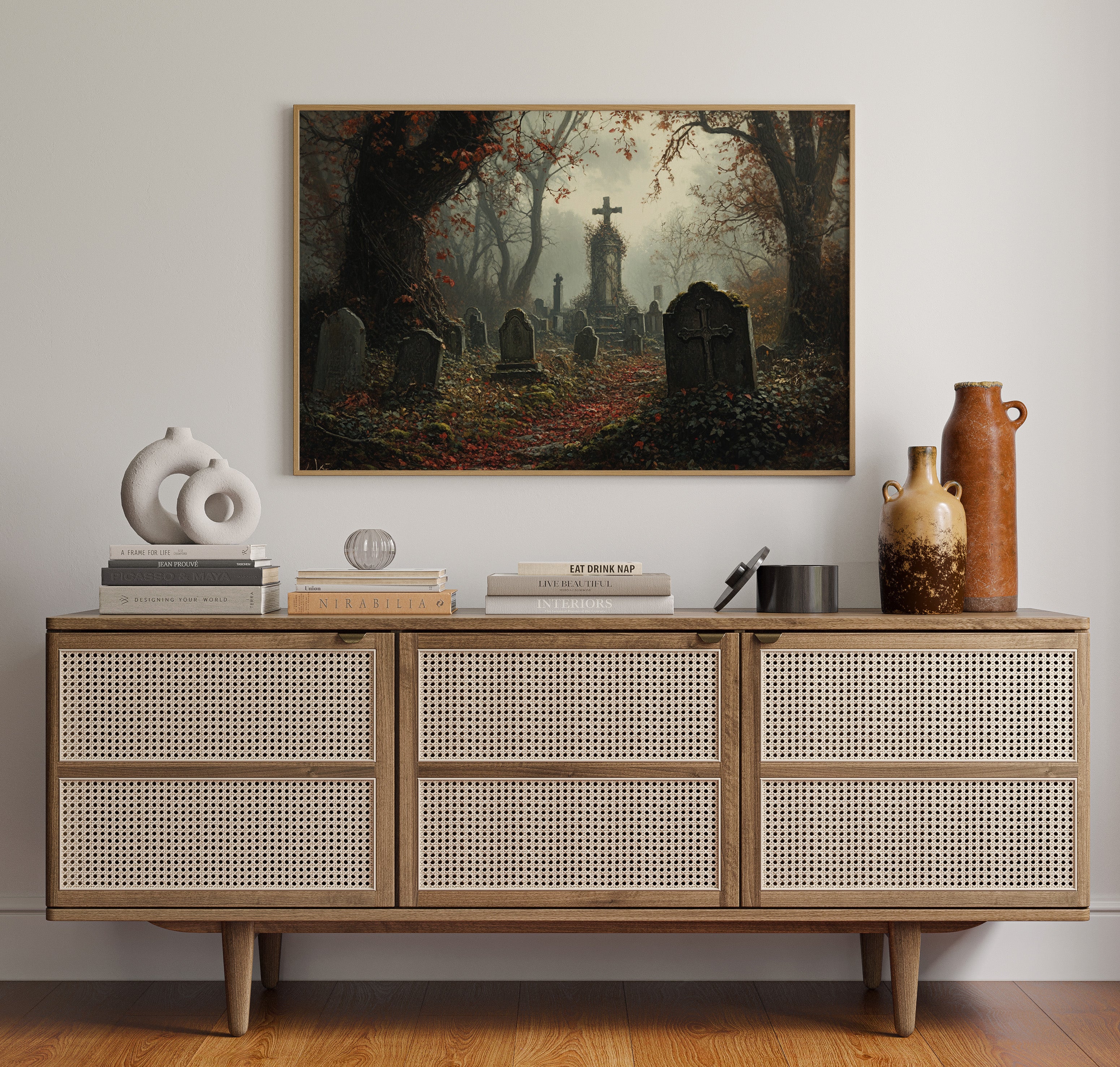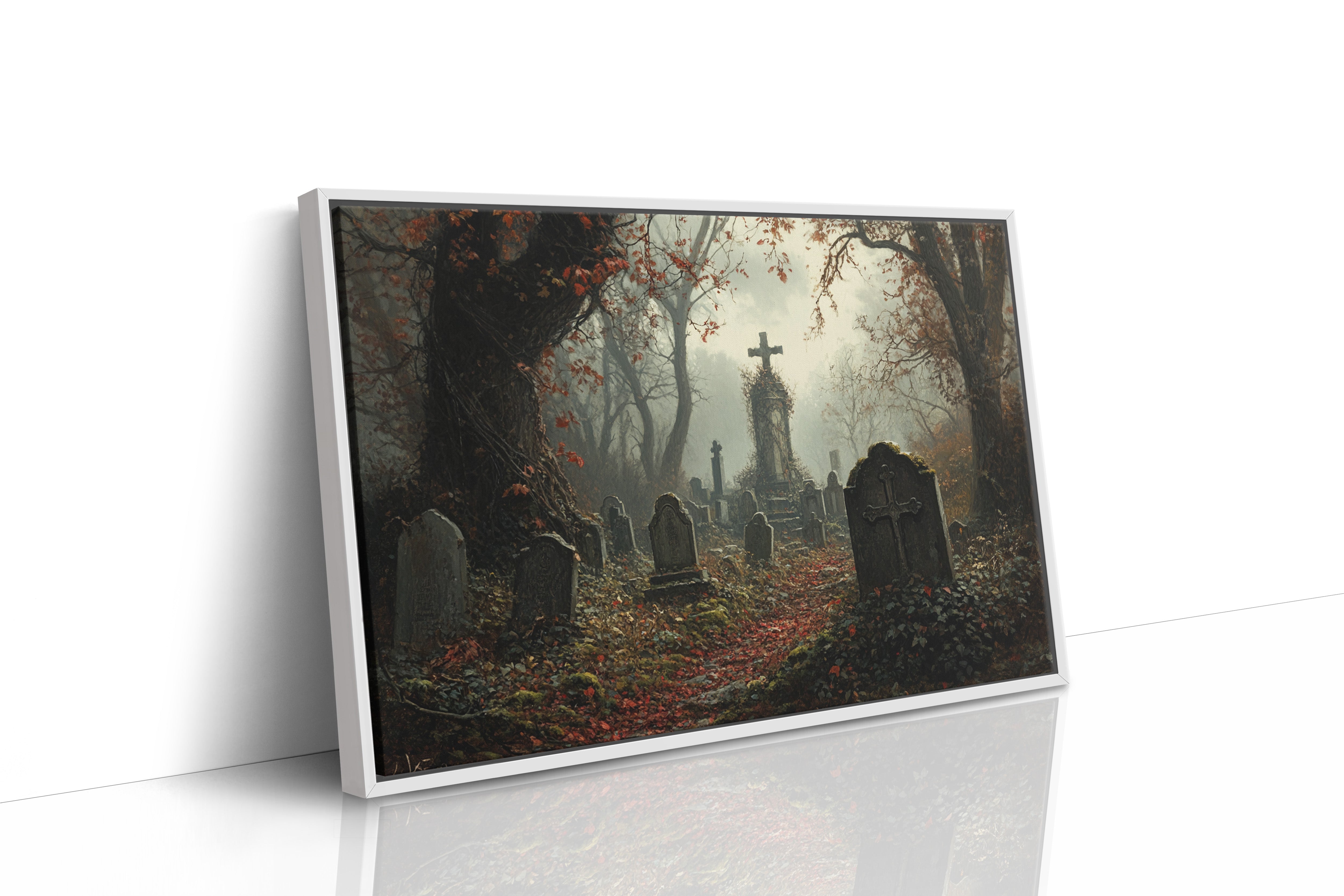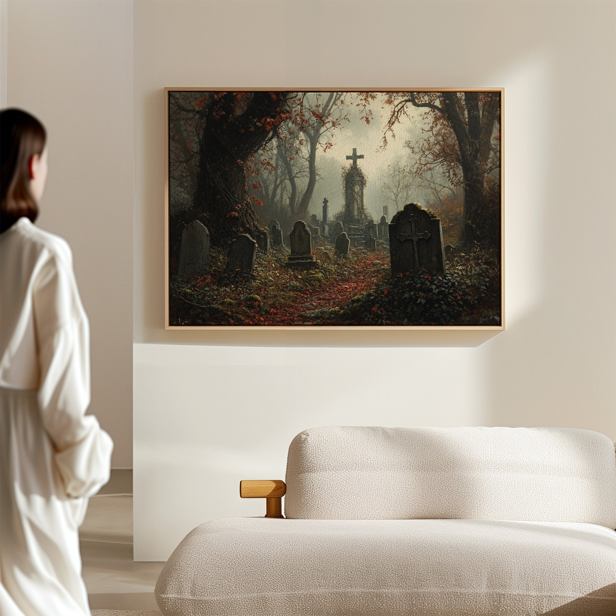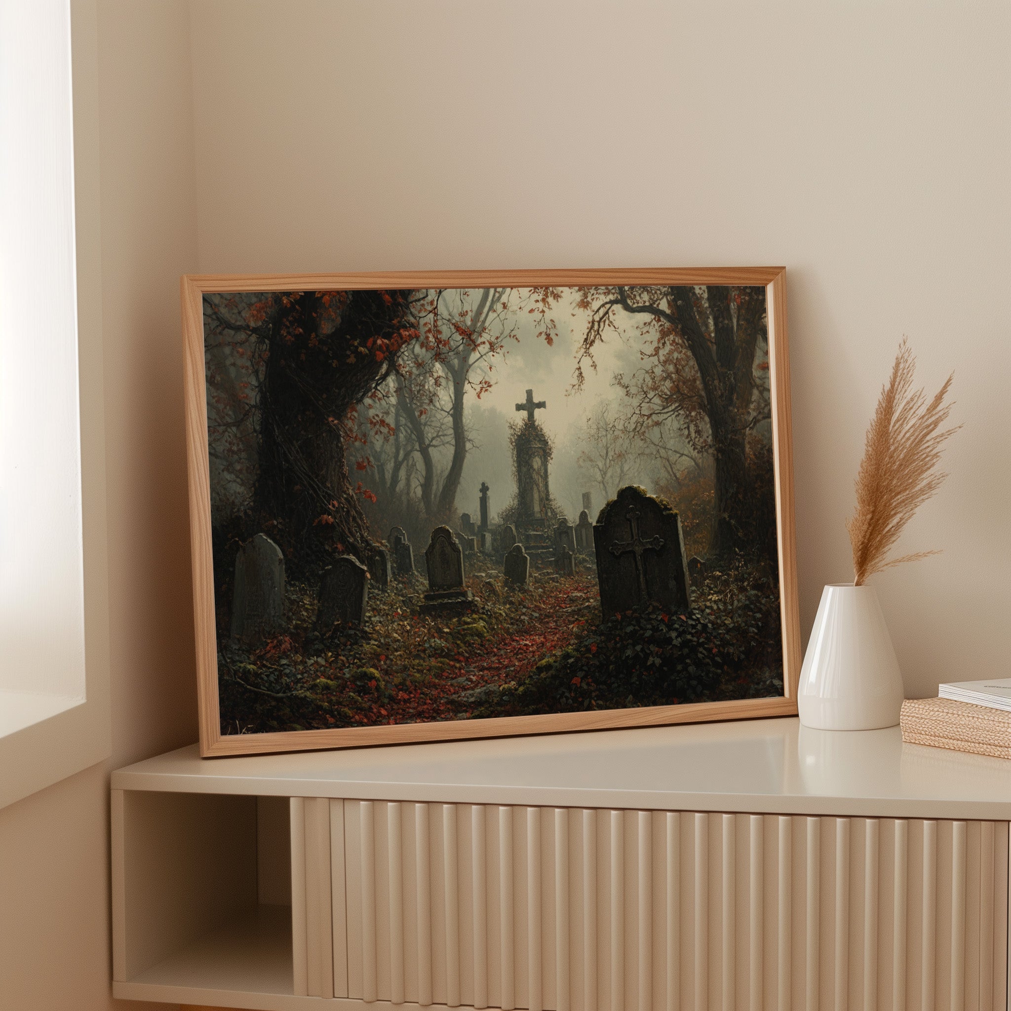 Crimson maple leaves dance through misty air, creating a poetic contrast against weathered gravestones. Time stands still in this sacred space where nature and memory intertwine, moss-covered monuments rising from carpets of fallen foliage. The towering central cross pierces through the morning fog, while ancient trees stand sentinel, their gnarled branches reaching protectively over centuries of stories etched in stone. This atmospheric scene would bring a profound sense of peace and contemplation to a study, library, or meditation space.