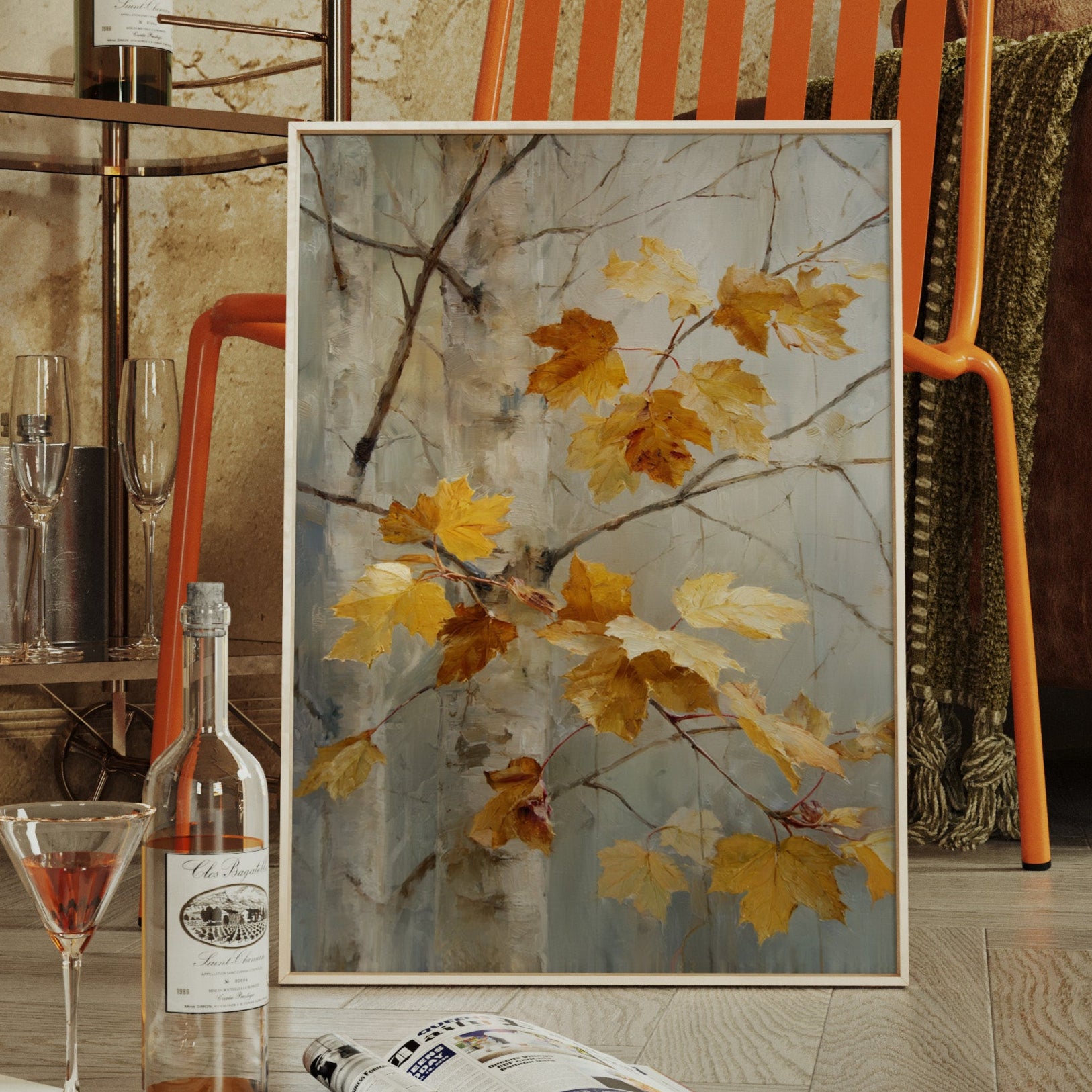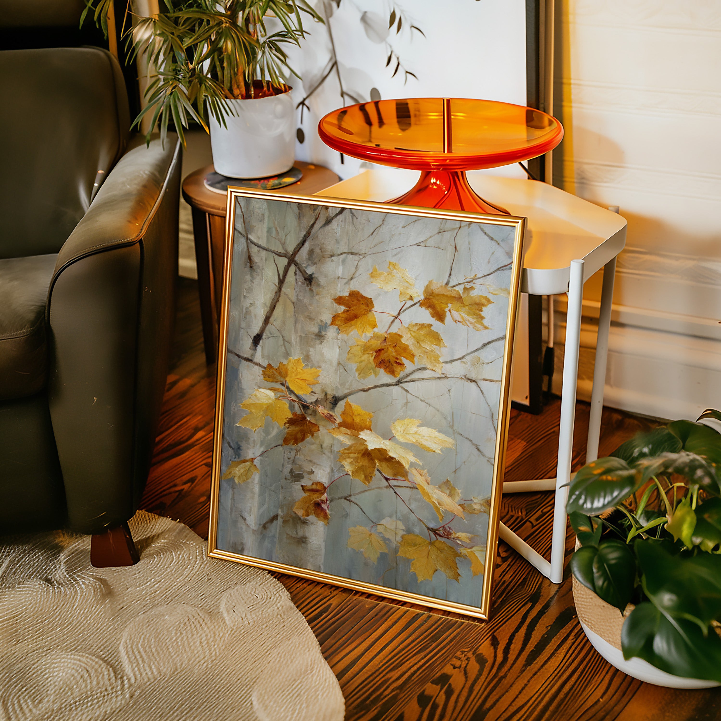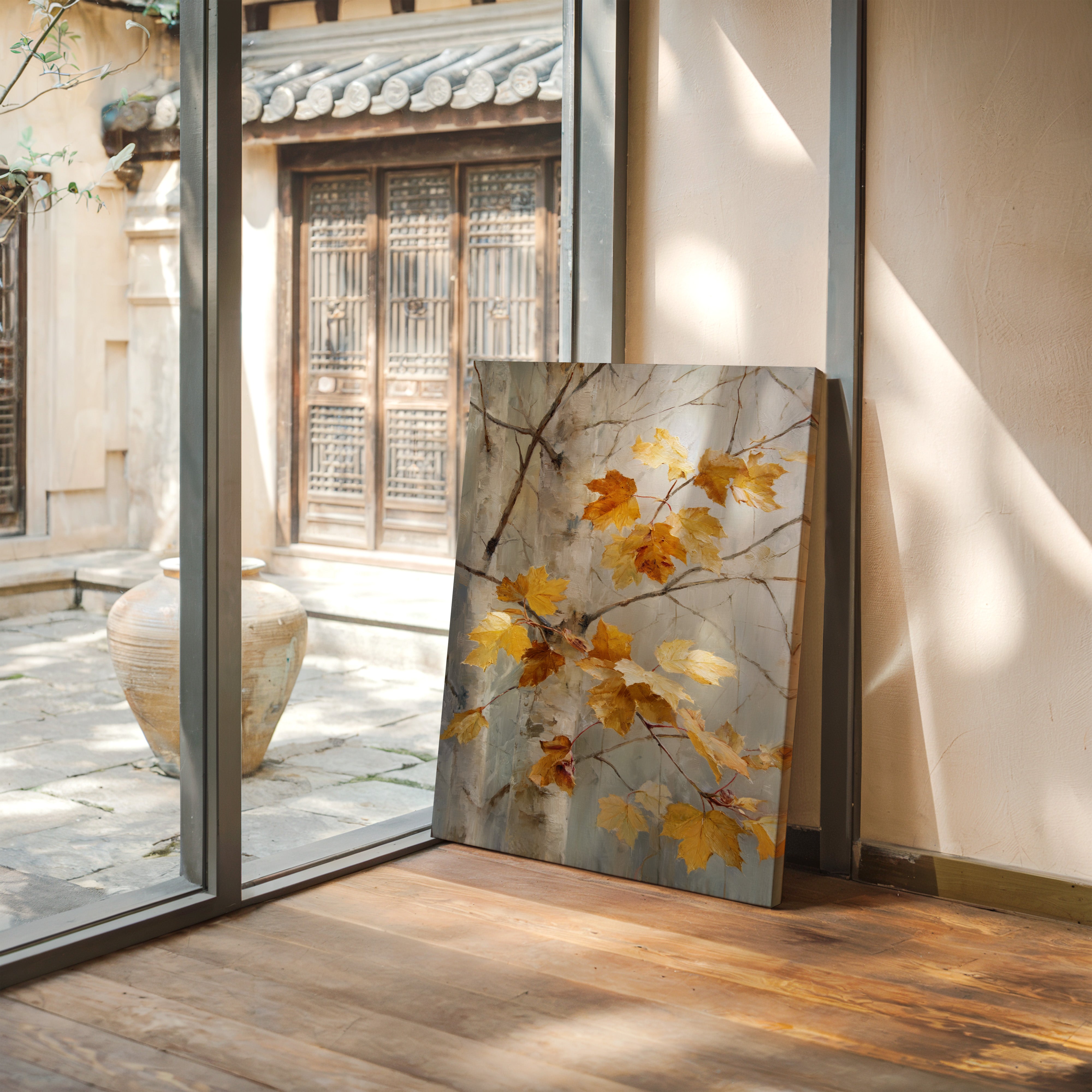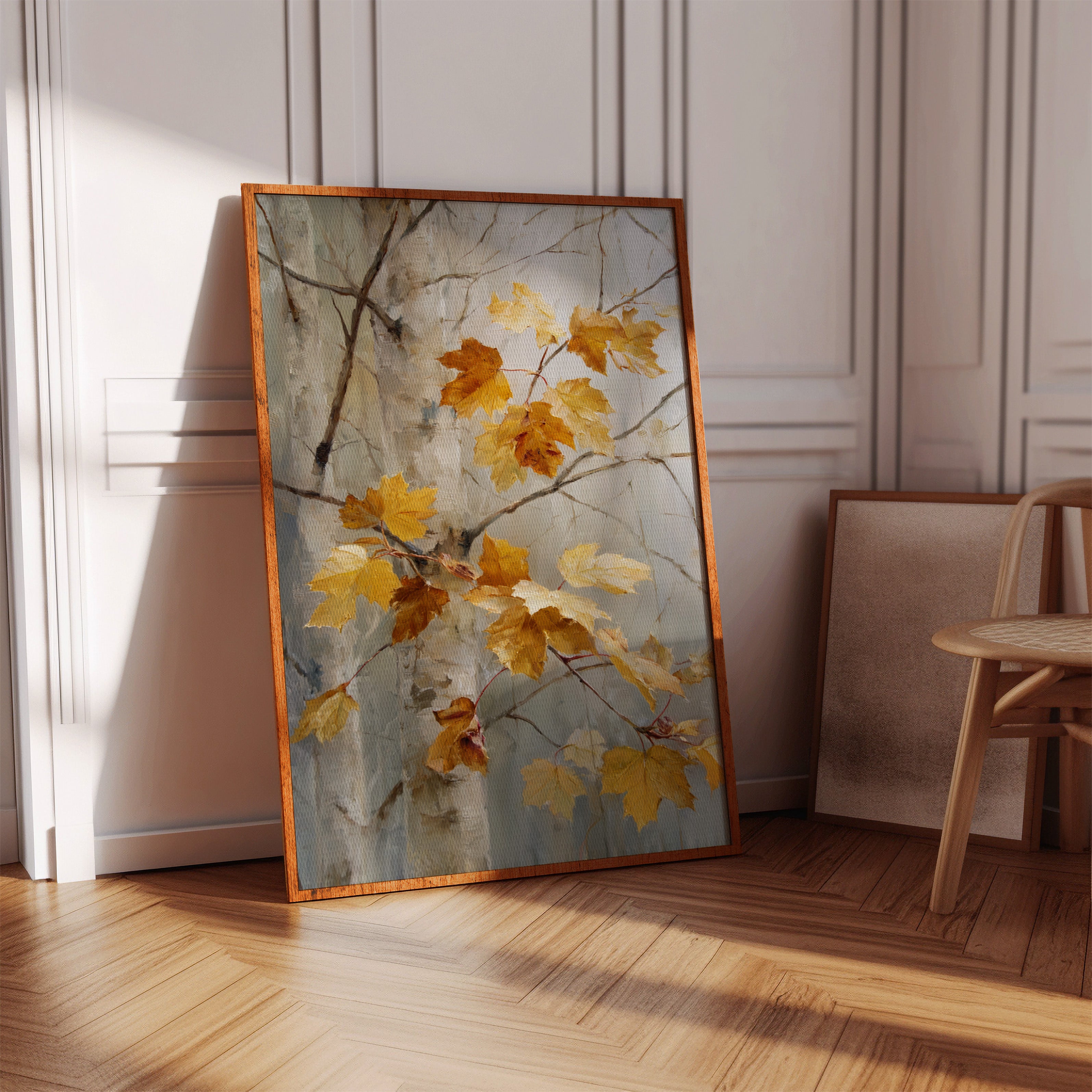 Golden maple leaves dance against a misty morning backdrop, each one seemingly suspended in a moment of graceful flight. The textured brushstrokes capture the delicate interplay of light and shadow, creating a luminous quality that makes the leaves appear to glow from within. Rich amber and honey tones contrast beautifully with the soft, ethereal grays of the background, while the gestural branches create a natural framework that guides the eye through the composition. This piece would bring a touch of autumn's warmth to a reading nook or create a focal point in a minimalist dining space.