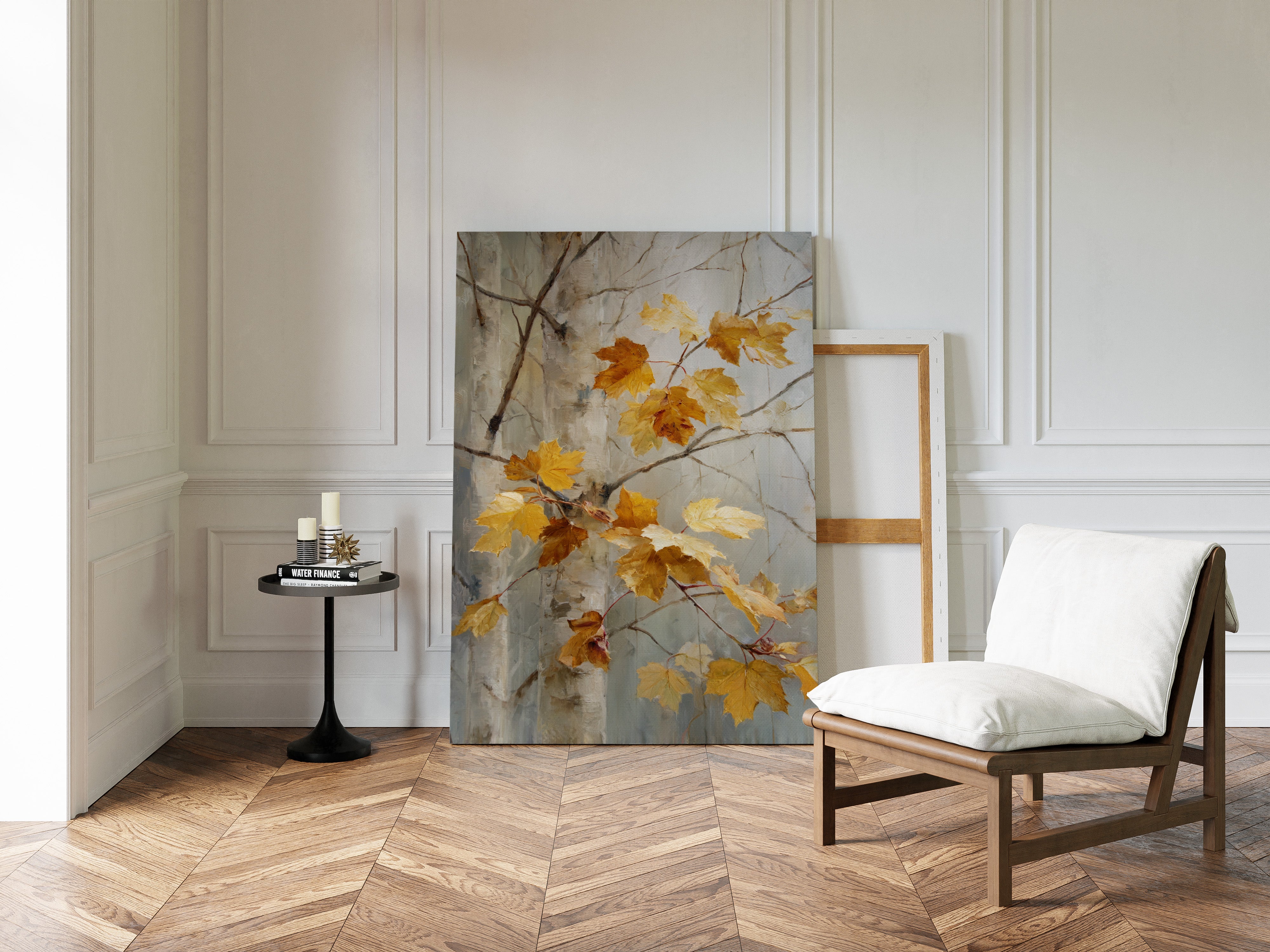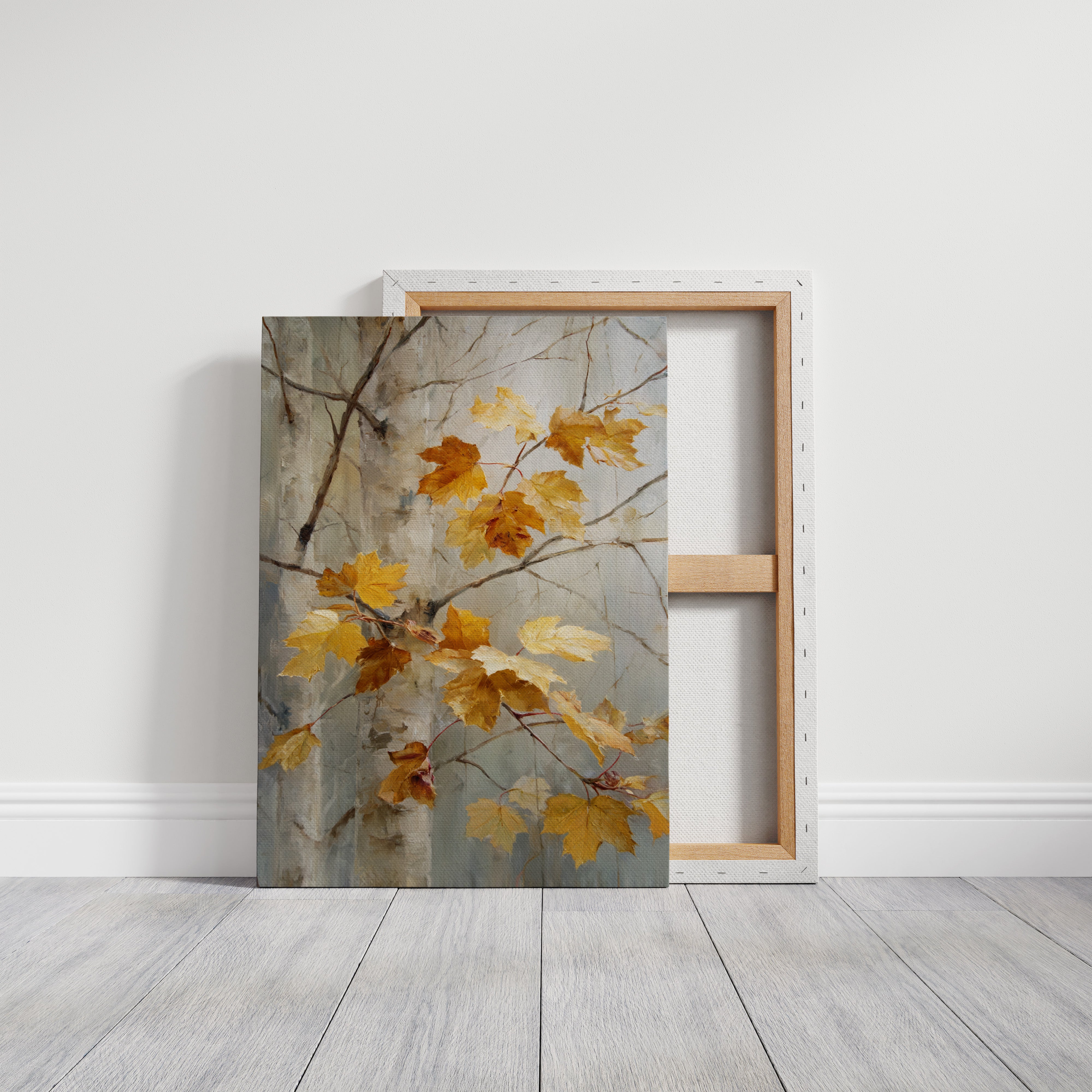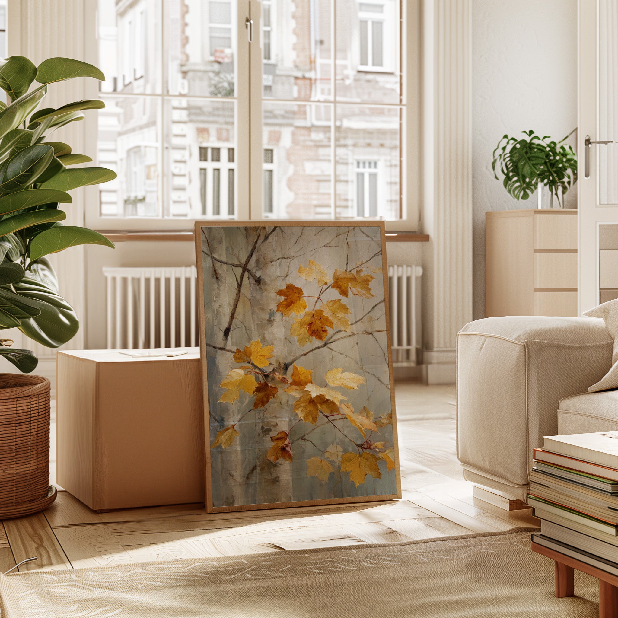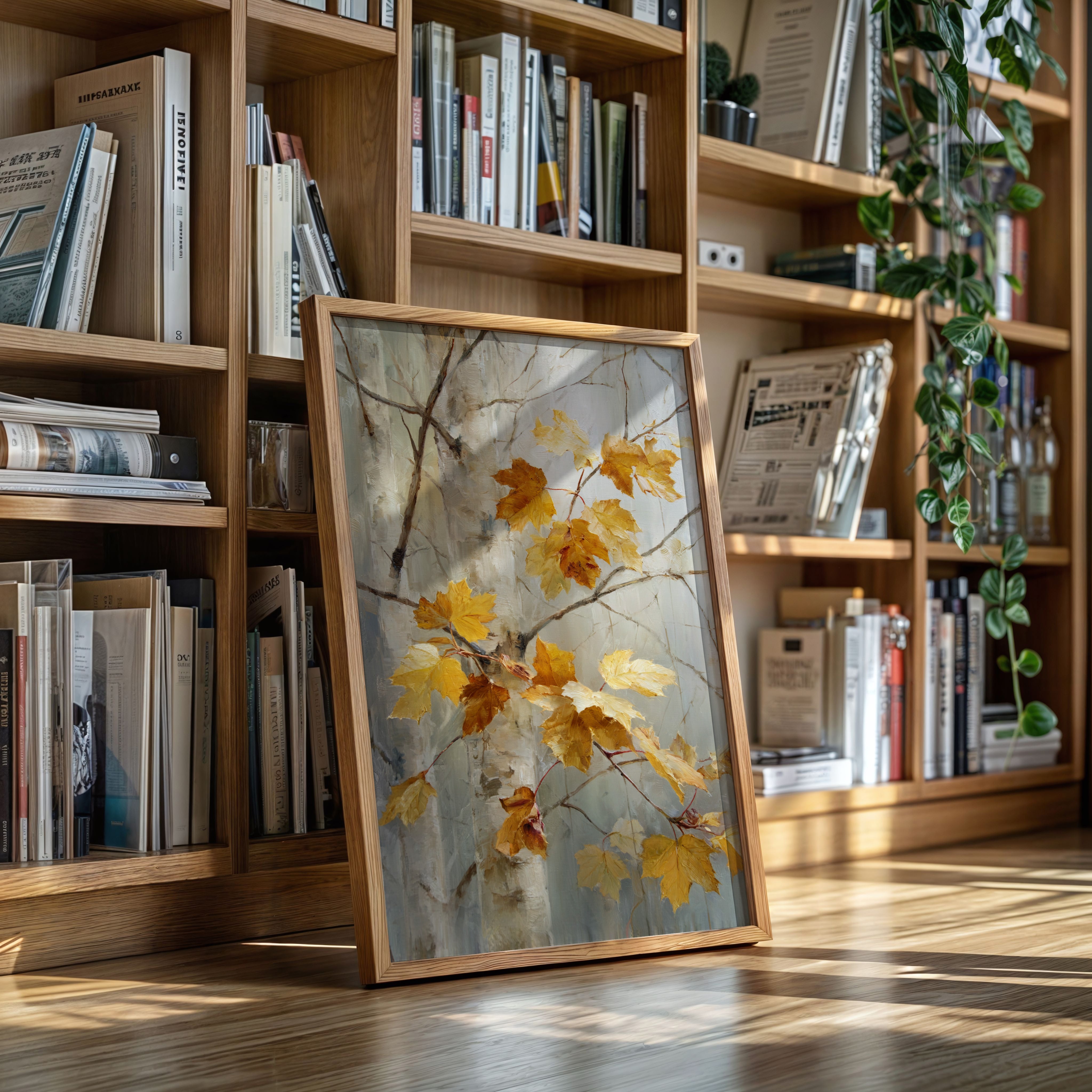 Golden maple leaves dance against a misty morning backdrop, each one seemingly suspended in a moment of graceful flight. The textured brushstrokes capture the delicate interplay of light and shadow, creating a luminous quality that makes the leaves appear to glow from within. Rich amber and honey tones contrast beautifully with the soft, ethereal grays of the background, while the gestural branches create a natural framework that guides the eye through the composition. This piece would bring a touch of autumn's warmth to a reading nook or create a focal point in a minimalist dining space.