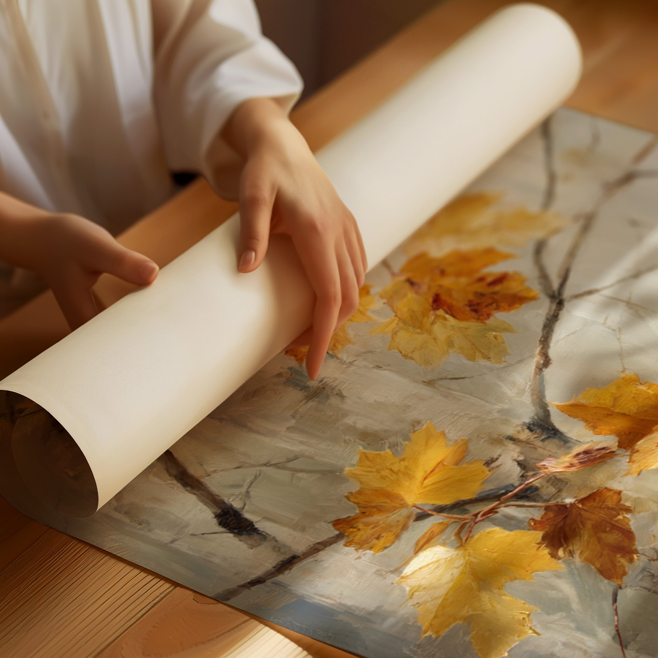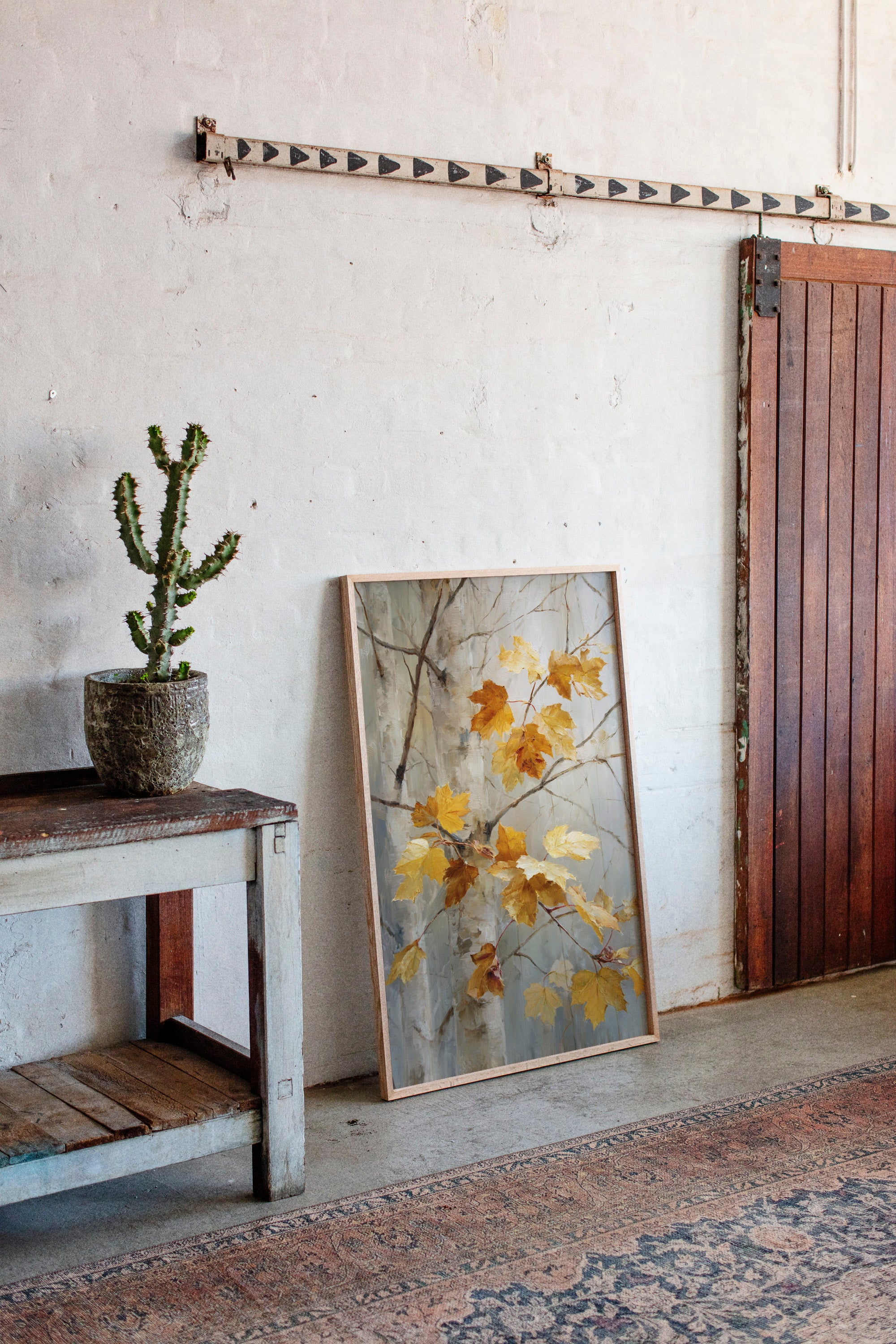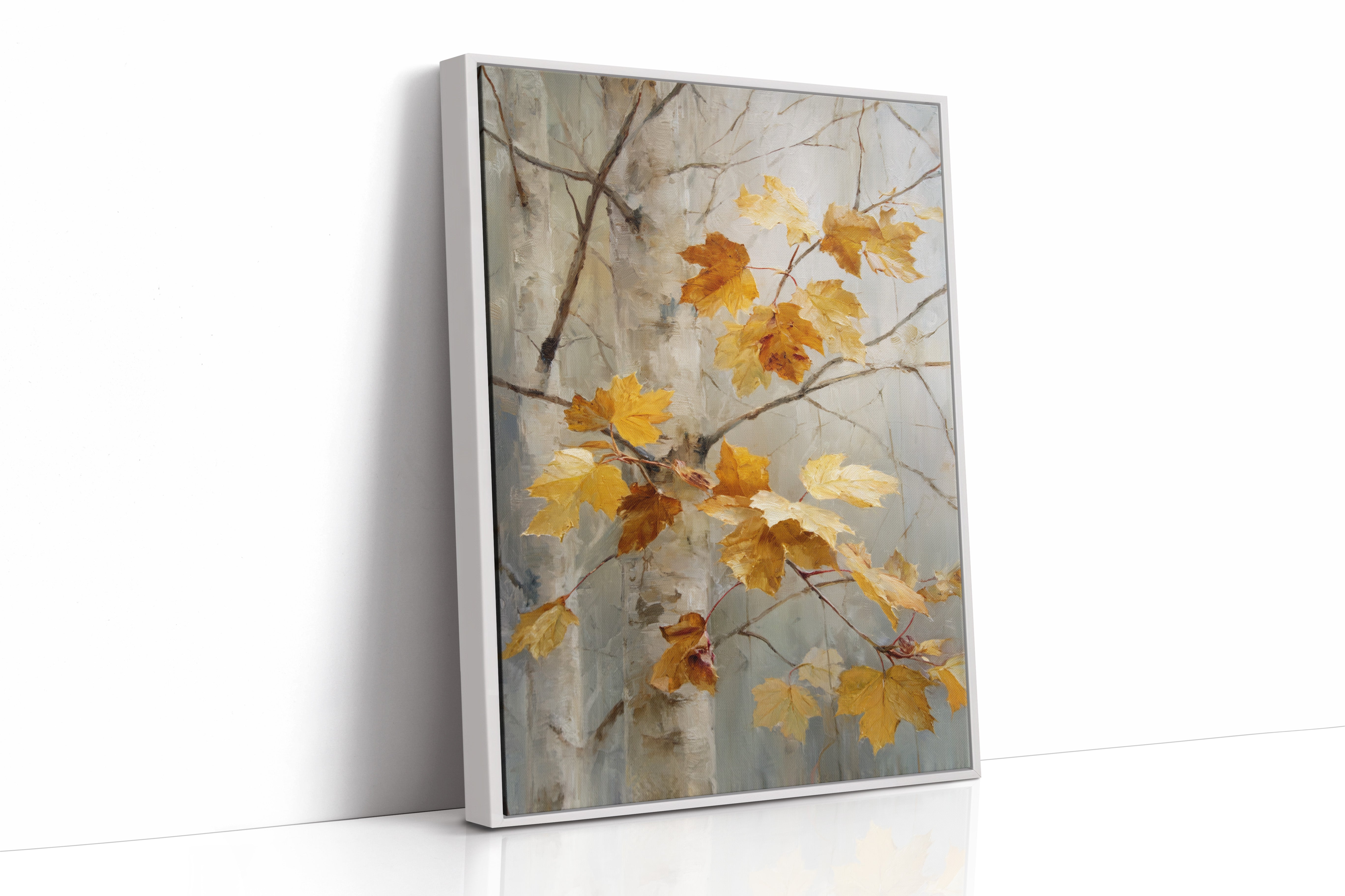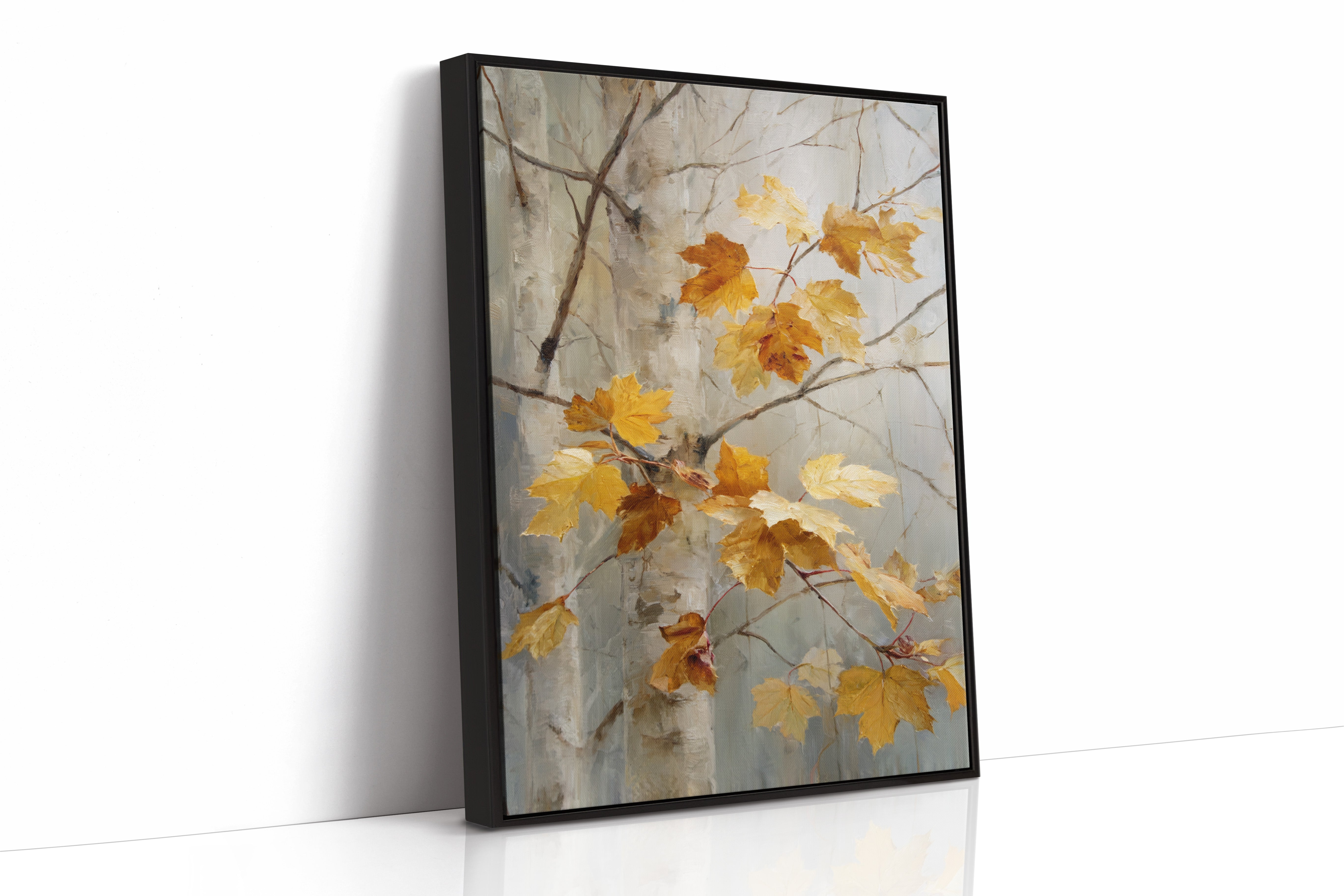 Golden maple leaves dance against a misty morning backdrop, each one seemingly suspended in a moment of graceful flight. The textured brushstrokes capture the delicate interplay of light and shadow, creating a luminous quality that makes the leaves appear to glow from within. Rich amber and honey tones contrast beautifully with the soft, ethereal grays of the background, while the gestural branches create a natural framework that guides the eye through the composition. This piece would bring a touch of autumn's warmth to a reading nook or create a focal point in a minimalist dining space.