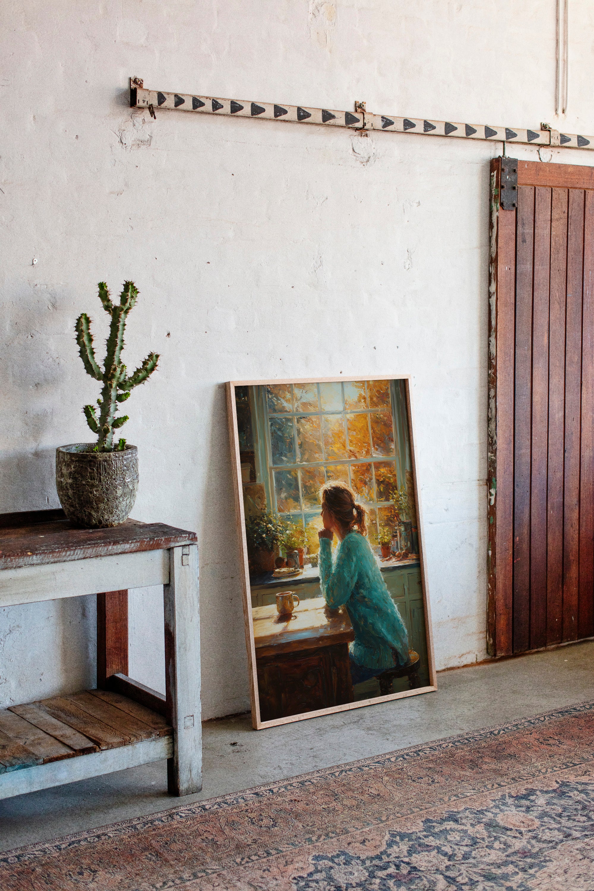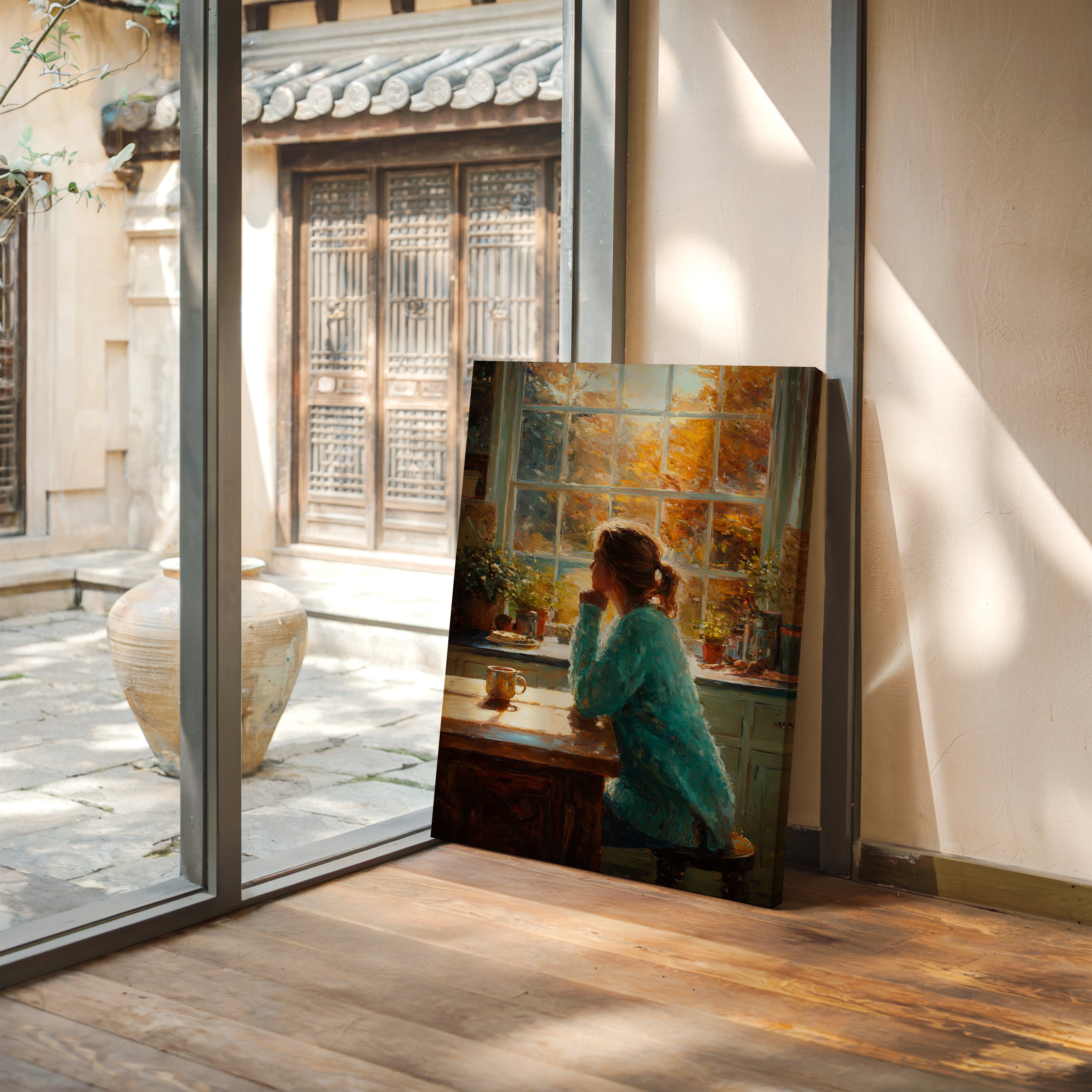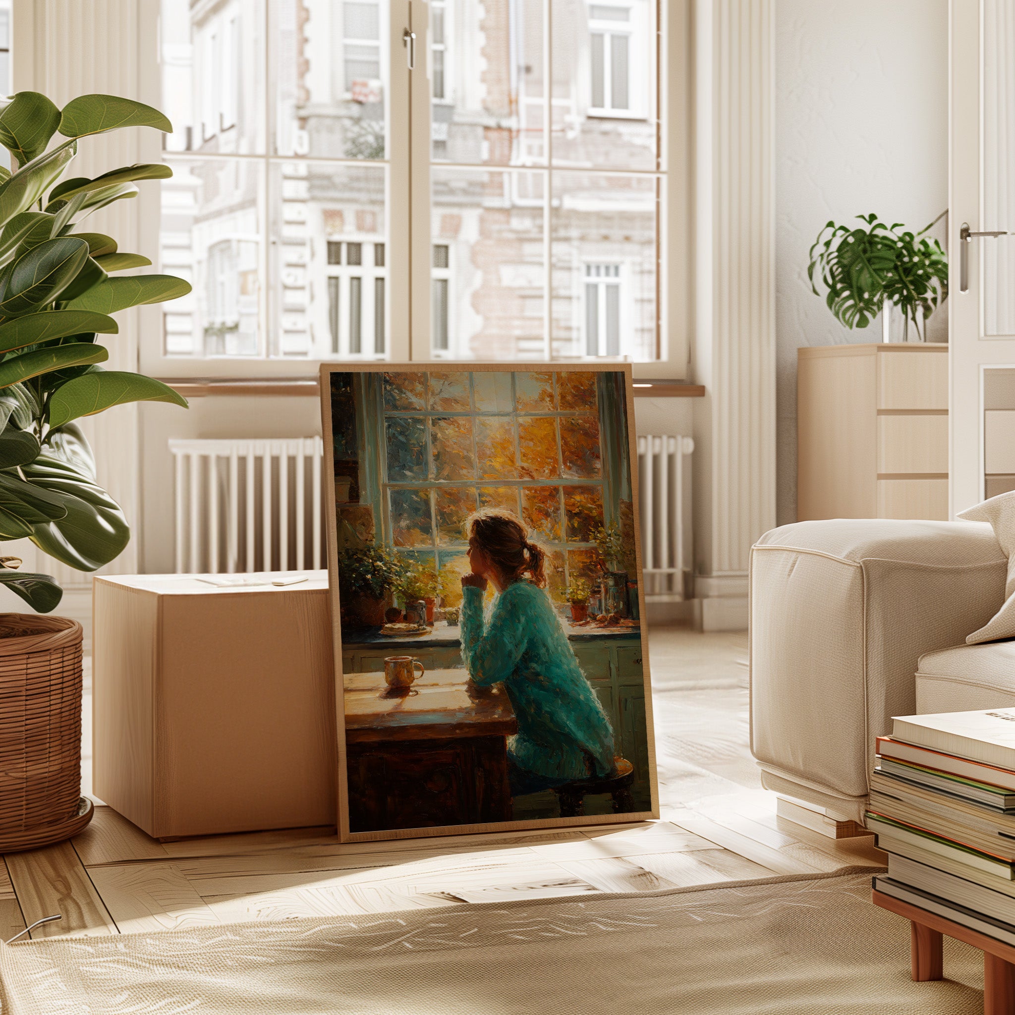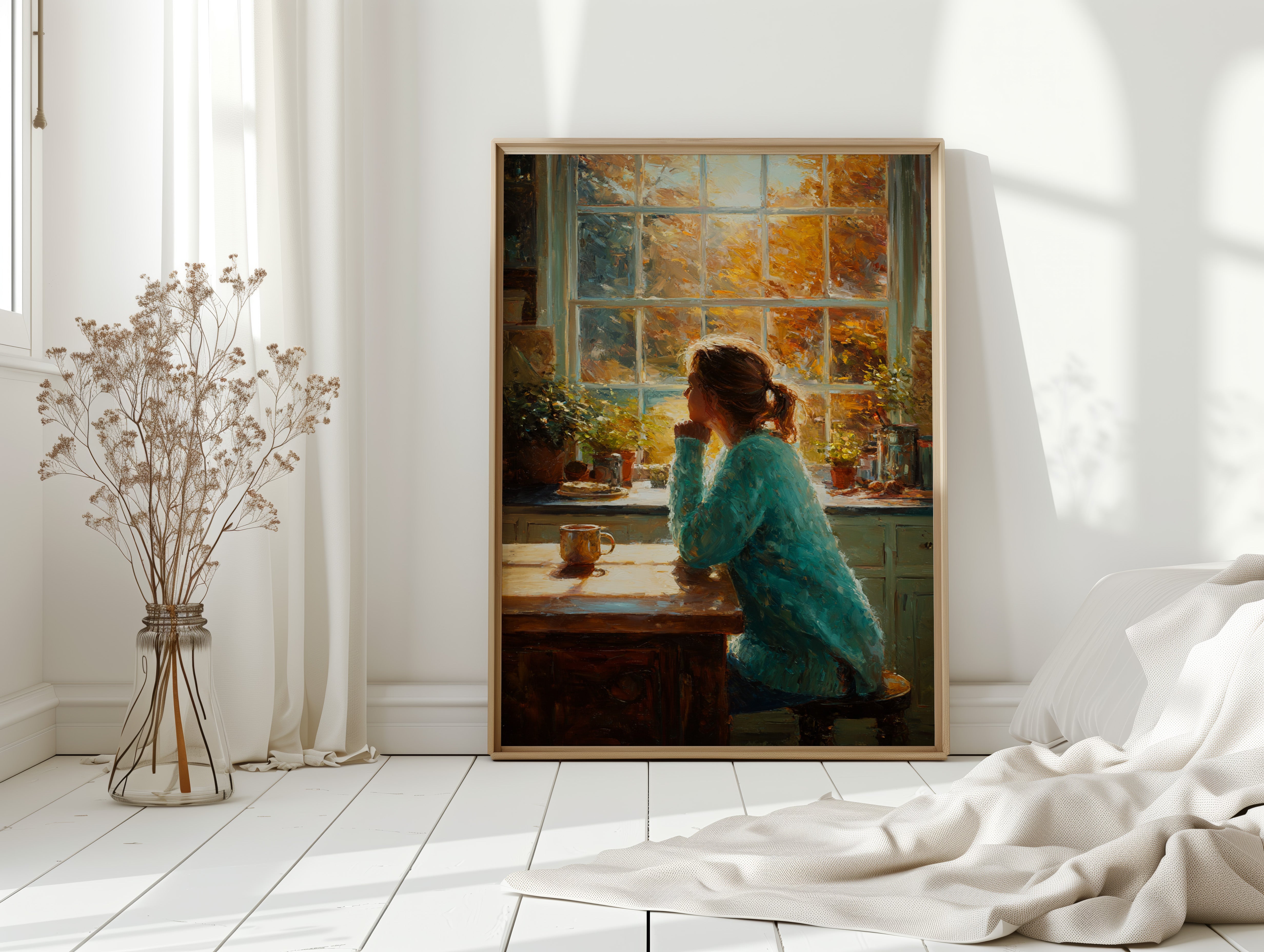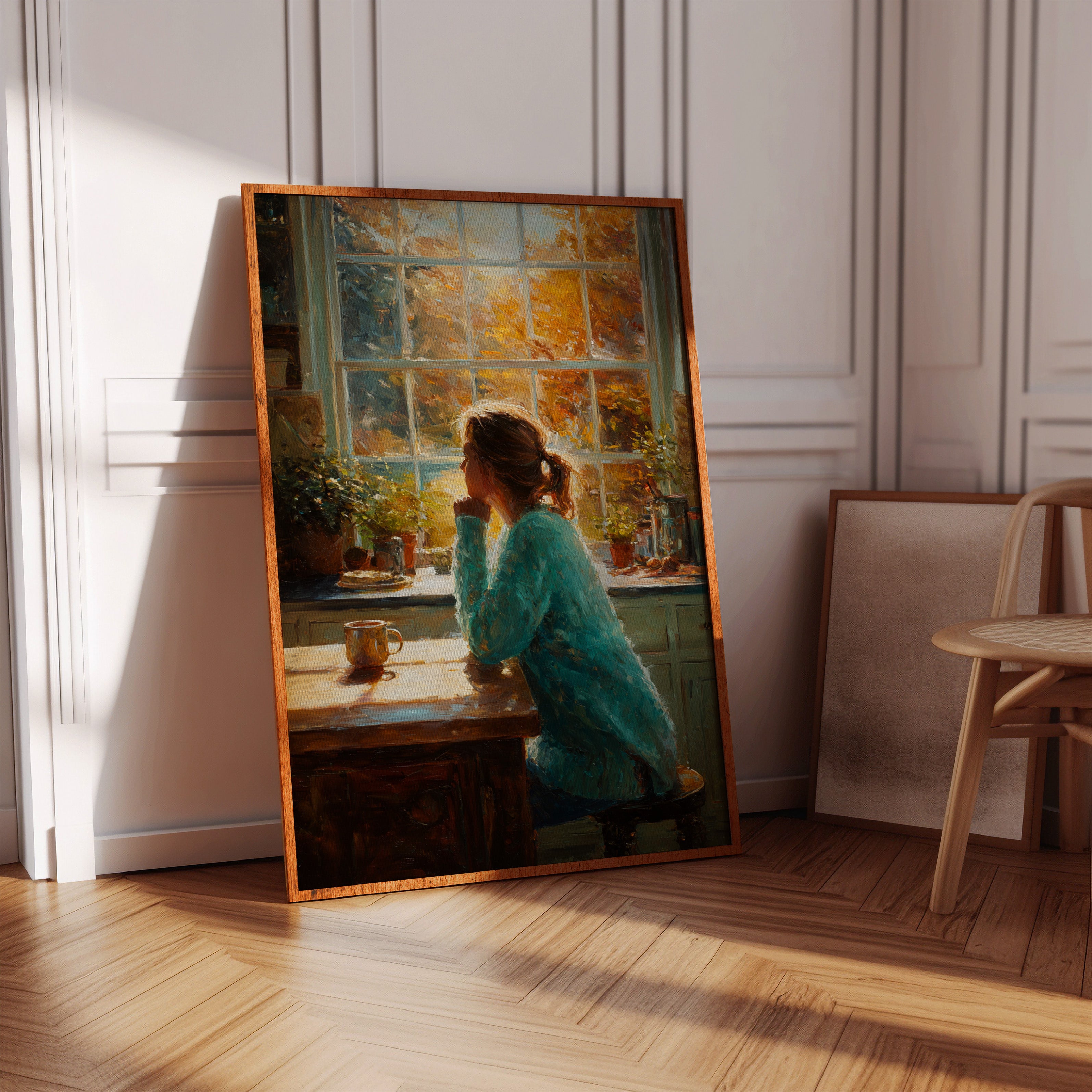 Golden morning light spills through windowpanes, painting warmth across a peaceful kitchen scene. A figure in a cozy turquoise sweater pauses for a quiet moment of contemplation, while autumn foliage burns bright orange beyond the glass. Rich textures emerge through impressionistic brushstrokes – the worn wooden table, steaming coffee cup, and potted plants creating a sanctuary of domestic tranquility. This intimate portrait captures the essence of slow living and mindful moments.