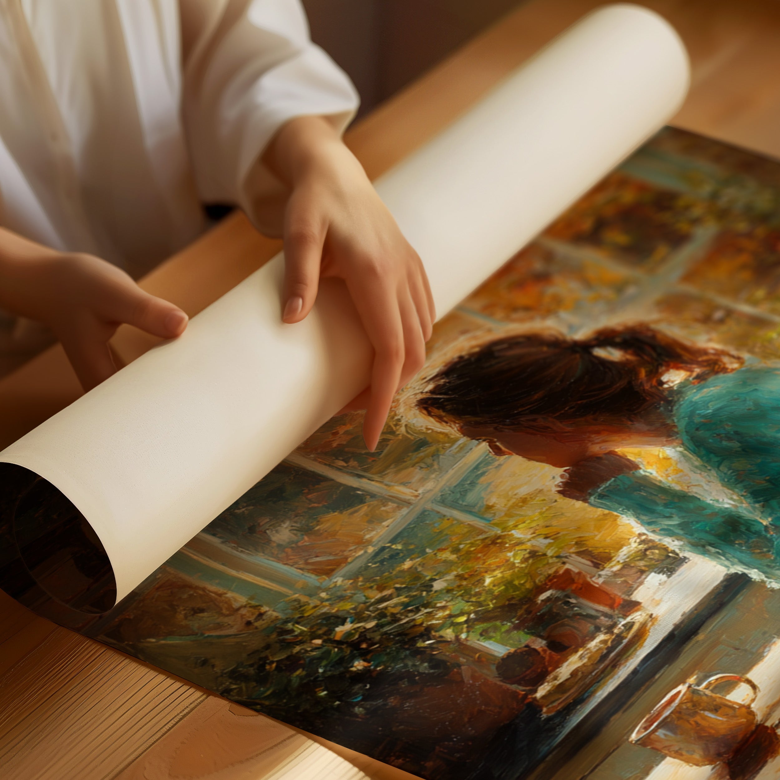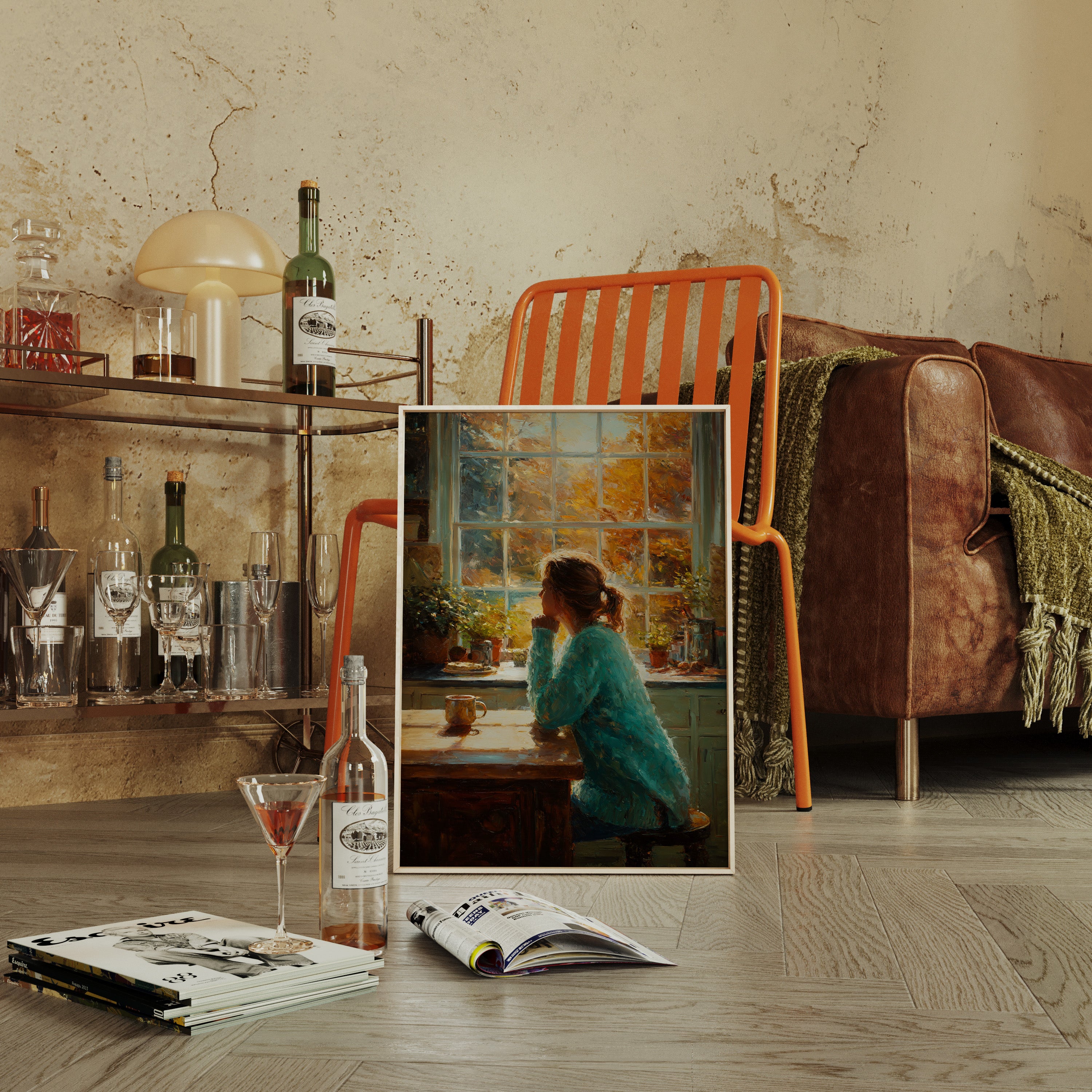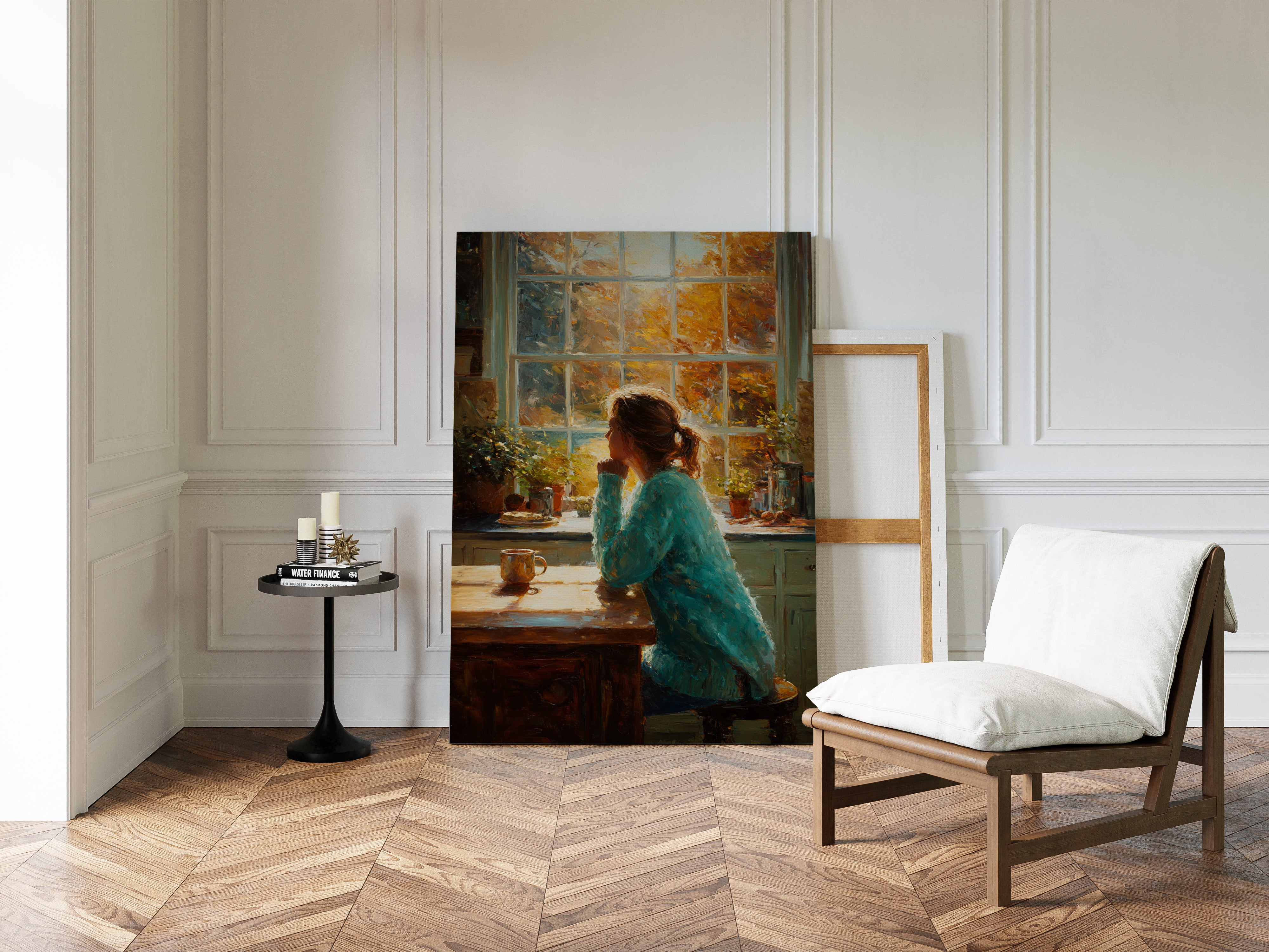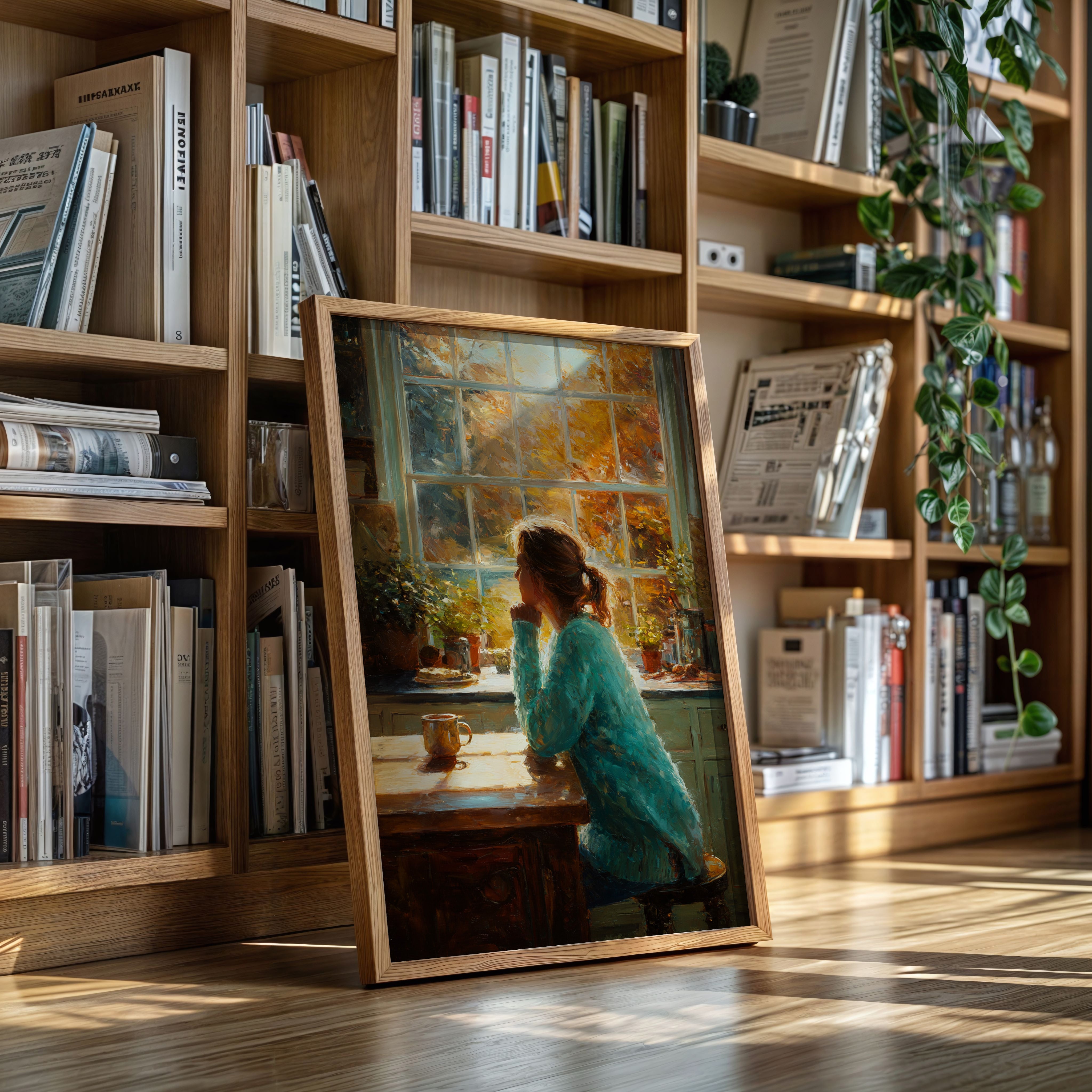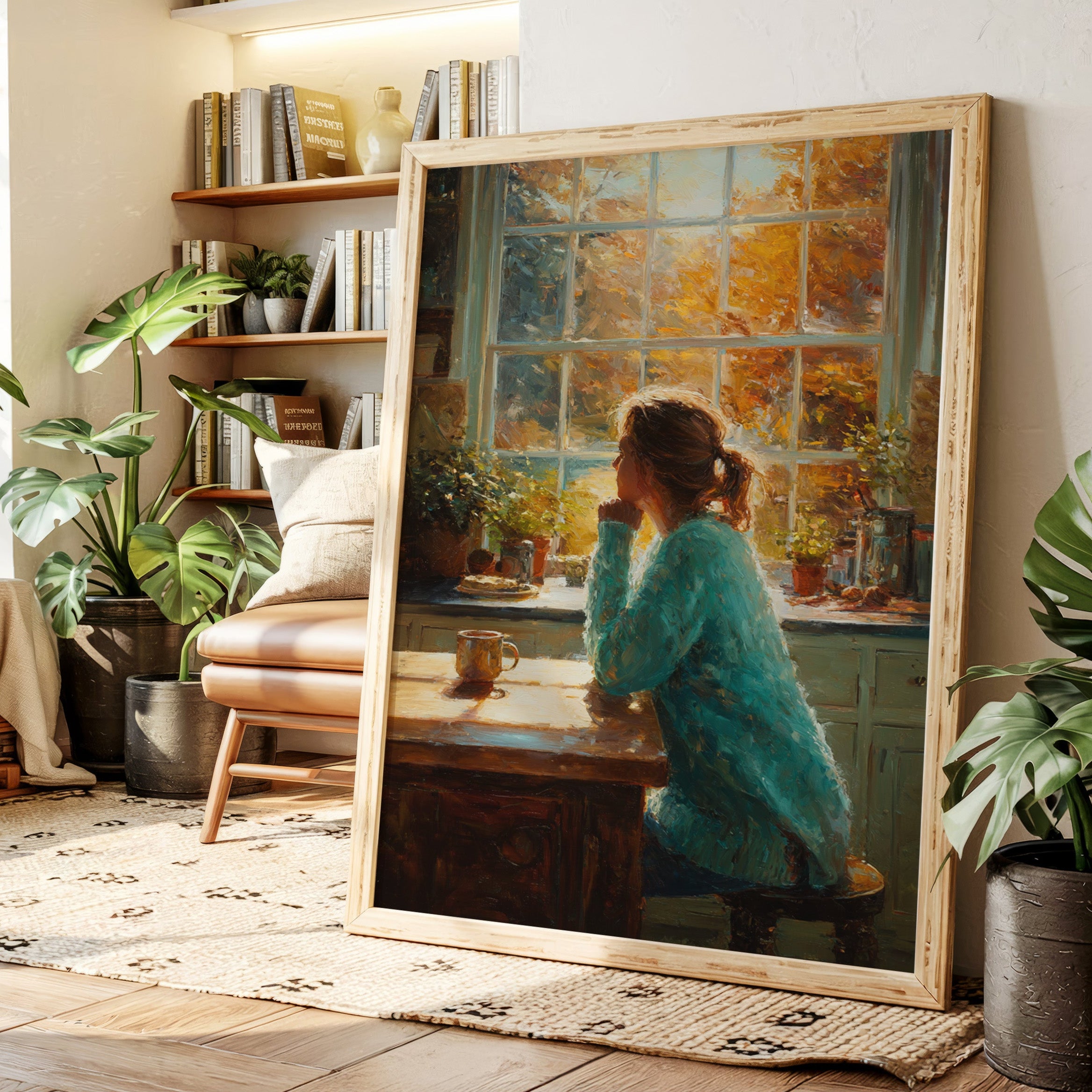 Golden morning light spills through windowpanes, painting warmth across a peaceful kitchen scene. A figure in a cozy turquoise sweater pauses for a quiet moment of contemplation, while autumn foliage burns bright orange beyond the glass. Rich textures emerge through impressionistic brushstrokes – the worn wooden table, steaming coffee cup, and potted plants creating a sanctuary of domestic tranquility. This intimate portrait captures the essence of slow living and mindful moments.