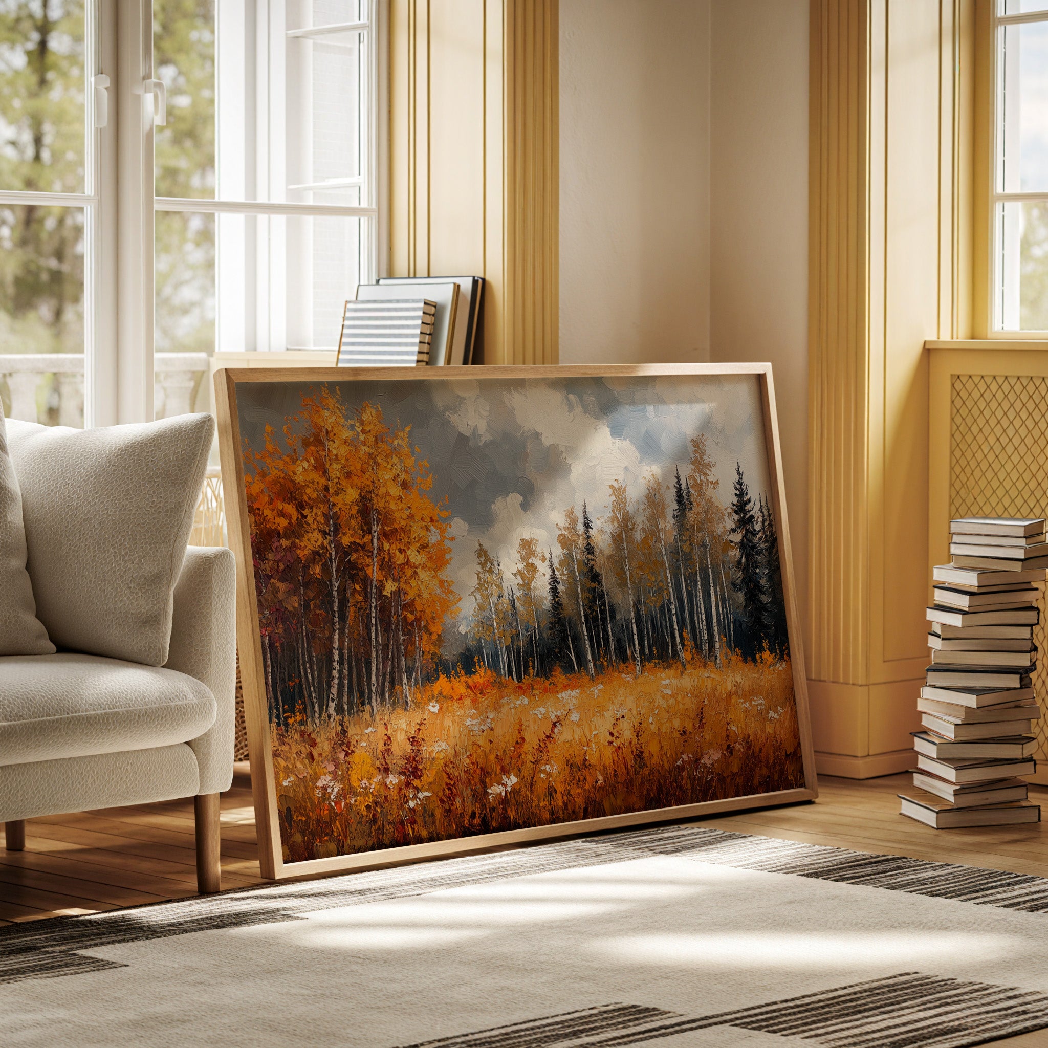 Golden light spills across a wild meadow, where late-season wildflowers dance among amber grasses. White birch trunks stand like sentinels against a dramatic sky, their leaves ablaze in brilliant orange and yellow hues. The textured brushstrokes capture the raw beauty of the changing season, where evergreen spruce trees anchor the composition with their steadfast presence. This piece tells the story of nature's most vibrant finale, where every blade and leaf burns bright before winter's approach. Perfect for creating a focal point in gathering spaces like living rooms or dining areas, where its warm palette can inspire connection and contemplation.