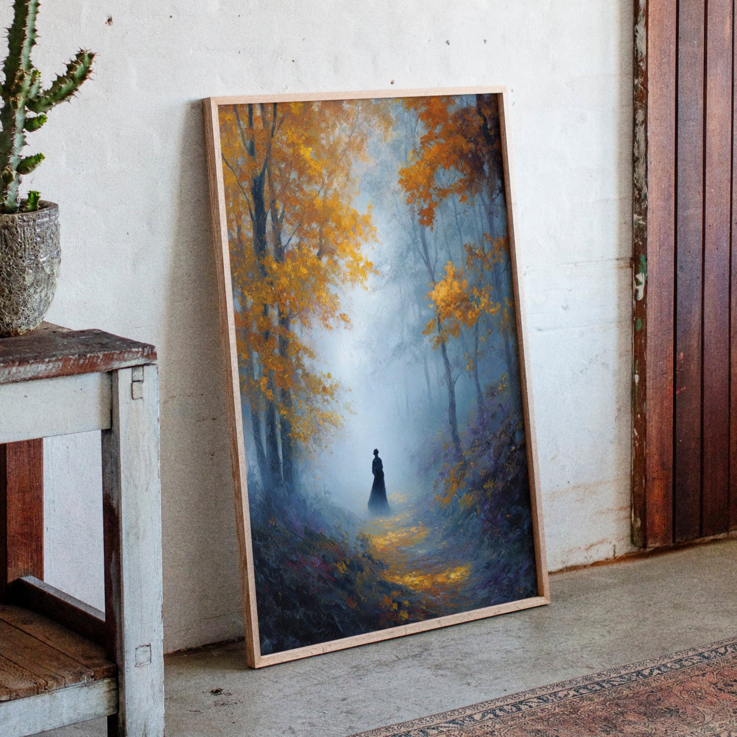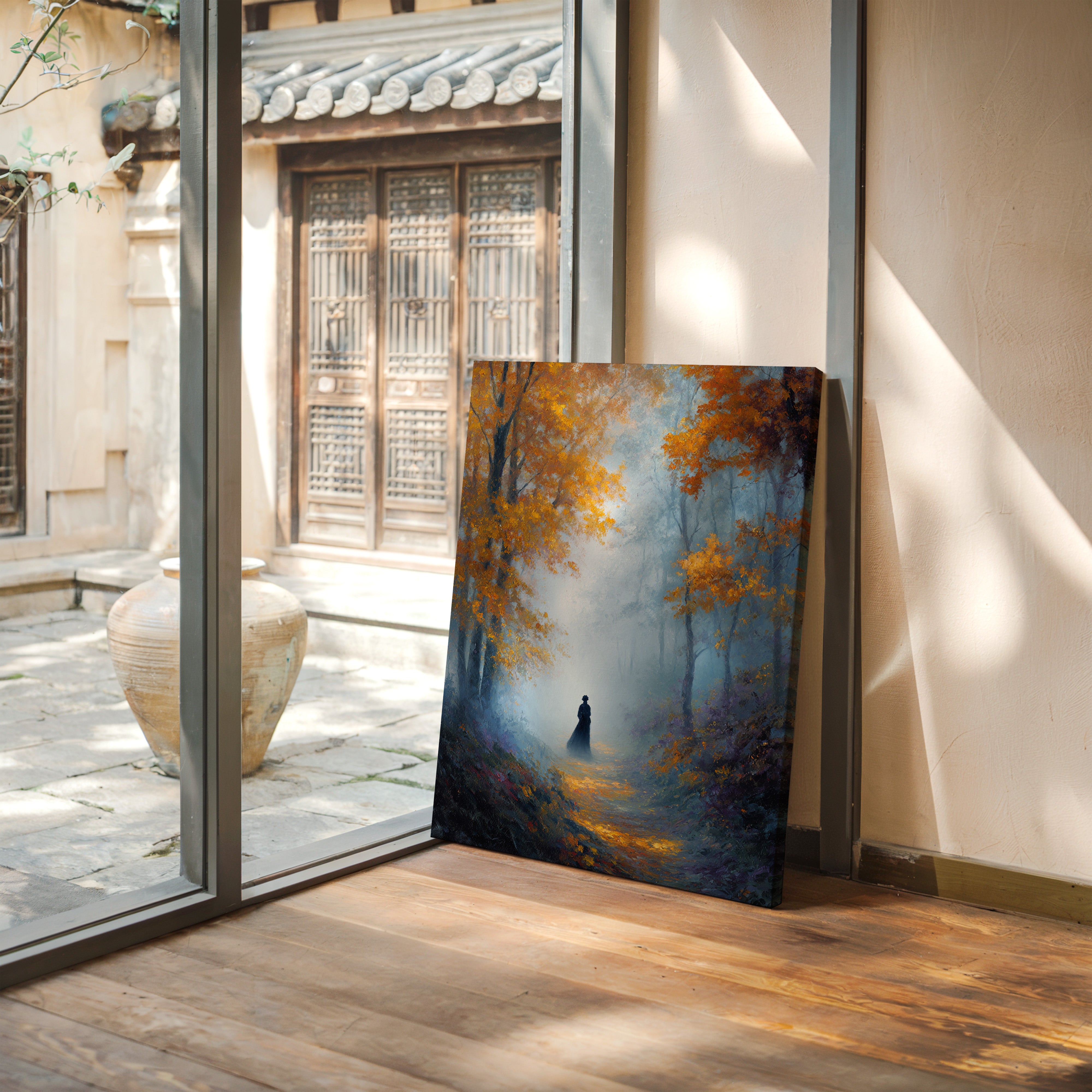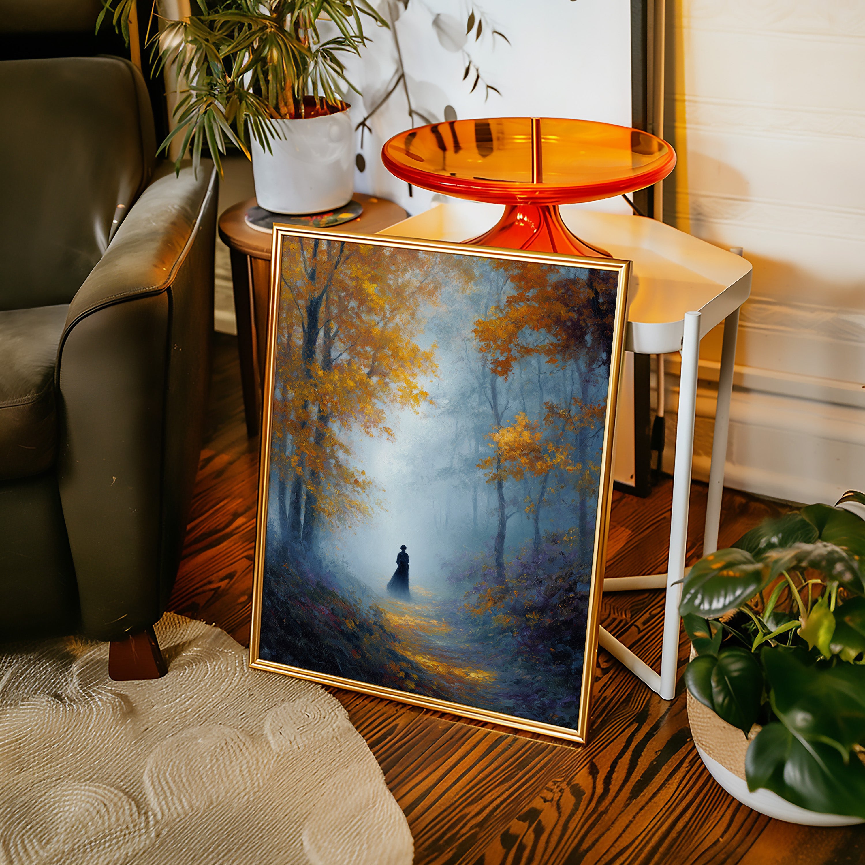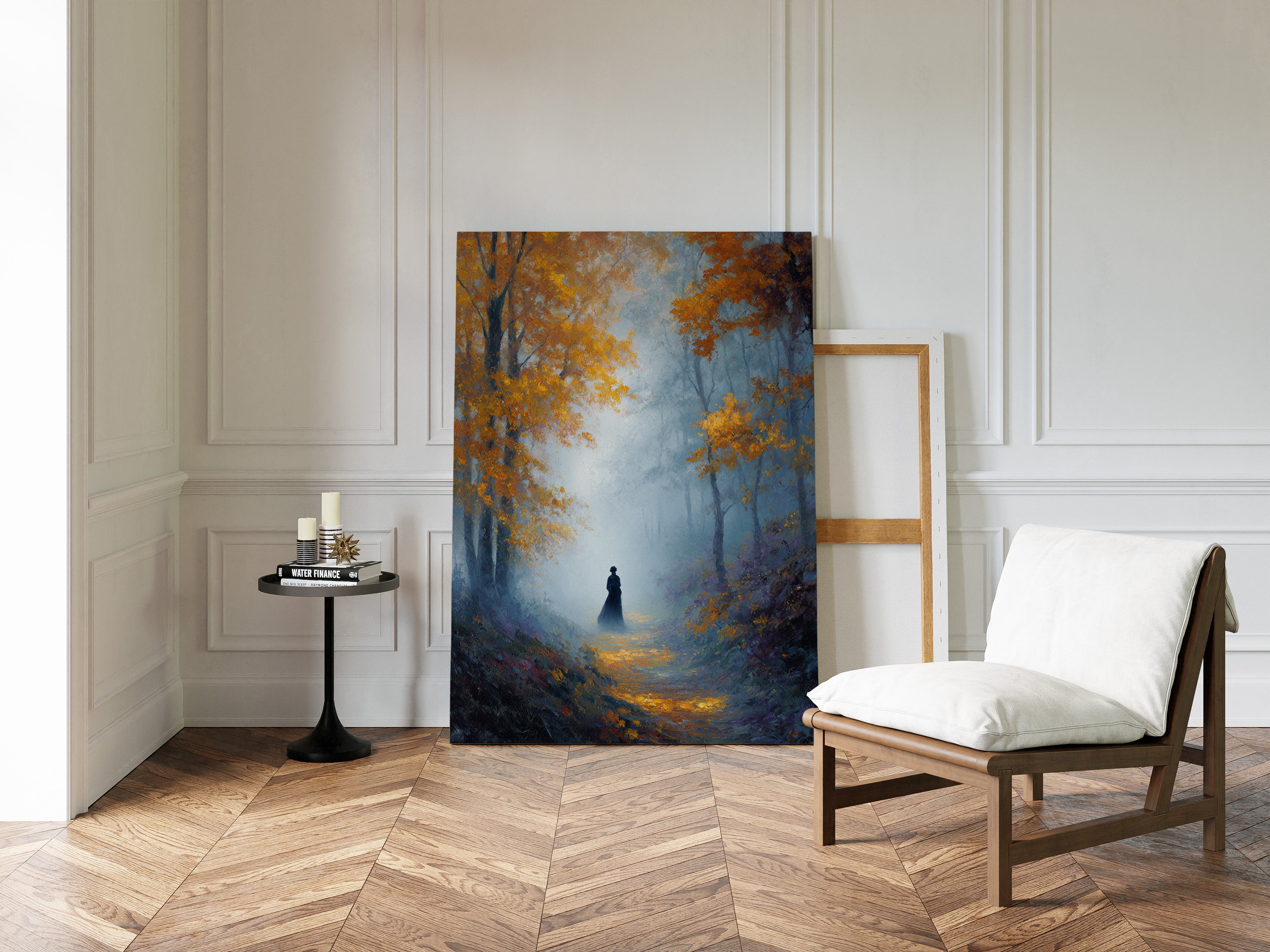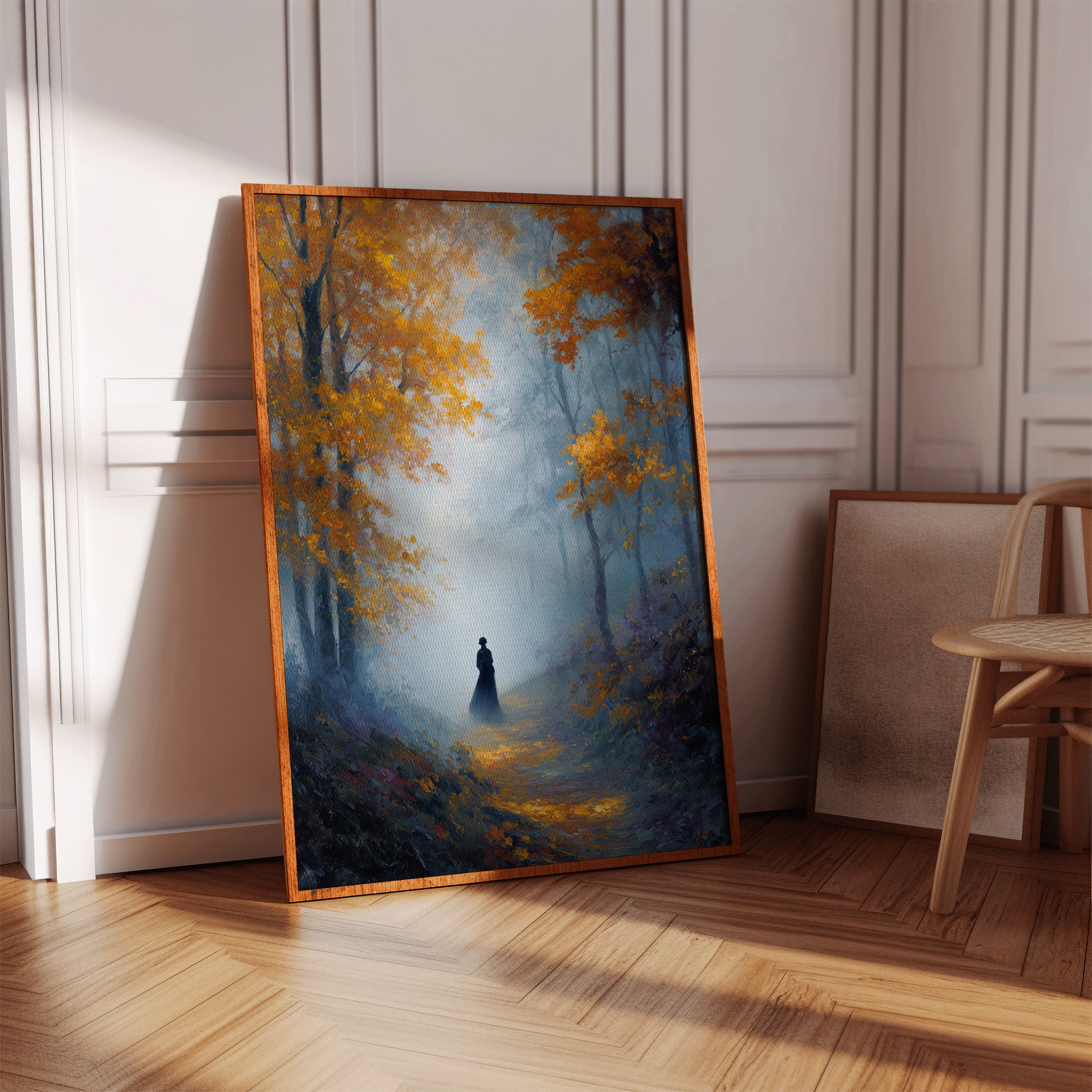 A solitary figure stands wrapped in morning fog, where golden leaves paint the air with whispered stories. The mysterious path ahead gleams with fallen autumn foliage, creating a luminous carpet through the misty woodland. Deep blues and rich oranges dance together in ethereal harmony, while towering trees stand as silent guardians of this enchanted moment. This contemplative scene would bring a touch of mystery and romance to a reading nook or create an atmospheric focal point in a formal dining room.