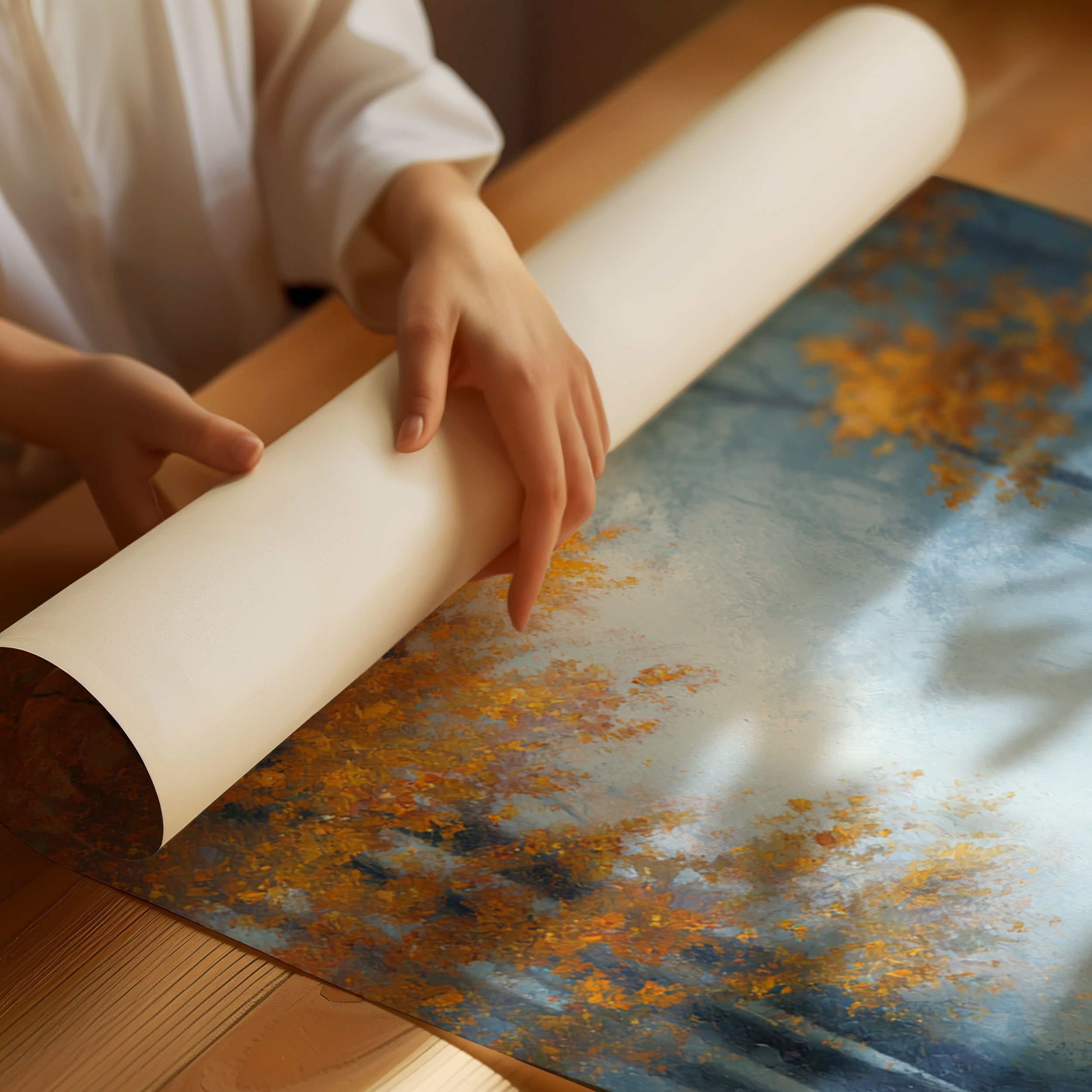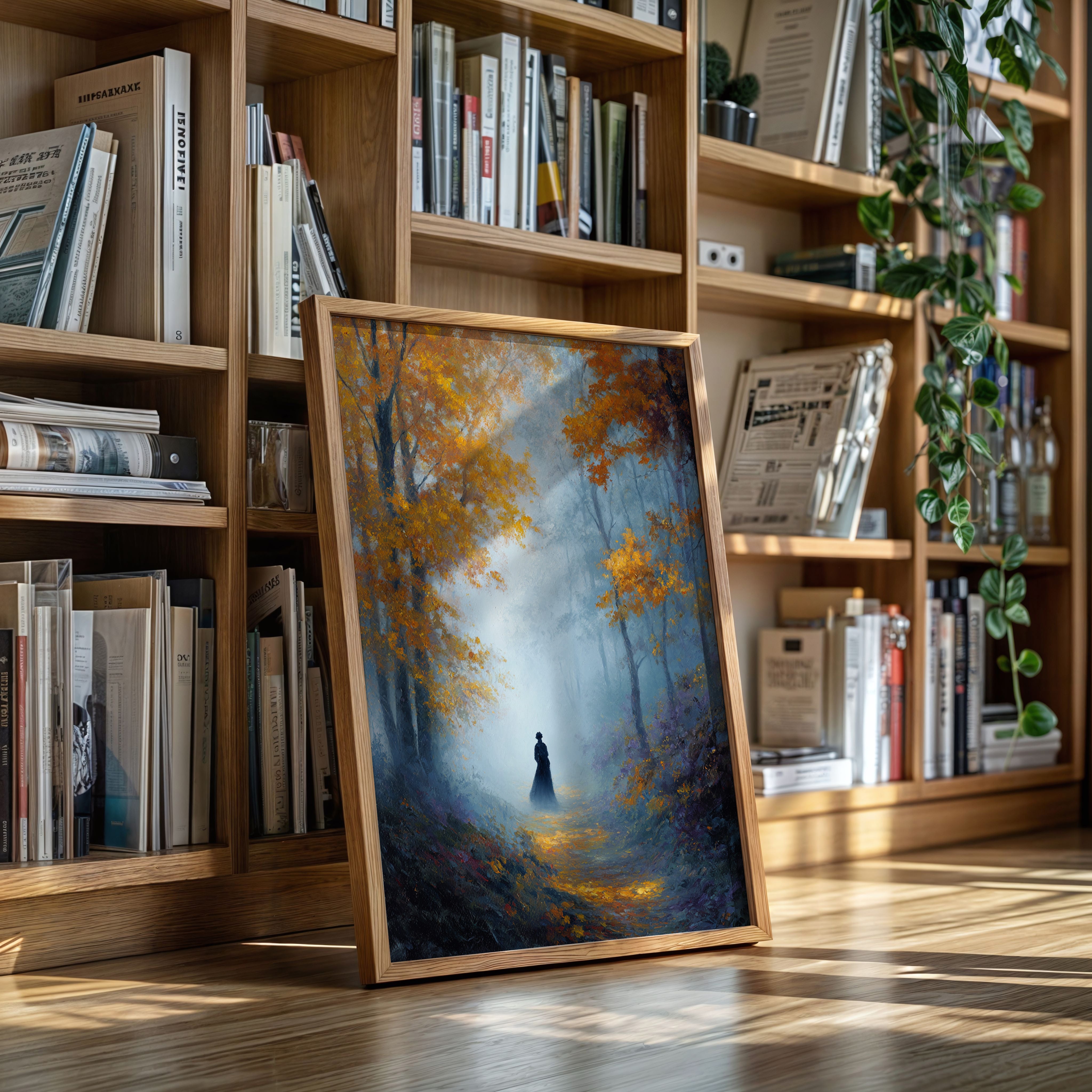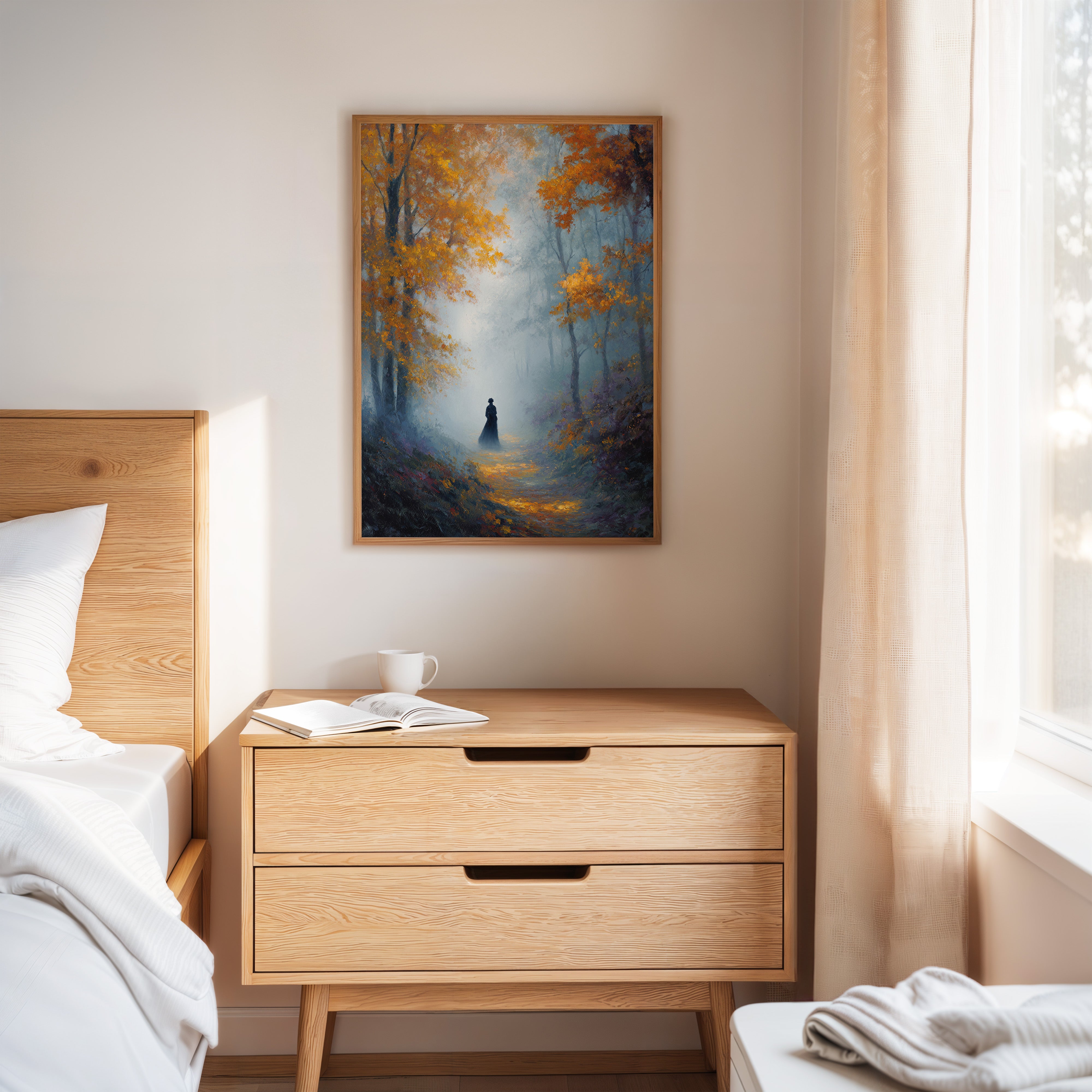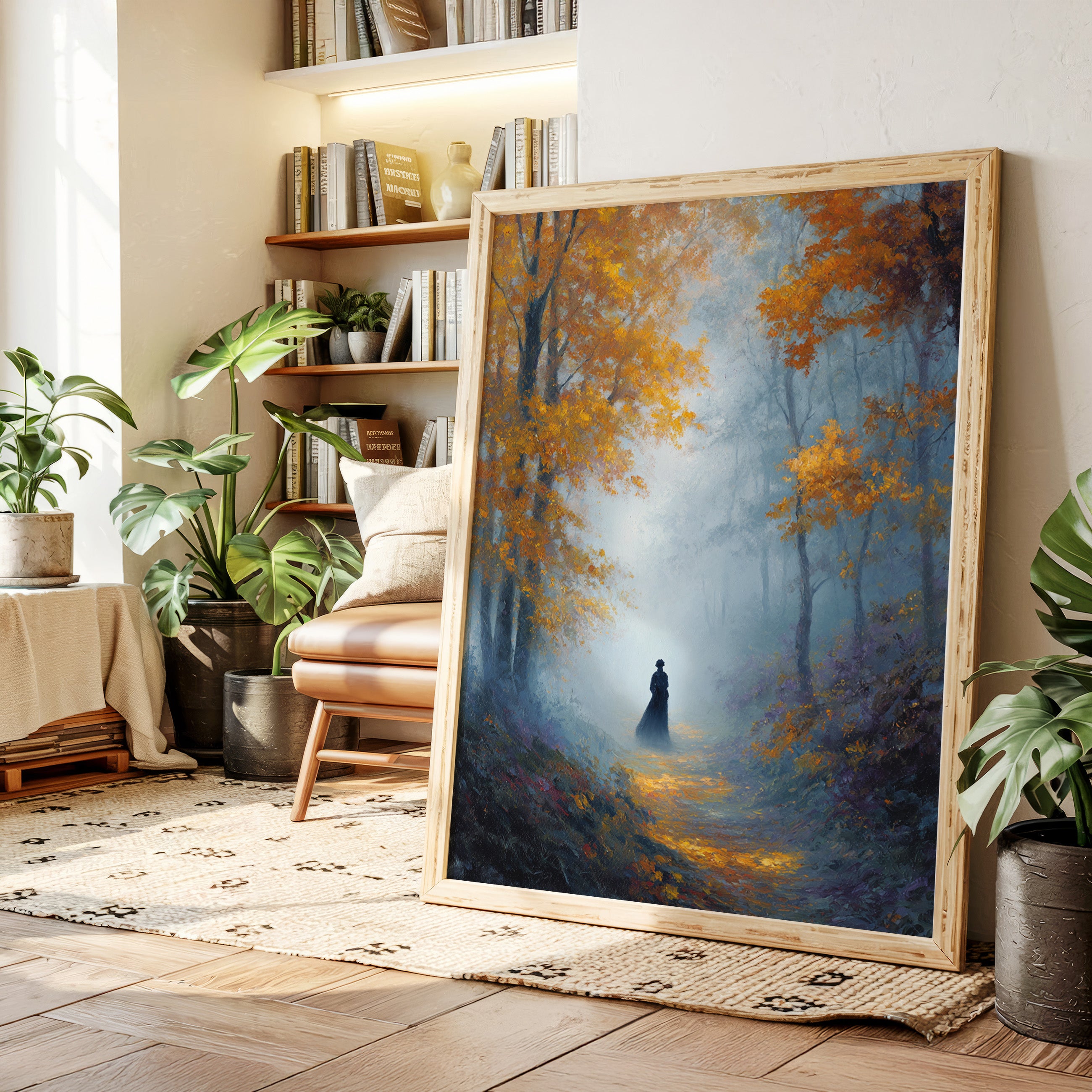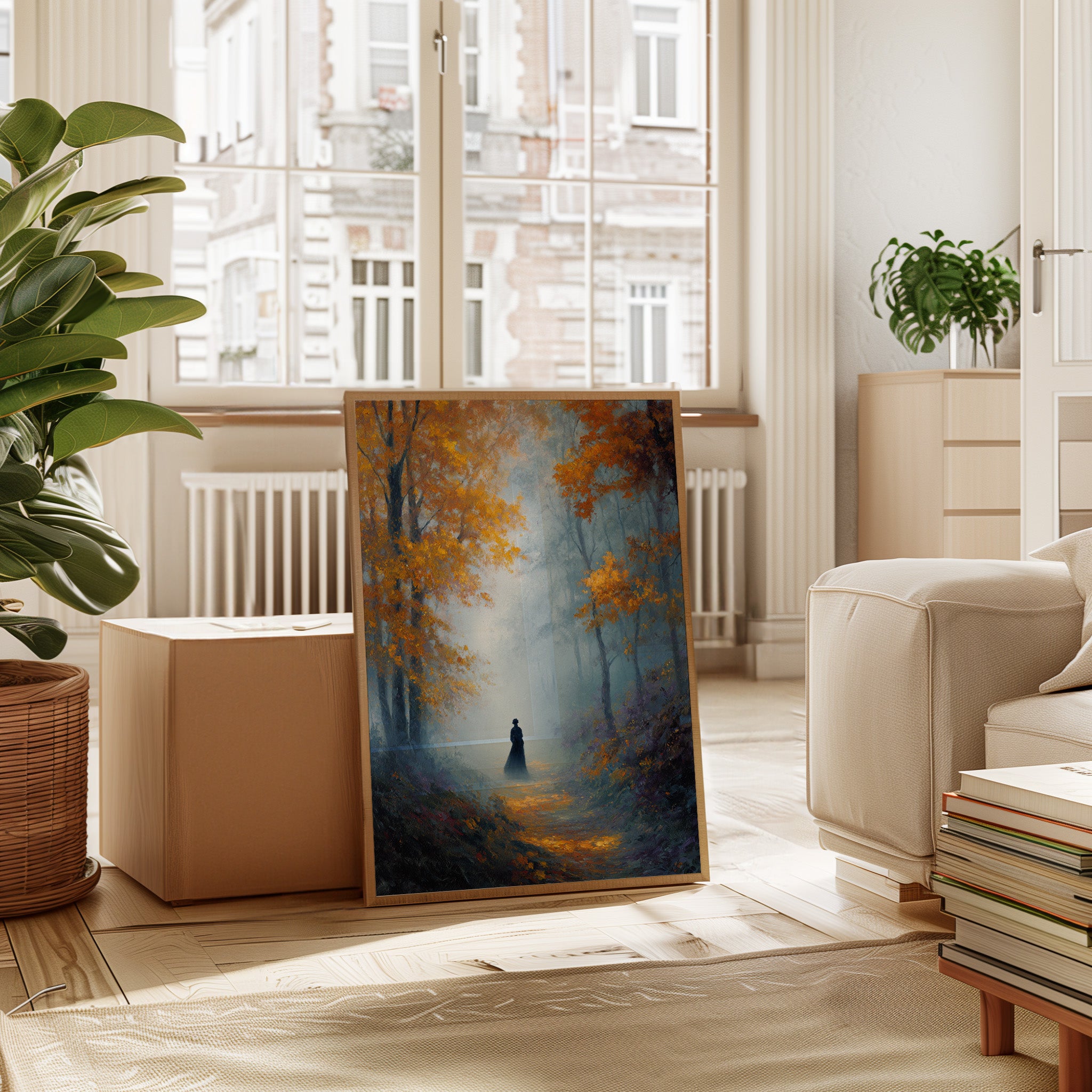 A solitary figure stands wrapped in morning fog, where golden leaves paint the air with whispered stories. The mysterious path ahead gleams with fallen autumn foliage, creating a luminous carpet through the misty woodland. Deep blues and rich oranges dance together in ethereal harmony, while towering trees stand as silent guardians of this enchanted moment. This contemplative scene would bring a touch of mystery and romance to a reading nook or create an atmospheric focal point in a formal dining room.