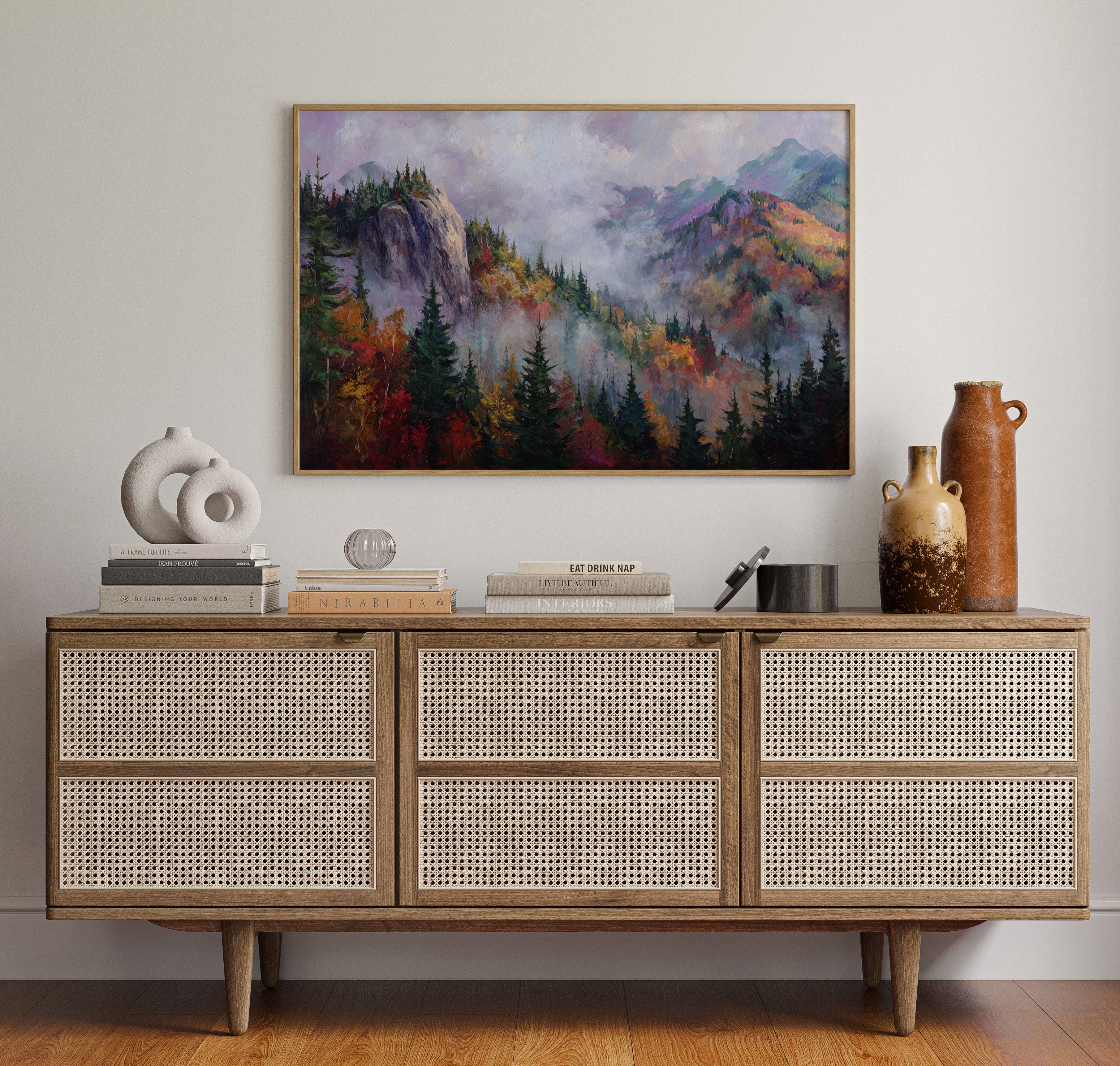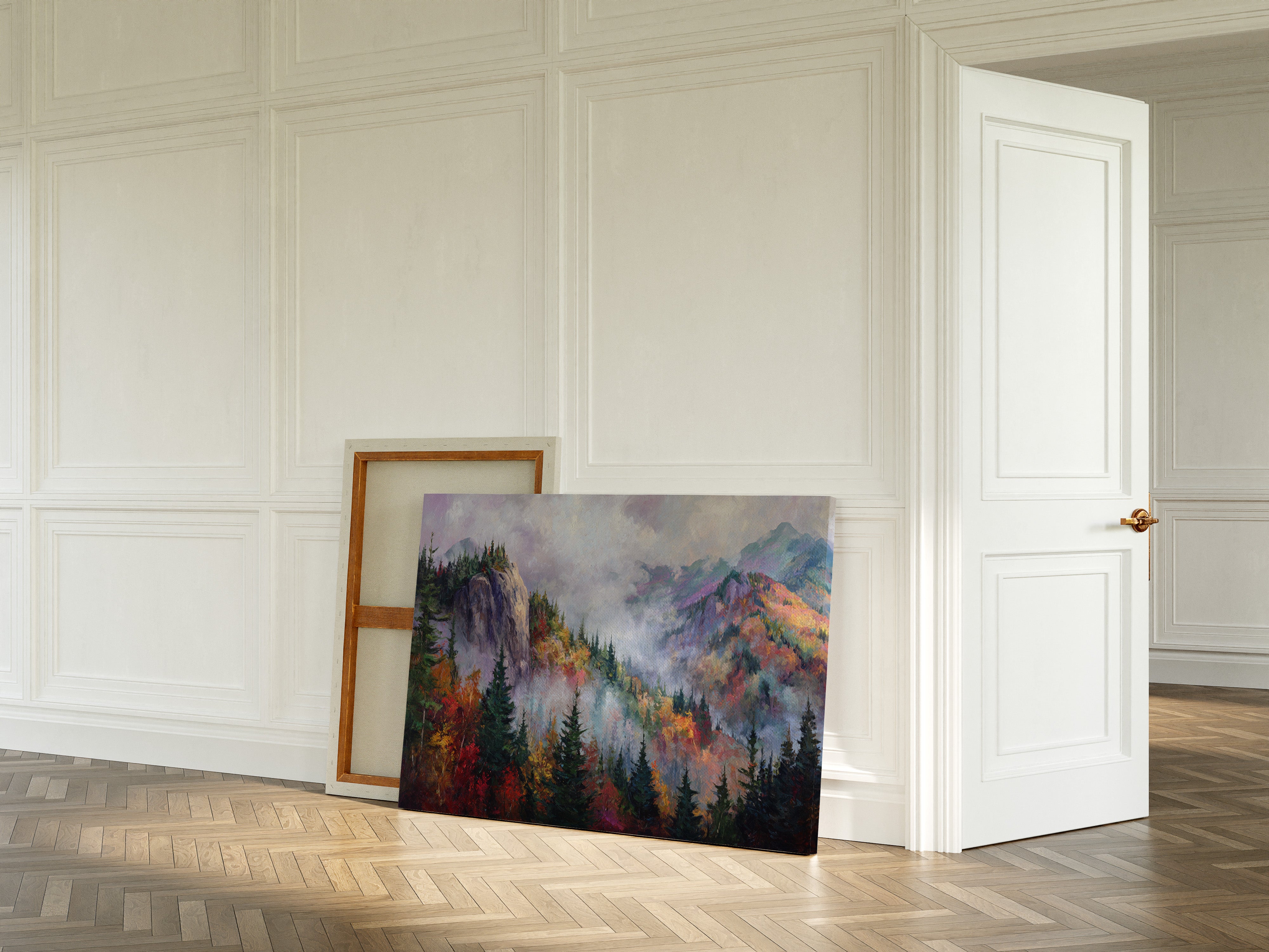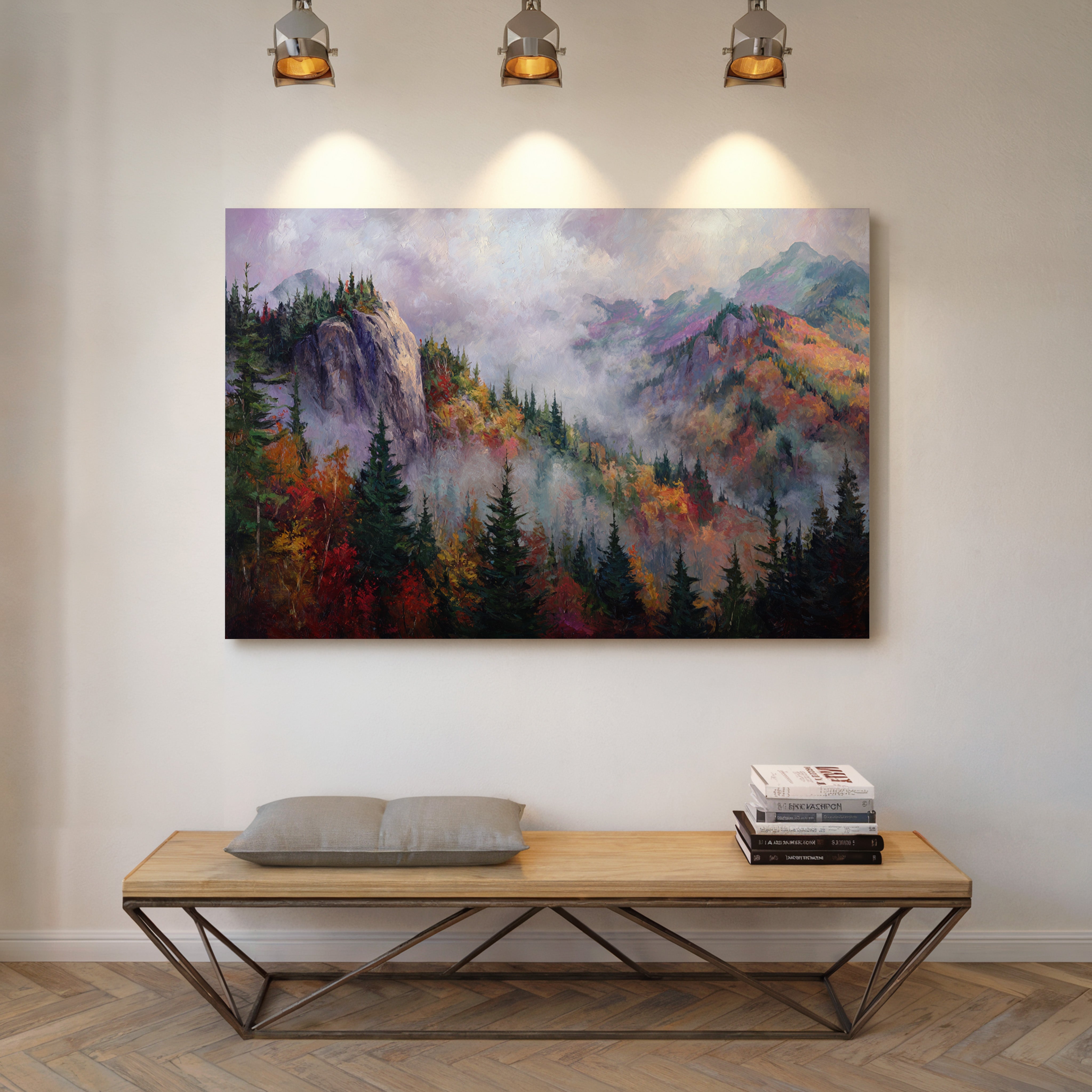 Morning fog dances between rugged cliffs, where autumn's palette bleeds across the mountainside. Evergreen sentinels stand proud among explosive bursts of crimson and gold, their needles catching the diffused light of dawn. The rocky outcrops rise like ancient guardians through the purple-tinged mist, while patches of fall foliage create a natural tapestry of warm colors against the cool mountain air. This piece brings the majesty of mountain wilderness into living spaces, perfect for creating a sense of escape in a home office or adding natural drama to a dining room.
