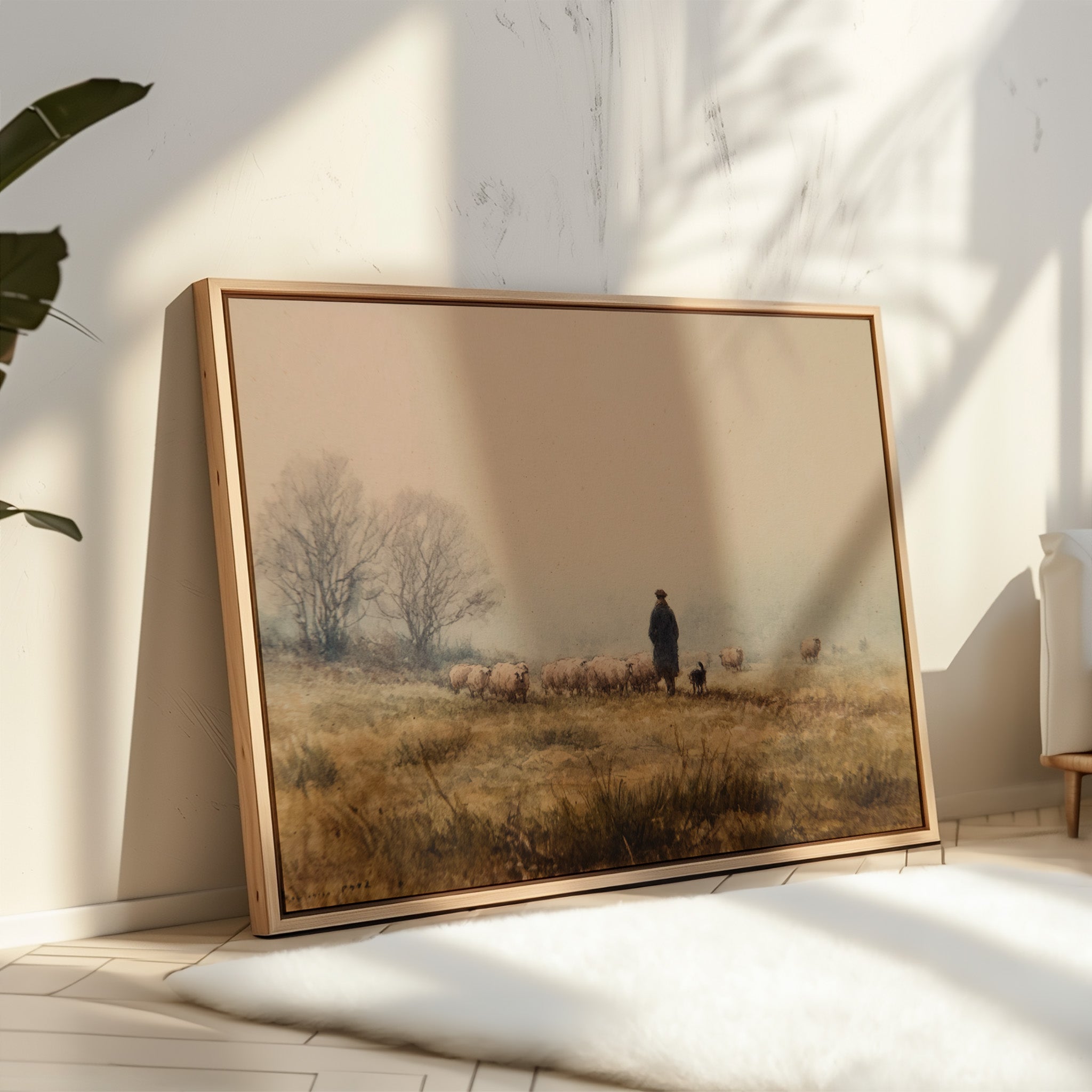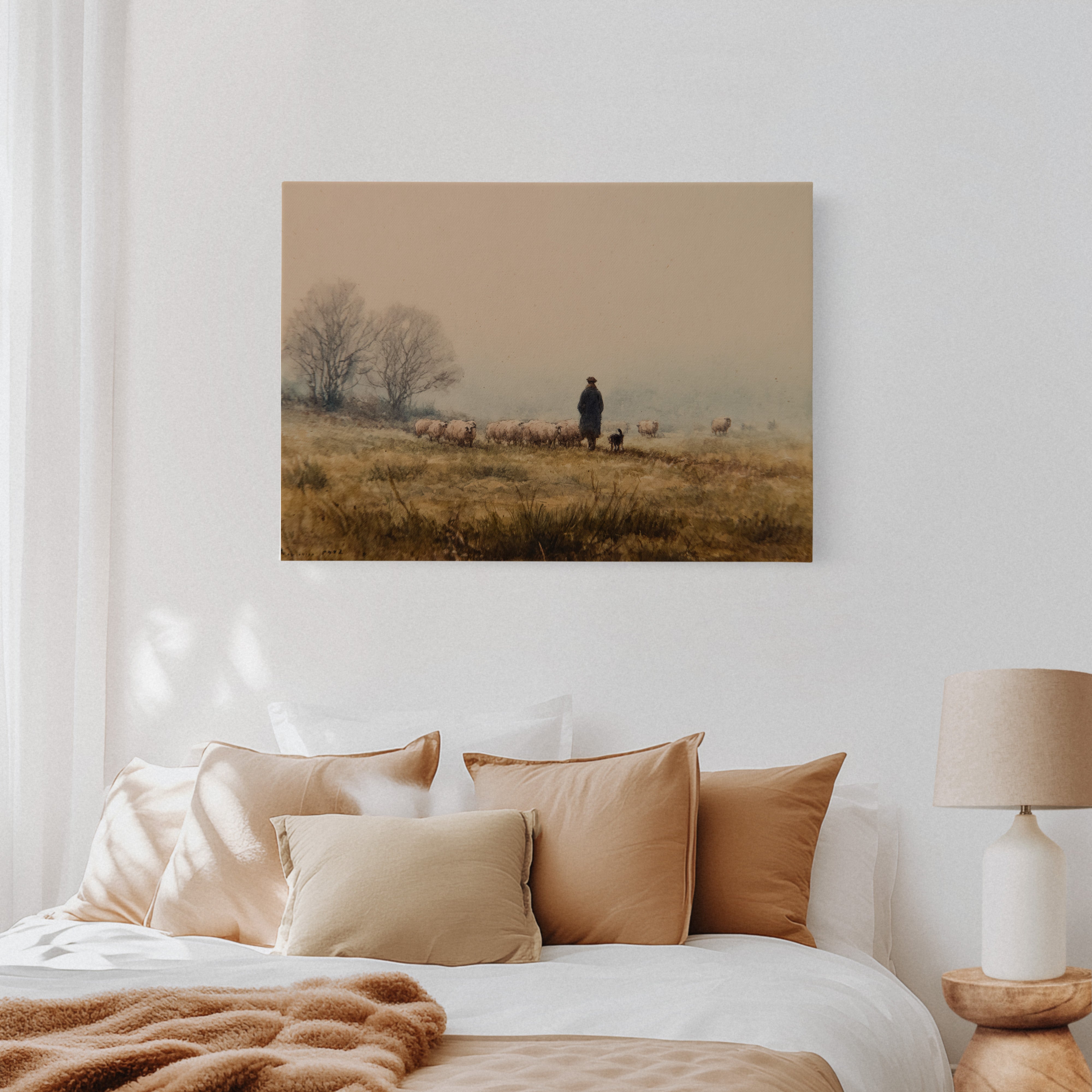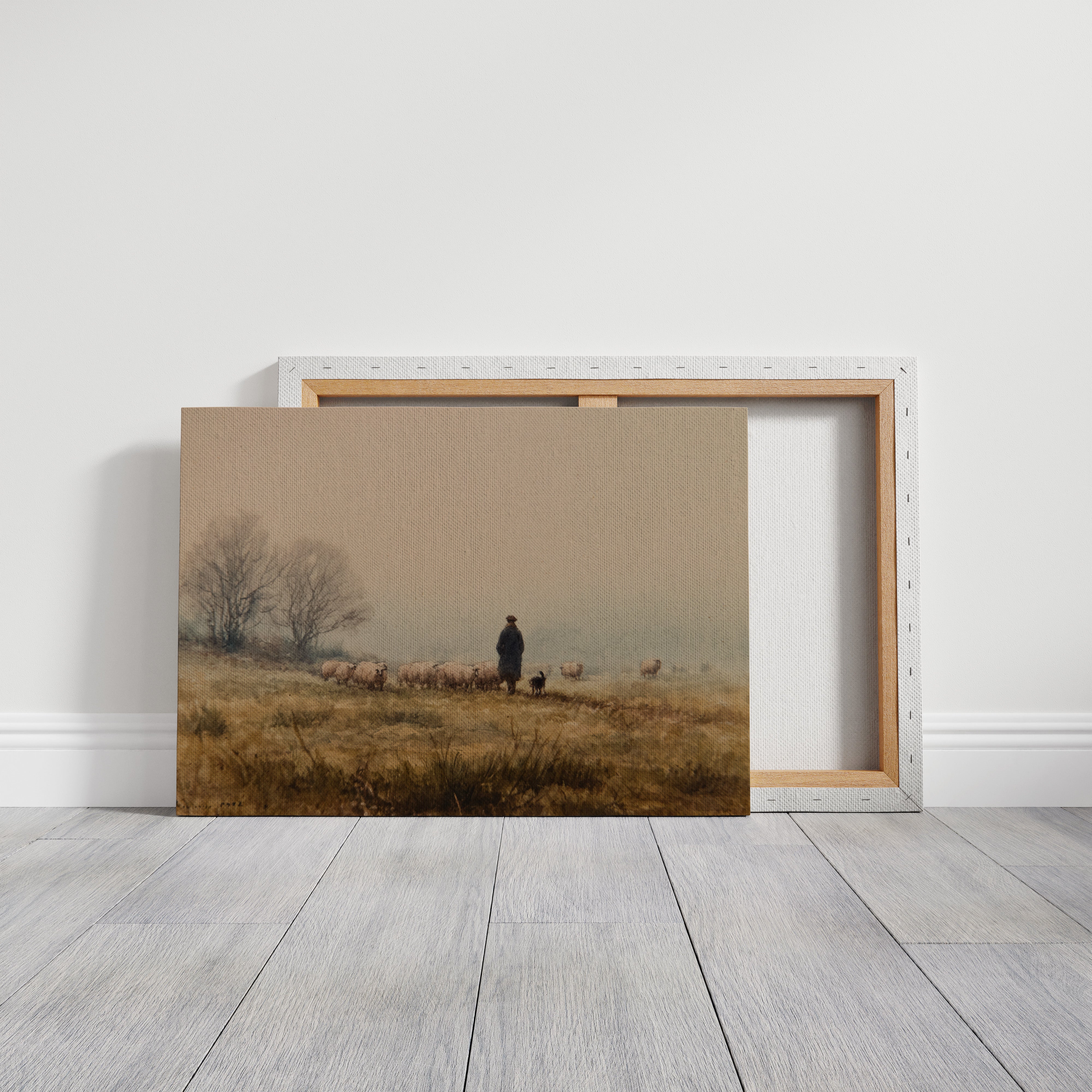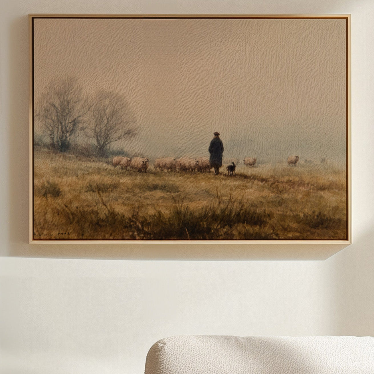 A solitary figure stands sentinel on misty highlands, their faithful sheepdog at their side as woolly charges graze the golden autumn grass. The scene captures a timeless moment of pastoral life, where bare trees sketch dark silhouettes against a fog-softened sky. Earth tones blend seamlessly from amber grasslands to dusky horizon, creating a masterful study in serenity and traditional countryside living. This piece would bring a touch of pastoral romance to a study or living room, especially in homes that celebrate heritage and rustic elegance.