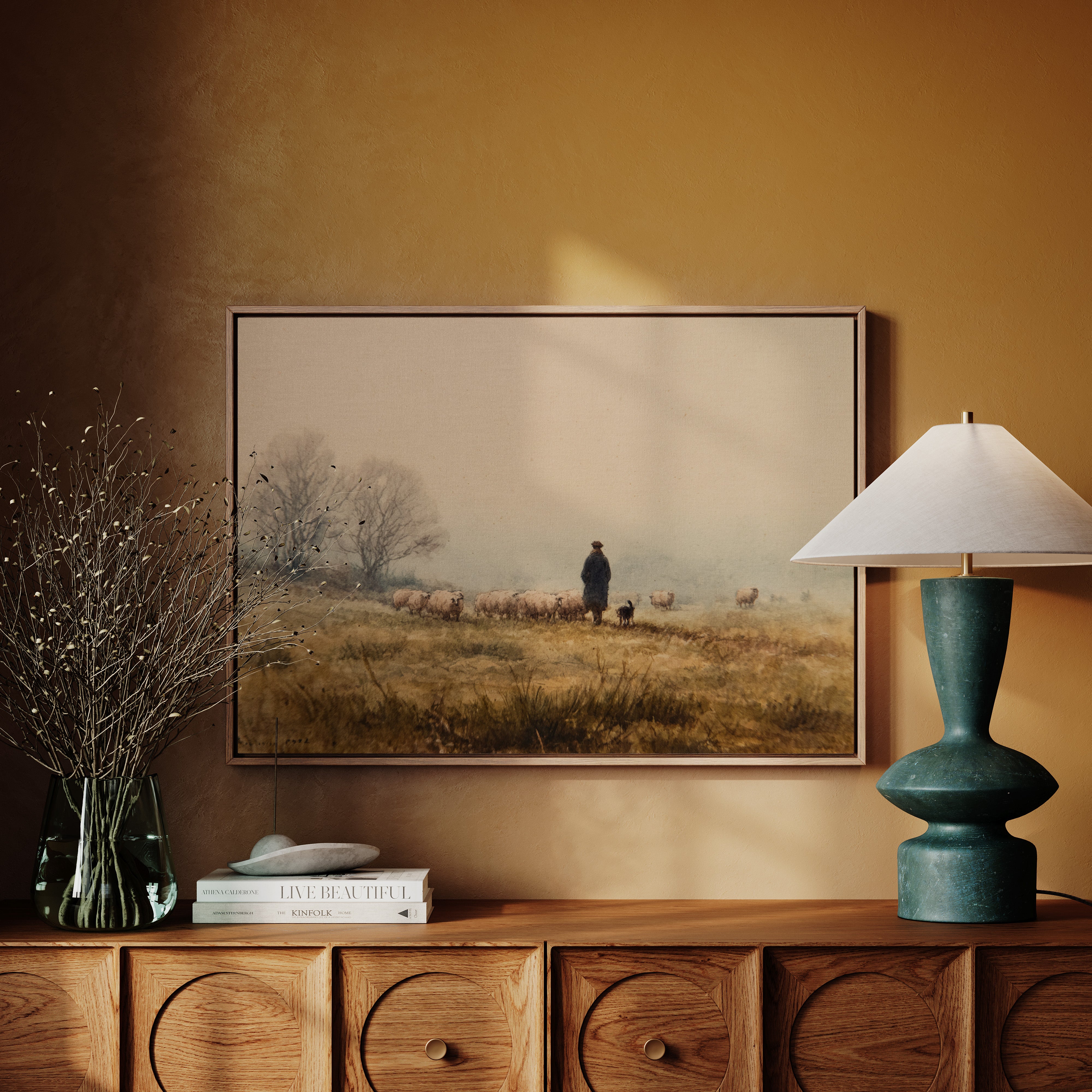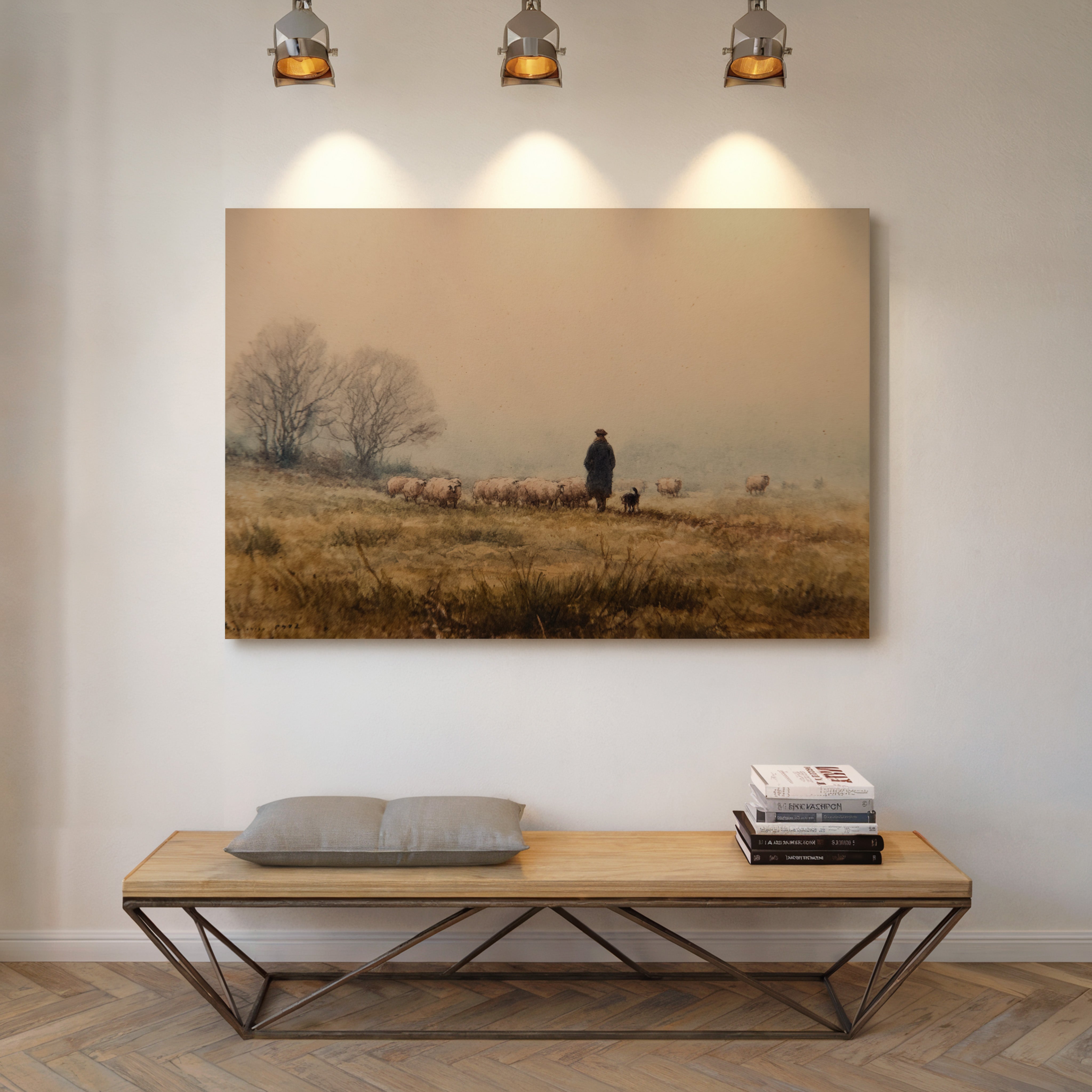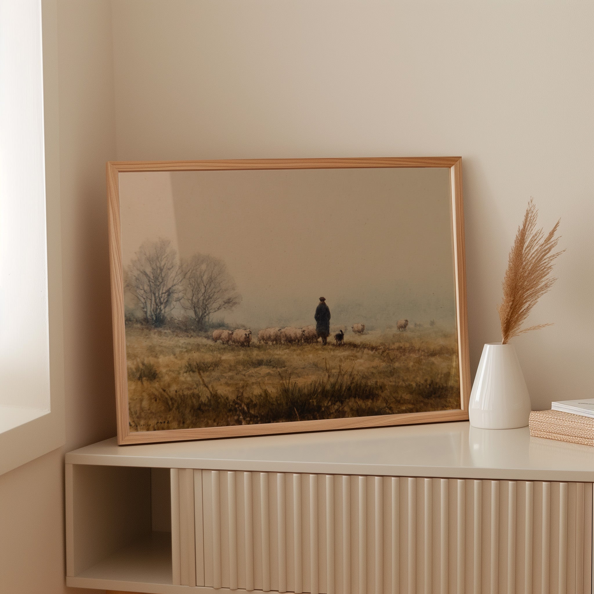 A solitary figure stands sentinel on misty highlands, their faithful sheepdog at their side as woolly charges graze the golden autumn grass. The scene captures a timeless moment of pastoral life, where bare trees sketch dark silhouettes against a fog-softened sky. Earth tones blend seamlessly from amber grasslands to dusky horizon, creating a masterful study in serenity and traditional countryside living. This piece would bring a touch of pastoral romance to a study or living room, especially in homes that celebrate heritage and rustic elegance.