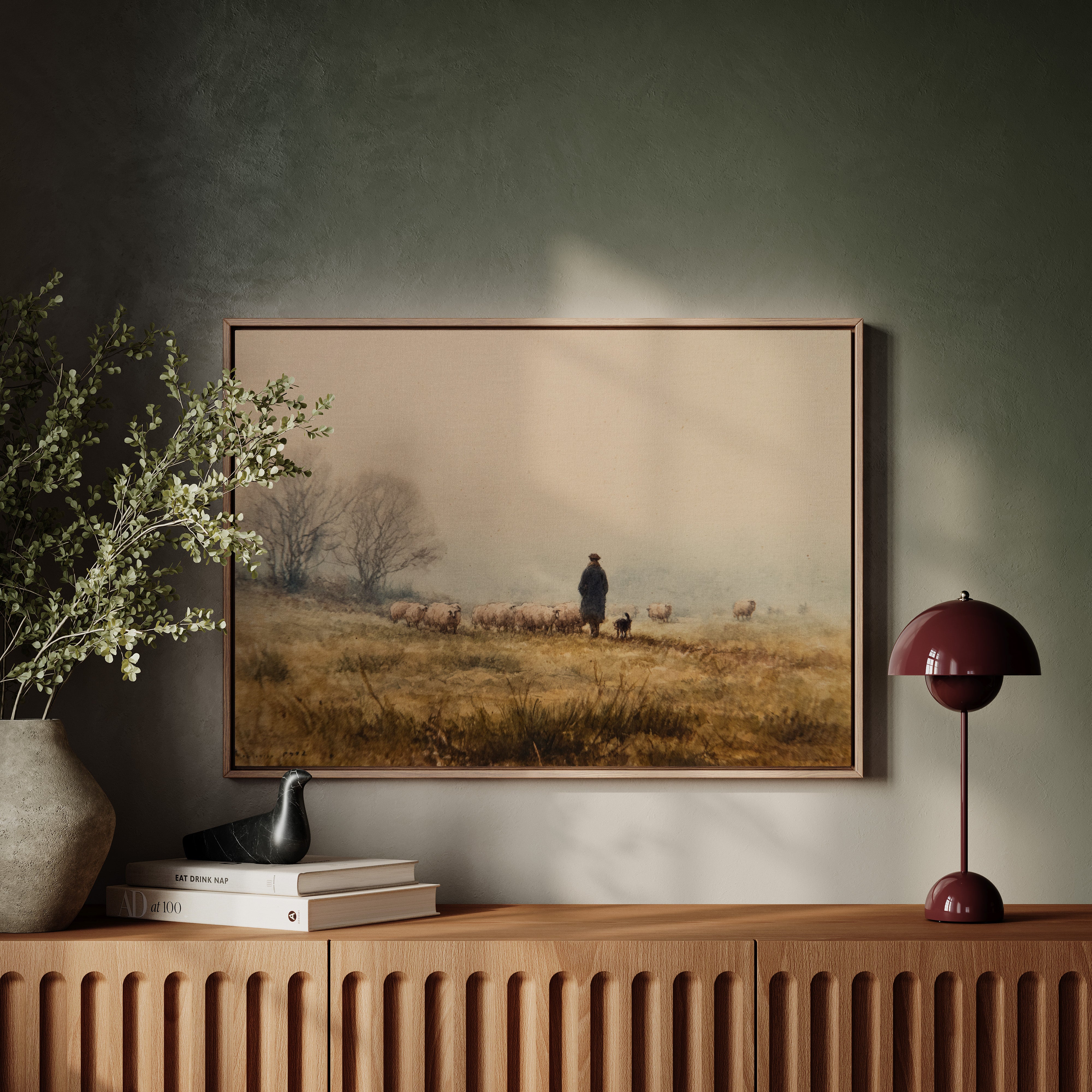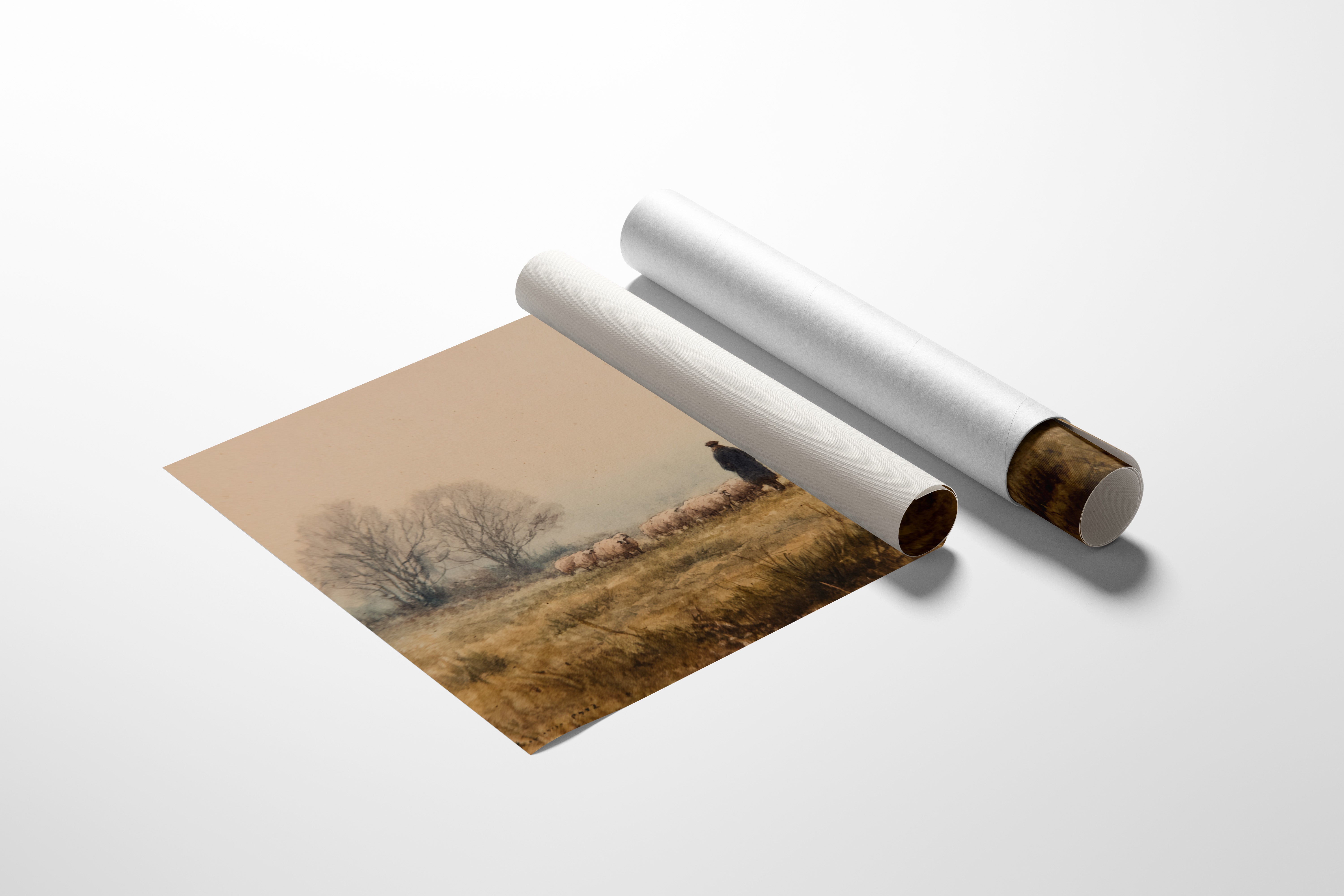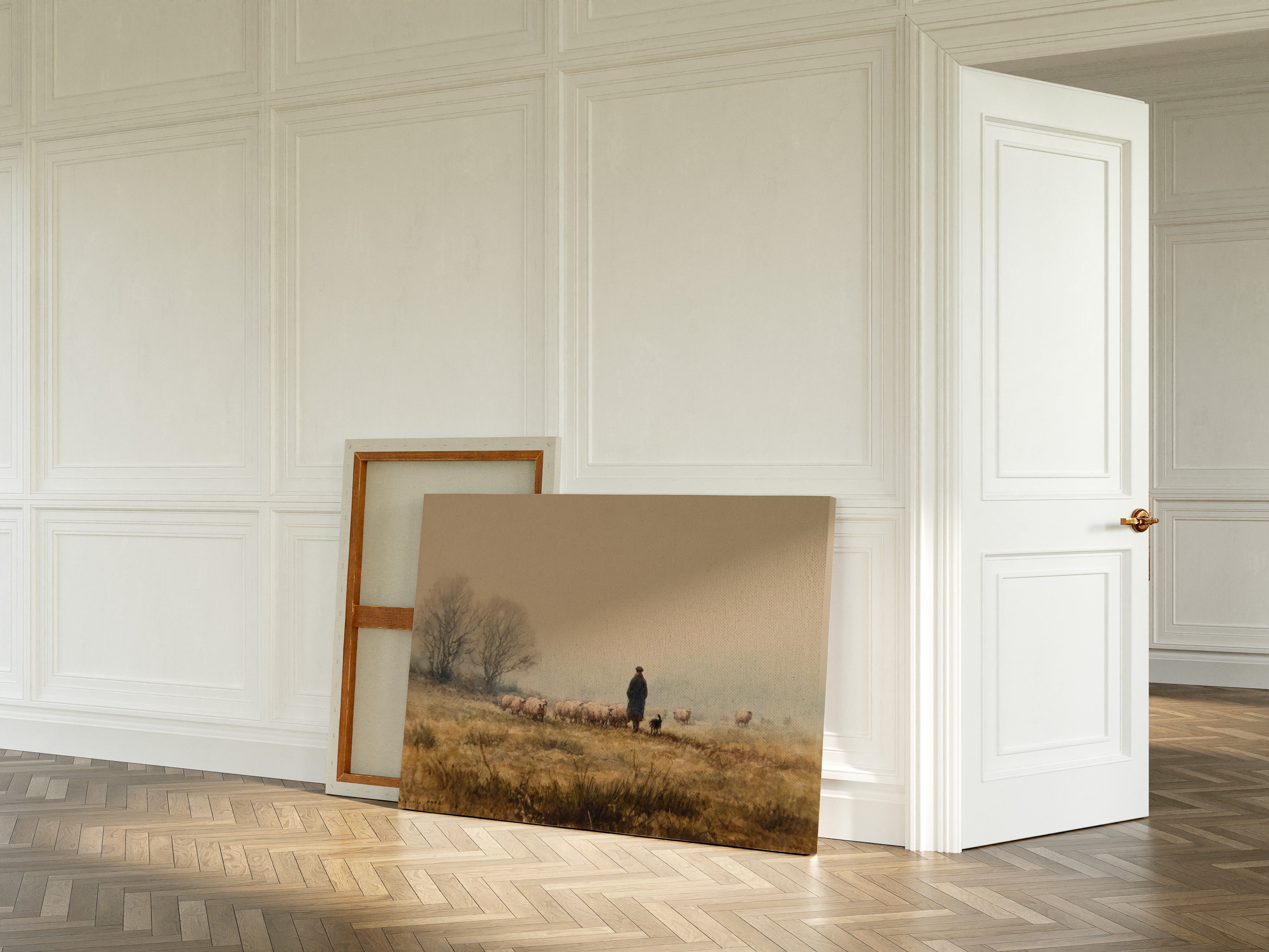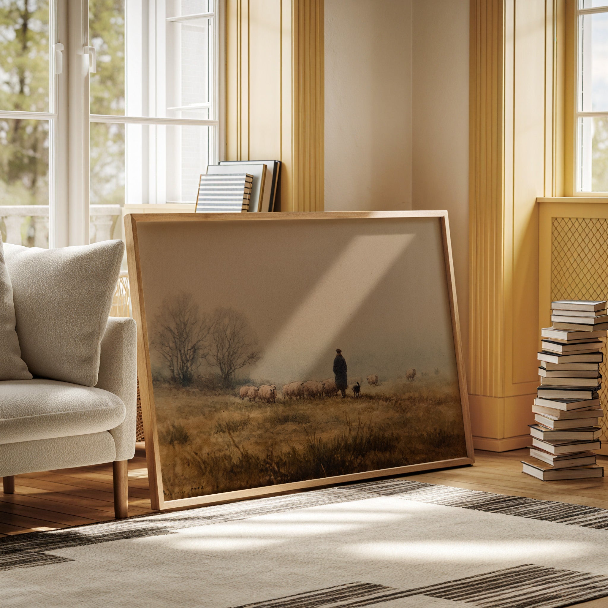 A solitary figure stands sentinel on misty highlands, their faithful sheepdog at their side as woolly charges graze the golden autumn grass. The scene captures a timeless moment of pastoral life, where bare trees sketch dark silhouettes against a fog-softened sky. Earth tones blend seamlessly from amber grasslands to dusky horizon, creating a masterful study in serenity and traditional countryside living. This piece would bring a touch of pastoral romance to a study or living room, especially in homes that celebrate heritage and rustic elegance.