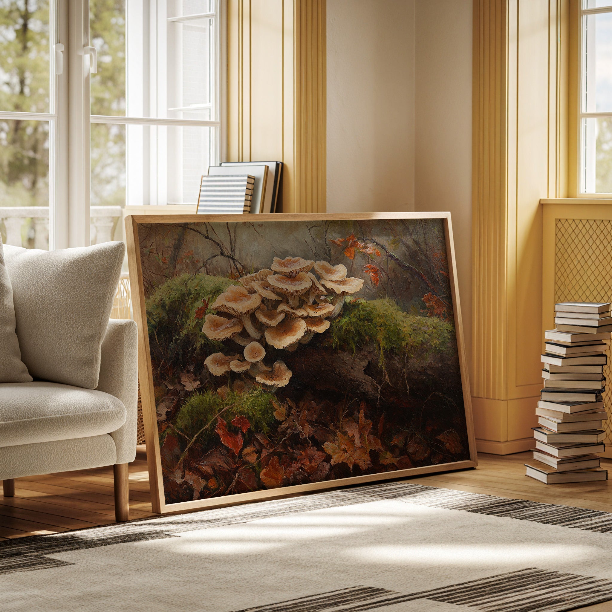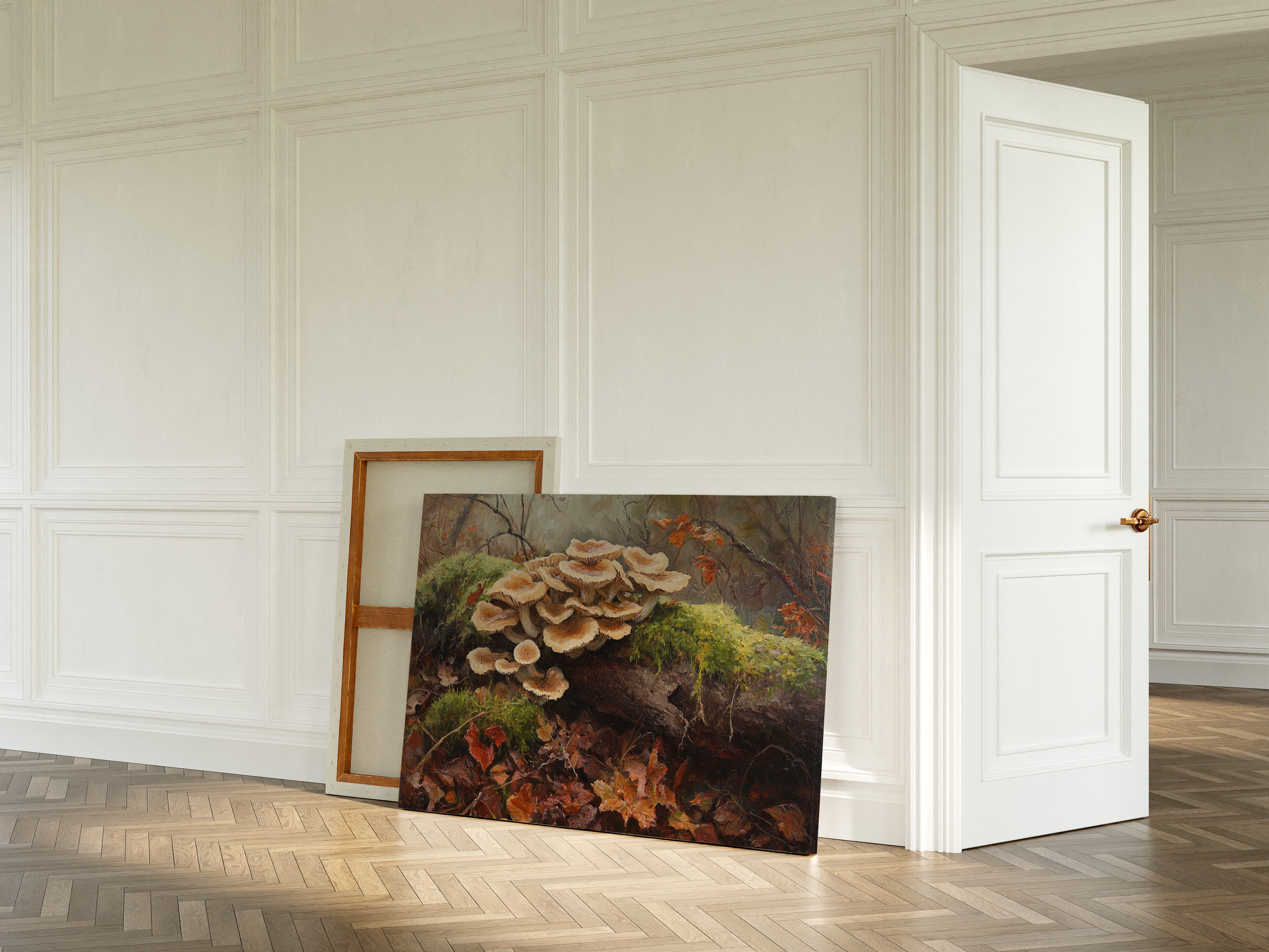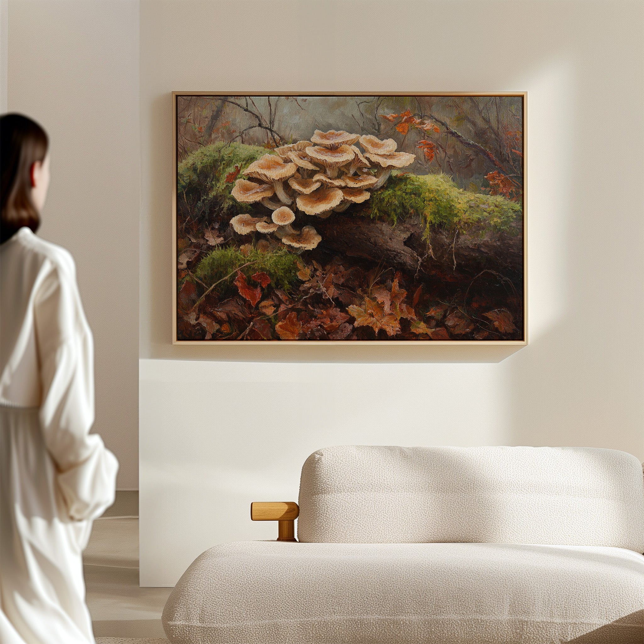 In the quiet corners of a forest floor, cream-colored mushrooms unfurl their delicate caps like ballet dancers taking center stage. Rich earth tones blend seamlessly as moss-covered logs cradle these ethereal fungi, while scattered maple leaves in burning orange and russet create nature's confetti below. The interplay of light and shadow highlights the intricate gills and velvety textures of each mushroom, while dewdrops catch the filtered forest light. This piece would bring an enchanting touch of woodland magic to a reading nook or create a contemplative focal point in a natural-themed dining space.