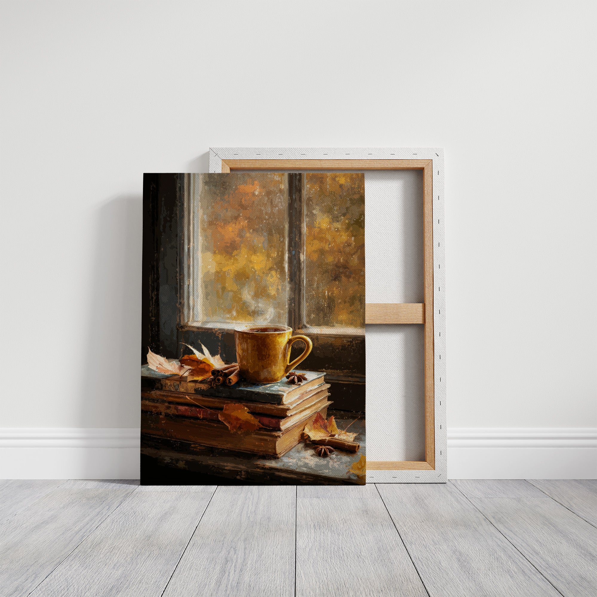 Golden light filters through a weathered window, casting a honey glow across a moment suspended in time. A ceramic mug rests atop worn books, surrounded by scattered autumn leaves and cinnamon sticks, telling stories of slow mornings and contemplative afternoons. The rich amber and russet tones create a tapestry of warmth against the cool window glass, inviting viewers into this intimate corner of literary refuge. This piece brings nostalgic comfort to reading nooks, home libraries, or any space where you seek to create a sanctuary for thoughtful moments.