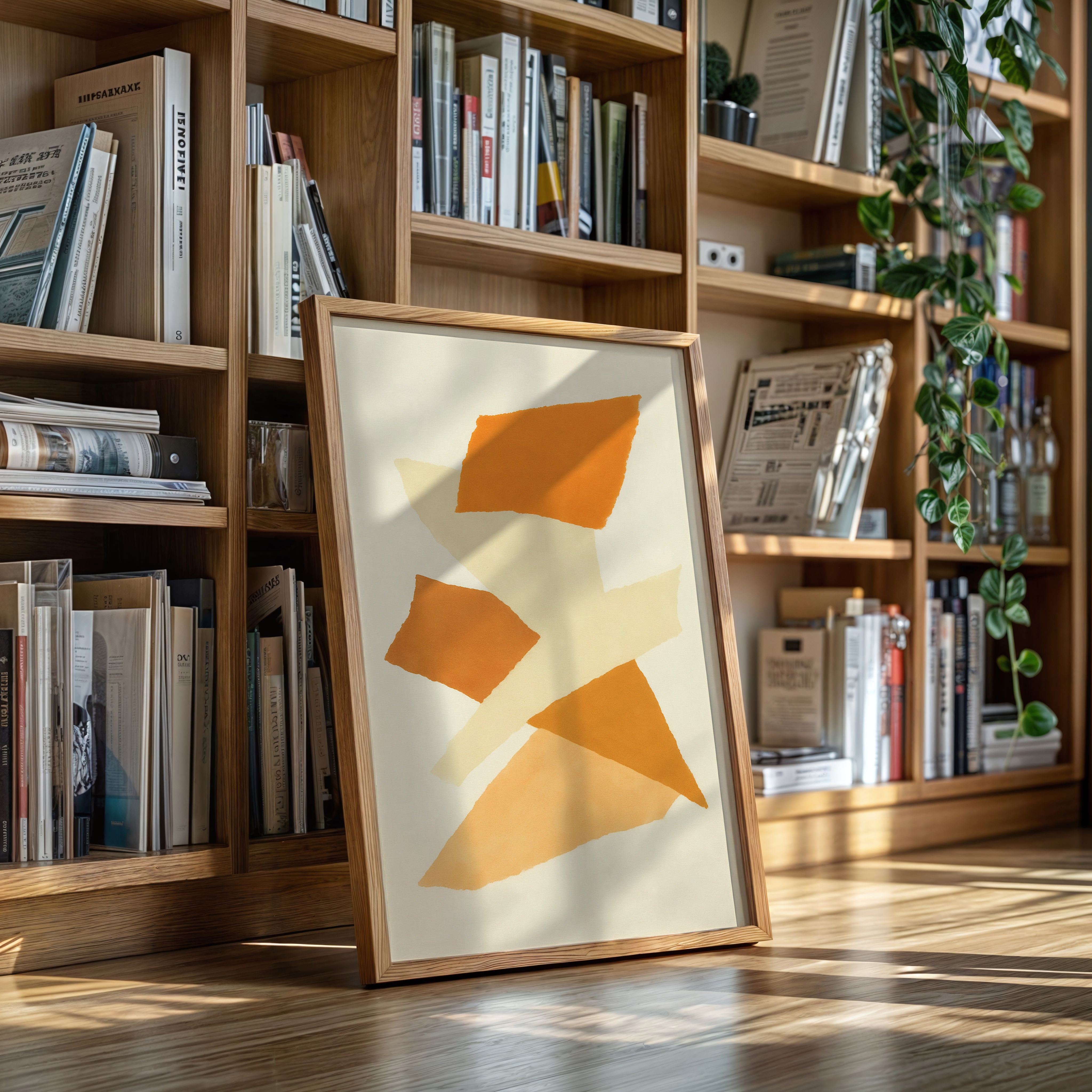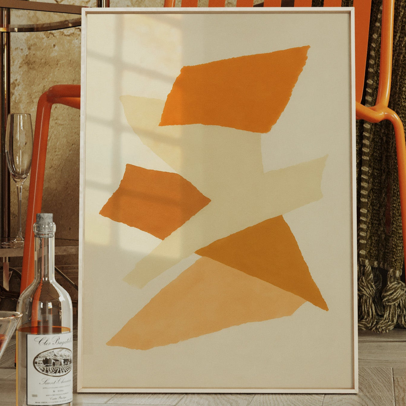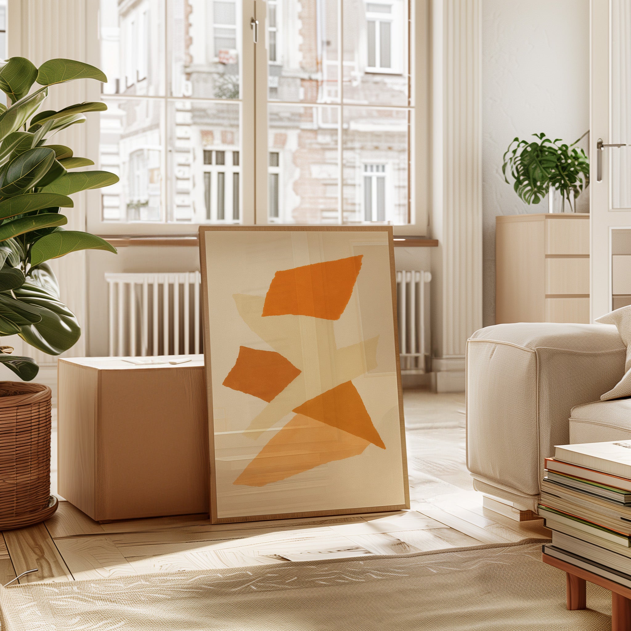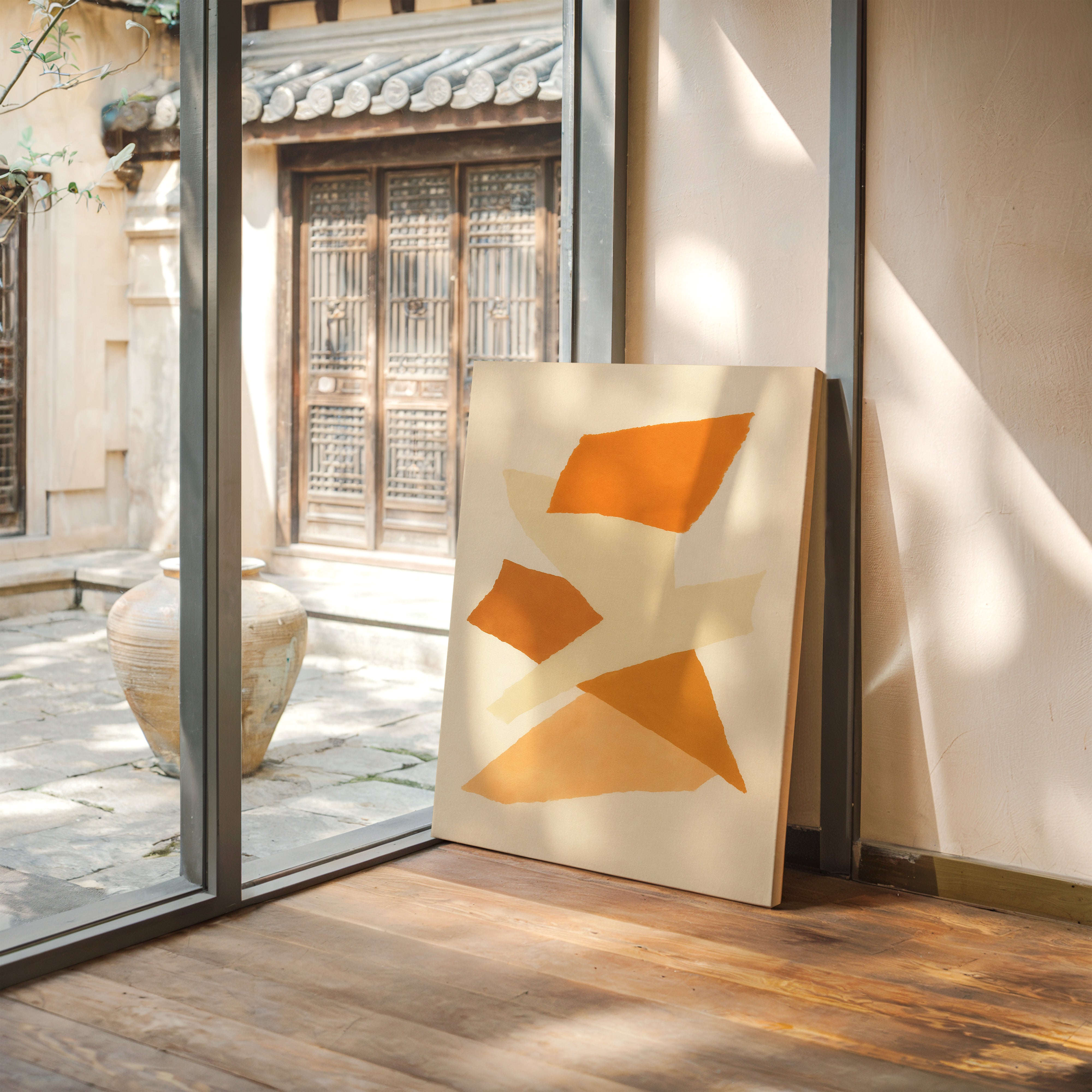 Warm terracotta shapes dance across a cream canvas, their edges soft yet decisive like paper caught in a gentle breeze. The composition speaks of balance and movement, with angular forms creating a harmonious dialogue between light and shadow. Rich orange tones contrast with delicate ivory, suggesting the warmth of fall sunshine filtering through abstract planes. This piece brings a sense of contemplative serenity while maintaining dynamic energy through its geometric arrangement.