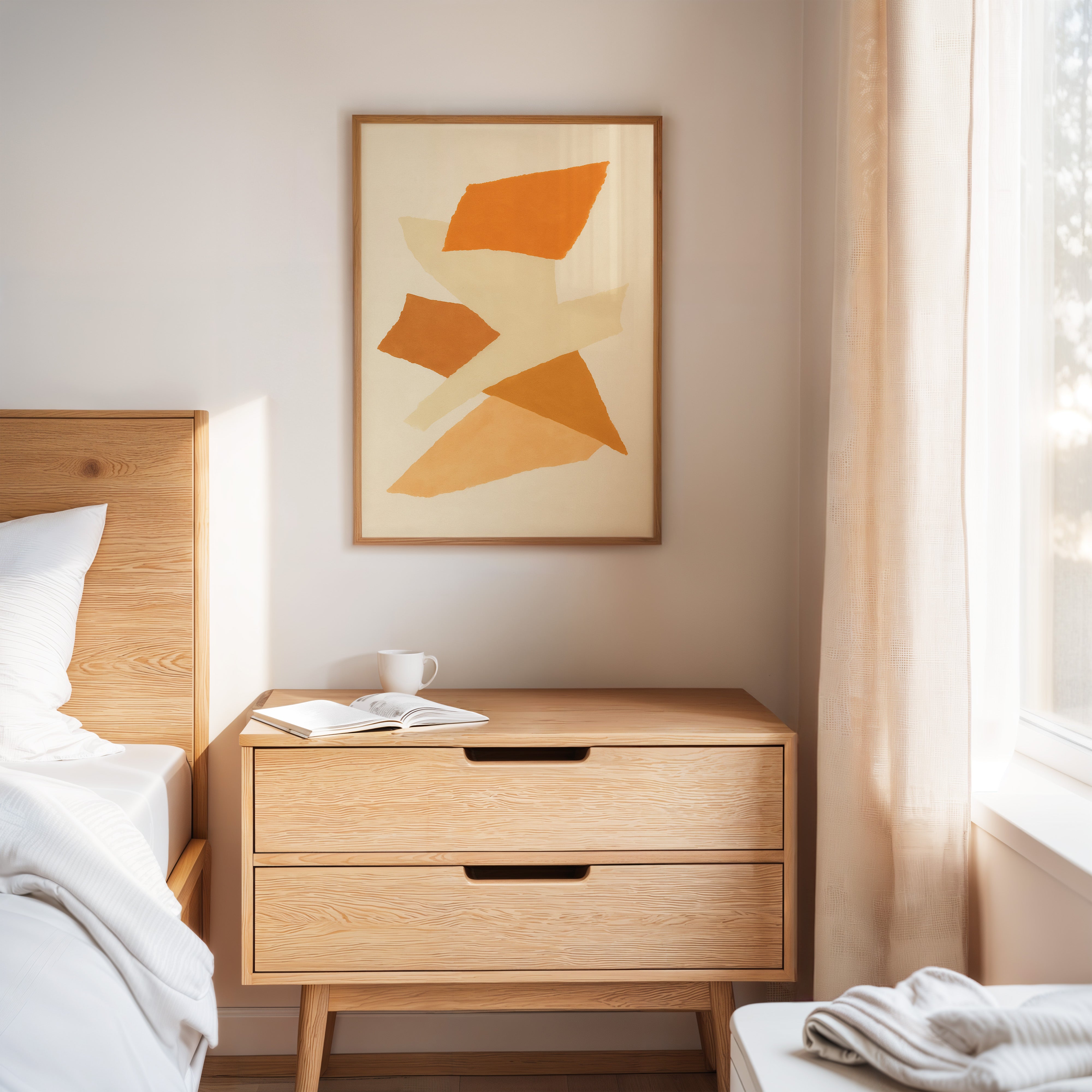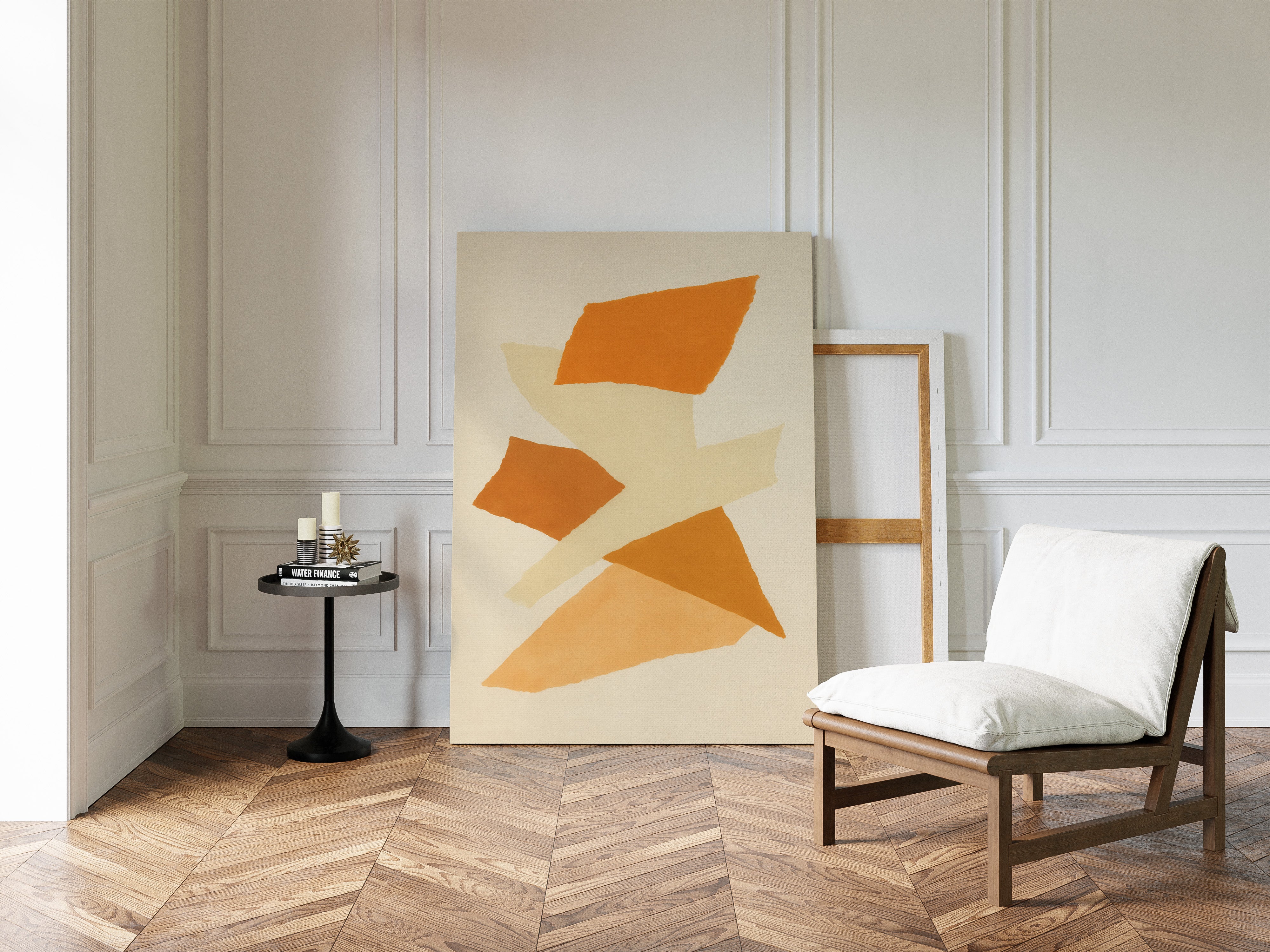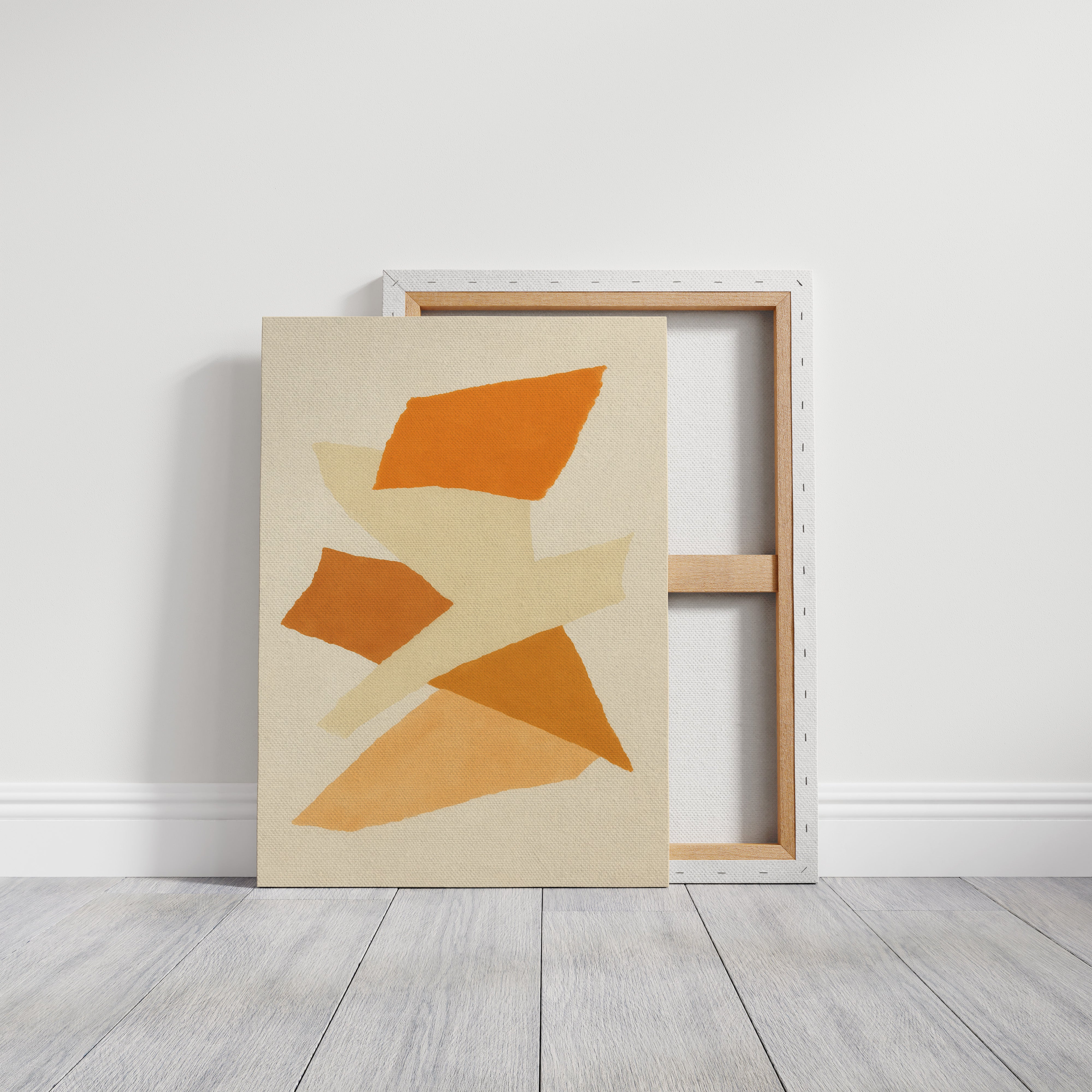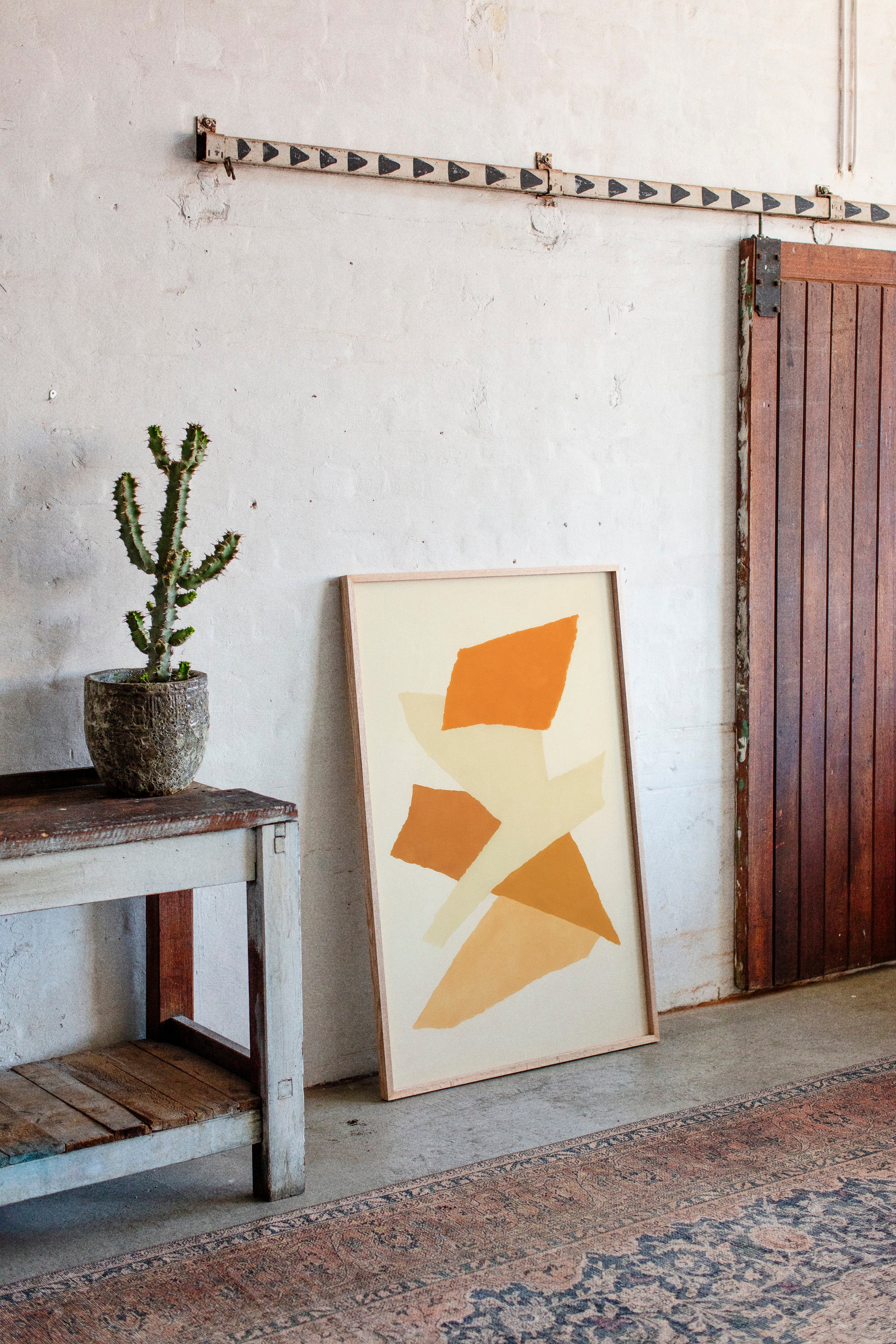 Warm terracotta shapes dance across a cream canvas, their edges soft yet decisive like paper caught in a gentle breeze. The composition speaks of balance and movement, with angular forms creating a harmonious dialogue between light and shadow. Rich orange tones contrast with delicate ivory, suggesting the warmth of fall sunshine filtering through abstract planes. This piece brings a sense of contemplative serenity while maintaining dynamic energy through its geometric arrangement.