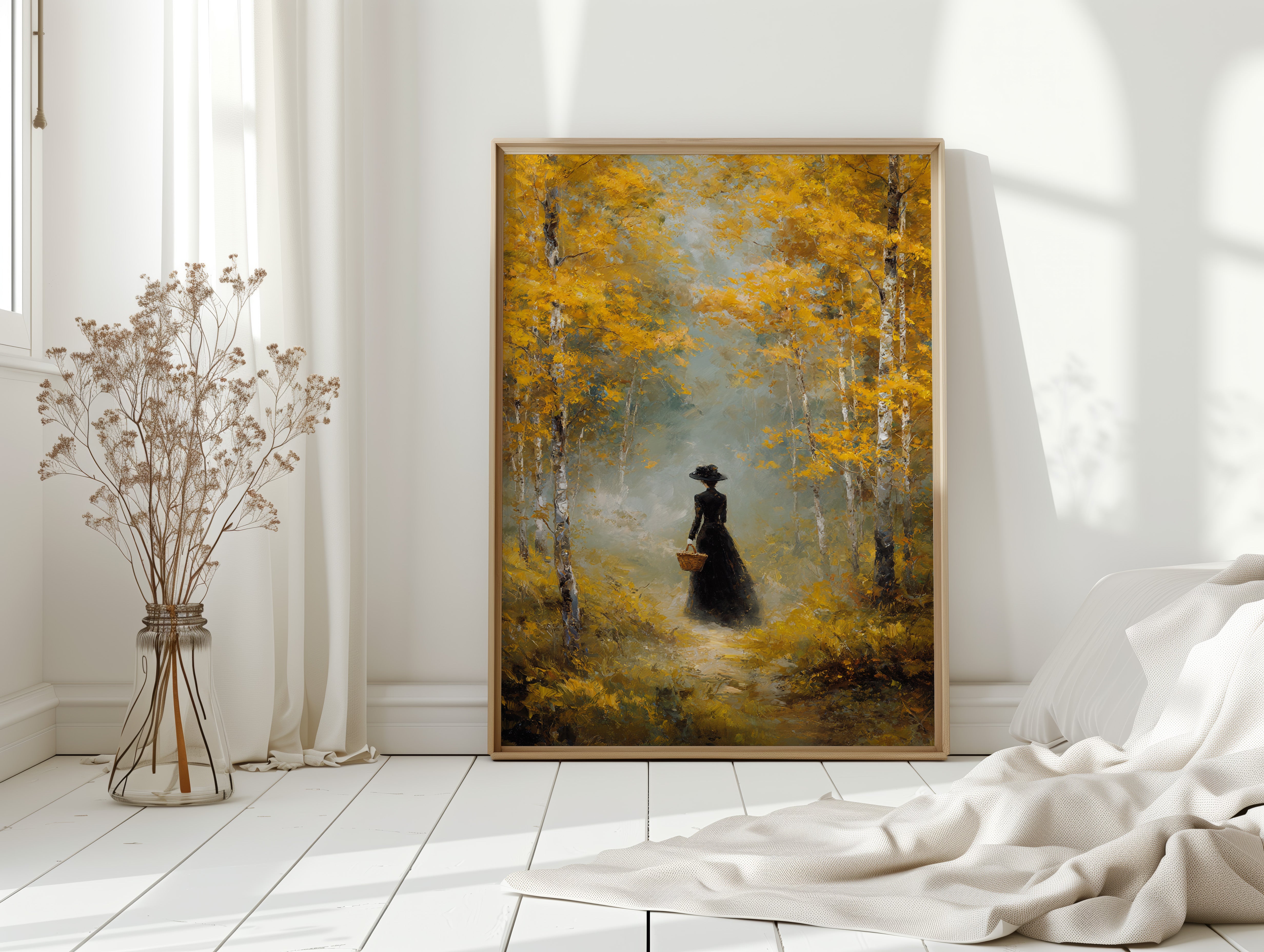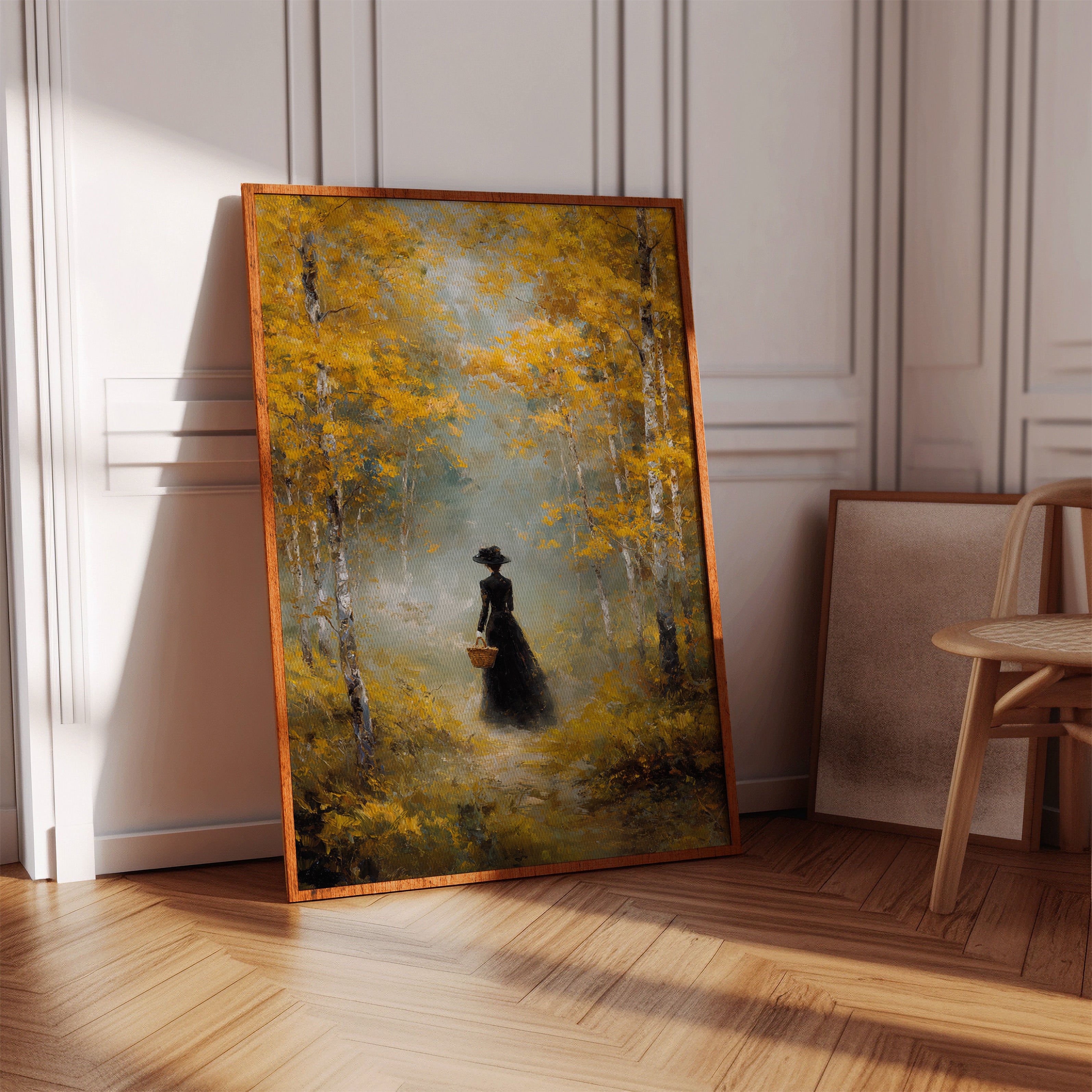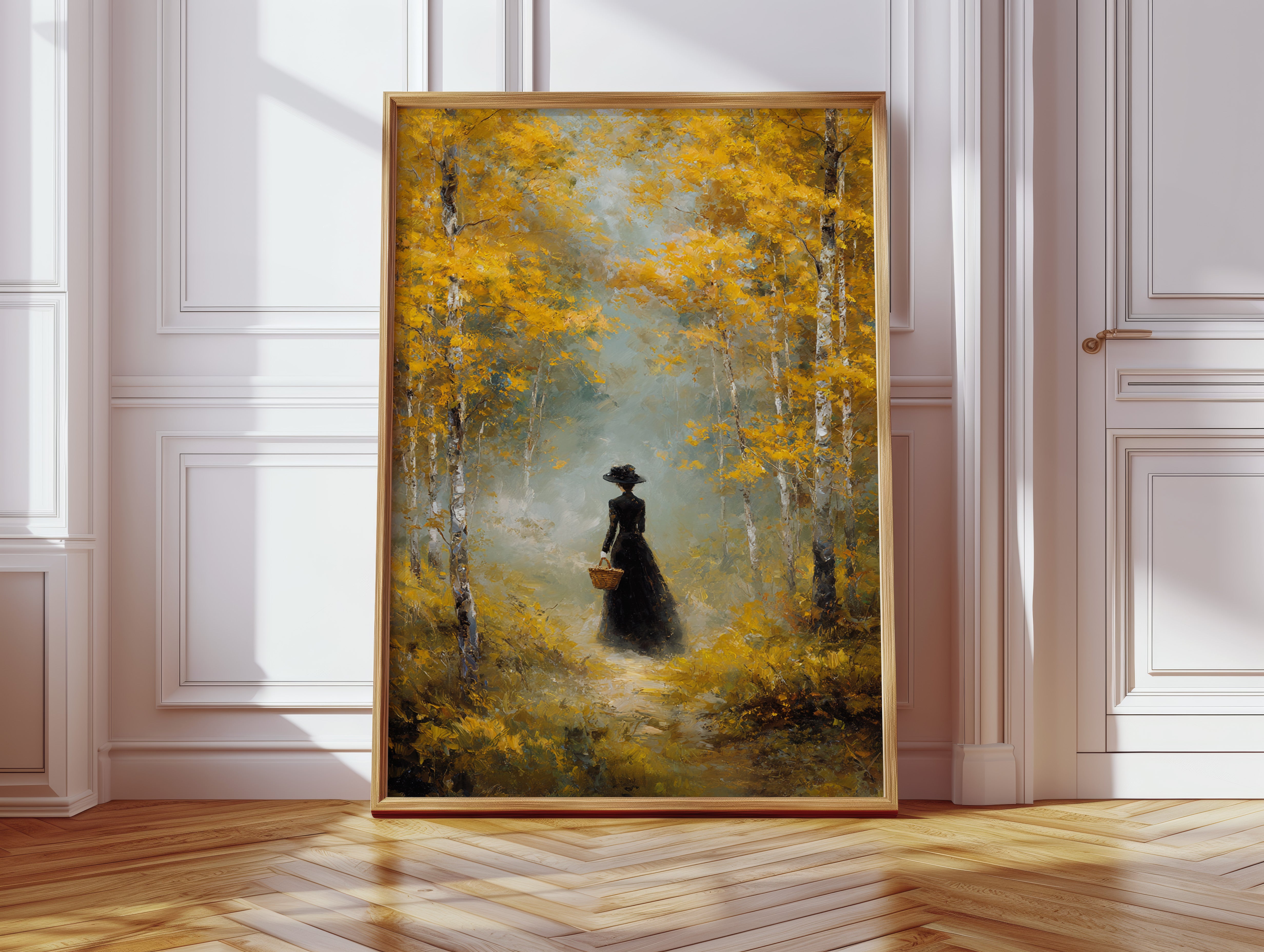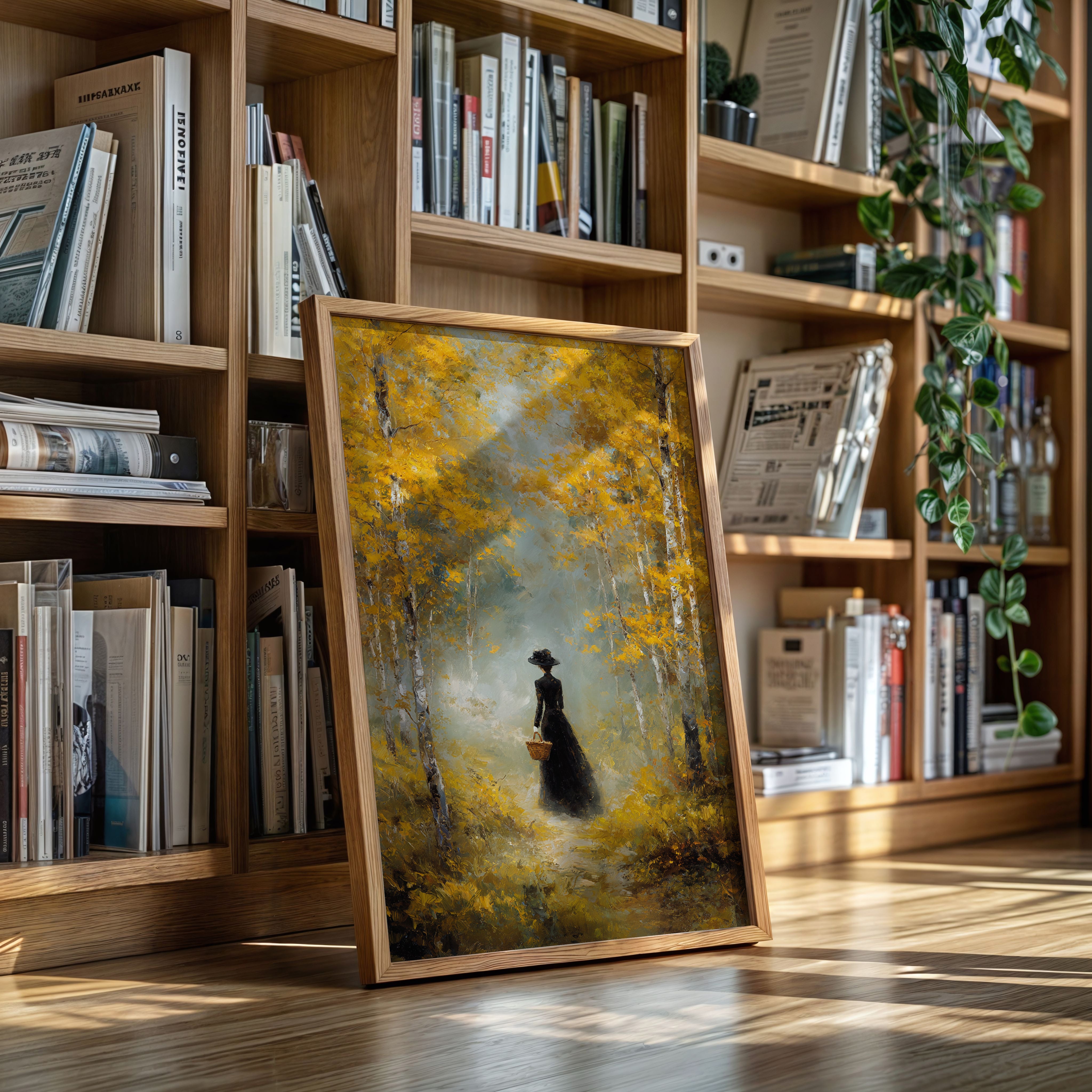 Golden light filters through a canopy of birch trees, casting ethereal rays upon a winding forest path. A solitary figure in an elegant black dress moves through the scene, her presence both mysterious and purposeful against the brilliant autumn foliage. The painting captures a moment of quiet contemplation, where white birch trunks stand like sentinels against a backdrop of ochre leaves and misty atmosphere. This atmospheric piece speaks to solitude and self-discovery, rendered in rich oils that bring warmth and depth to every brushstroke. Perfect for creating a focal point in a formal dining room or adding classical elegance to a reading nook.