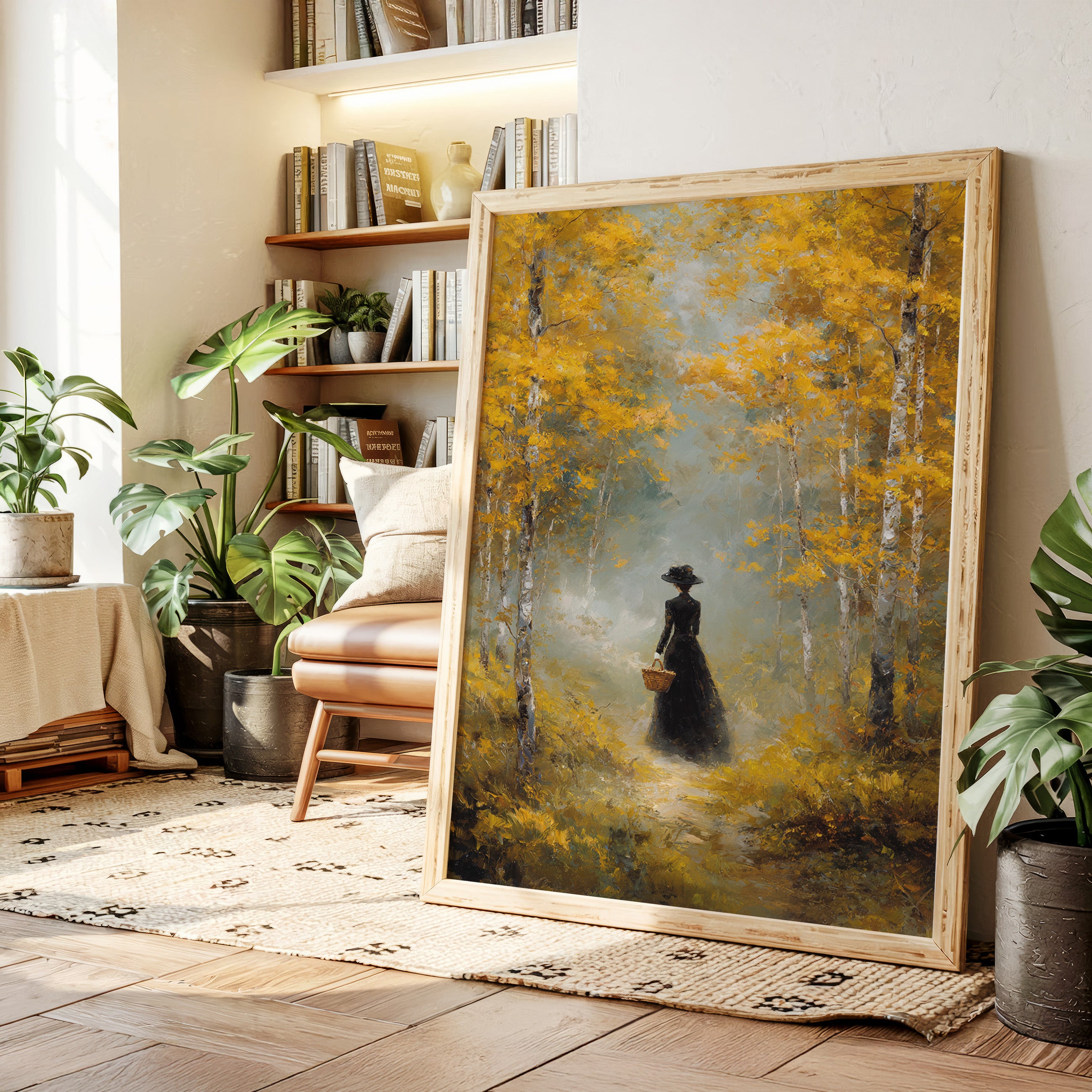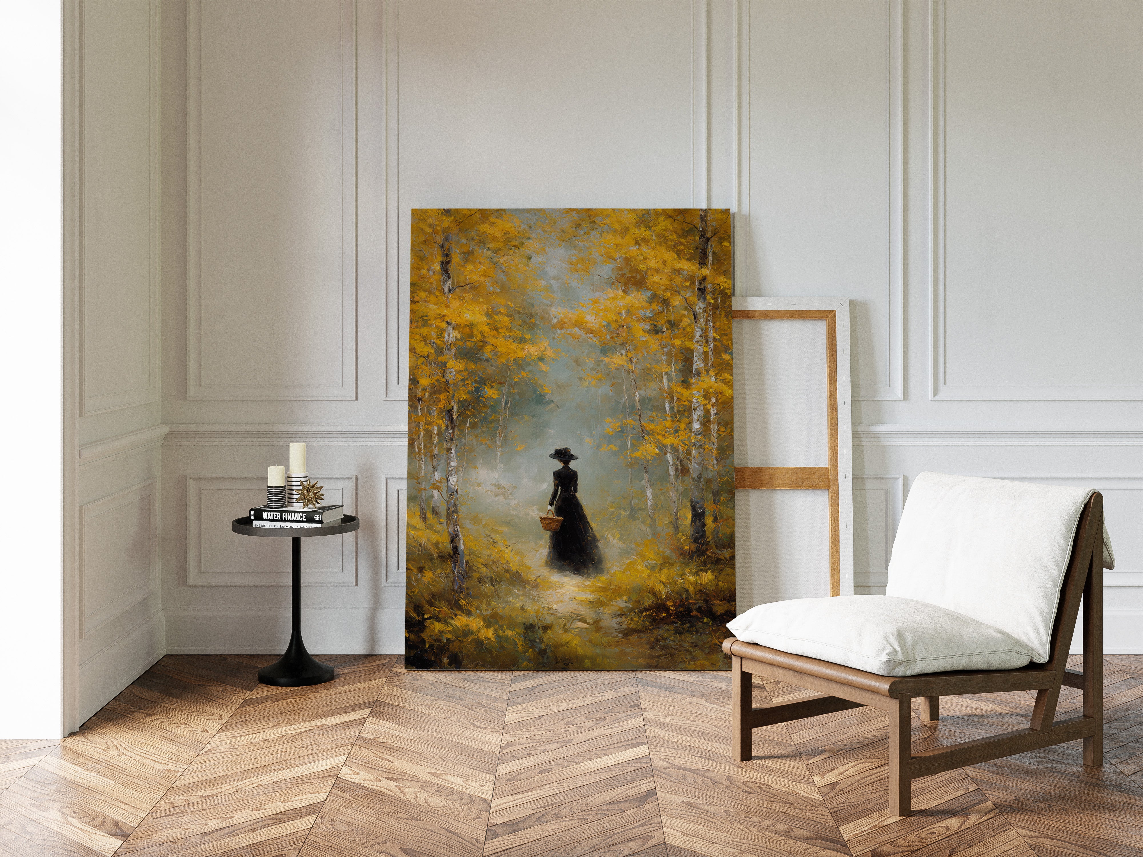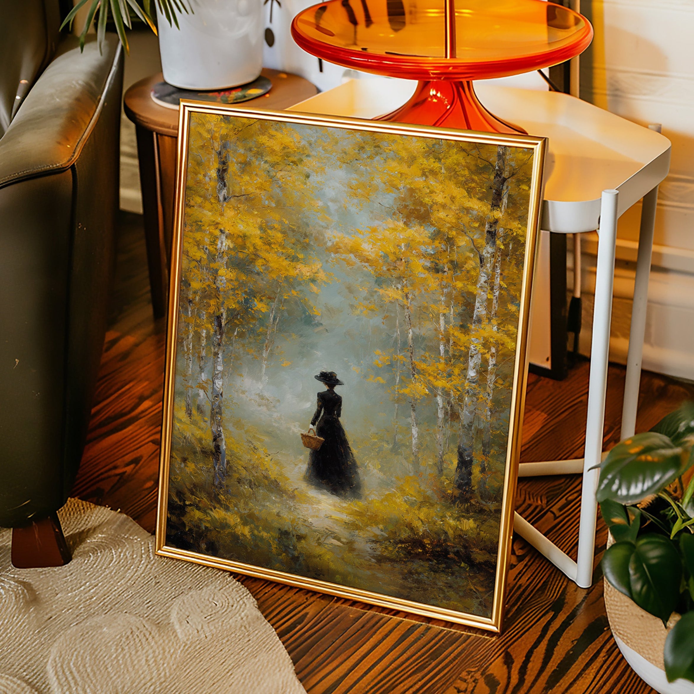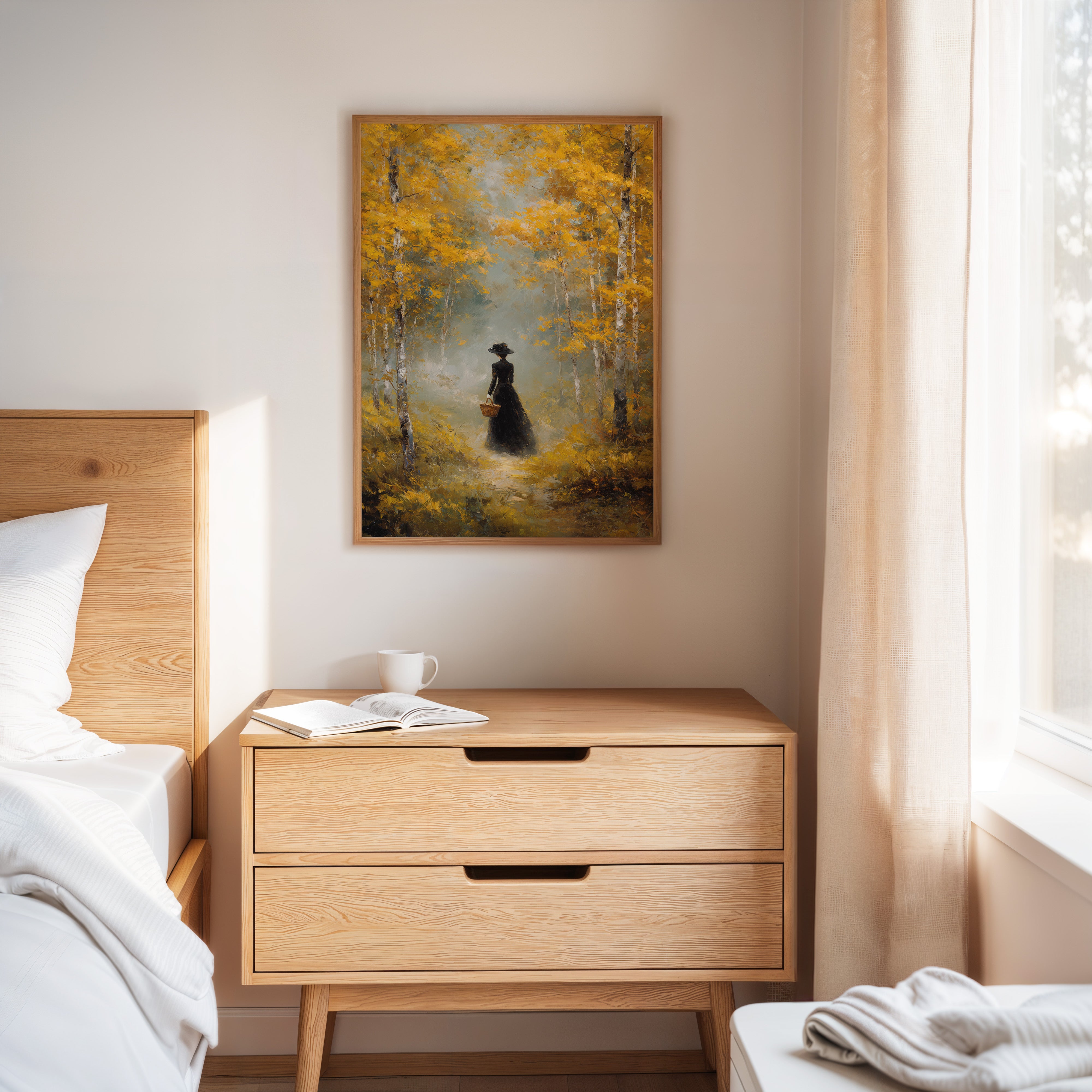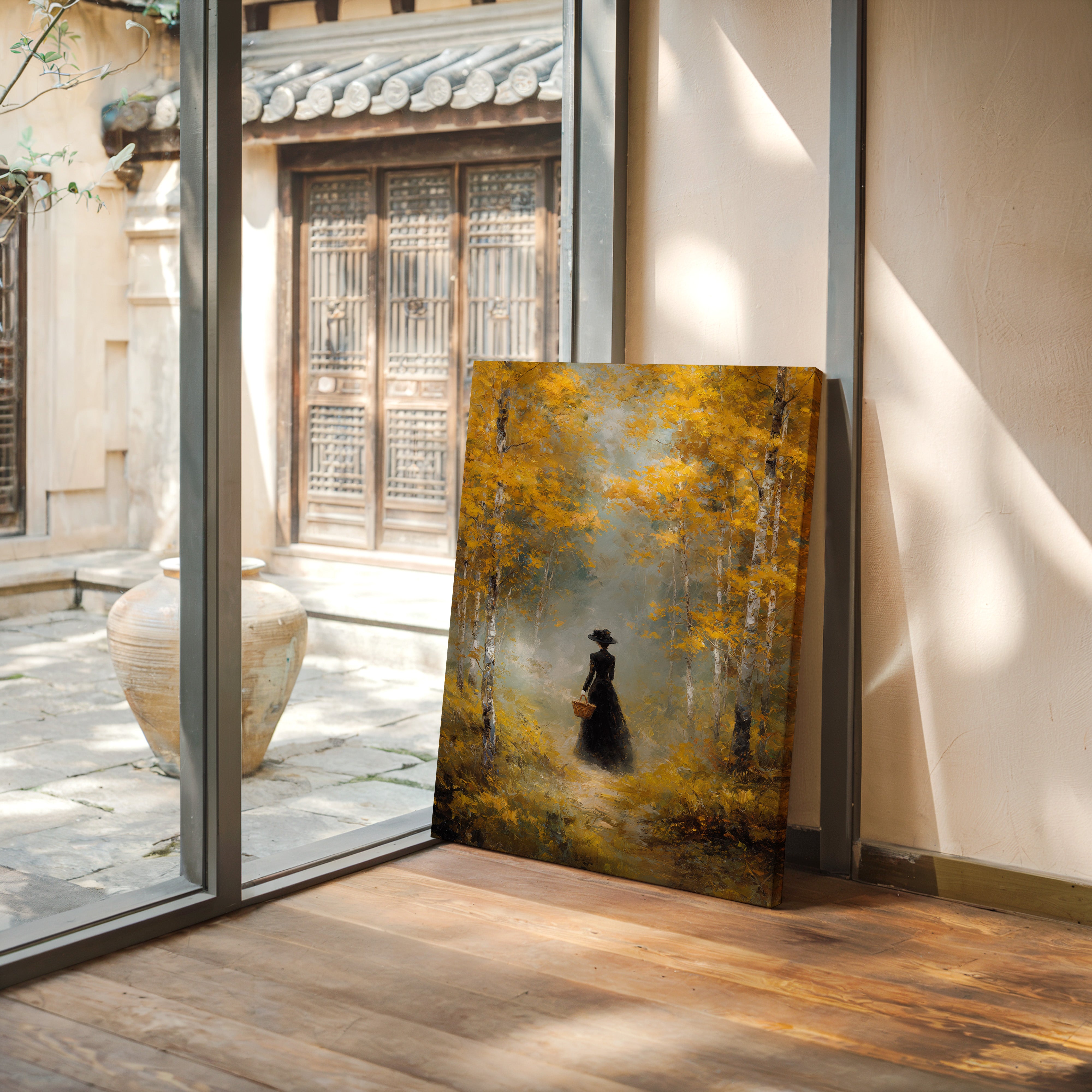 Golden light filters through a canopy of birch trees, casting ethereal rays upon a winding forest path. A solitary figure in an elegant black dress moves through the scene, her presence both mysterious and purposeful against the brilliant autumn foliage. The painting captures a moment of quiet contemplation, where white birch trunks stand like sentinels against a backdrop of ochre leaves and misty atmosphere. This atmospheric piece speaks to solitude and self-discovery, rendered in rich oils that bring warmth and depth to every brushstroke. Perfect for creating a focal point in a formal dining room or adding classical elegance to a reading nook.