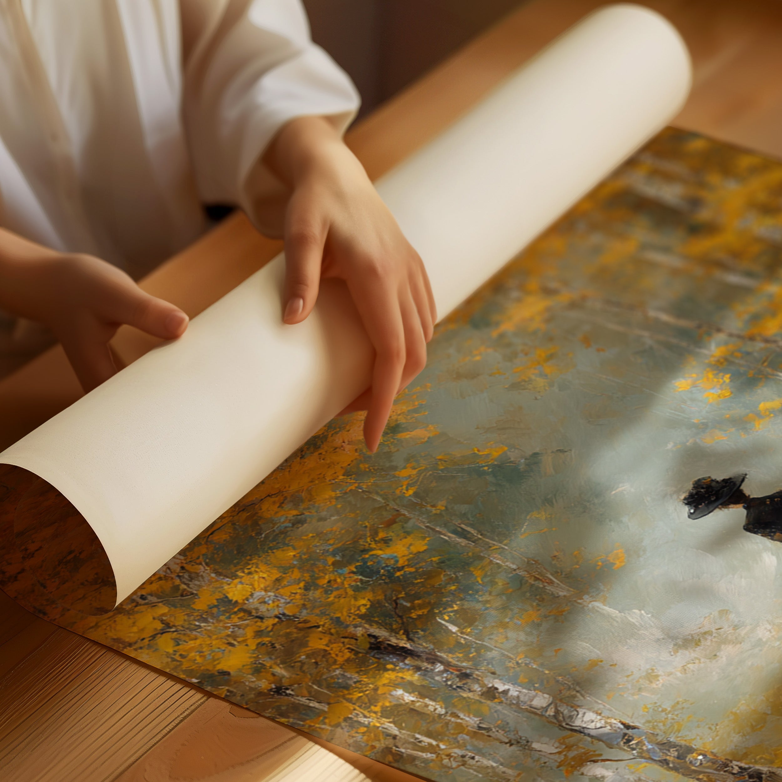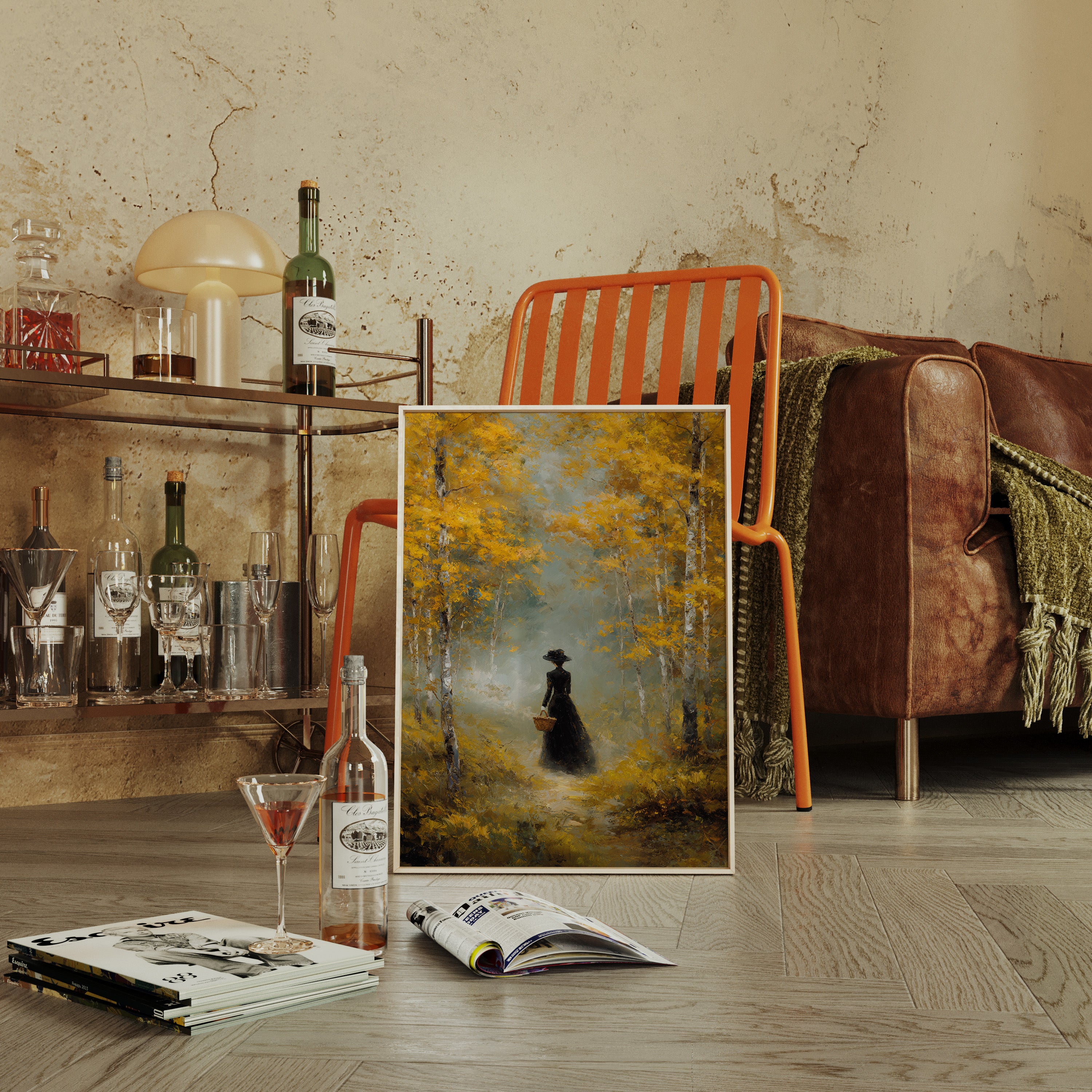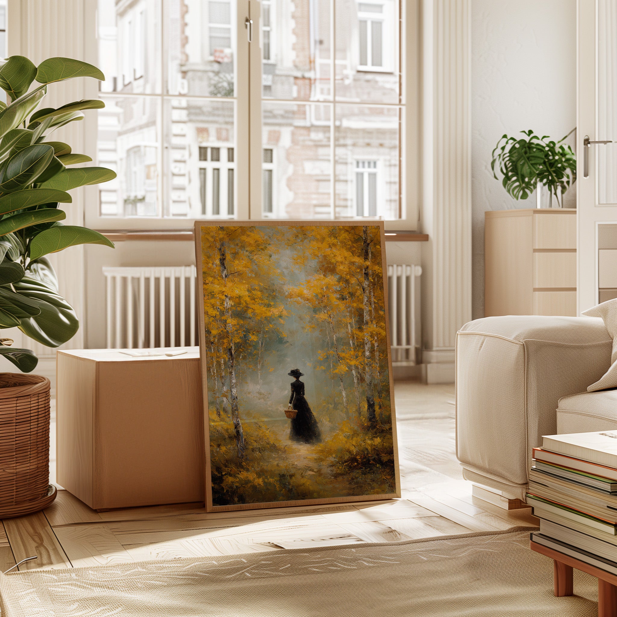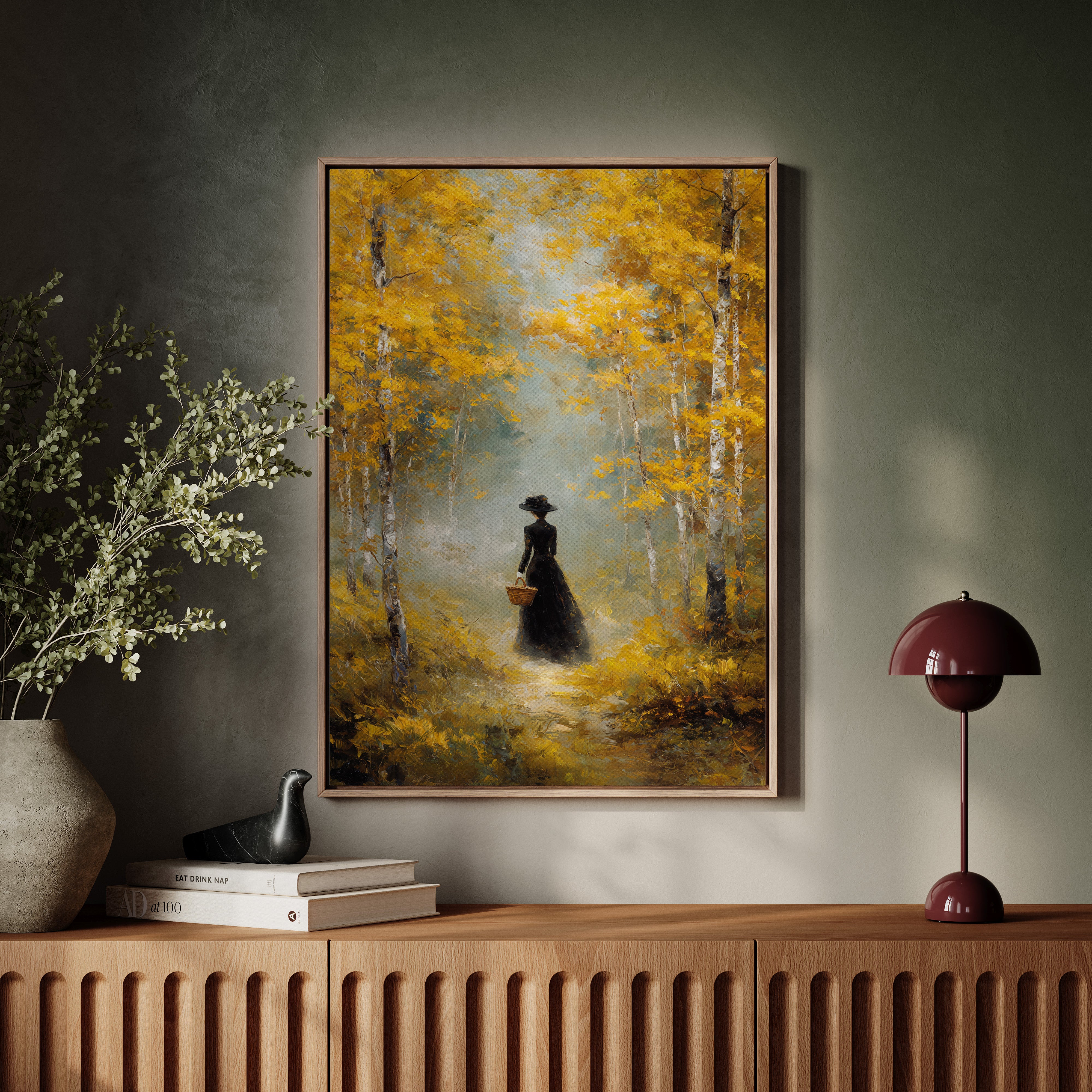 Golden light filters through a canopy of birch trees, casting ethereal rays upon a winding forest path. A solitary figure in an elegant black dress moves through the scene, her presence both mysterious and purposeful against the brilliant autumn foliage. The painting captures a moment of quiet contemplation, where white birch trunks stand like sentinels against a backdrop of ochre leaves and misty atmosphere. This atmospheric piece speaks to solitude and self-discovery, rendered in rich oils that bring warmth and depth to every brushstroke. Perfect for creating a focal point in a formal dining room or adding classical elegance to a reading nook.