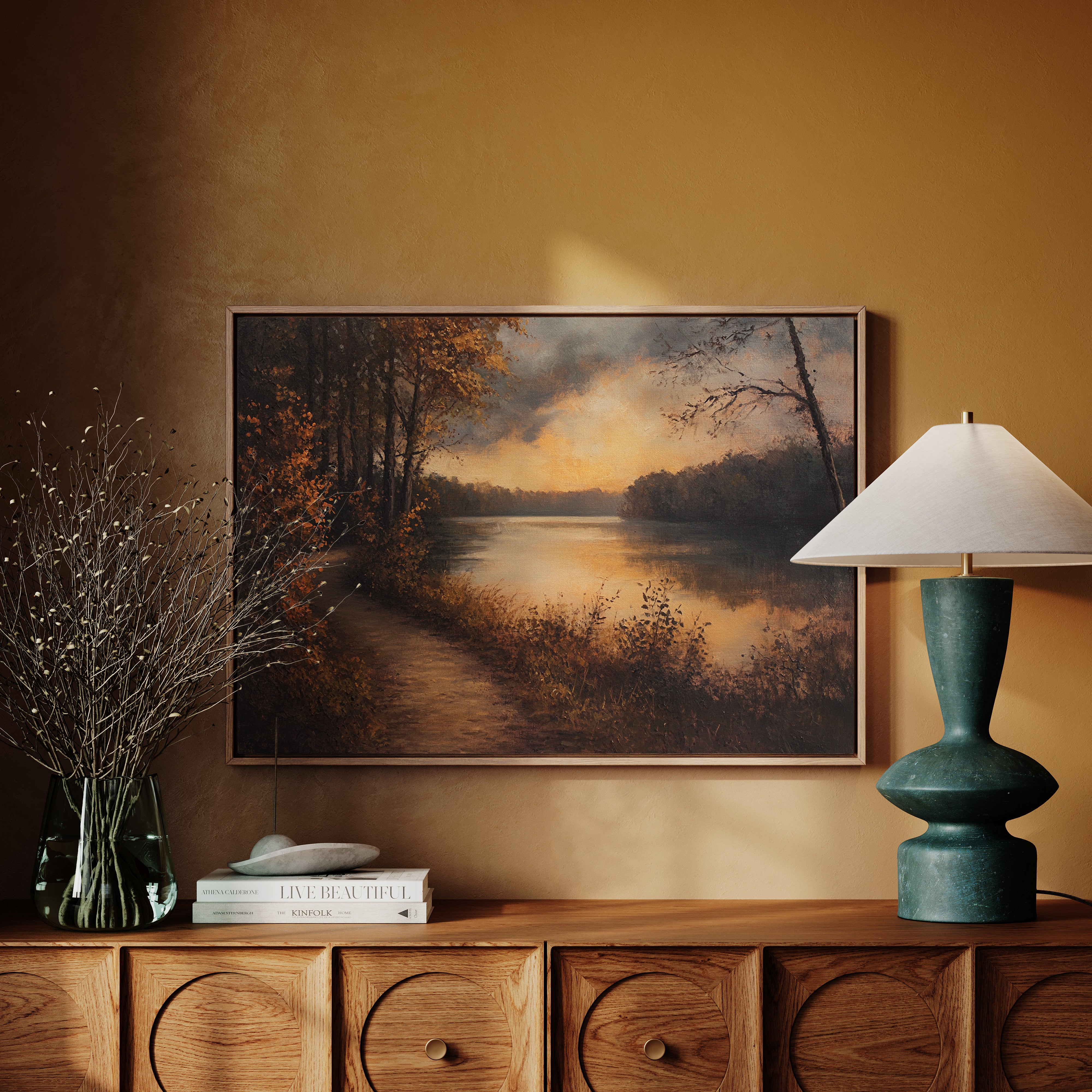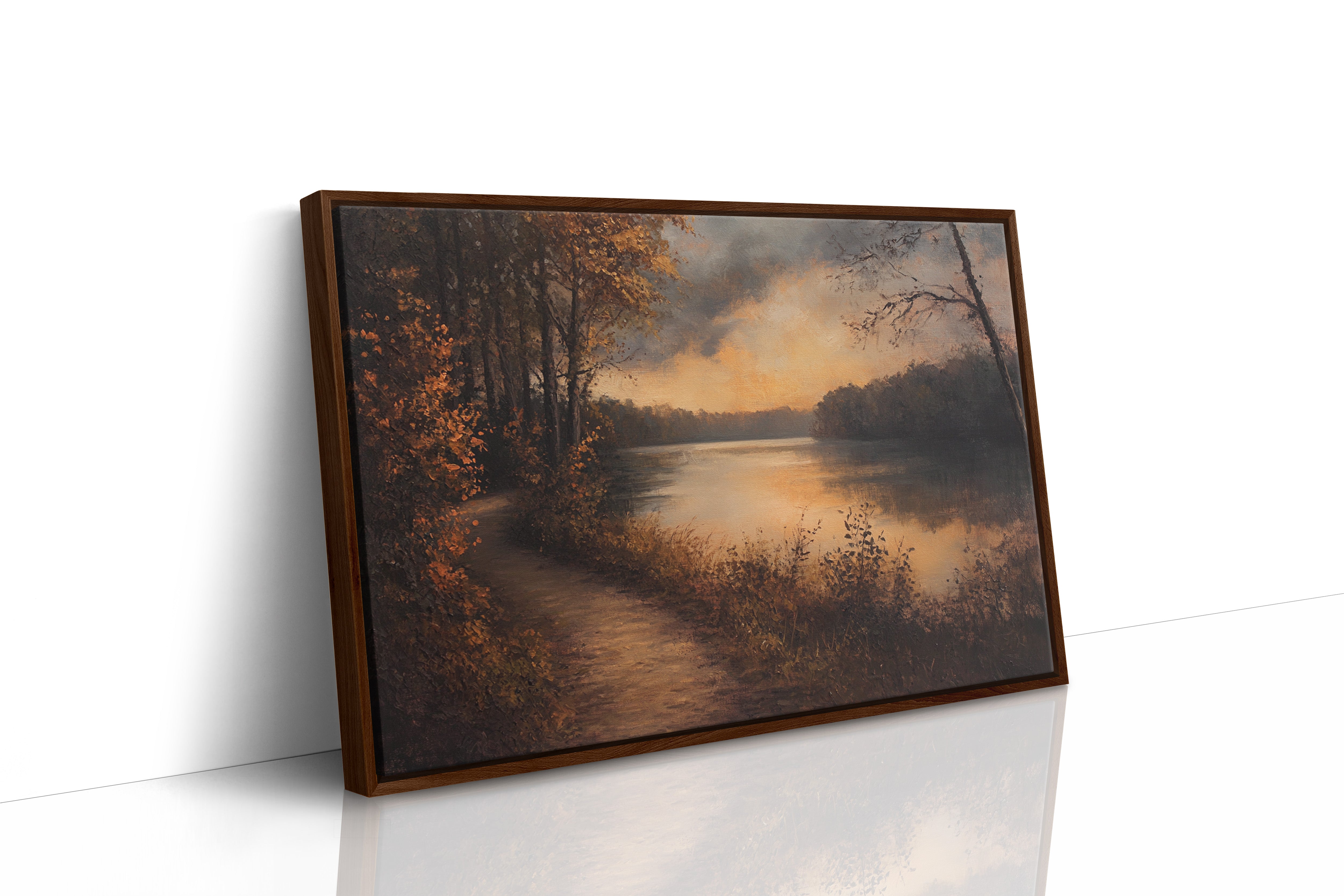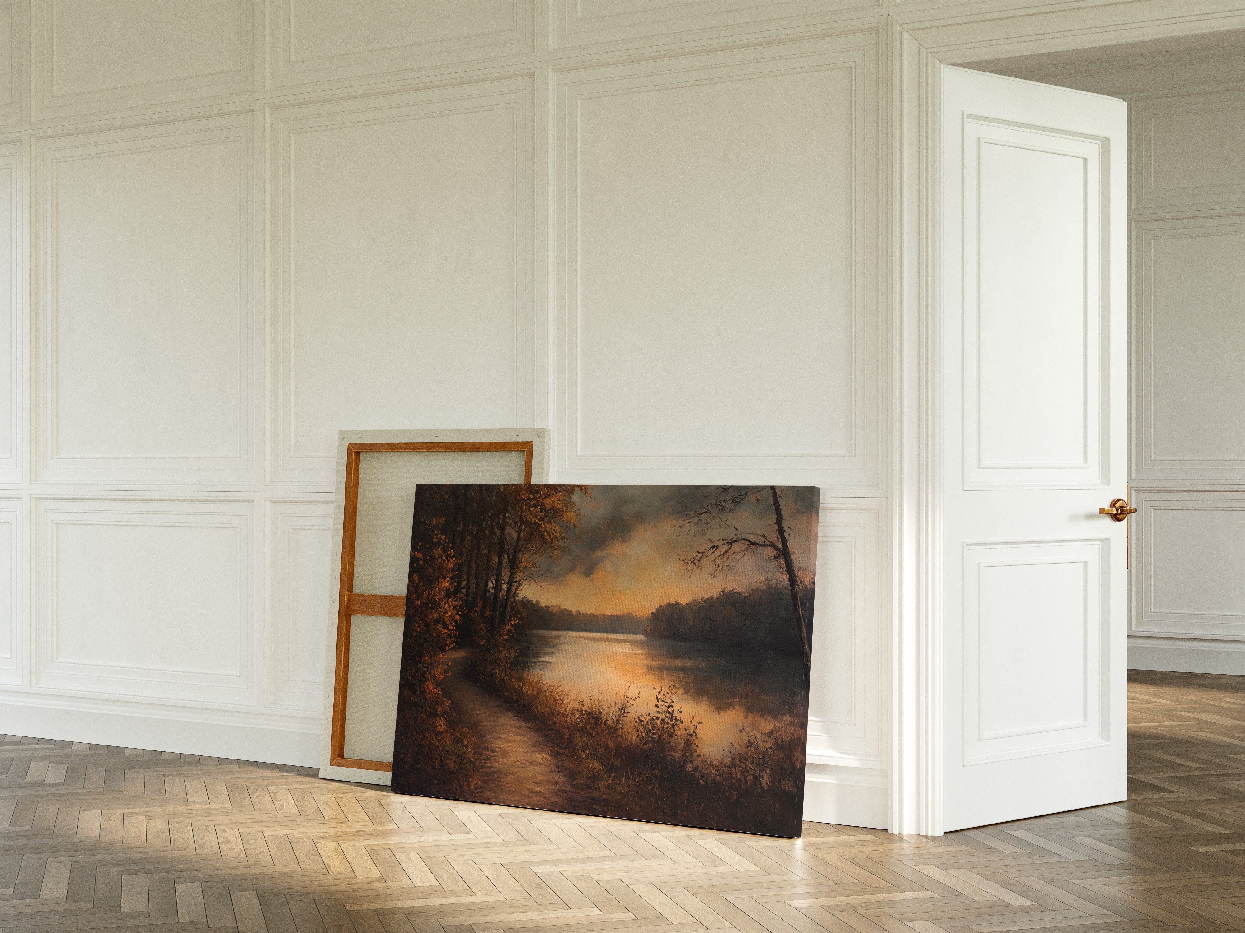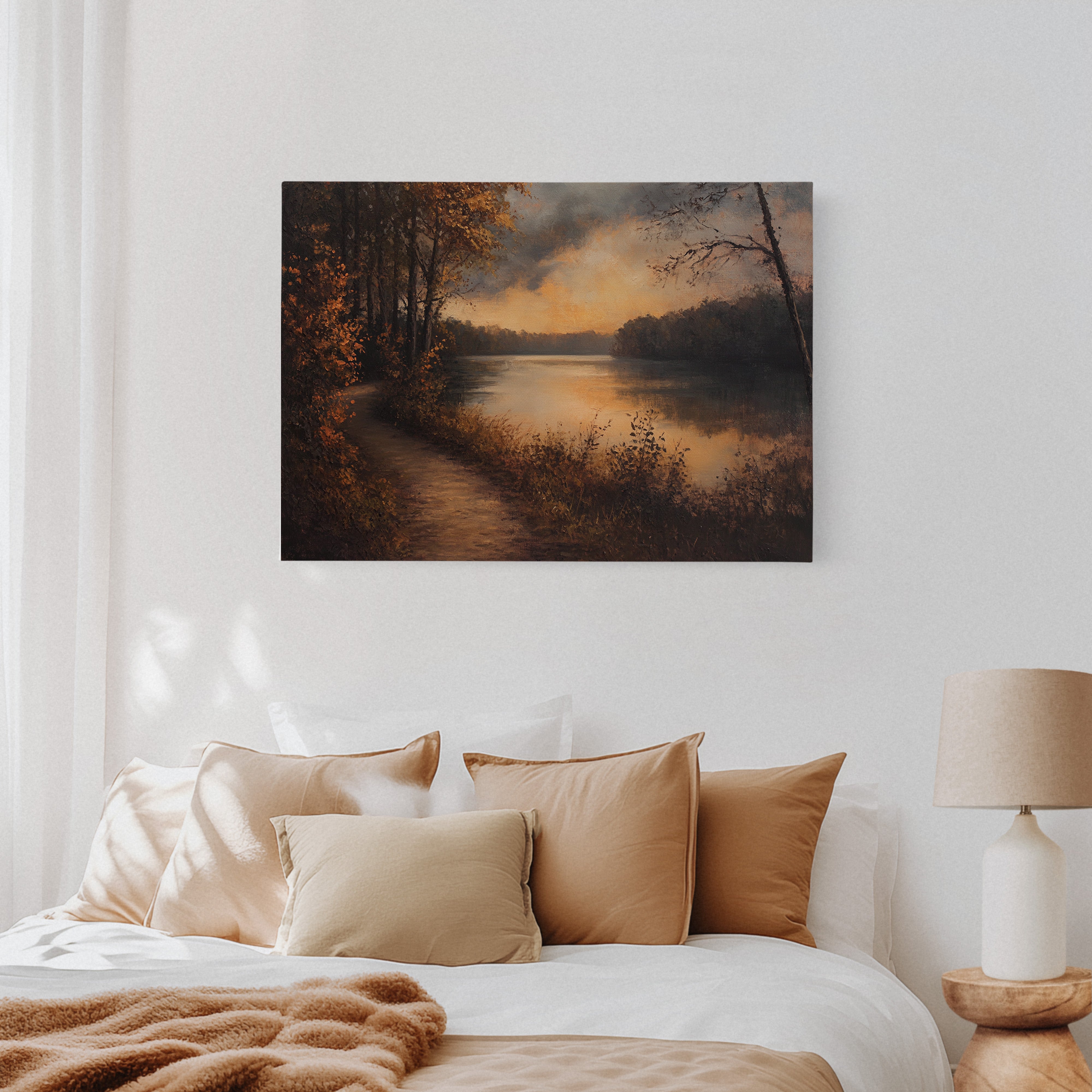 A gentle path winds through amber-kissed foliage, leading to a tranquil lake bathed in sunset's warm embrace. The scene captures that magical moment when day surrenders to dusk, painting the sky in ethereal shades of gold and peach. Dark silhouettes of trees frame the composition, their autumn leaves catching the last light of day, while the still waters mirror the luminous sky above. This atmospheric landscape speaks to the soul's yearning for quiet contemplation and natural beauty. Perfect for creating a serene focal point in a reading nook, study, or any space where you seek to bring the peaceful energy of nature indoors.