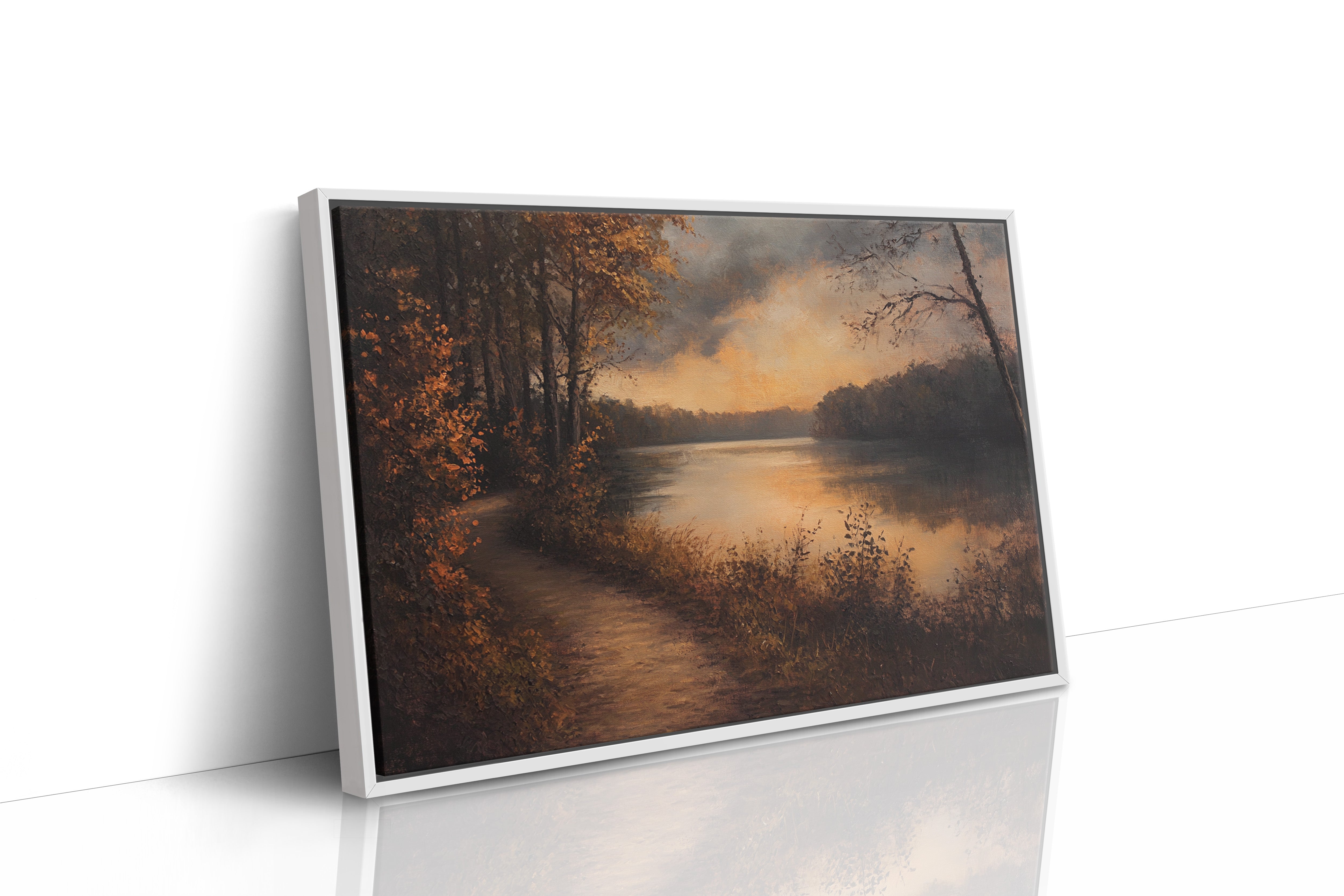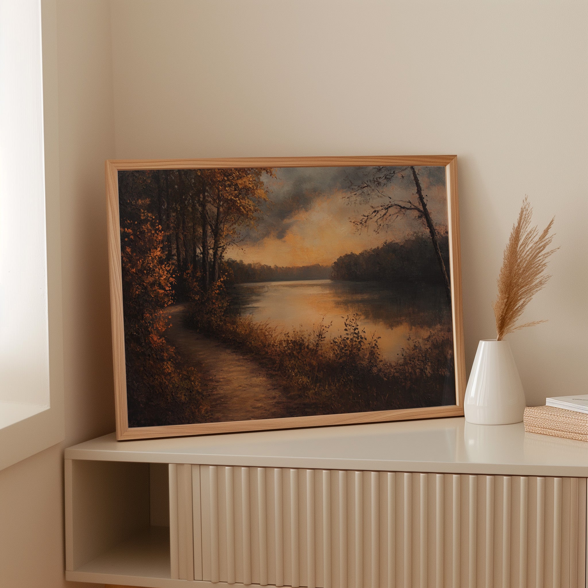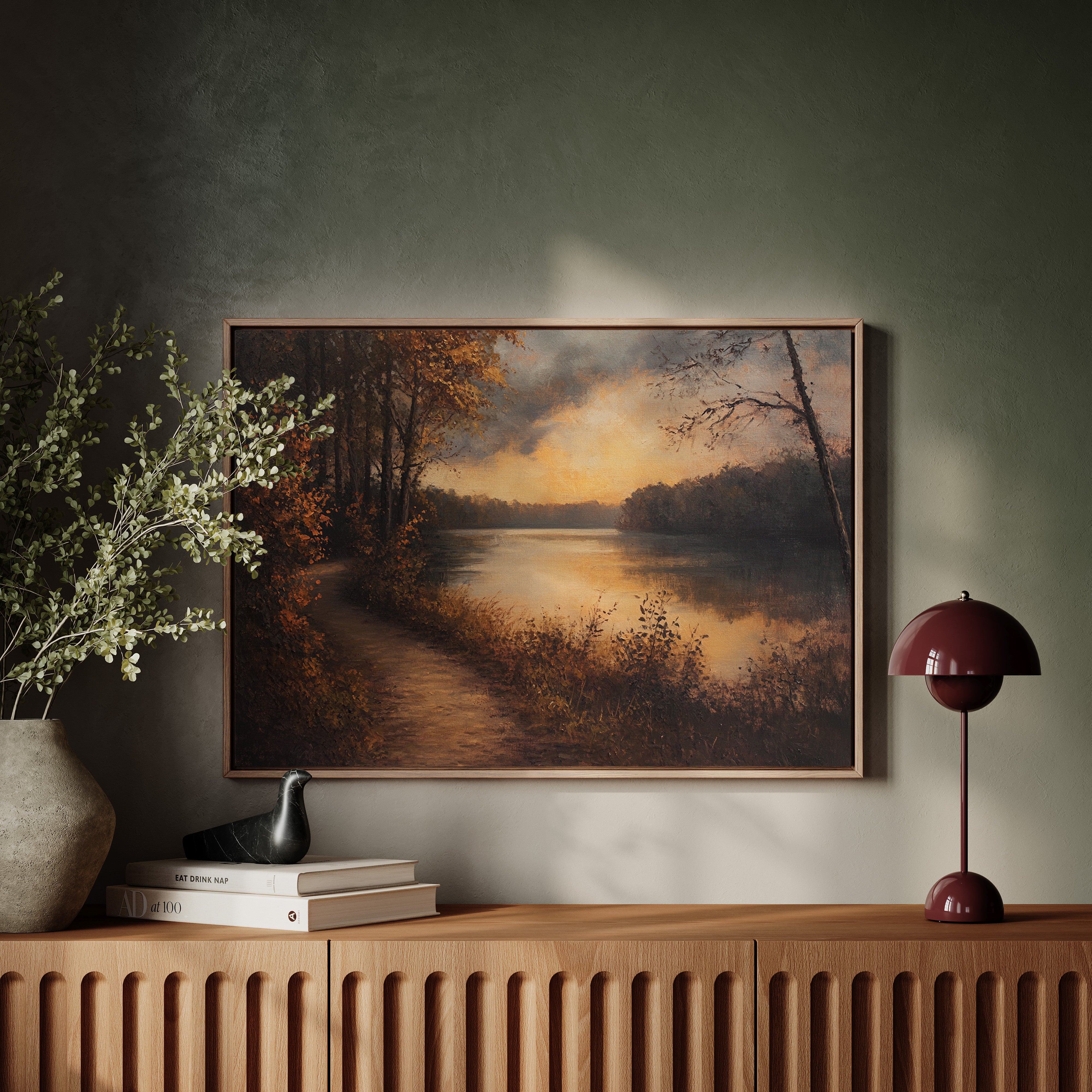 A gentle path winds through amber-kissed foliage, leading to a tranquil lake bathed in sunset's warm embrace. The scene captures that magical moment when day surrenders to dusk, painting the sky in ethereal shades of gold and peach. Dark silhouettes of trees frame the composition, their autumn leaves catching the last light of day, while the still waters mirror the luminous sky above. This atmospheric landscape speaks to the soul's yearning for quiet contemplation and natural beauty. Perfect for creating a serene focal point in a reading nook, study, or any space where you seek to bring the peaceful energy of nature indoors.