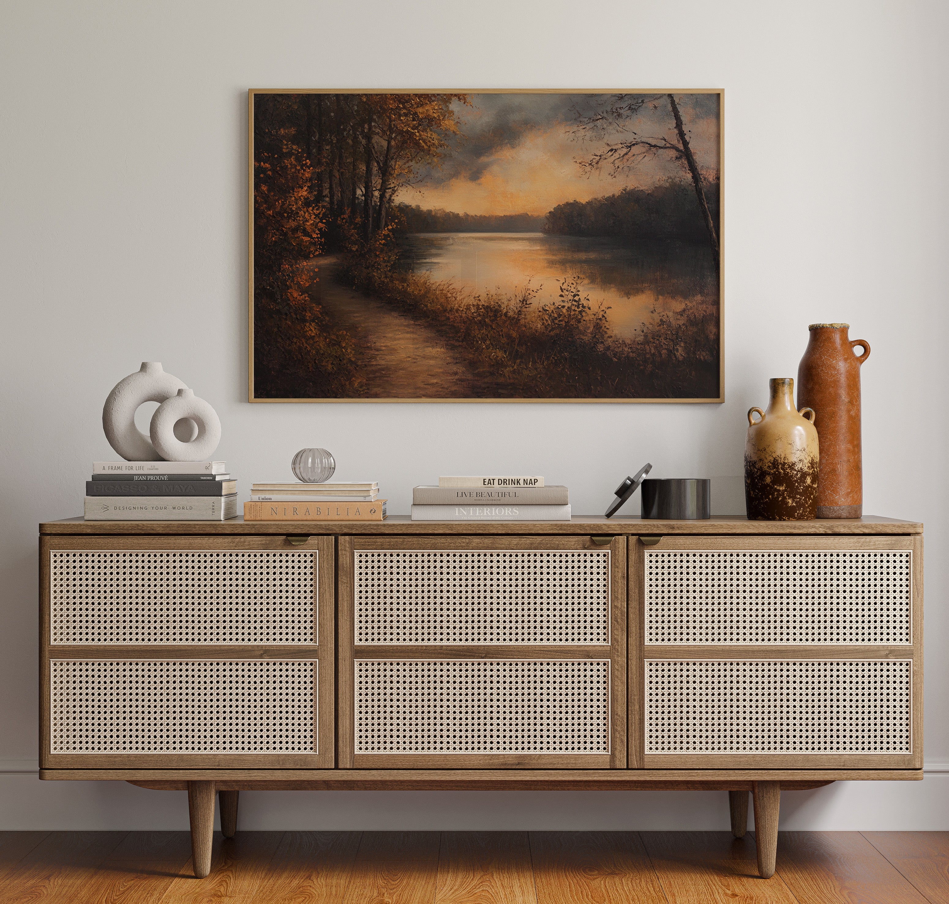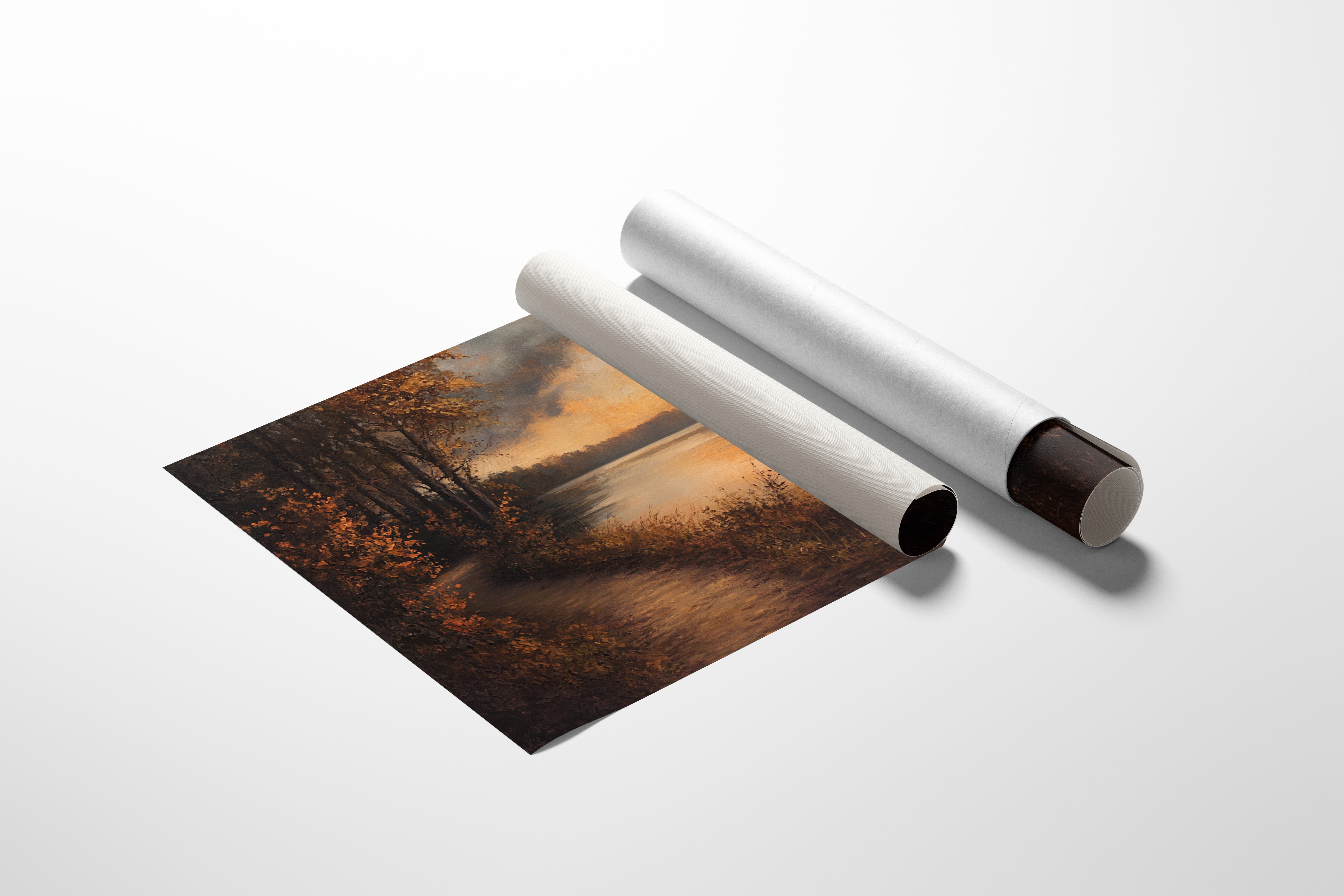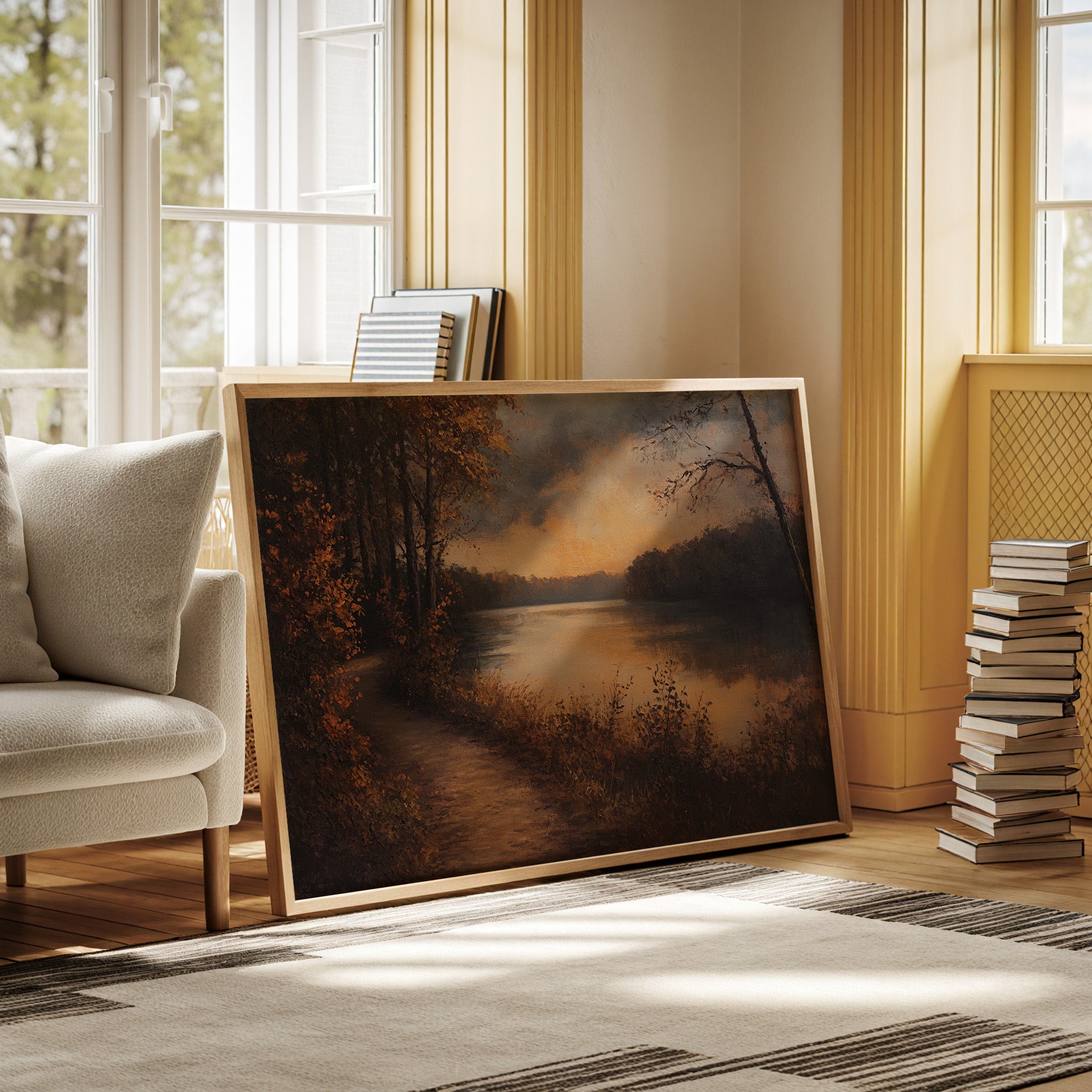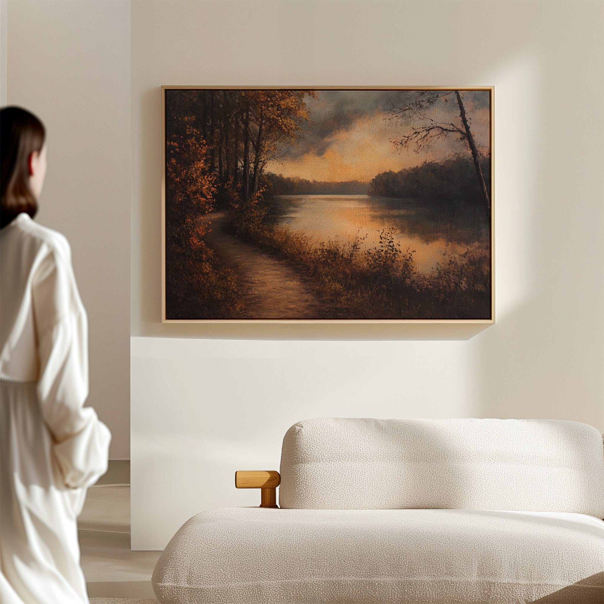 A gentle path winds through amber-kissed foliage, leading to a tranquil lake bathed in sunset's warm embrace. The scene captures that magical moment when day surrenders to dusk, painting the sky in ethereal shades of gold and peach. Dark silhouettes of trees frame the composition, their autumn leaves catching the last light of day, while the still waters mirror the luminous sky above. This atmospheric landscape speaks to the soul's yearning for quiet contemplation and natural beauty. Perfect for creating a serene focal point in a reading nook, study, or any space where you seek to bring the peaceful energy of nature indoors.