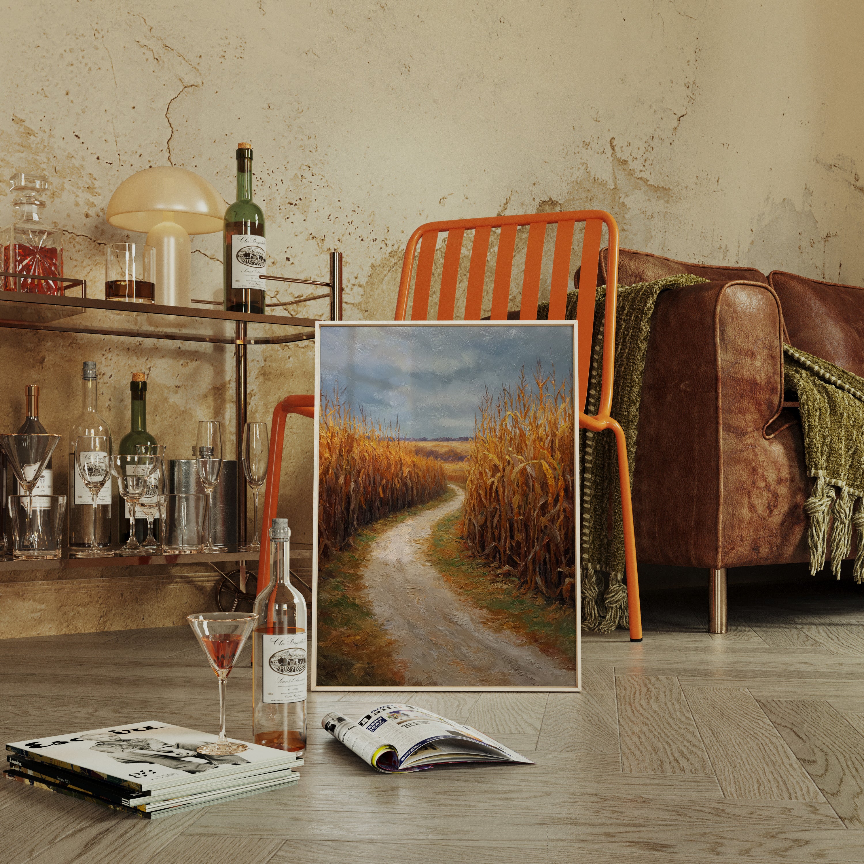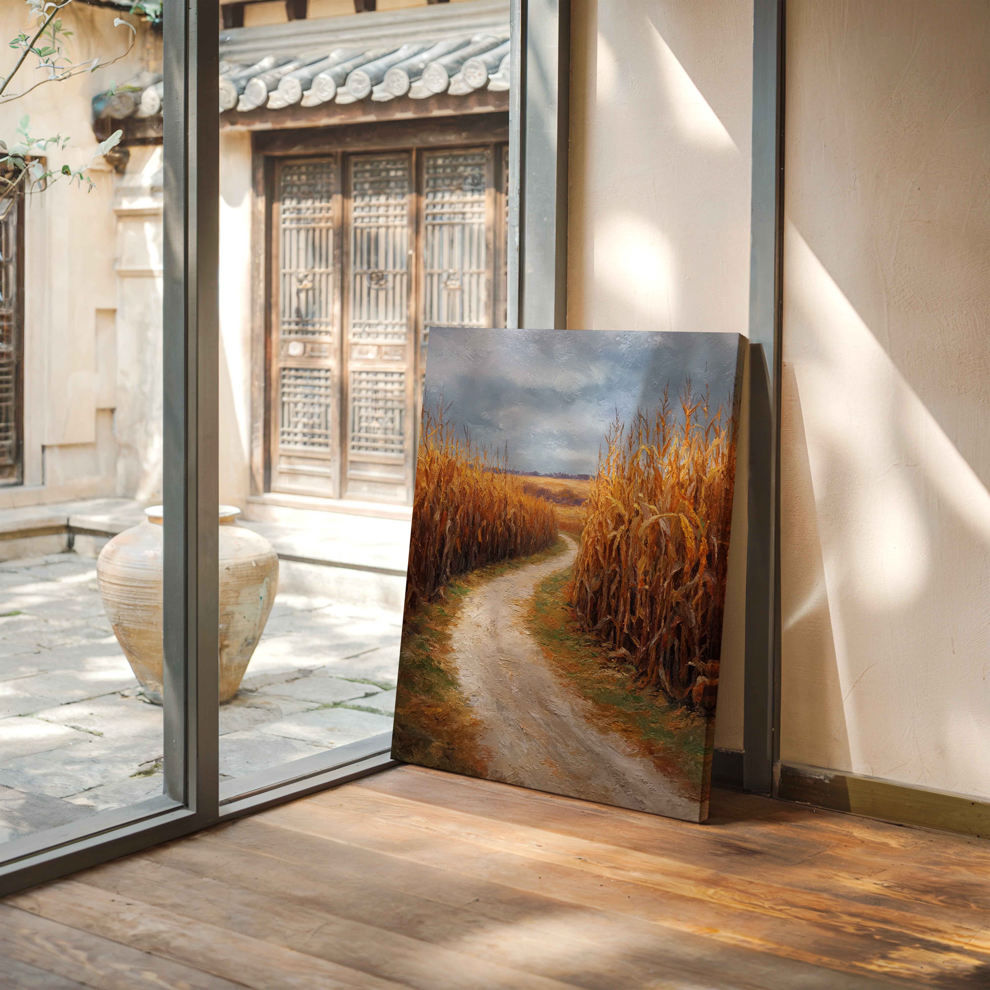 A winding dirt path cuts through towering stalks of harvest-ready corn, leading the eye toward distant rolling hills. The late afternoon light bathes the scene in warm amber tones, creating a rich contrast between the golden crops and the moody grey-blue sky above. Textured brushstrokes capture the rustle of dried corn leaves and the weathered character of the well-worn trail, while hints of green undergrowth peek through along the path's edges. This piece brings the heartland's autumn essence into your space, perfect for creating a focal point in a farmhouse kitchen or adding pastoral warmth to a modern living room.
