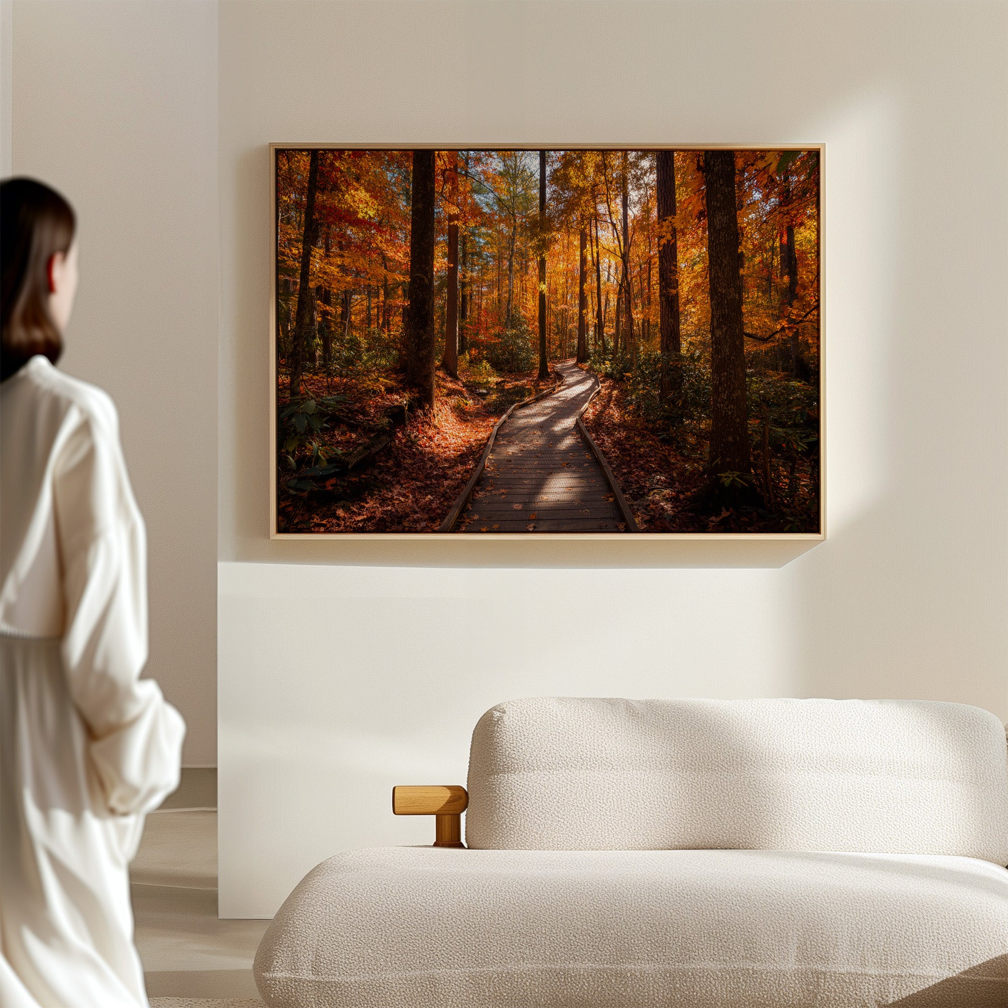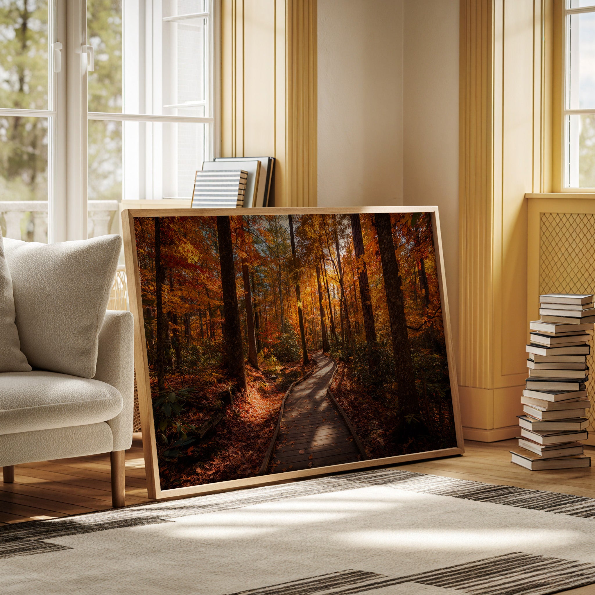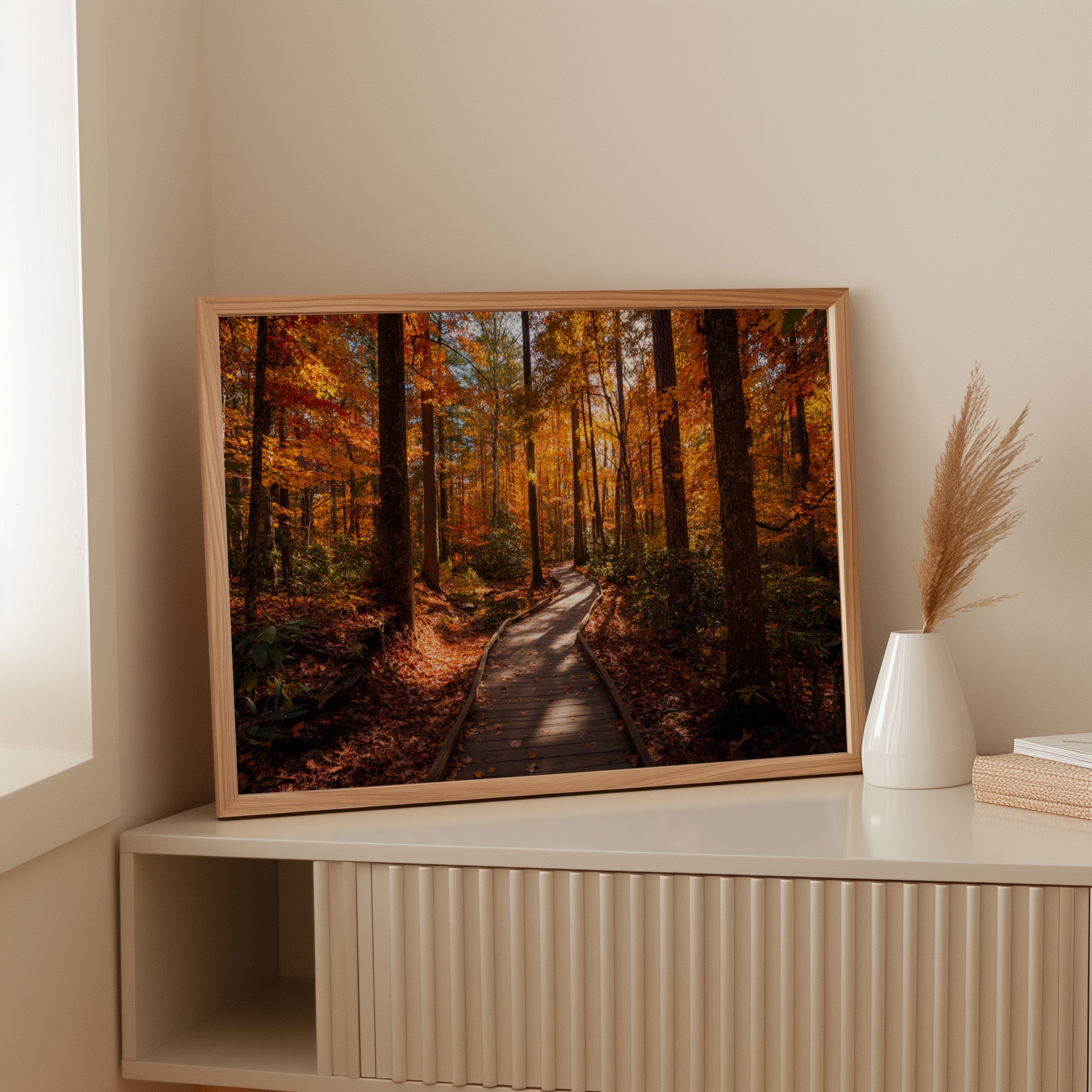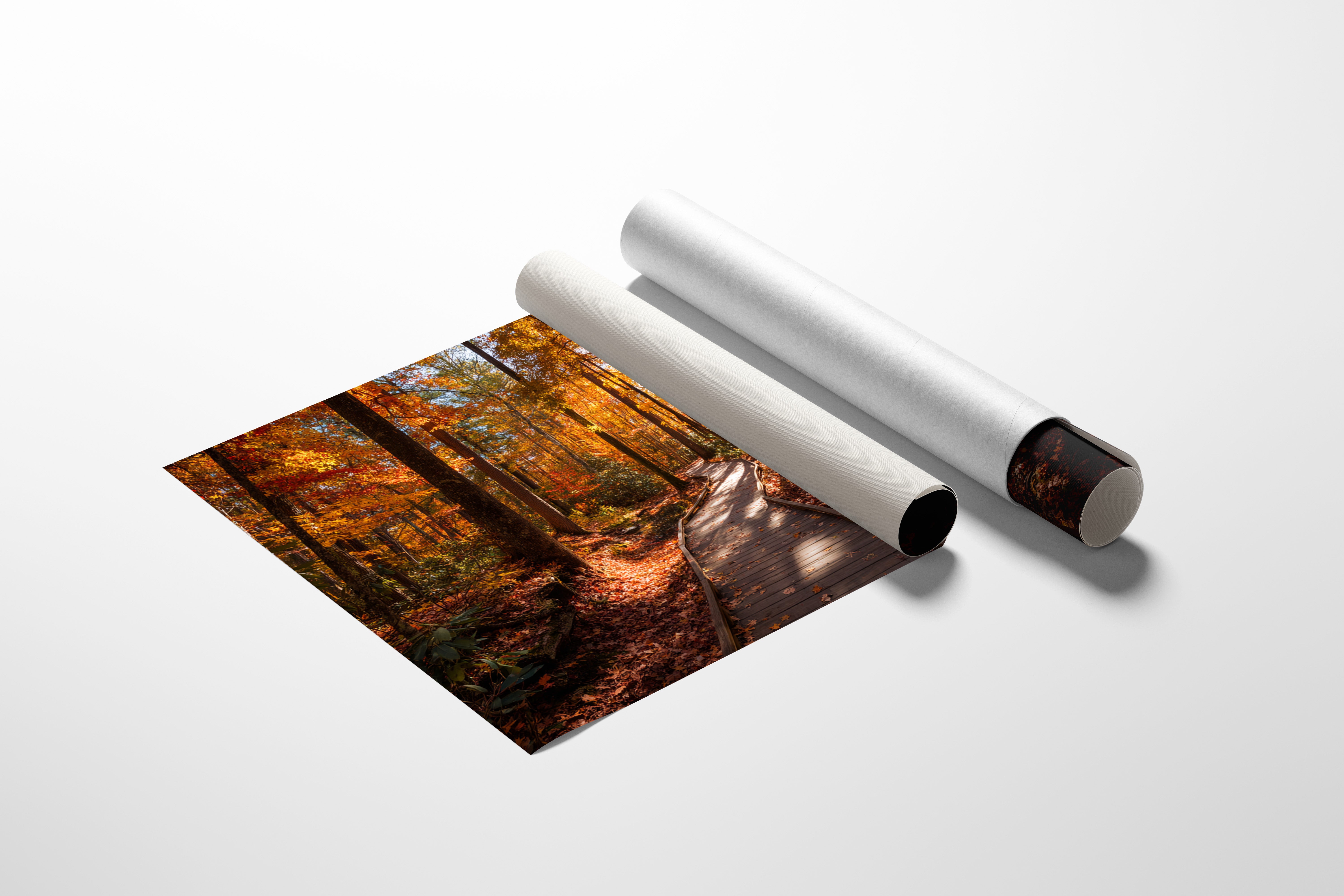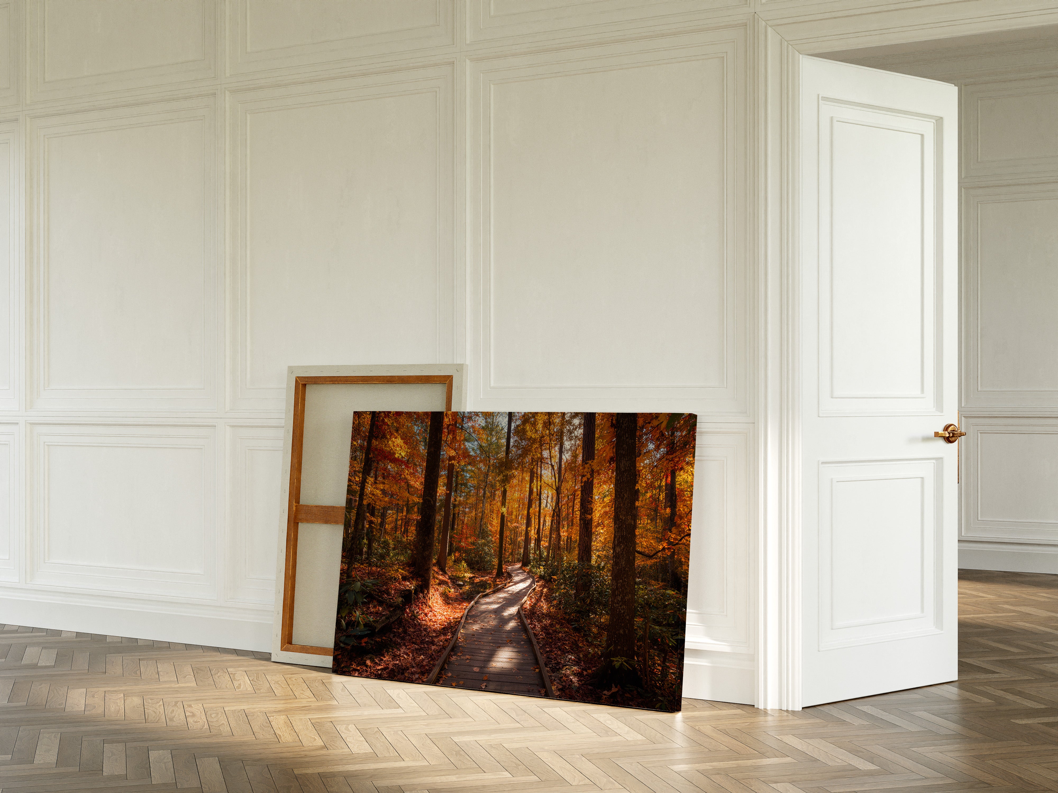 Sunlight filters through a canopy of maple and oak leaves, painting the wooden boardwalk in dappled amber light. The winding path beckons through a forest aflame with fall colors, where crimson and gold leaves dance against deep brown tree trunks. Rich autumn hues create a natural corridor, with the boardwalk's weathered planks leading deeper into this seasonal transformation. This scene captures the quiet majesty of fall's peak moment, where every step reveals nature's most vibrant performance. Perfect for spaces seeking to bring the warmth and tranquility of autumn indoors, this piece adds depth and seasonal charm to living rooms or hallways.