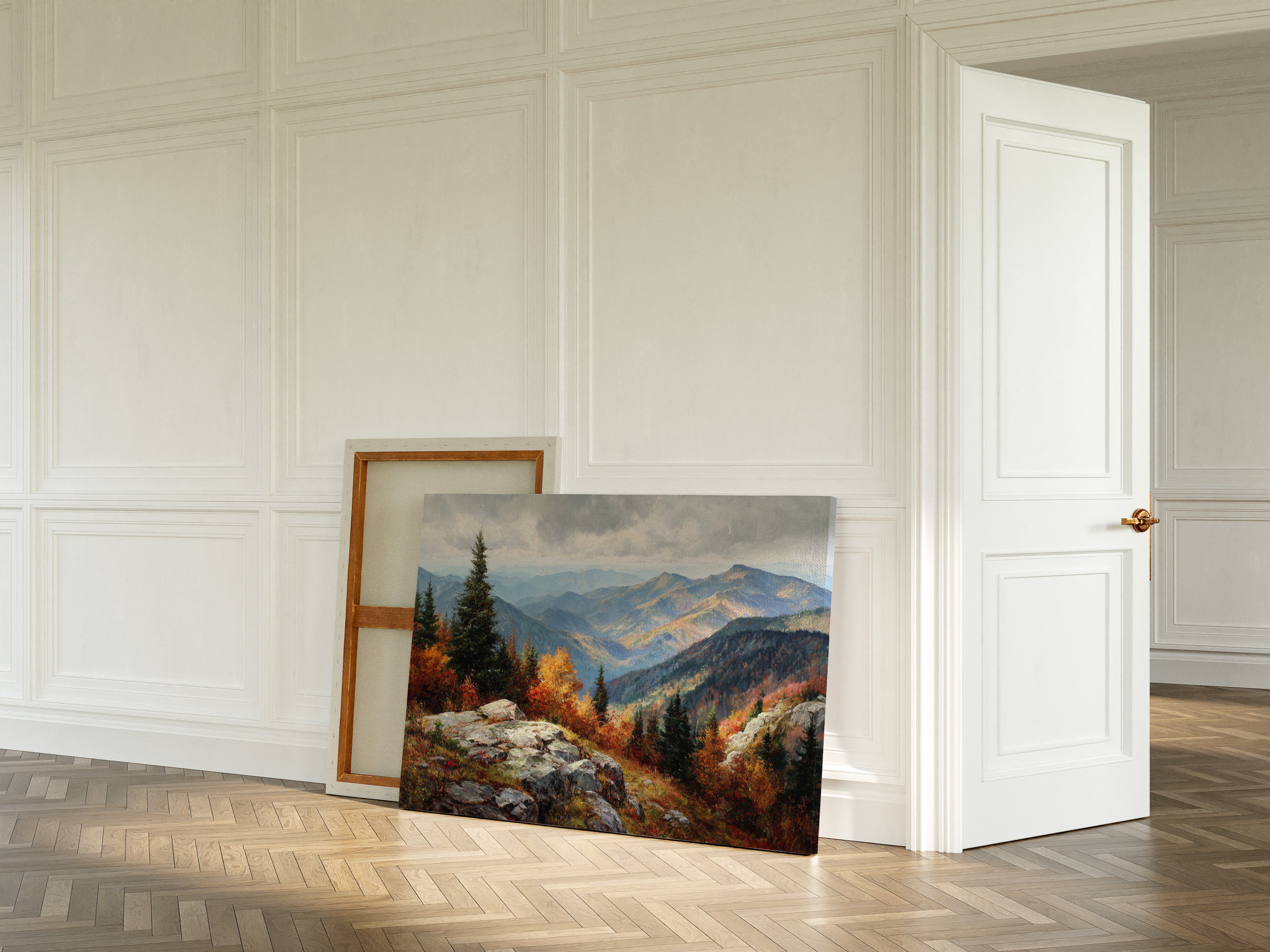 Sunlight breaks through storm clouds, illuminating a dramatic mountain vista adorned in fall's richest palette. Ancient granite boulders anchor the foreground, their weathered faces telling stories of centuries past. The landscape unfolds in layers of deep blues and purples, while autumn foliage ignites the hillsides with bursts of crimson, gold, and amber. Evergreen sentinels stand tall among the seasonal transformation, creating a timeless dialogue between permanence and change. This piece brings the majesty of mountain autumn into living spaces, perfect for great rooms or studies where its panoramic grace can be fully appreciated.