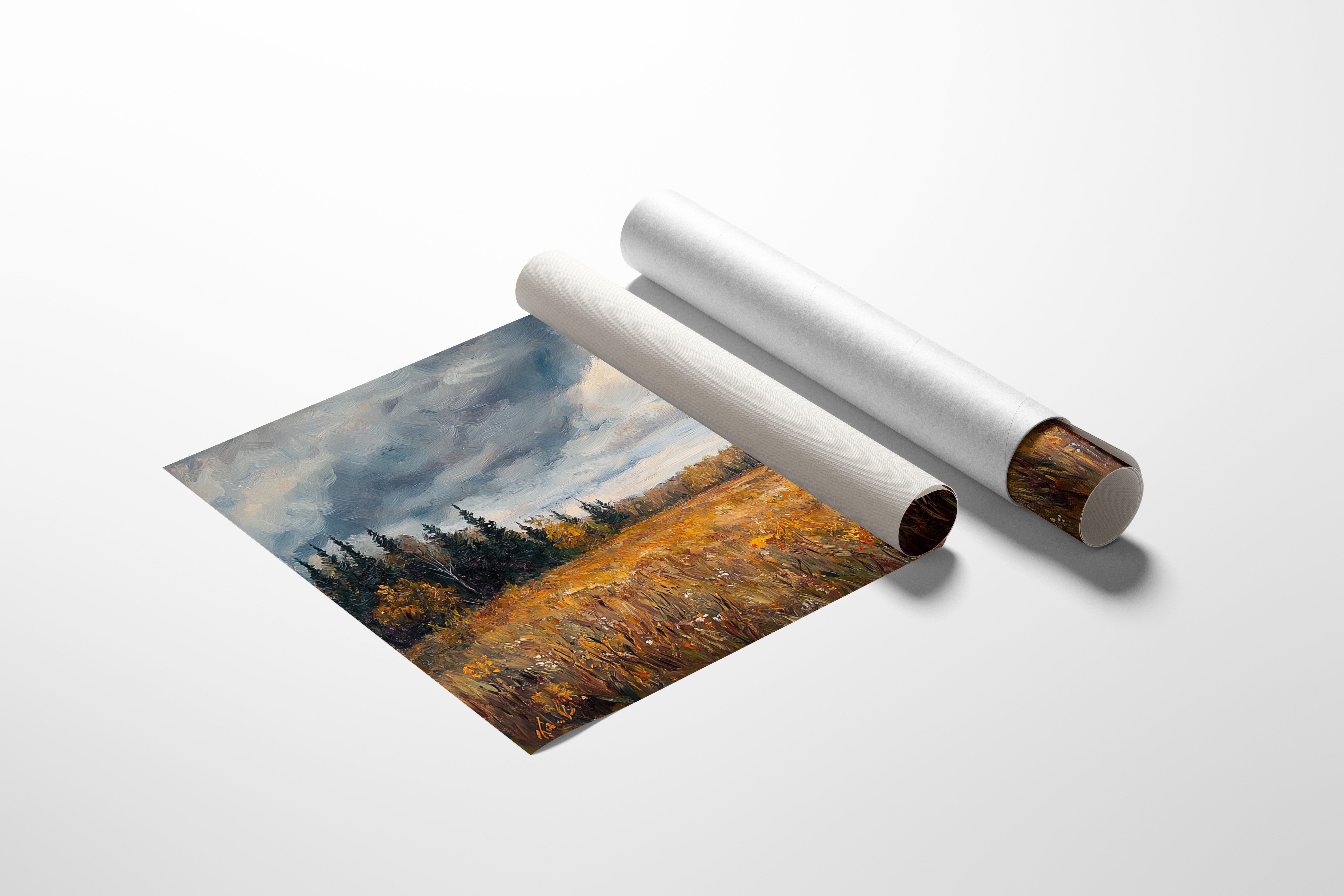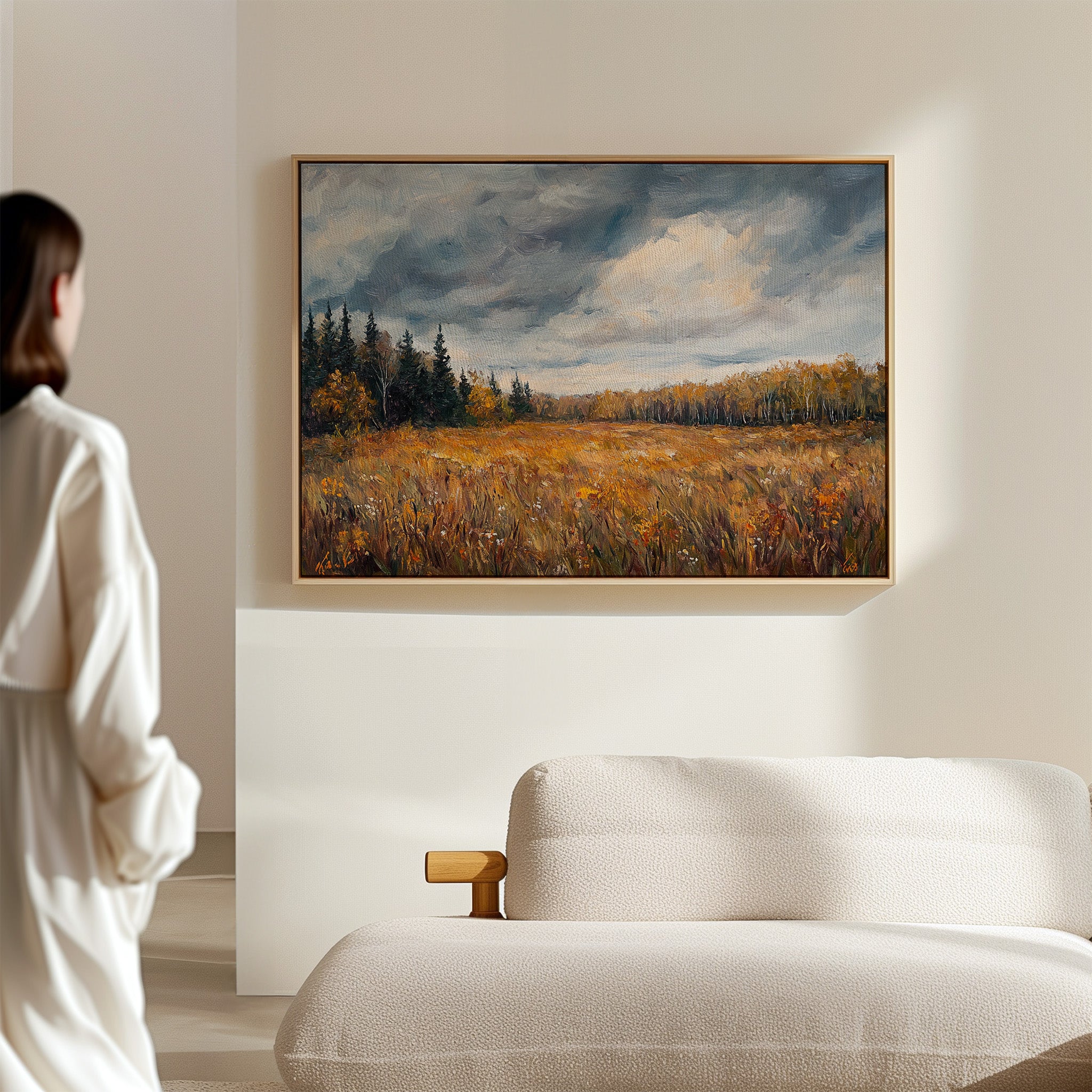 A vast prairie stretches toward the horizon, its golden grasses swaying with stories of changing seasons. The dramatic sky above carries steel-blue clouds that contrast beautifully with the warm autumn palette below. Evergreen sentinels stand guard along the edge of the meadow, while deciduous trees paint the distance in amber and russet hues. The textured brushstrokes capture the wild beauty of untamed grasslands, where wildflowers persist even as winter approaches. This piece brings the raw majesty of open spaces into interior settings, perfect for creating a contemplative focal point in a study or adding natural warmth to a dining room.