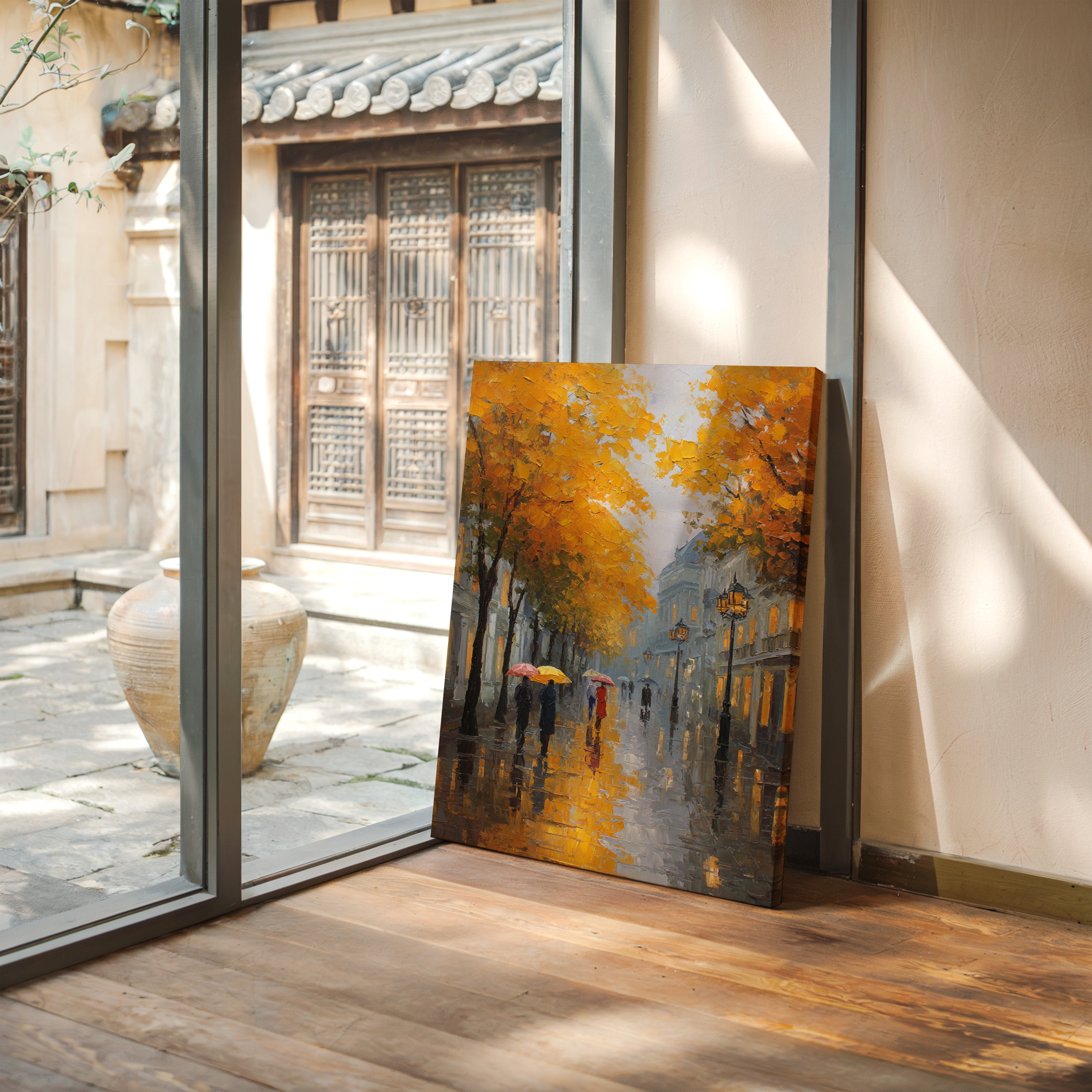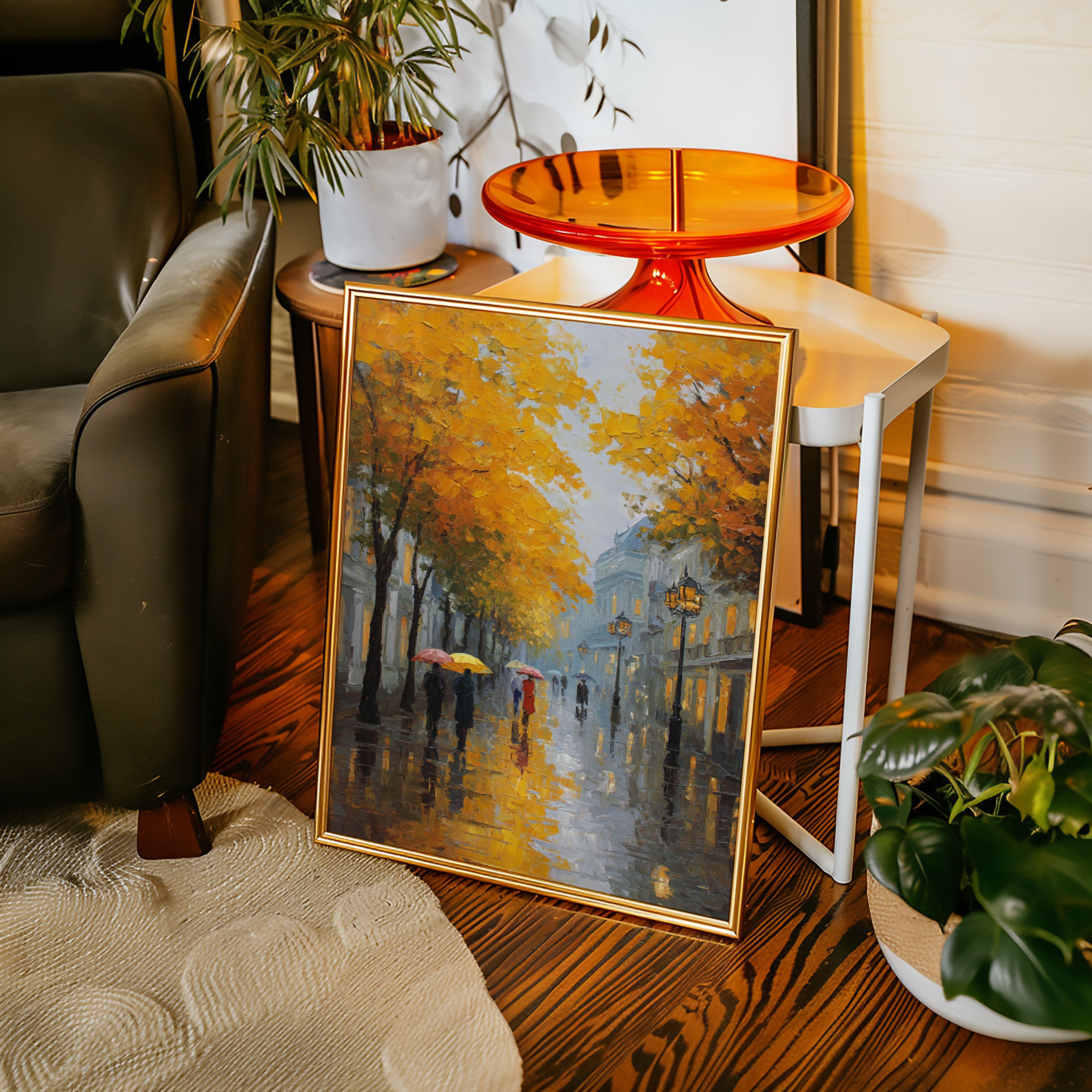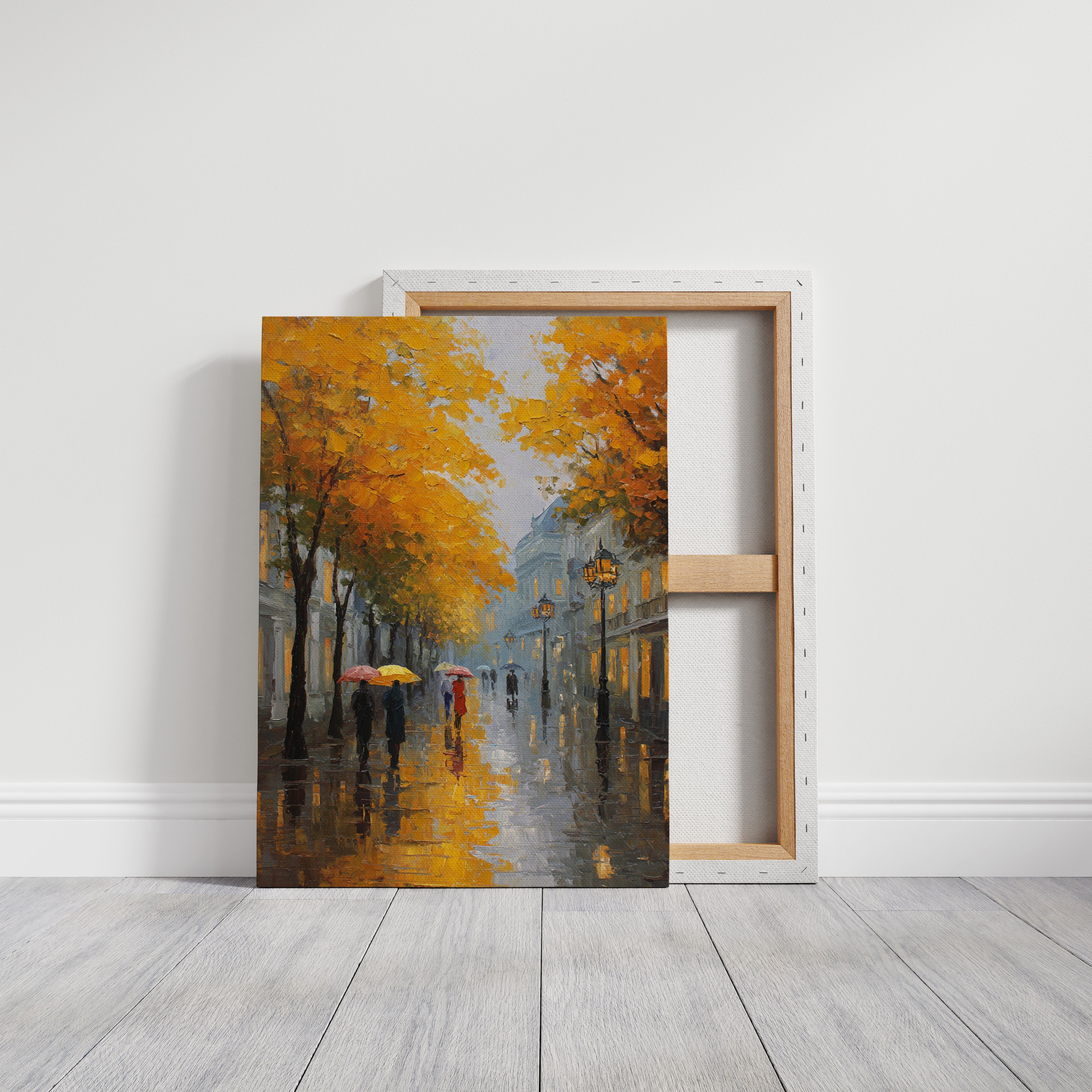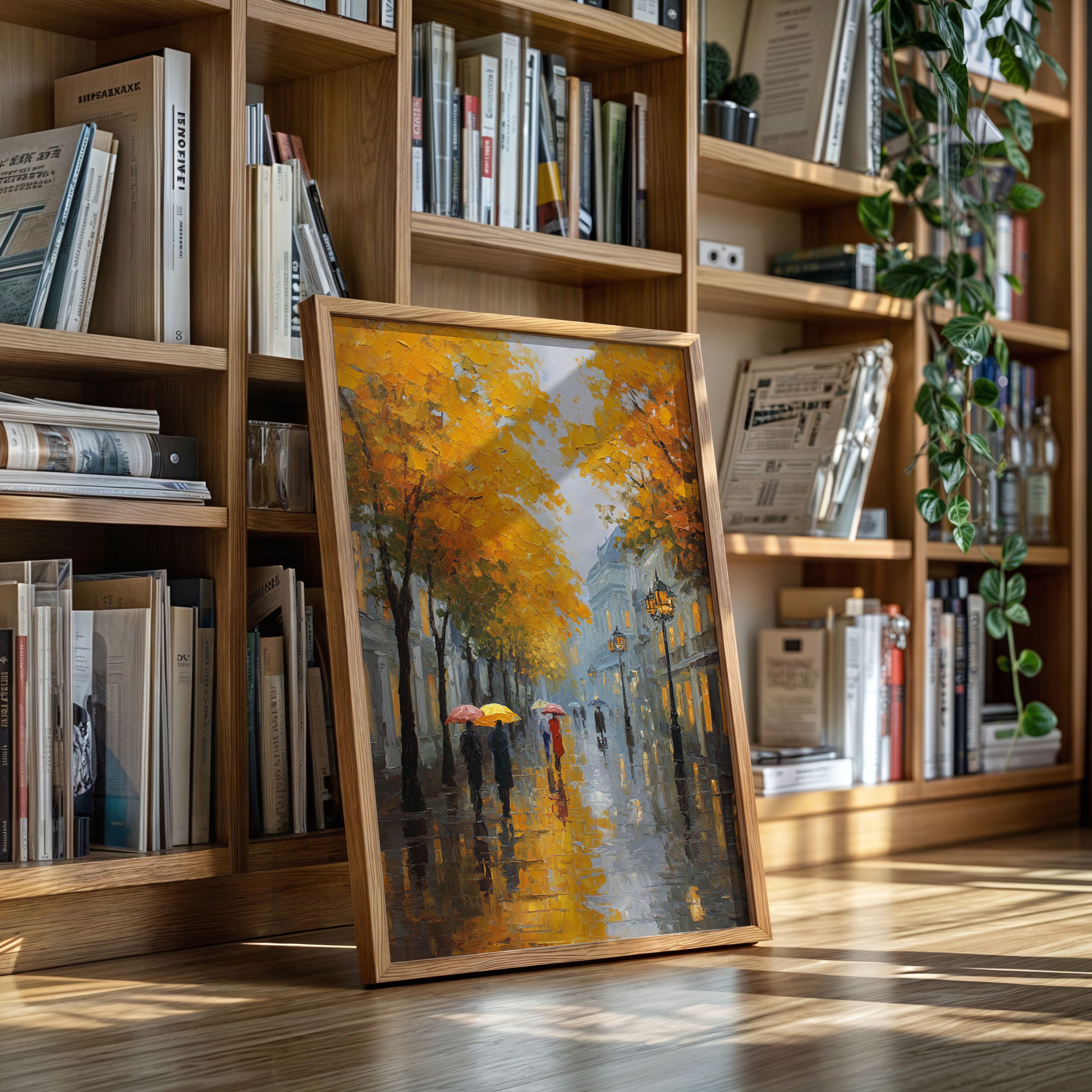 Golden maple leaves catch the glow of street lamps, creating a warm canopy over rain-slicked cobblestones. Figures with colorful umbrellas navigate the misty evening, their reflections dancing in puddles beneath their feet. The scene captures that magical moment when autumn rain transforms city streets into mirrors, while historic buildings fade into a blue-grey haze punctuated by warm window lights. Perfect for spaces seeking to evoke the romance of European afternoons, this piece brings sophisticated urban charm to living rooms or intimate dining areas.