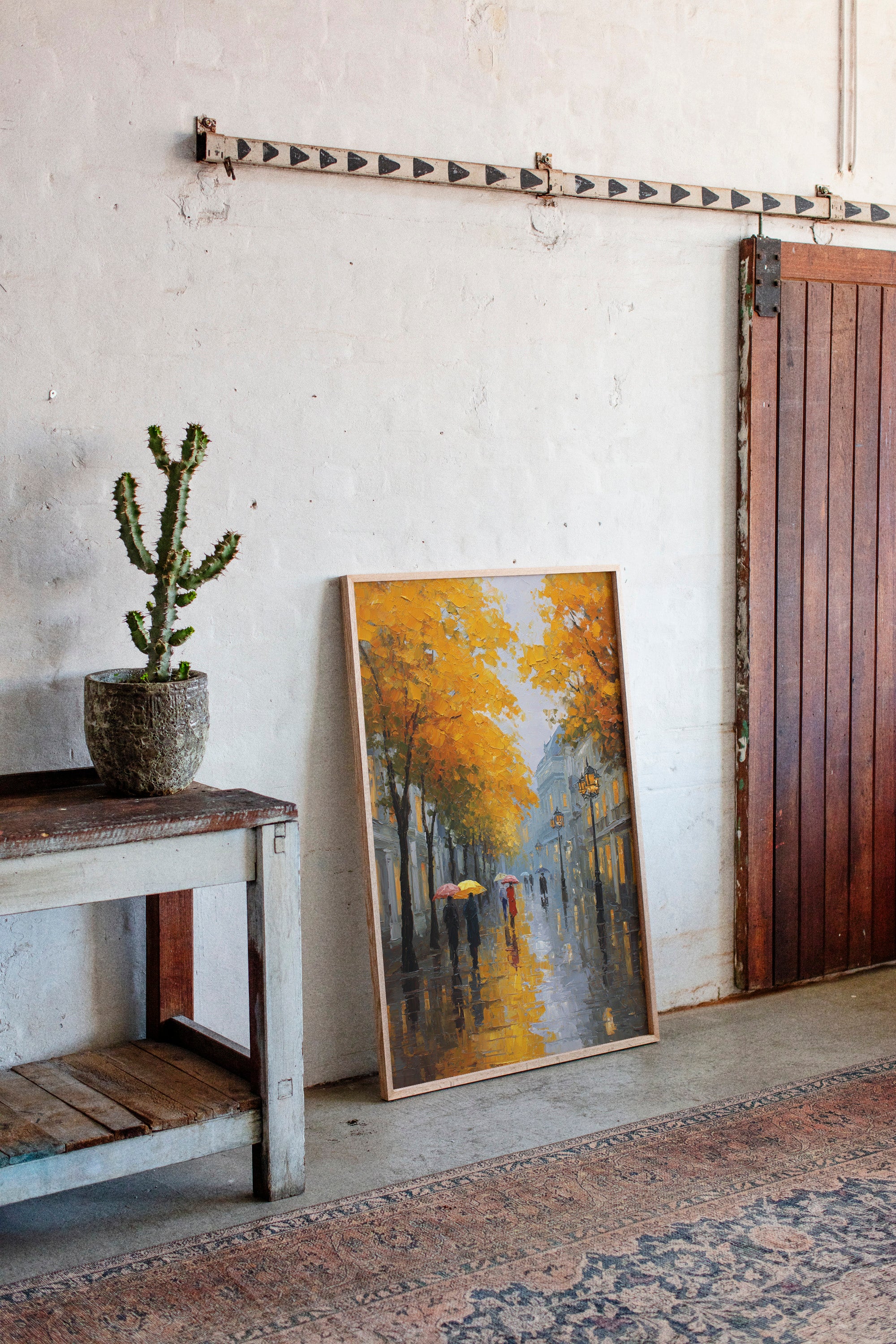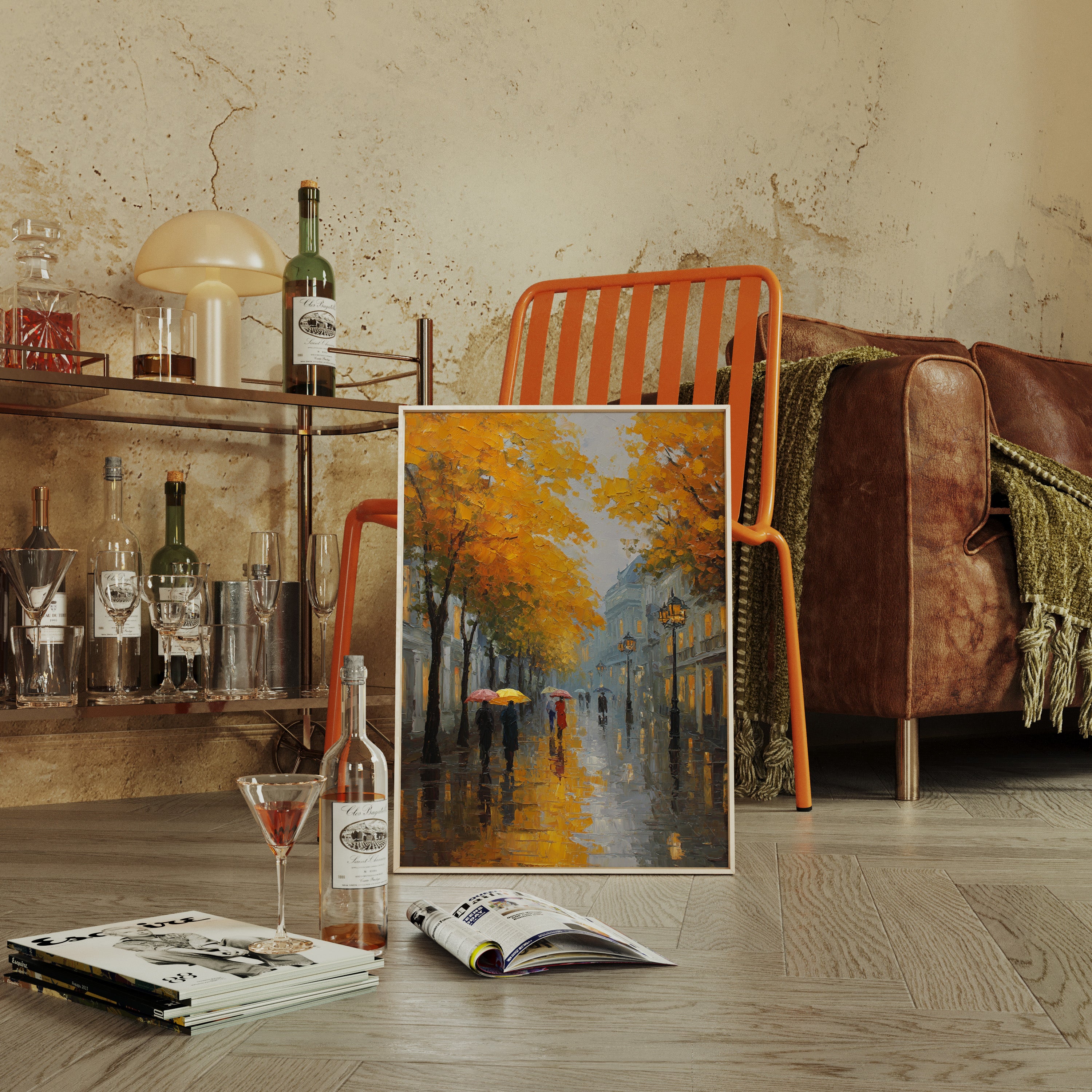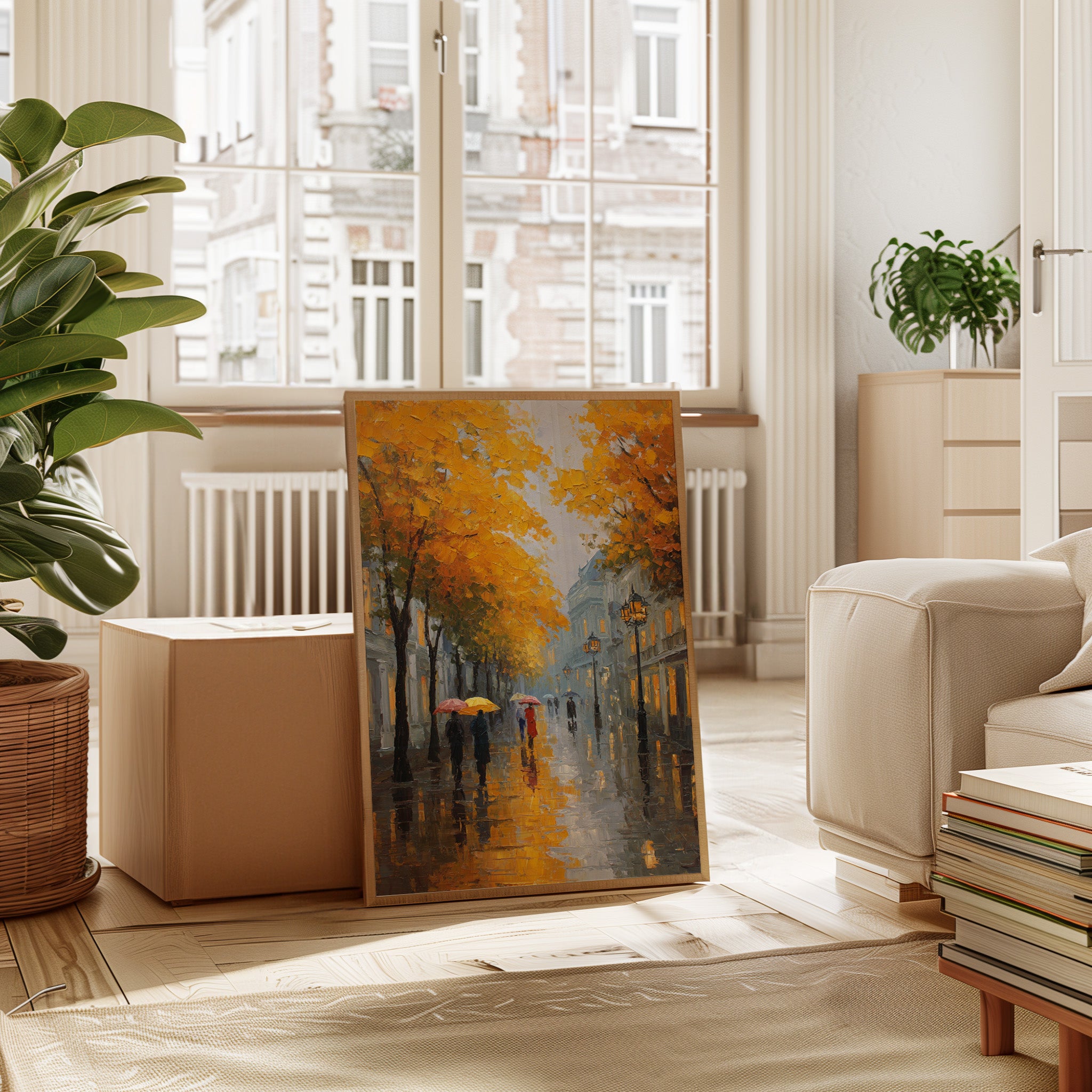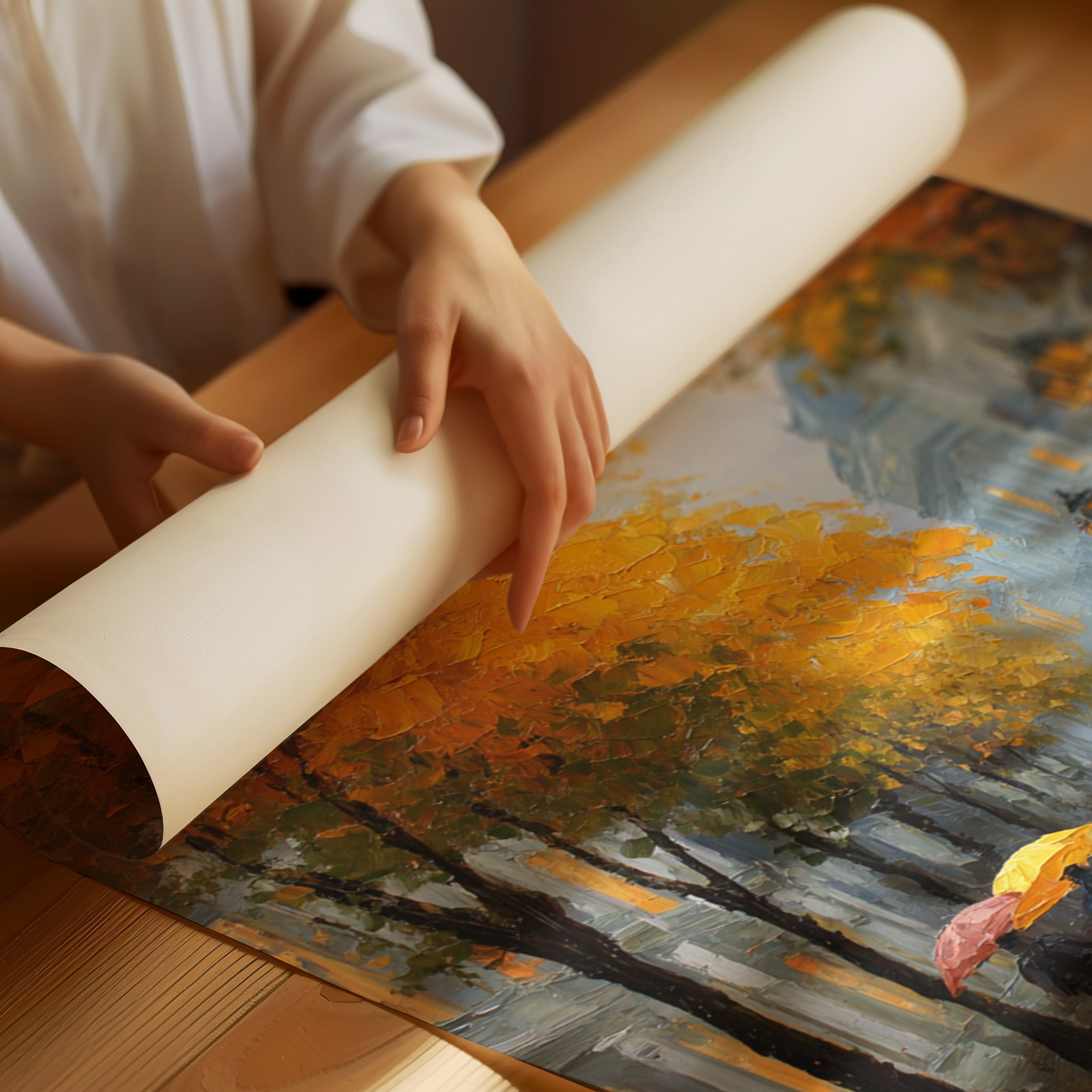 Golden maple leaves catch the glow of street lamps, creating a warm canopy over rain-slicked cobblestones. Figures with colorful umbrellas navigate the misty evening, their reflections dancing in puddles beneath their feet. The scene captures that magical moment when autumn rain transforms city streets into mirrors, while historic buildings fade into a blue-grey haze punctuated by warm window lights. Perfect for spaces seeking to evoke the romance of European afternoons, this piece brings sophisticated urban charm to living rooms or intimate dining areas.
