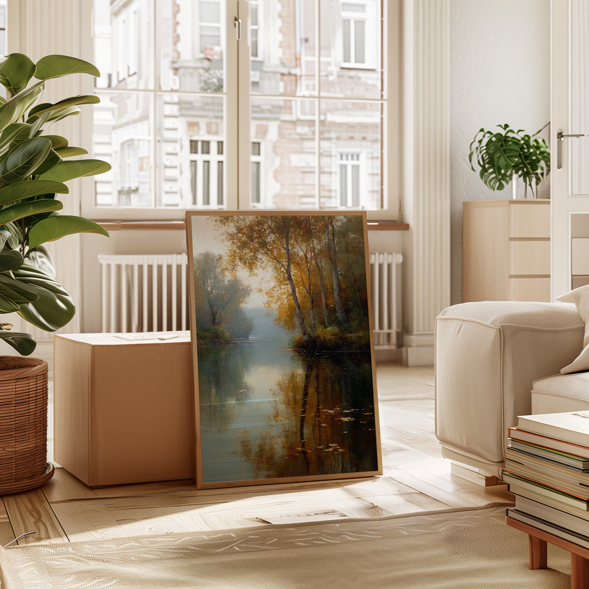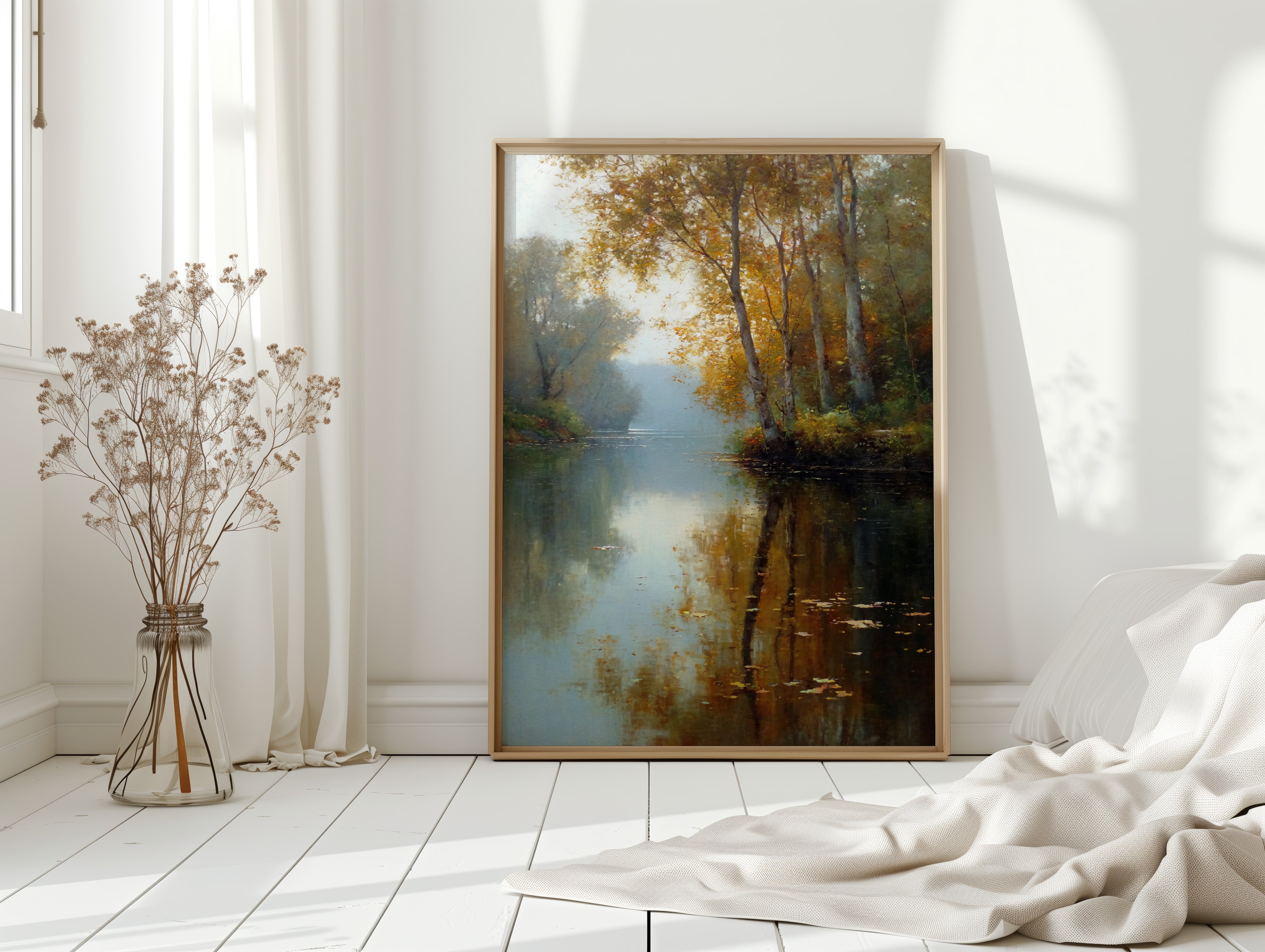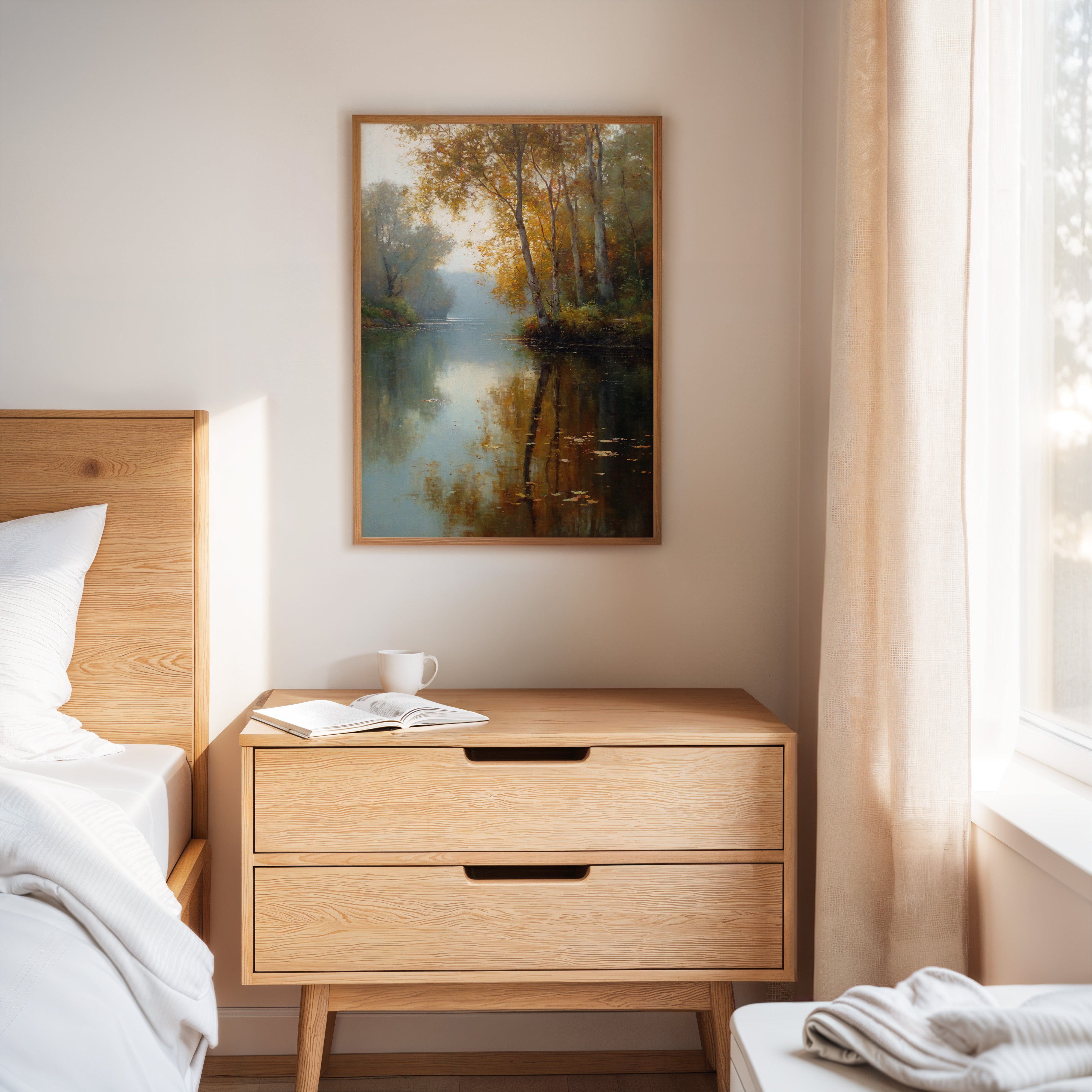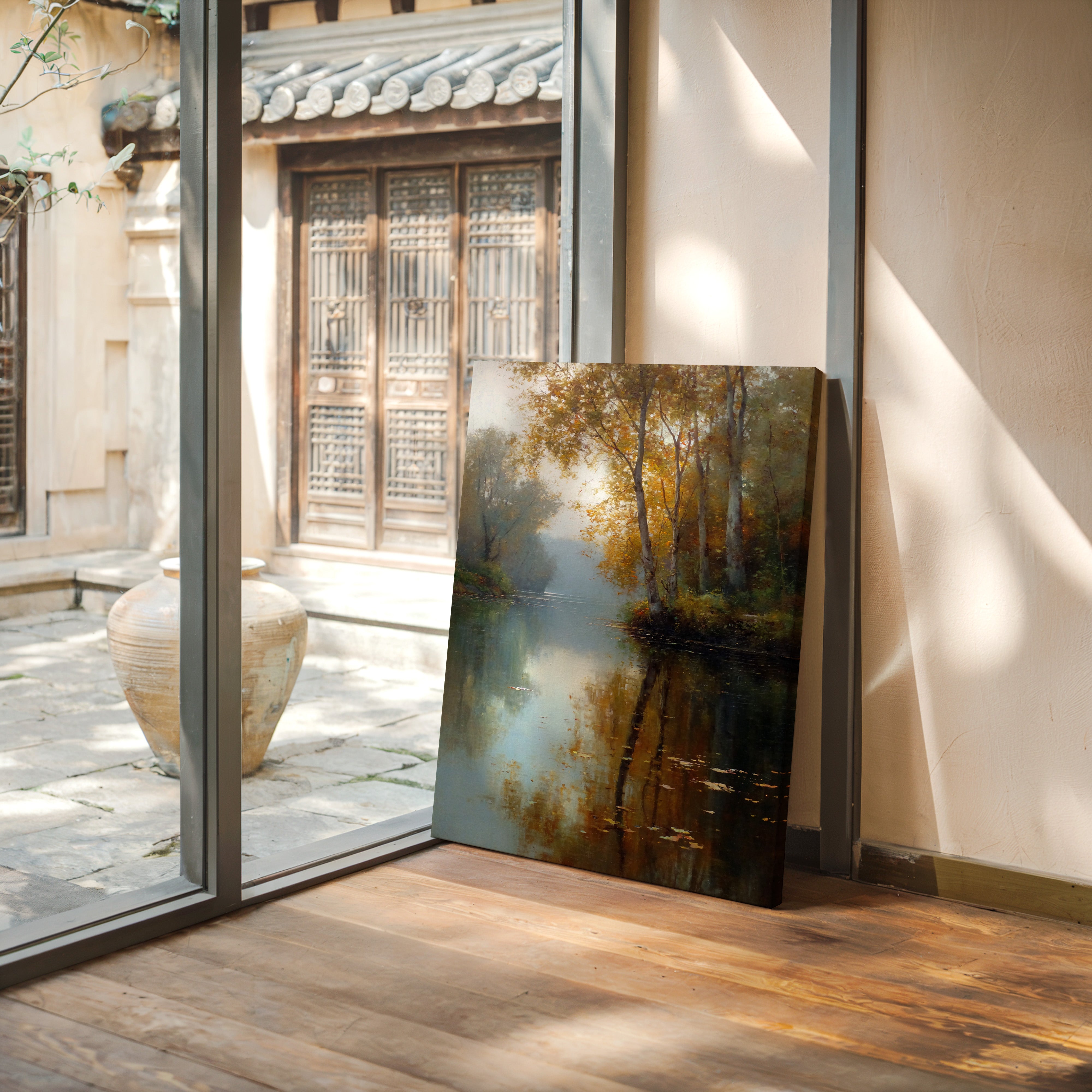 In the stillness of an autumn morning, golden leaves float lazily on the water's surface, mirroring the vibrant trees that stand watch. This piece embodies the essence of the 'Artisanal' collection, where nature's beauty meets handcrafted elegance. The soft hues of amber and emerald create a tranquil scene, inviting viewers to lose themselves in the delicate balance of color and reflection. Perfect for a serene corner of your living room or a calming bedroom retreat, this artwork brings a touch of nature's grace indoors.