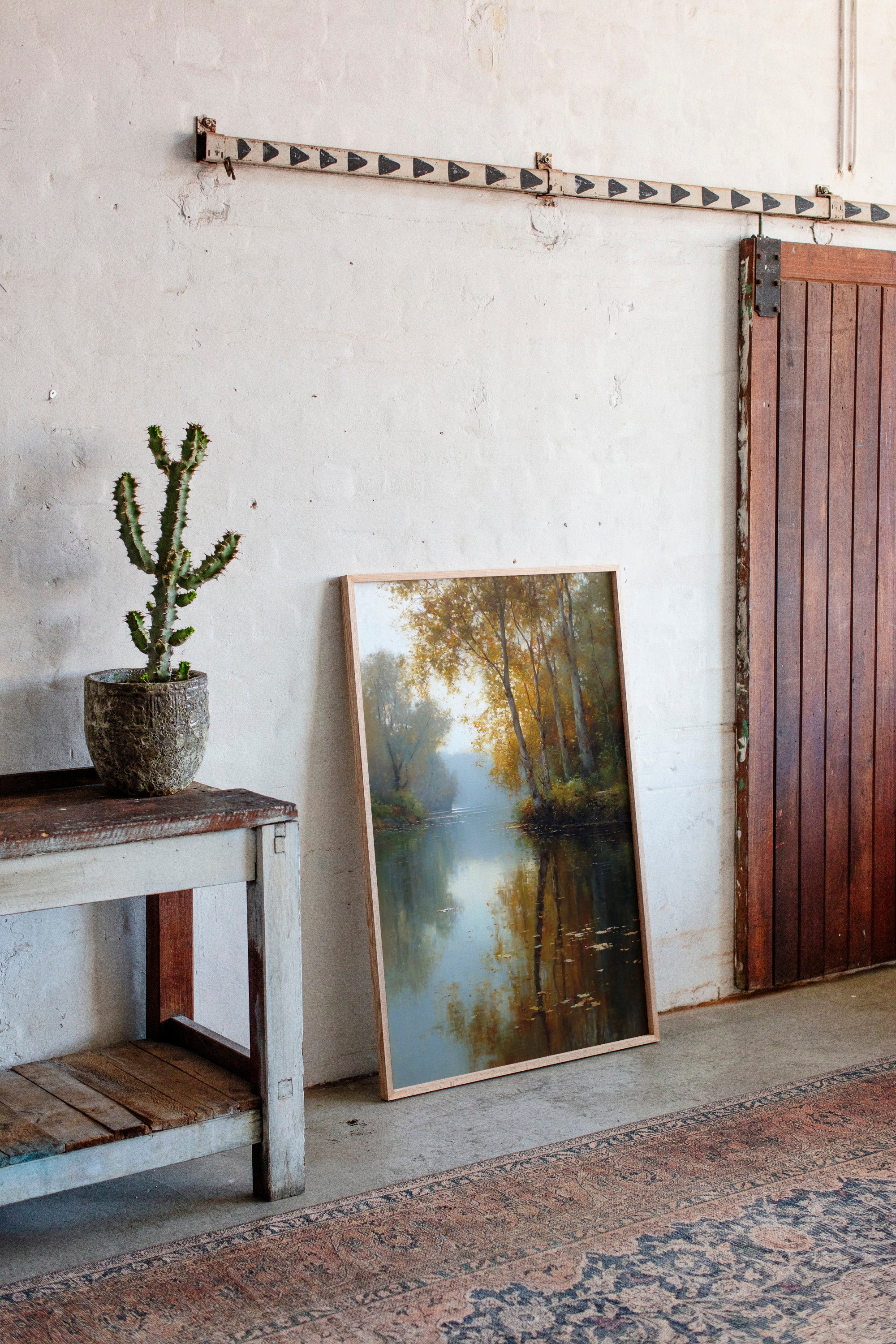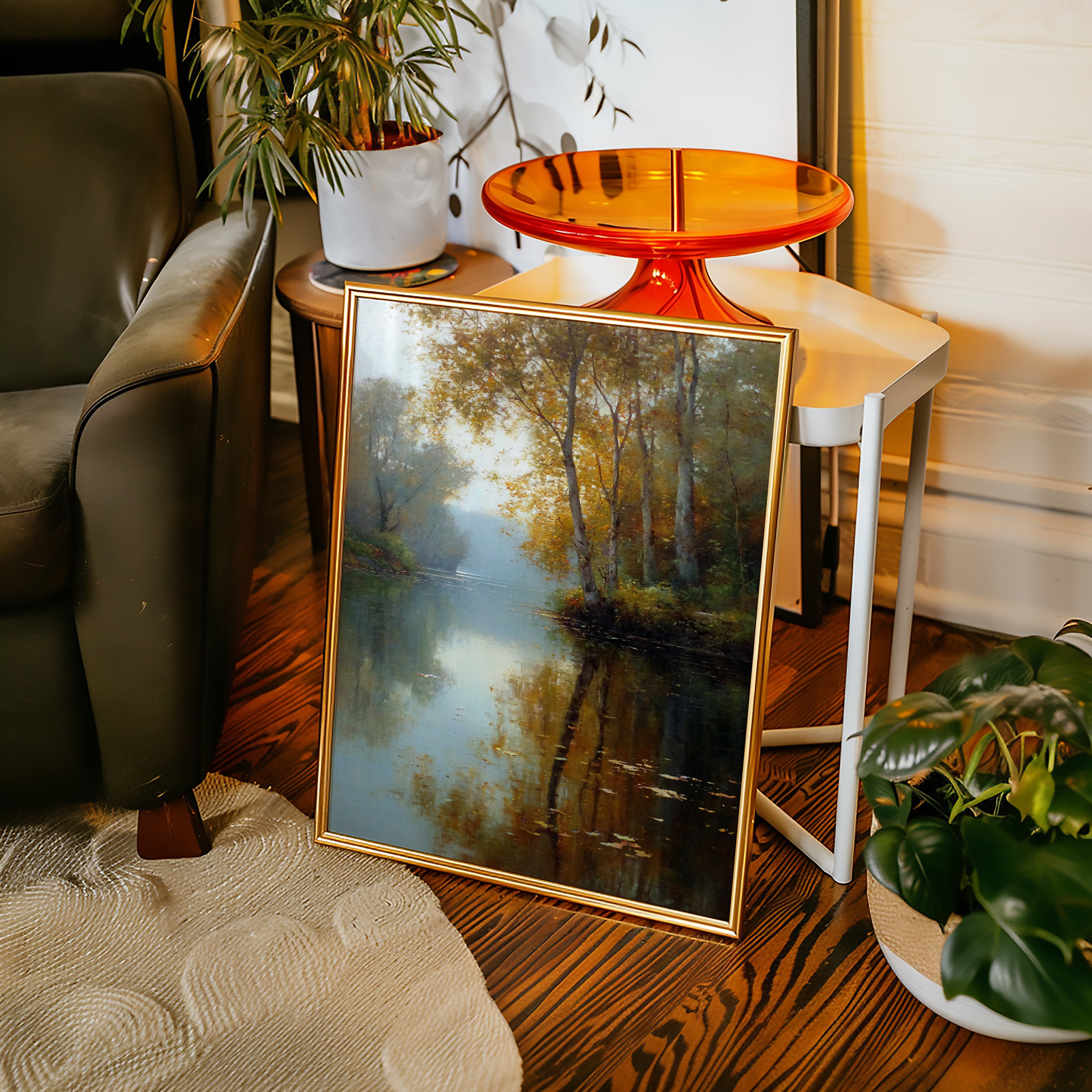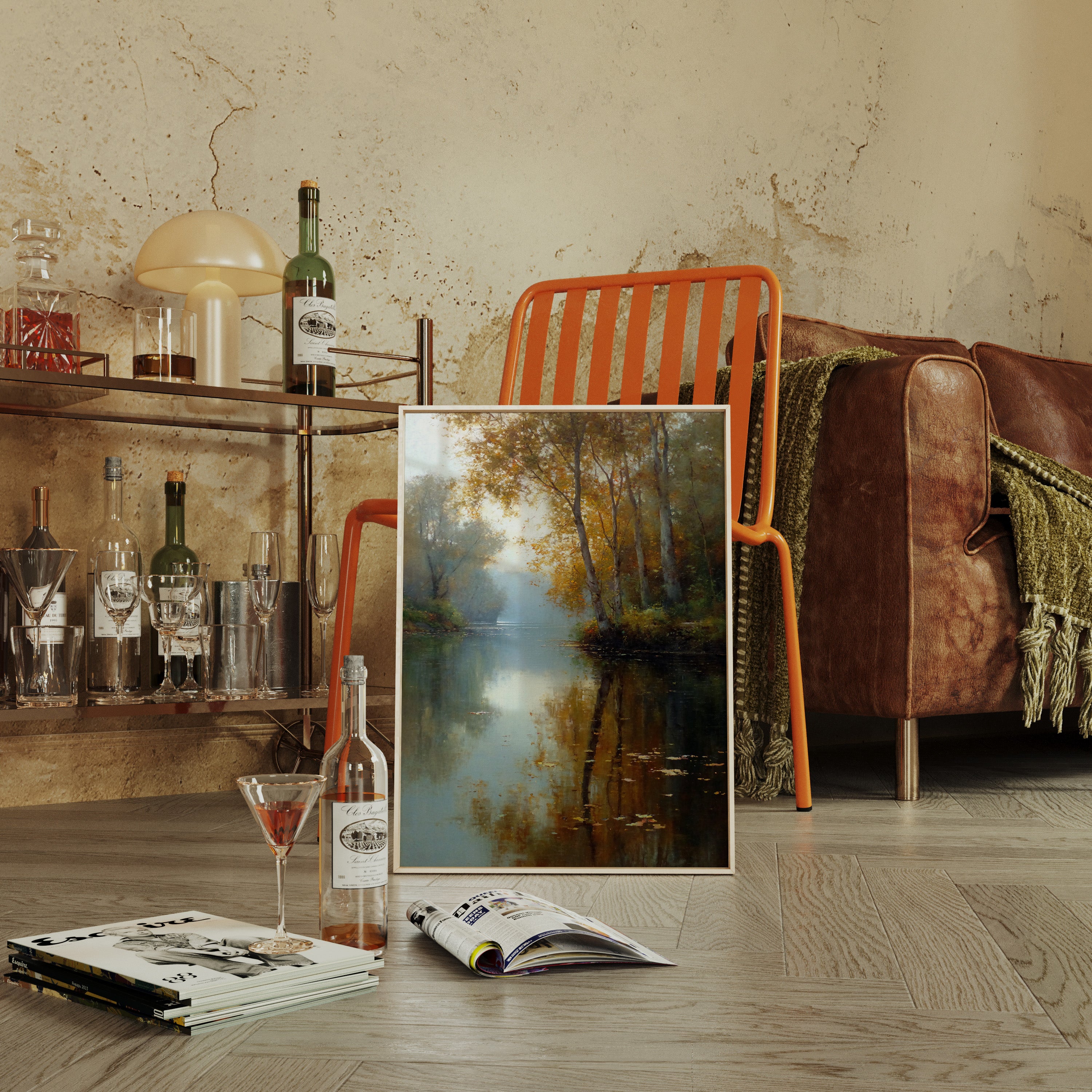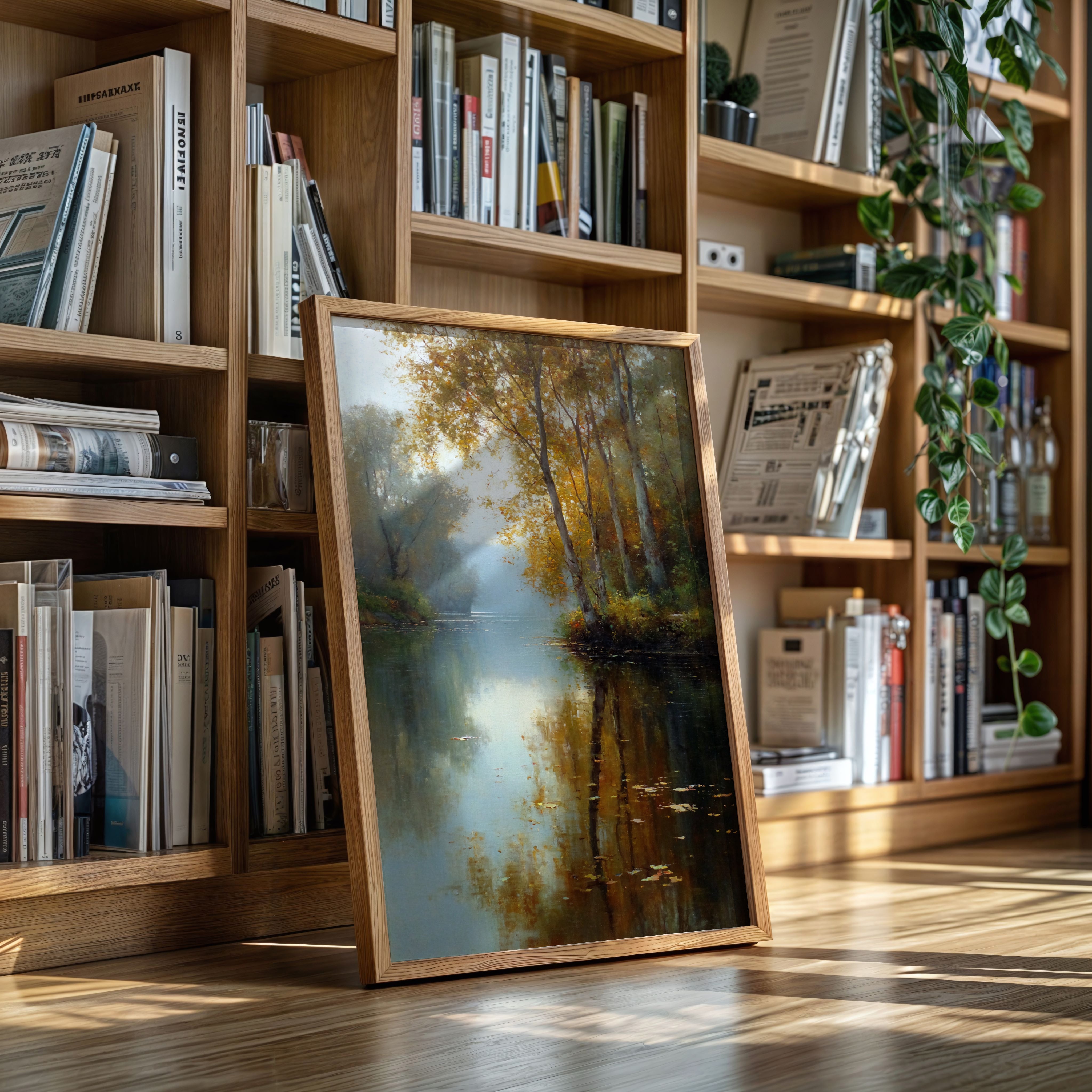 In the stillness of an autumn morning, golden leaves float lazily on the water's surface, mirroring the vibrant trees that stand watch. This piece embodies the essence of the 'Artisanal' collection, where nature's beauty meets handcrafted elegance. The soft hues of amber and emerald create a tranquil scene, inviting viewers to lose themselves in the delicate balance of color and reflection. Perfect for a serene corner of your living room or a calming bedroom retreat, this artwork brings a touch of nature's grace indoors.