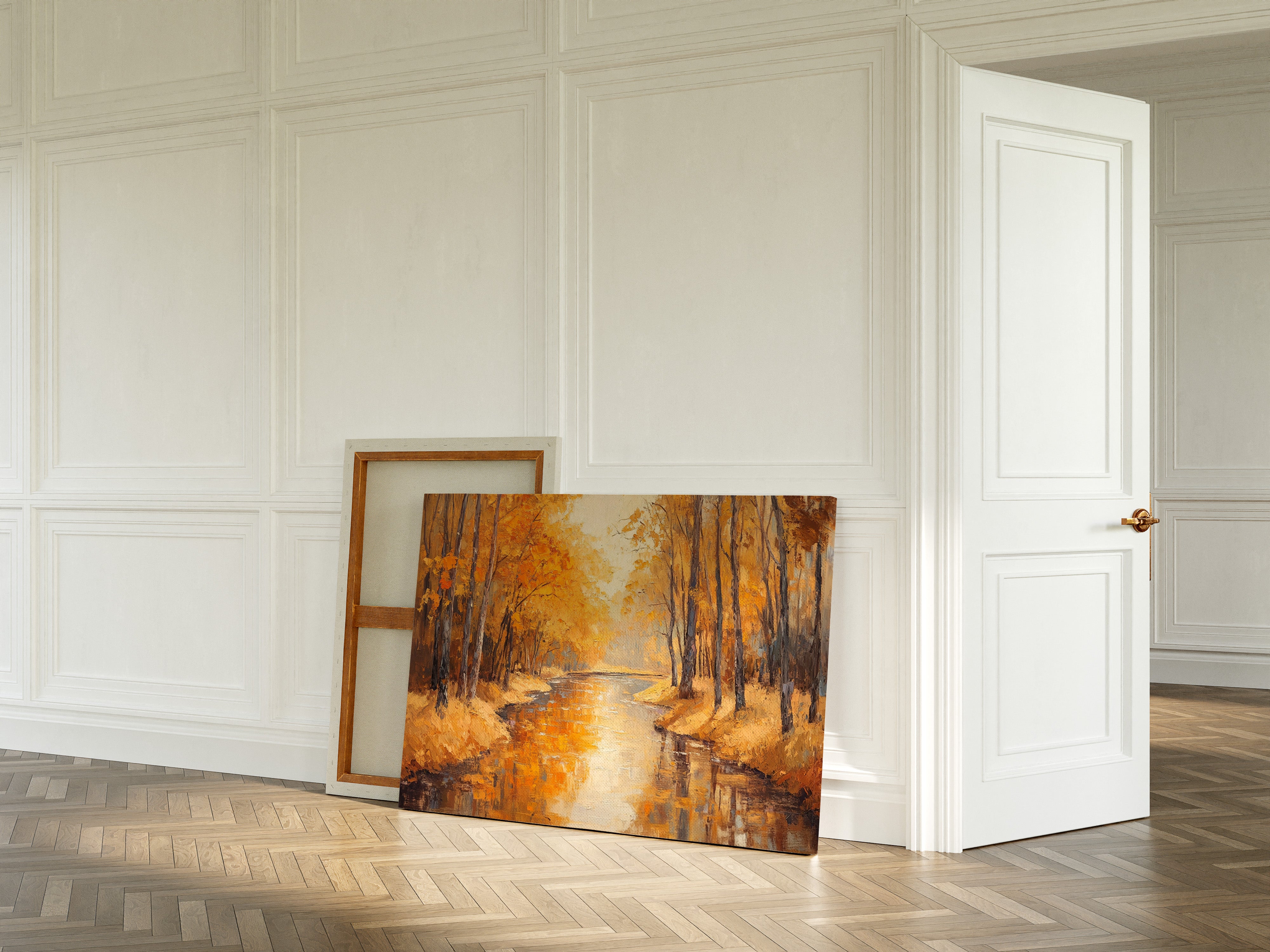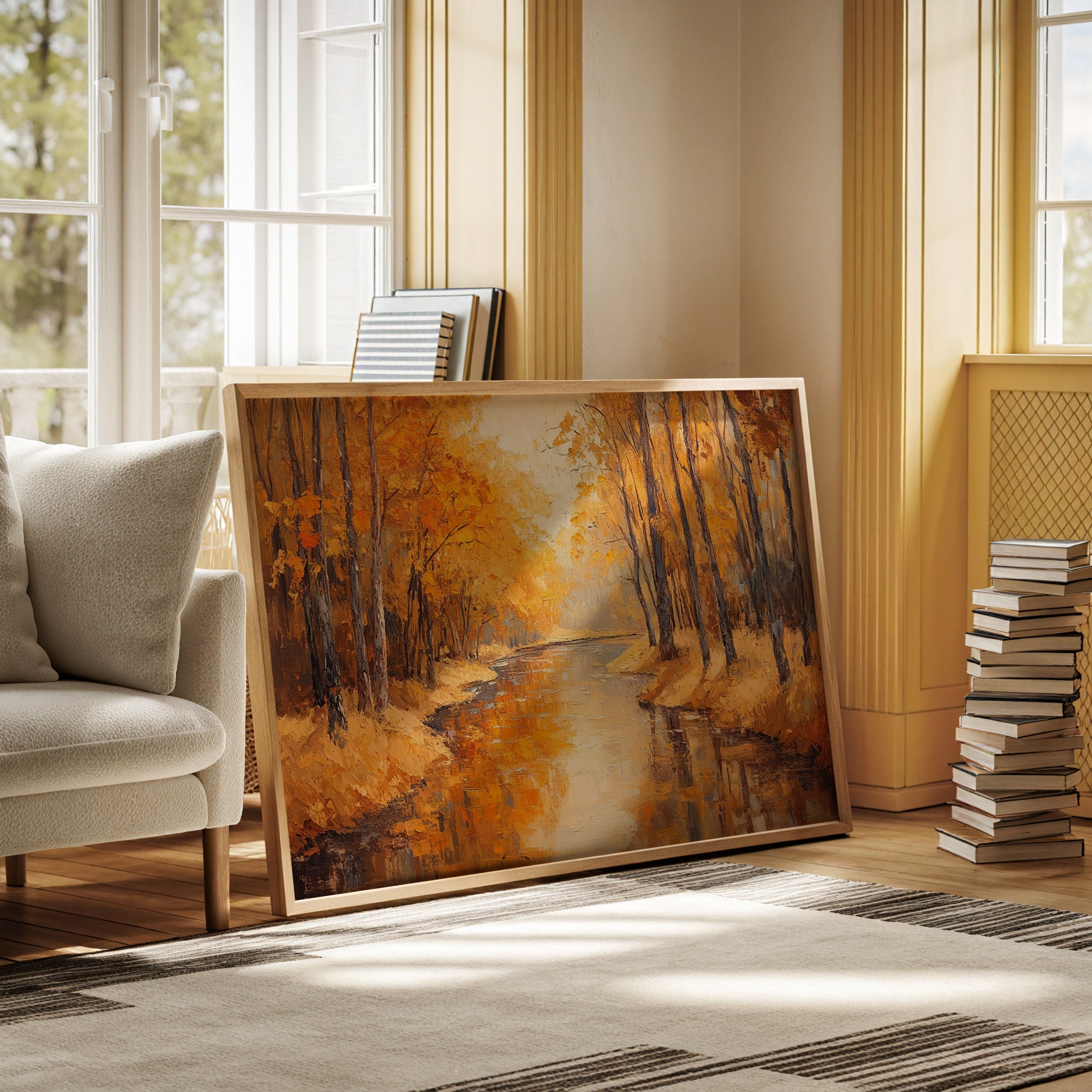 Sunlight melts through amber leaves, casting warm reflections across tranquil waters. The forest stands in quiet reverence, its trees wearing their finest October colors like royal robes of gold and bronze. Thick impasto brushstrokes capture the textural richness of fall foliage, while the meandering river mirrors the glowing canopy above, creating a perfect harmony of earth and sky. This piece brings the peaceful solitude of an autumn afternoon into any space, ideal for creating a contemplative atmosphere in a reading nook or above a fireplace mantel.